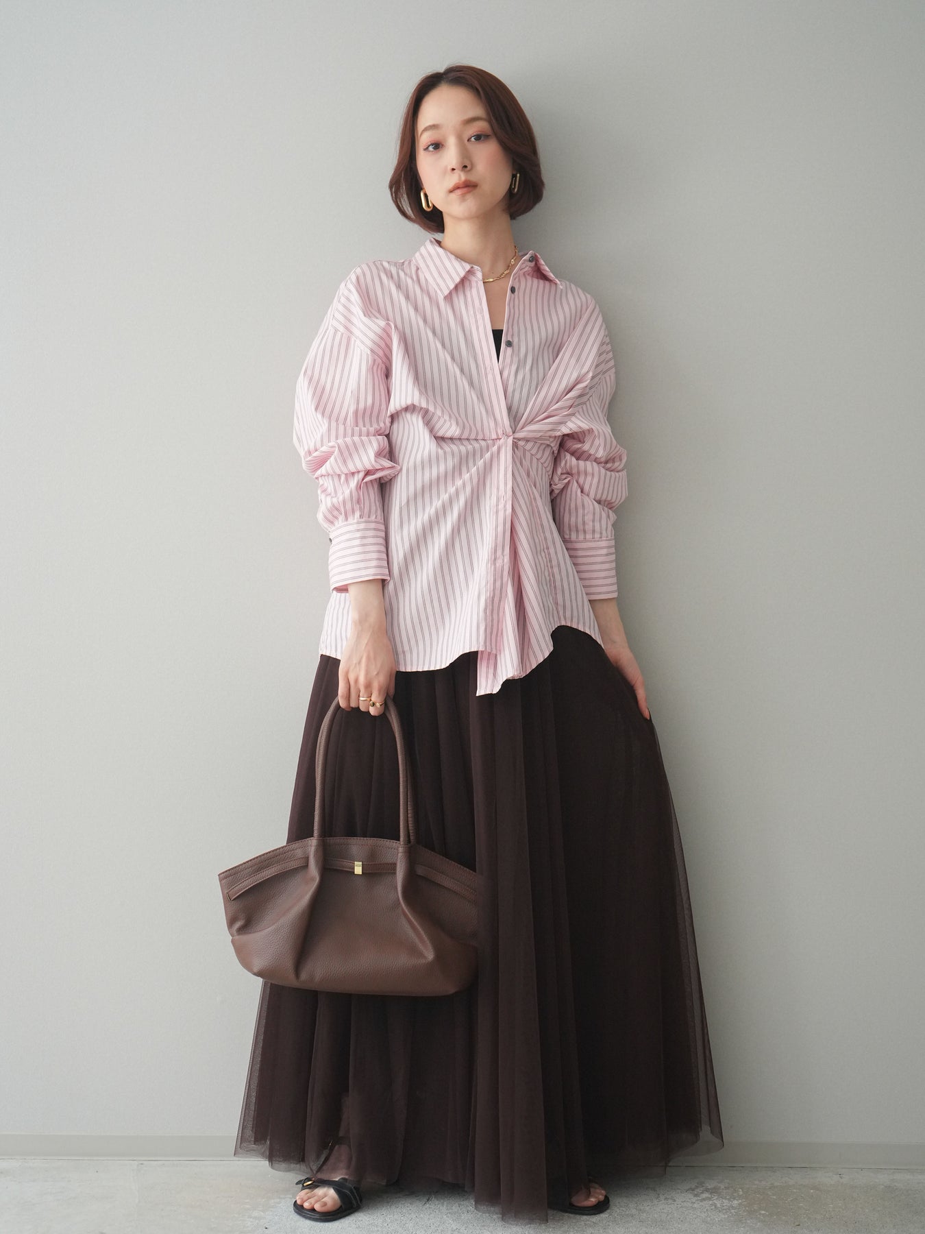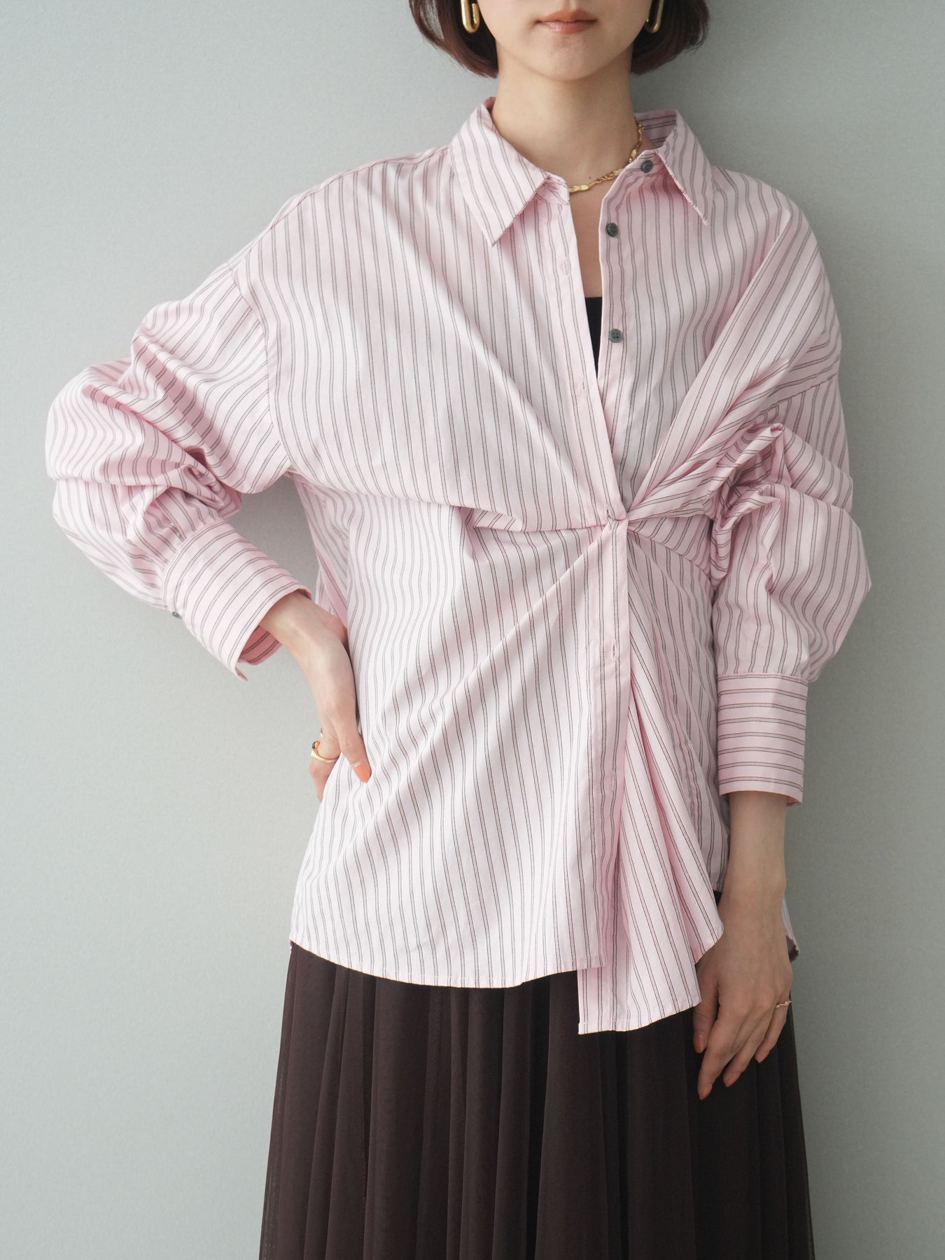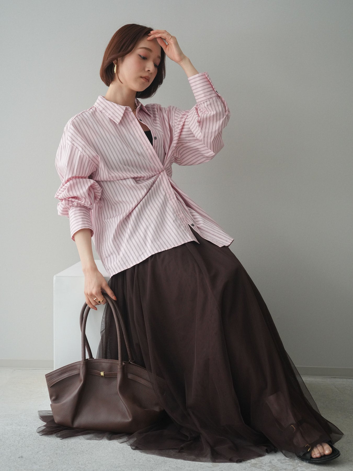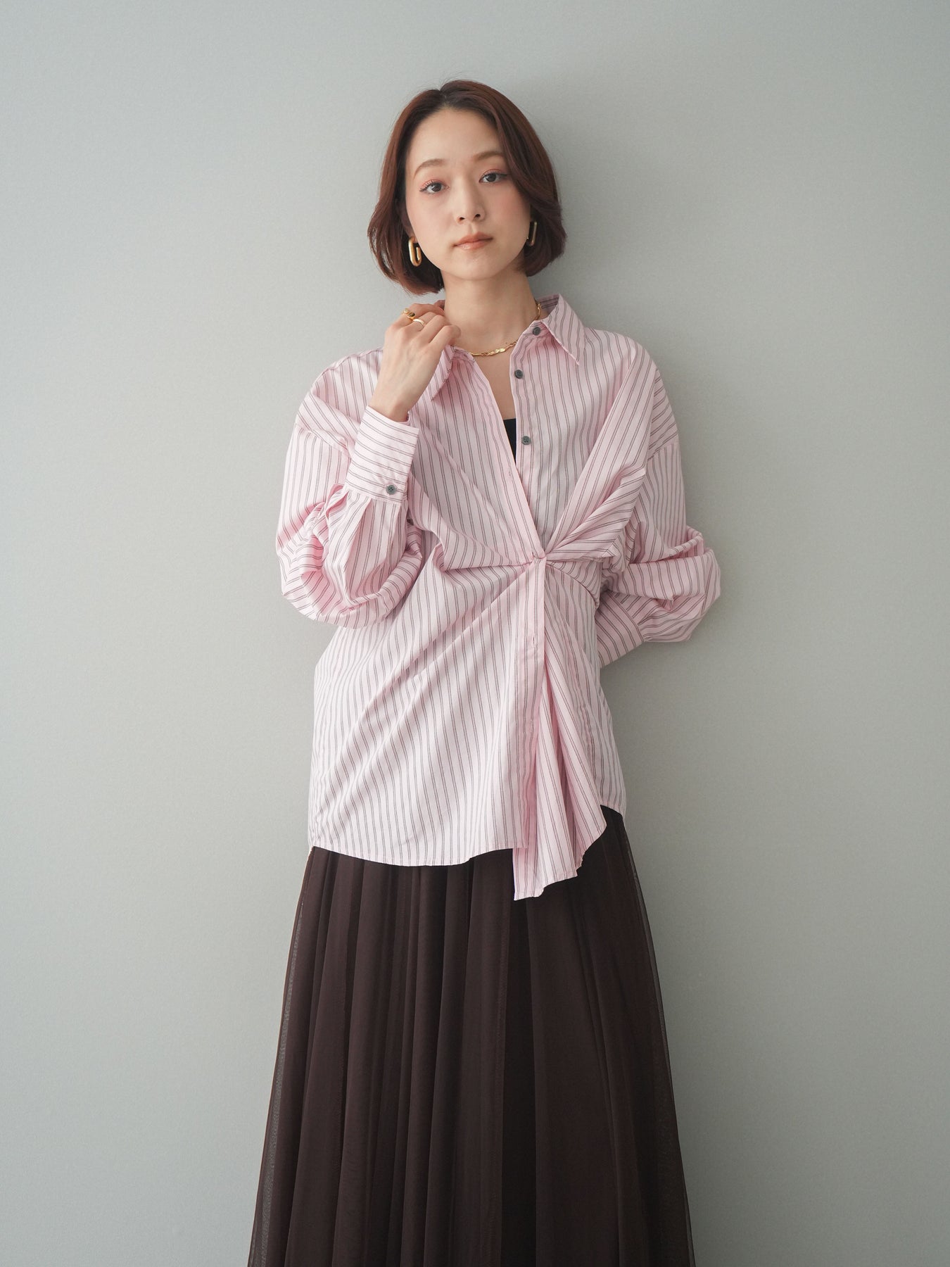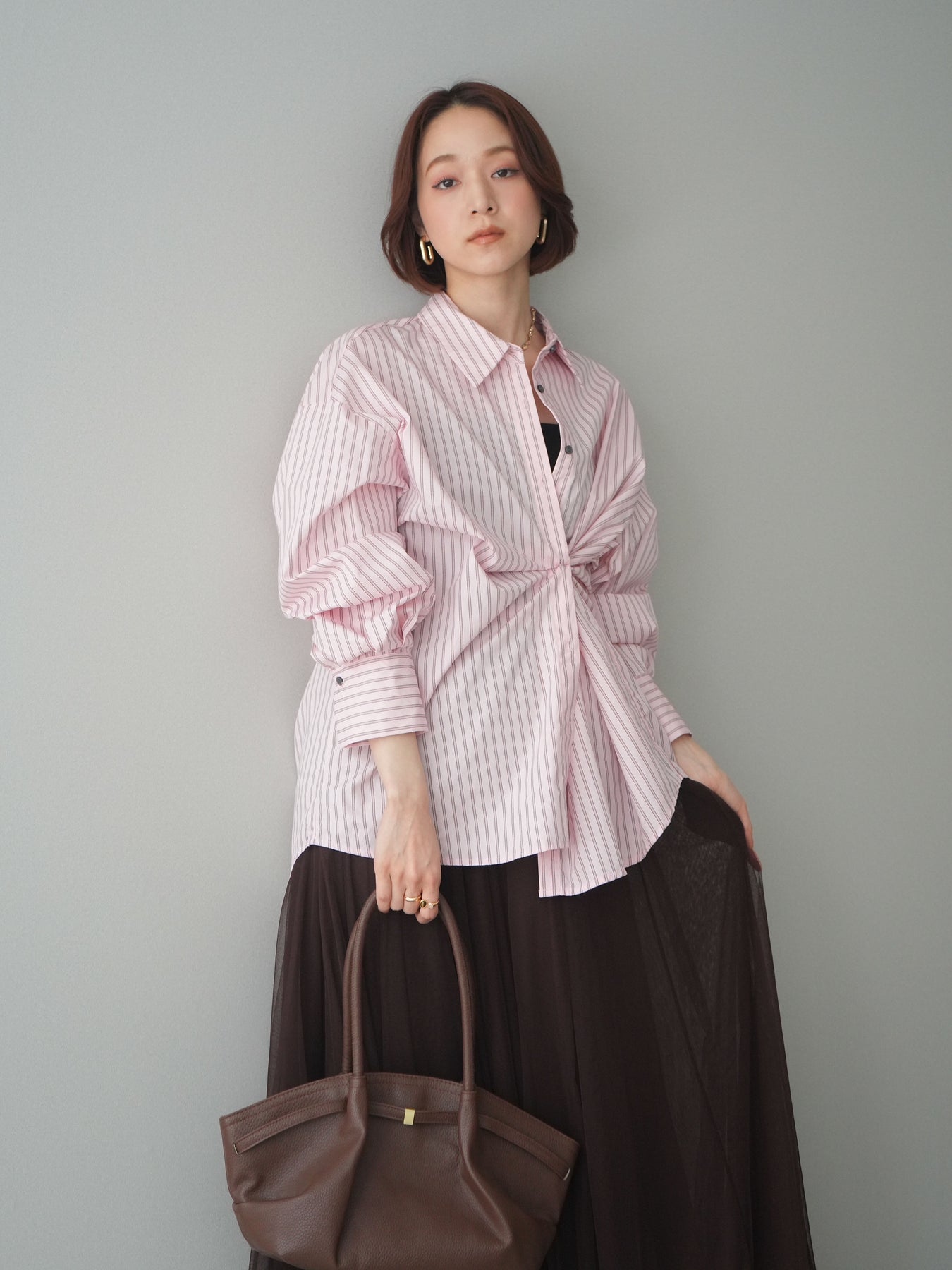 程よくハリのある素材感で仕立てた、ストライプ柄のルーズシャツ。ゆとりのあるシルエットが抜け感を演出し、さらっと羽織るだけでこなれた印象に仕上がります。前後2way仕様で、ベーシックなシャツとしてはもちろん、ボタンをアレンジしてラップ風に着こなすなど表情の変化を楽しめる一枚。ヒップにかかる長めの着丈で、パンツスタイルにもバランスよく合わせていただけます。 ※ボトムス、キャミソール(インナー)以外の商品は一律でインナーは付属していません