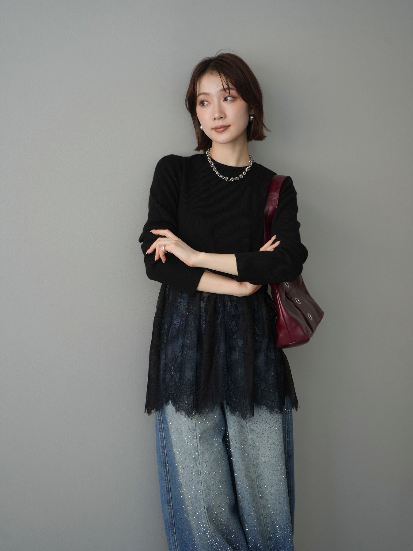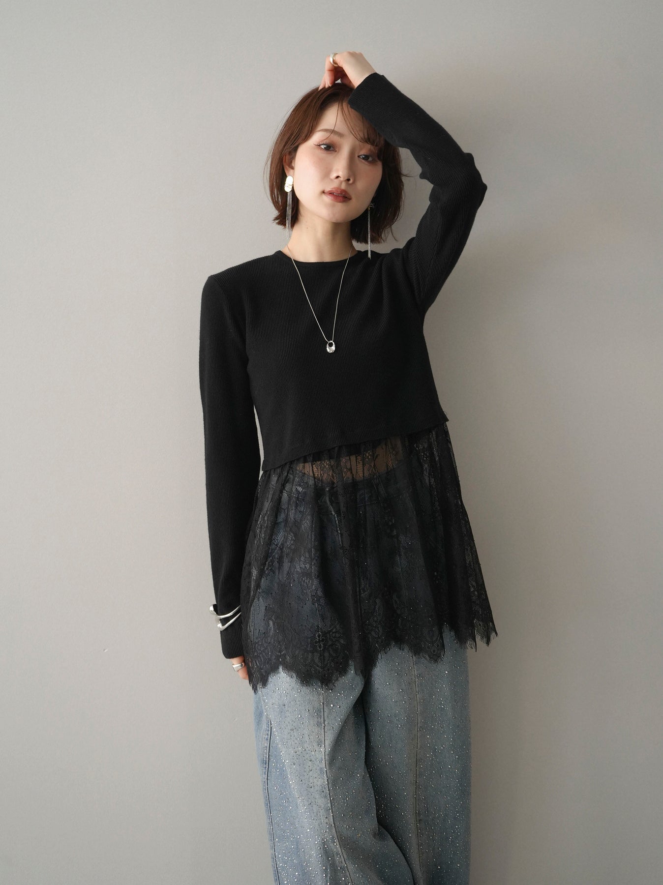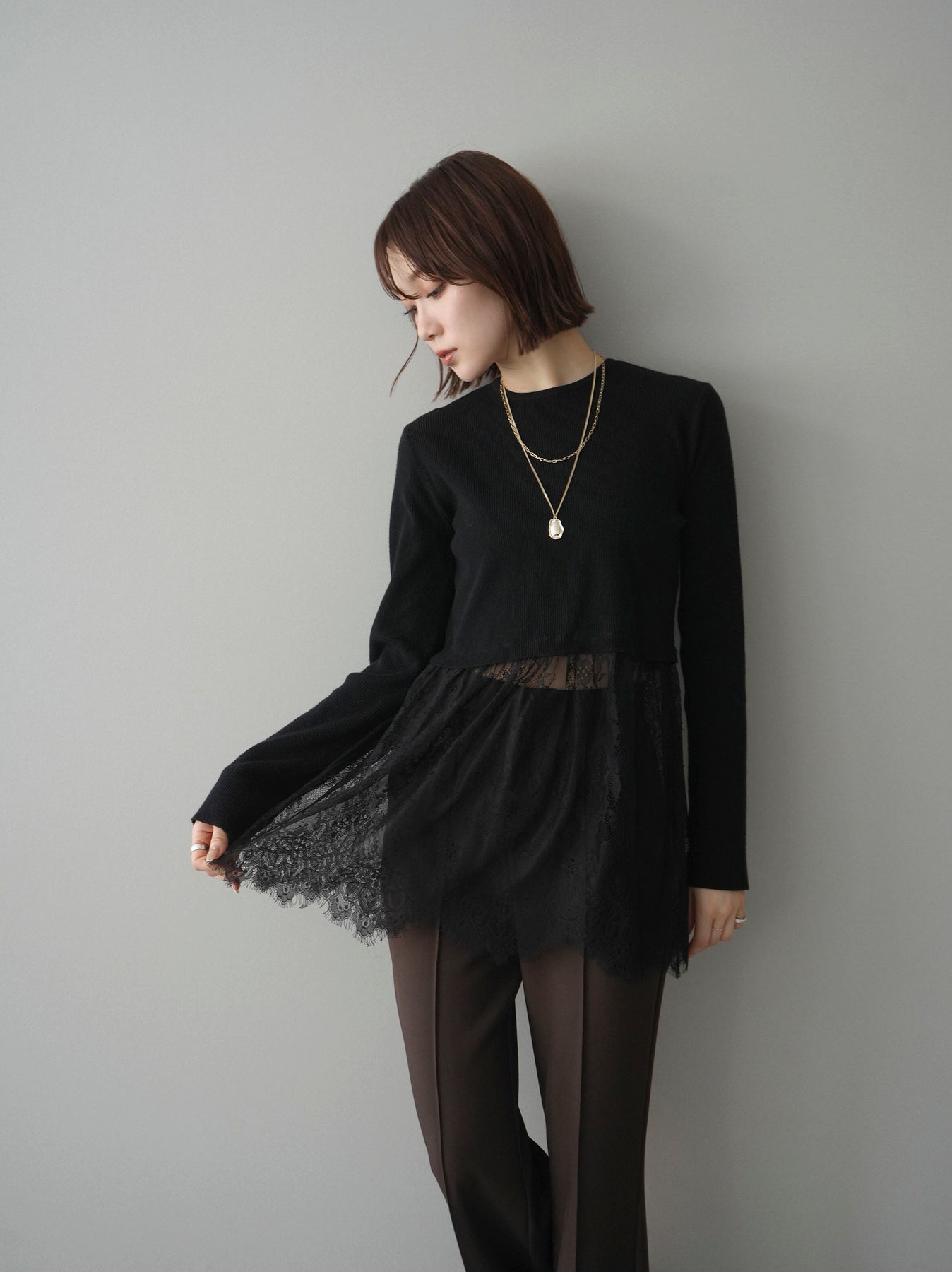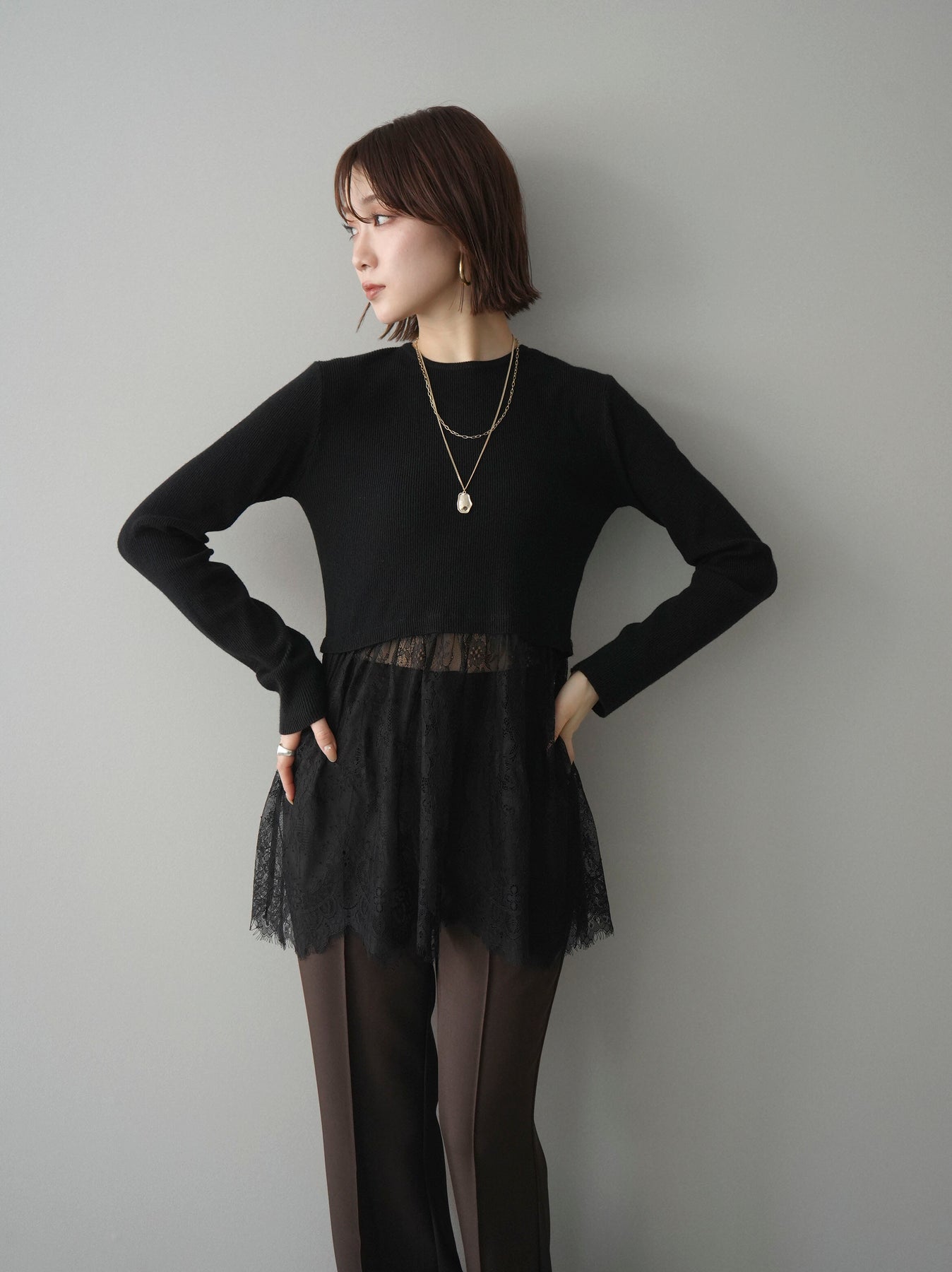 [予約]クルーネックレースドッキングリブニットトップス/black