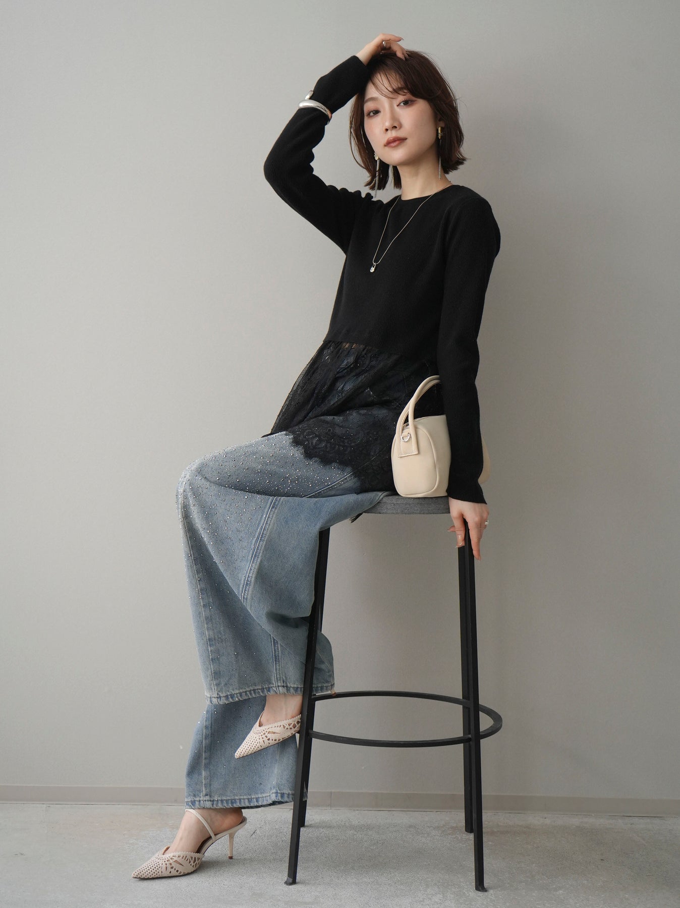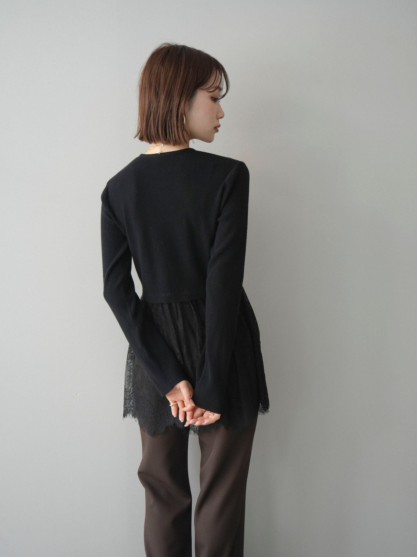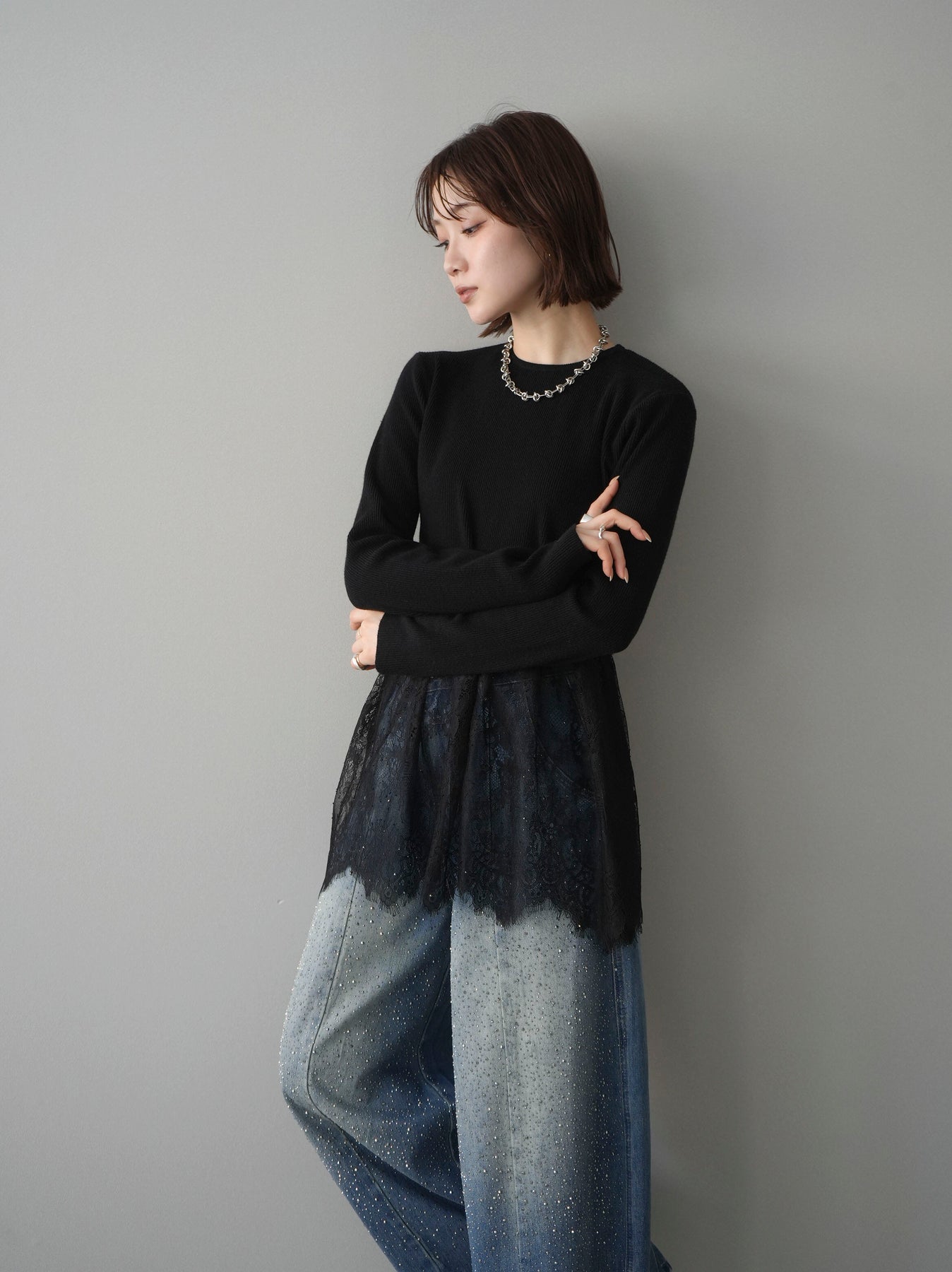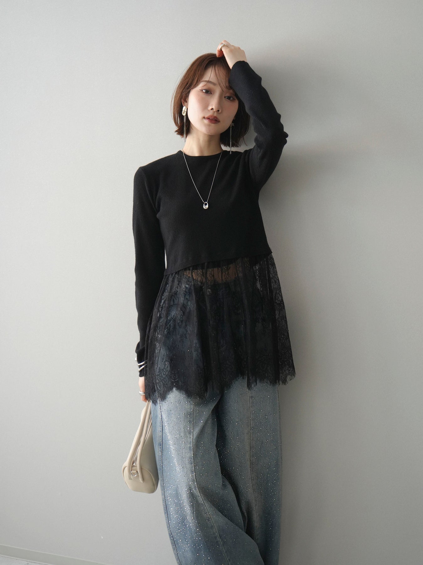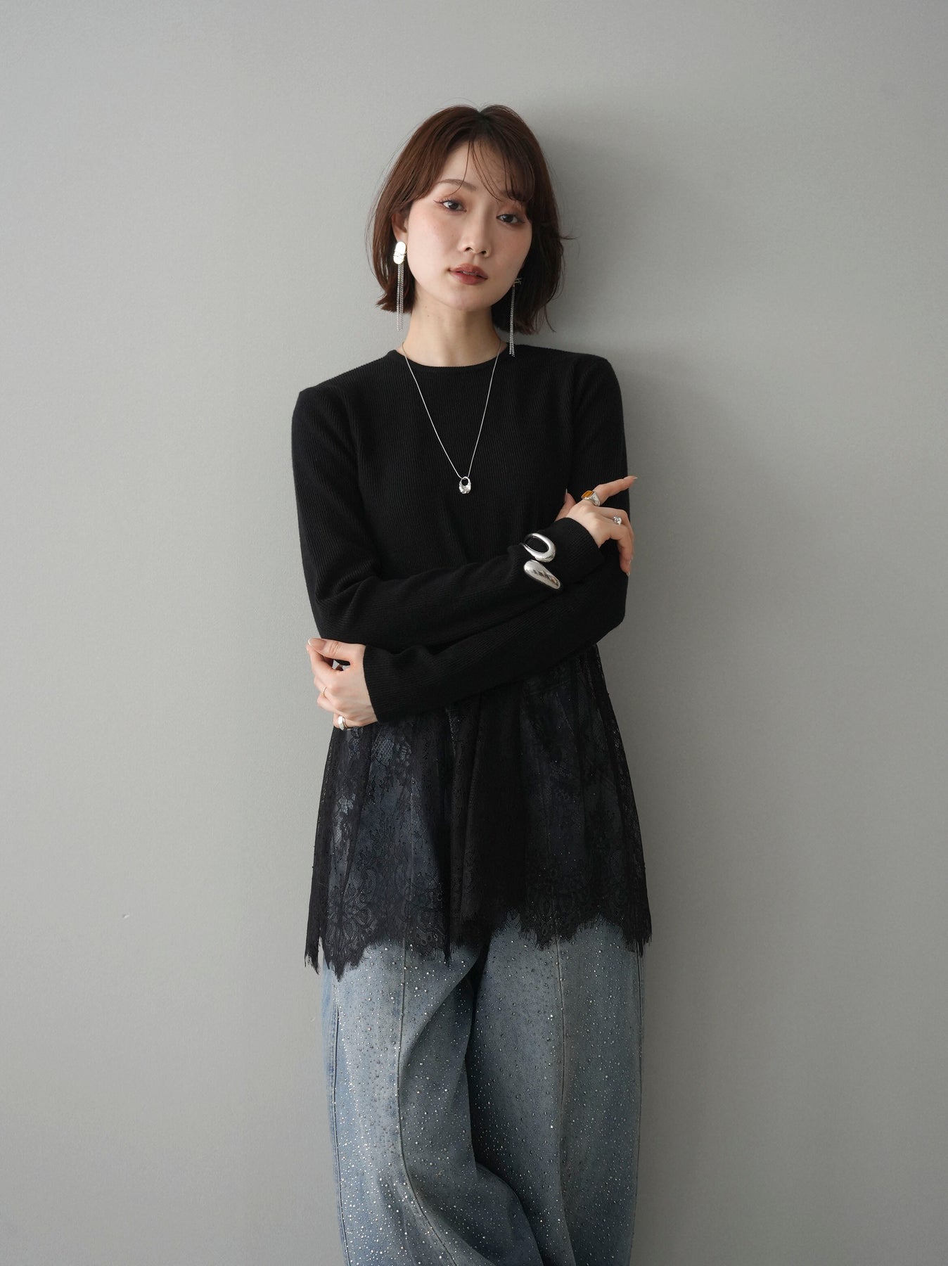 [予約]クルーネックレースドッキングリブニットトップス/black