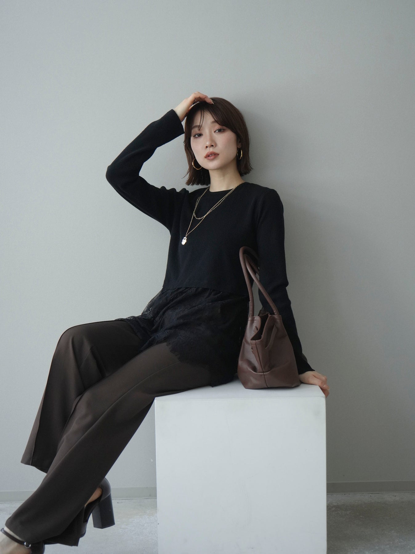すっきりとしたリブニットに繊細なレースをドッキングしたデザインが印象的なトップス。コンパクトなシルエットと、裾から広がるレースのコントラストが女性らしいバランスを演出します。パンツ合わせで甘さを抑えたスタイルにも、スカートと合わせたフェミニンな着こなしにも活躍する一枚です。 ※ボトムス、キャミソール(インナー)以外の商品は一律でインナーは付属していません