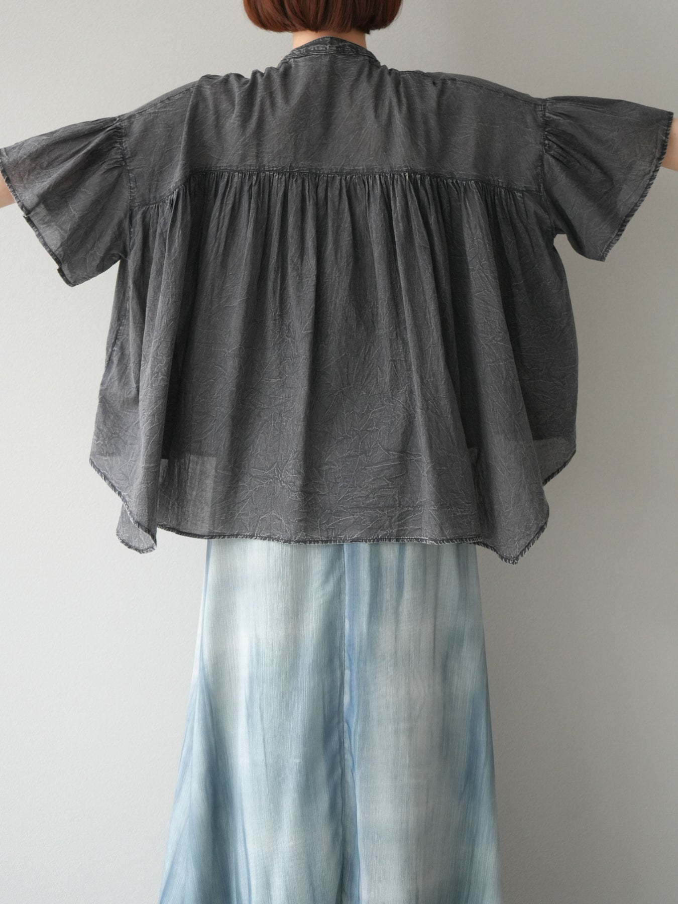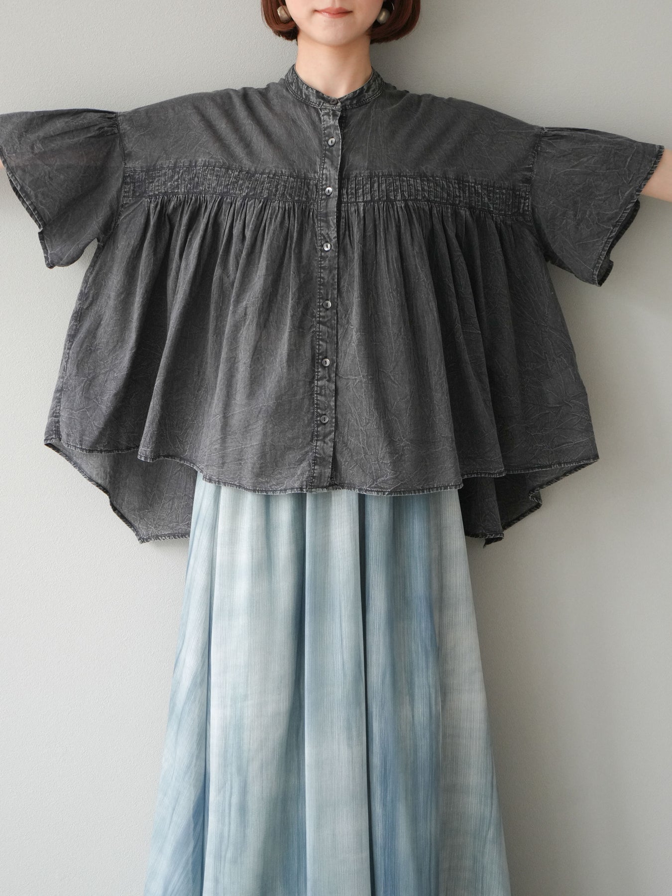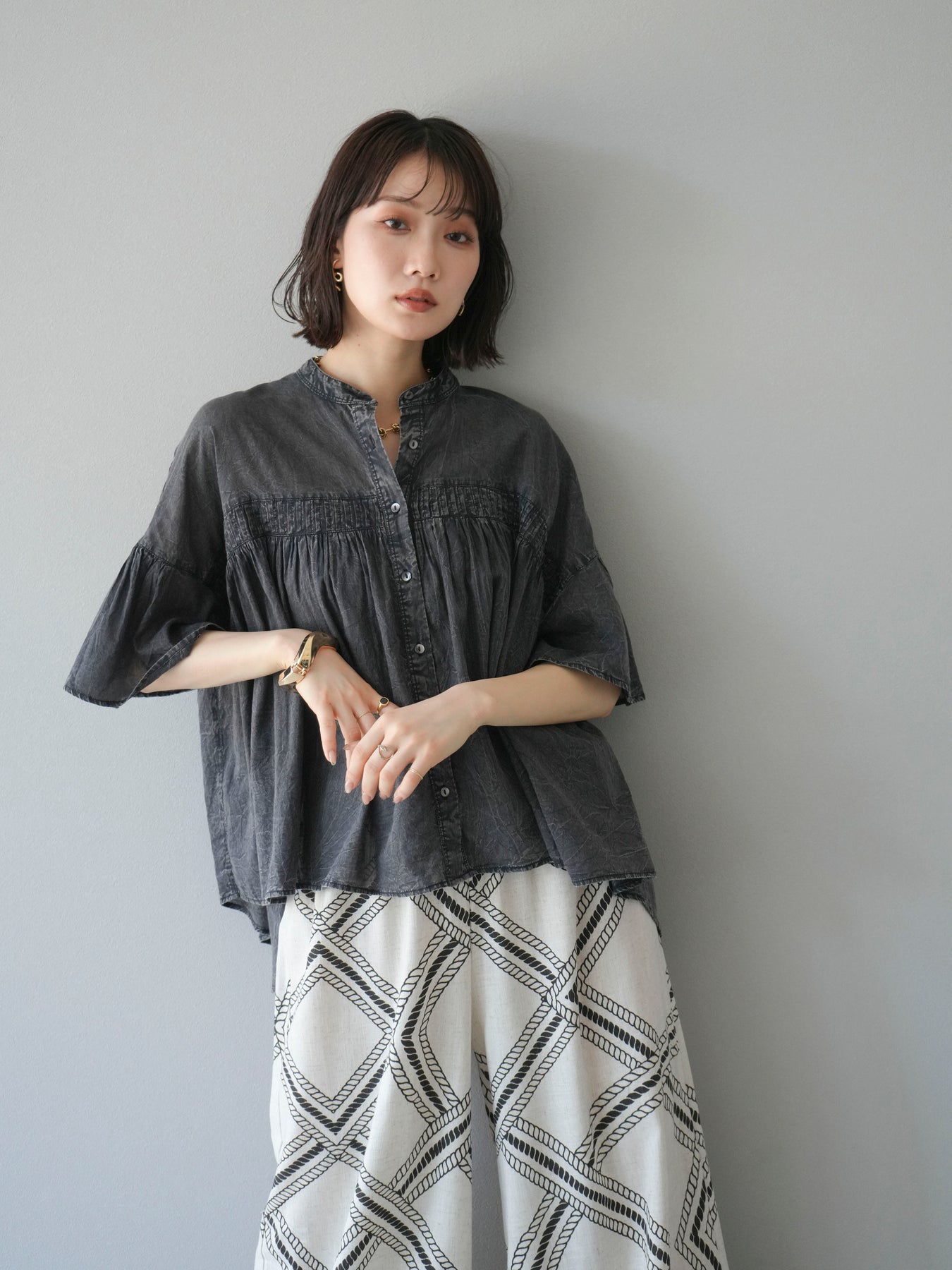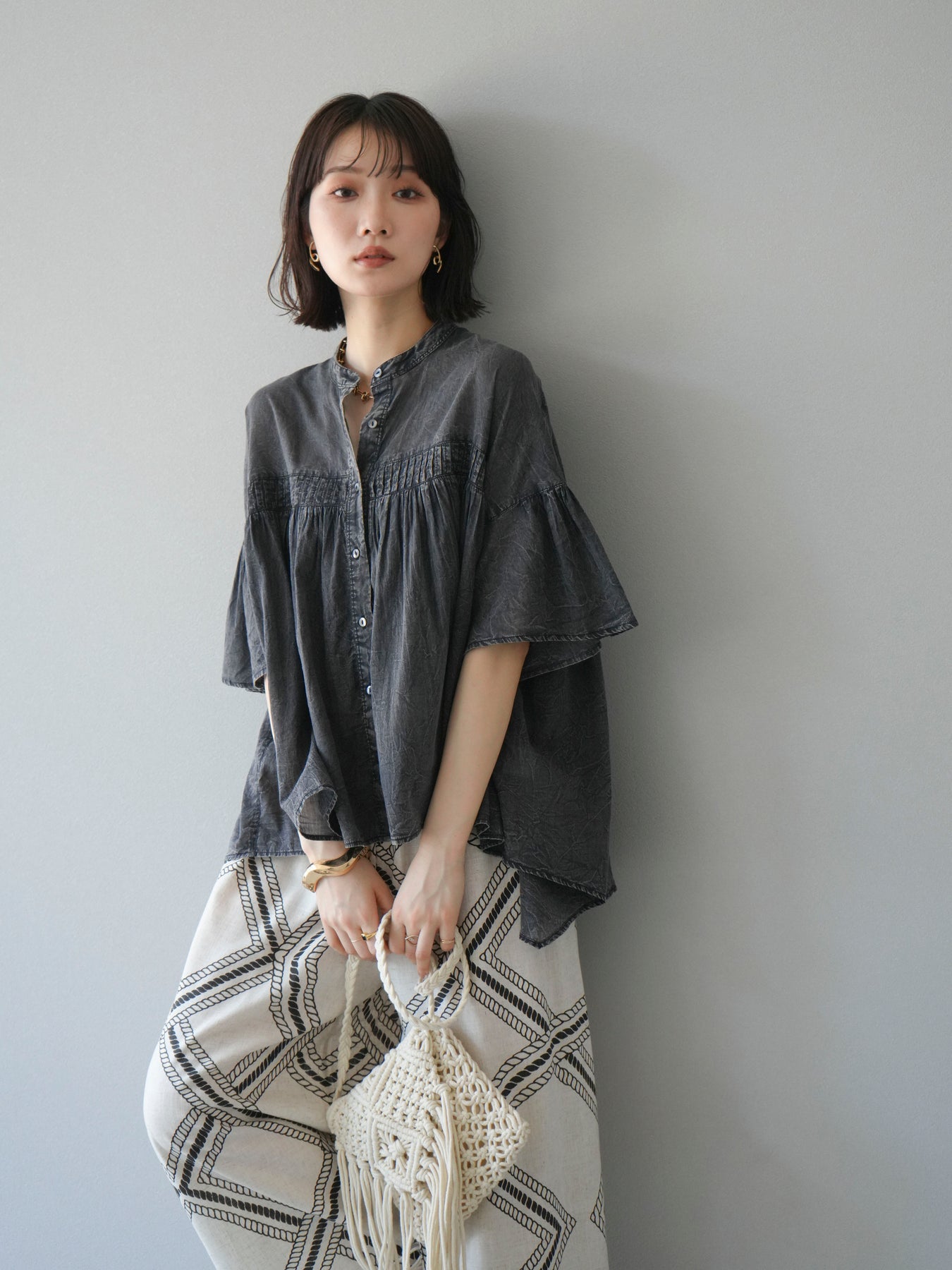 軽やかなインド製コットンボイル素材を使用した、シアー感とヴィンテージ加工が魅力のデニムシャツ。たっぷりとギャザーを施したフレアシルエットが女性らしい抜け感を演出し、動きのある着こなしに。ワッシャー加工による表情のある風合いがこなれ感をプラスし、さらりと羽織るだけで主役級の存在感を放ちます。ヒップが隠れる長め丈で体型カバー効果も◎。ボトムを選ばず、カジュアルにもフェミニンにも着回せる万能アイテムです。 ※ボトムス、キャミソール(インナー)以外の商品は一律でインナーは付属していません。