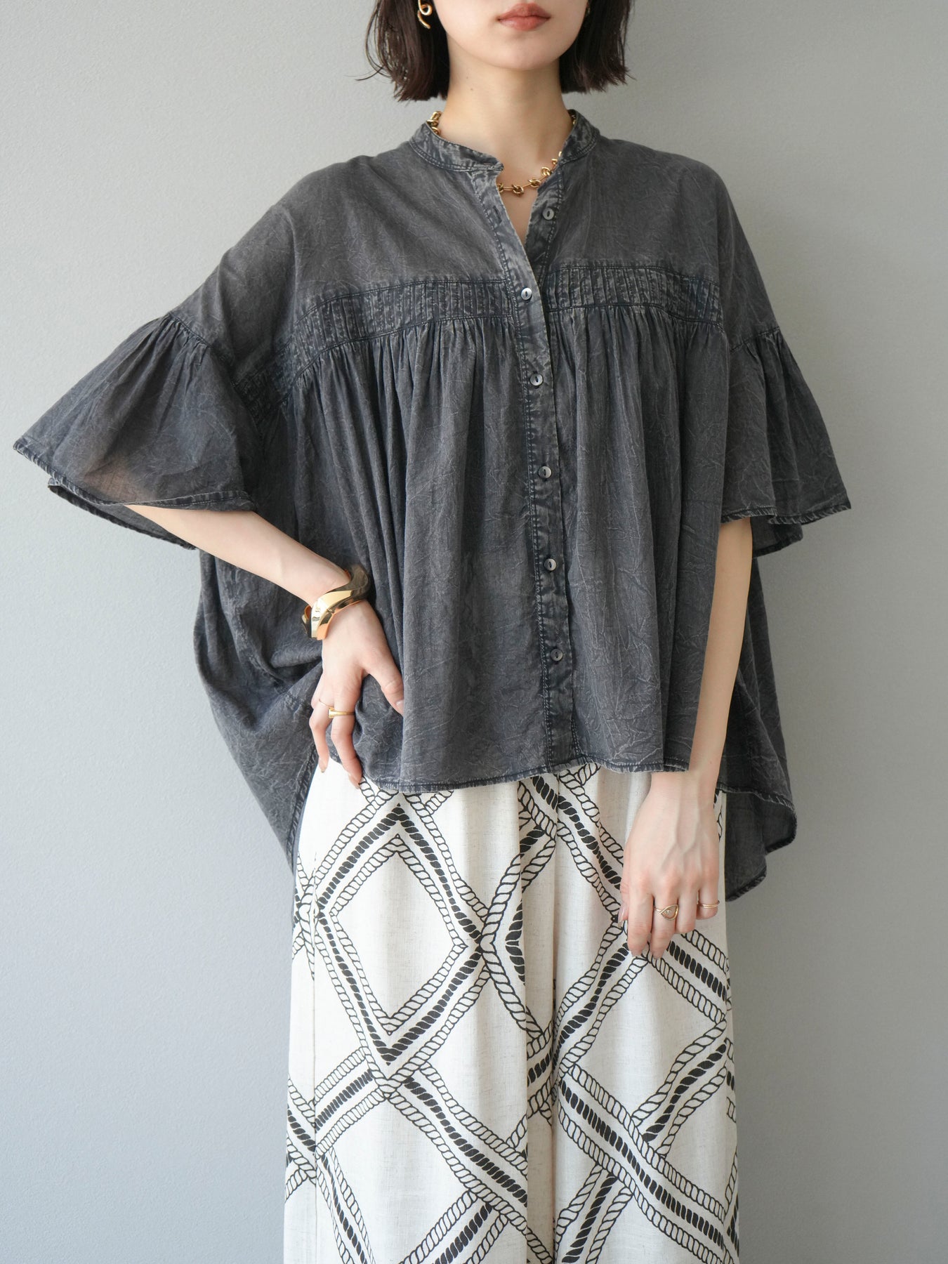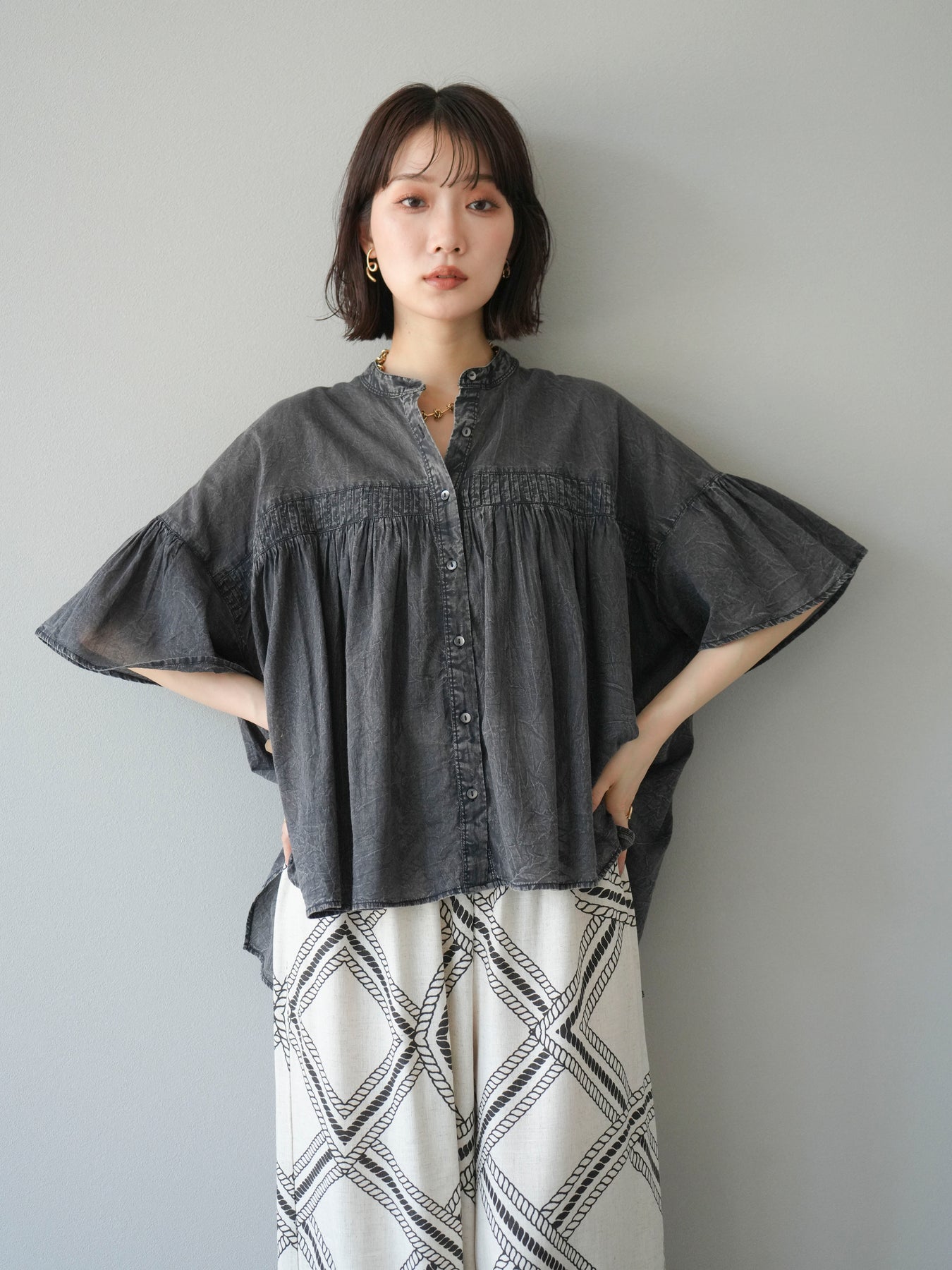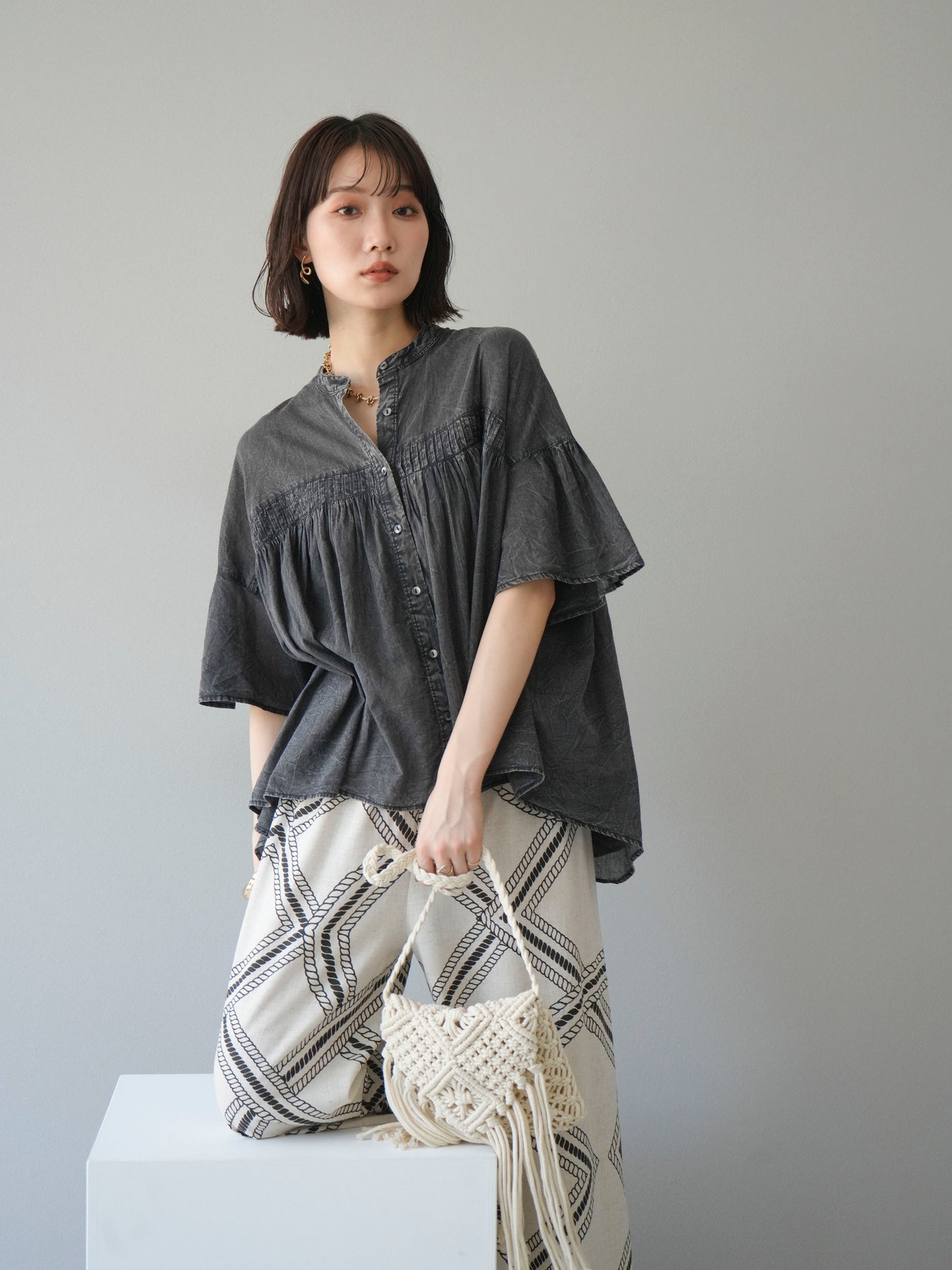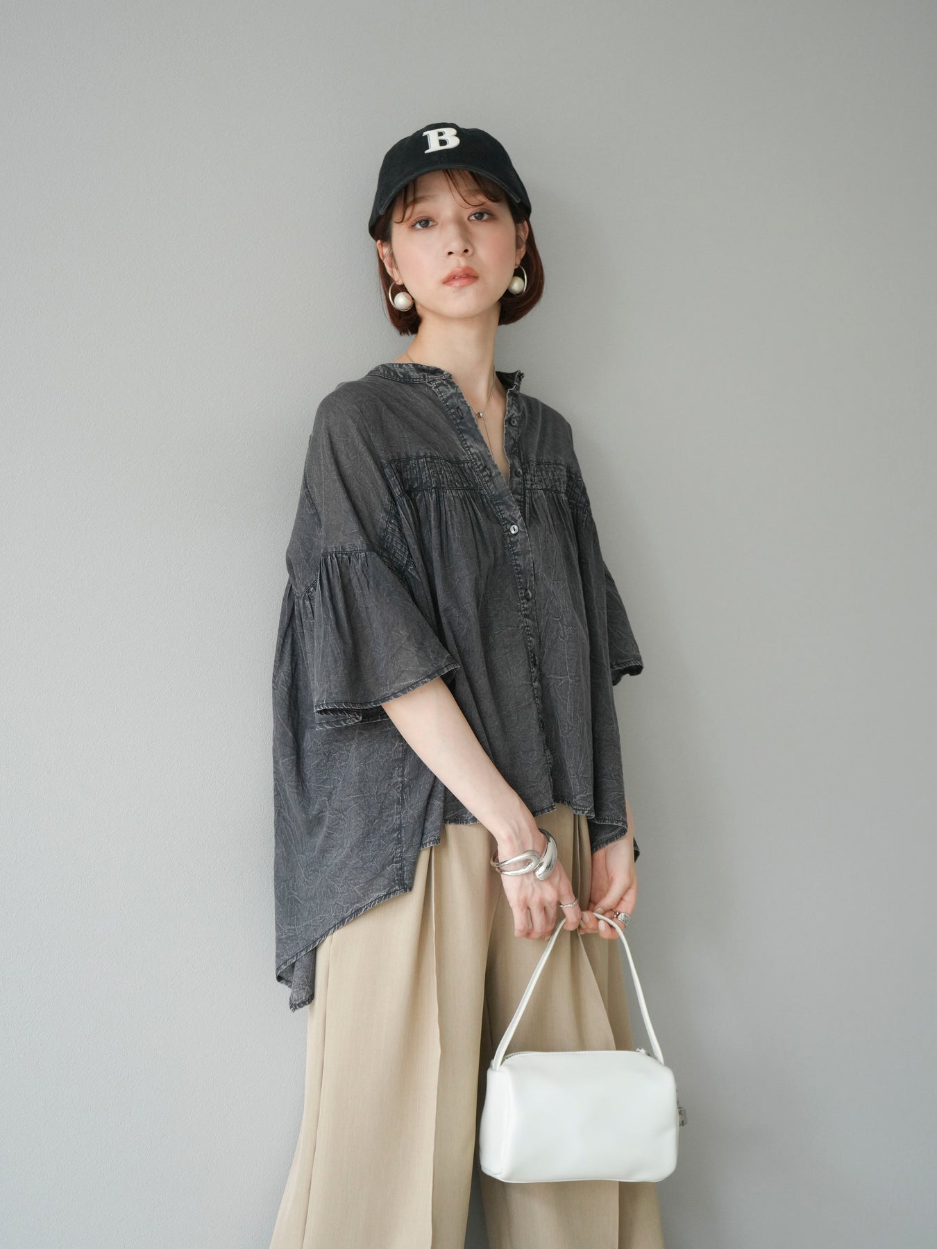 軽やかなインド製コットンボイル素材を使用した、シアー感とヴィンテージ加工が魅力のデニムシャツ。たっぷりとギャザーを施したフレアシルエットが女性らしい抜け感を演出し、動きのある着こなしに。ワッシャー加工による表情のある風合いがこなれ感をプラスし、さらりと羽織るだけで主役級の存在感を放ちます。ヒップが隠れる長め丈で体型カバー効果も◎。ボトムを選ばず、カジュアルにもフェミニンにも着回せる万能アイテムです。 ※ボトムス、キャミソール(インナー)以外の商品は一律でインナーは付属していません。