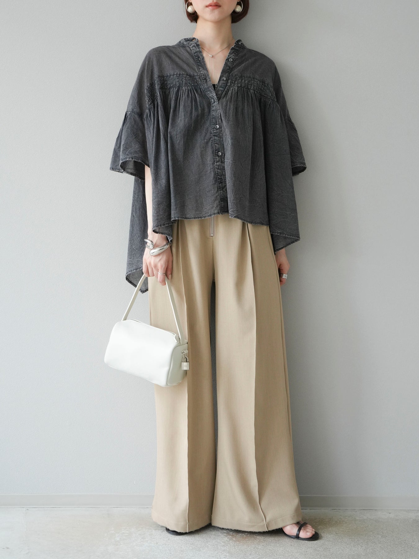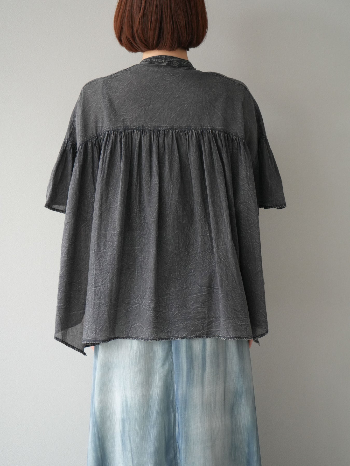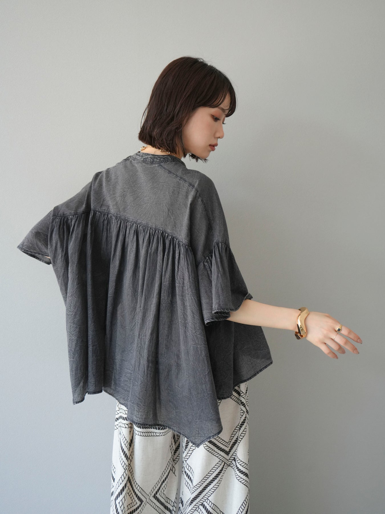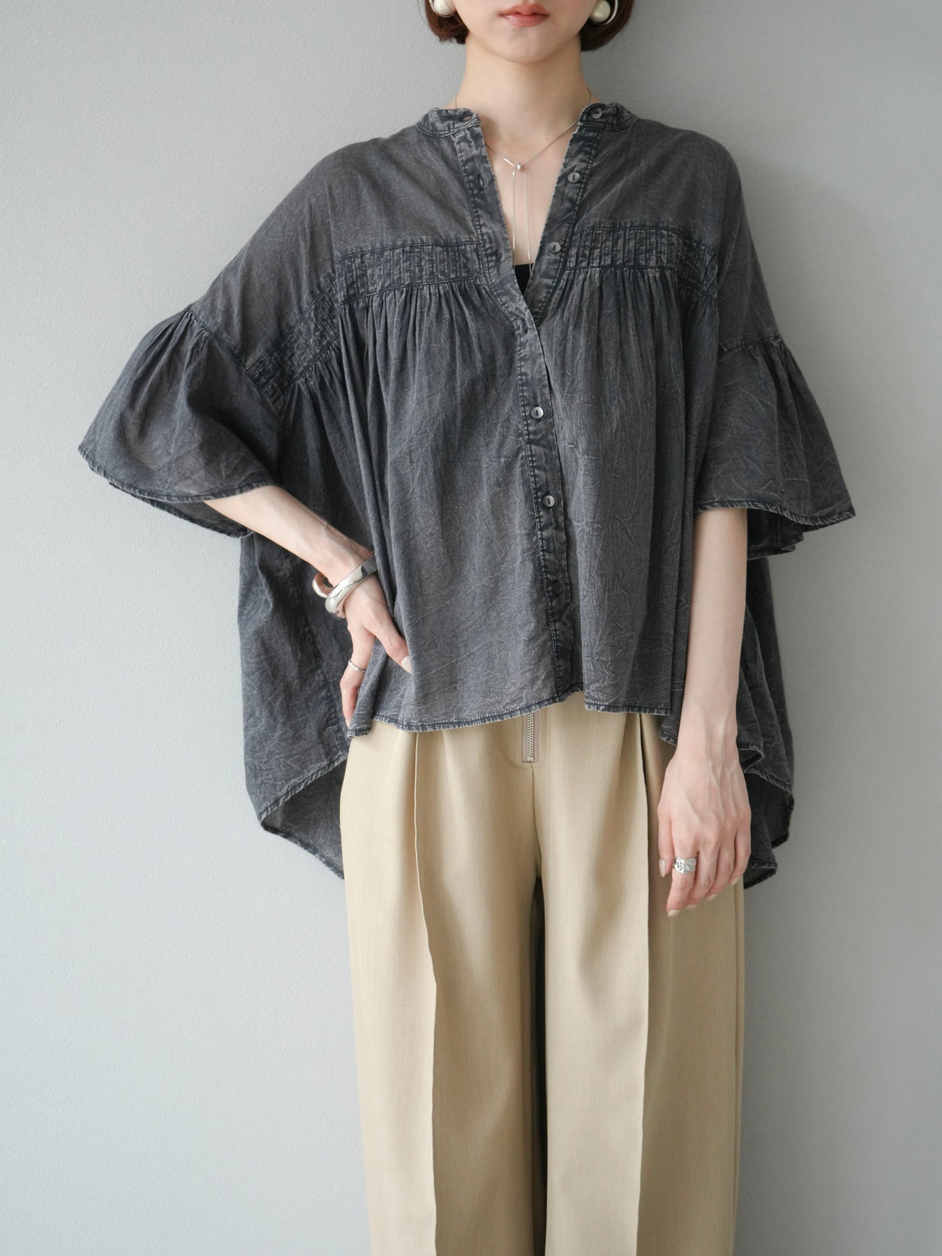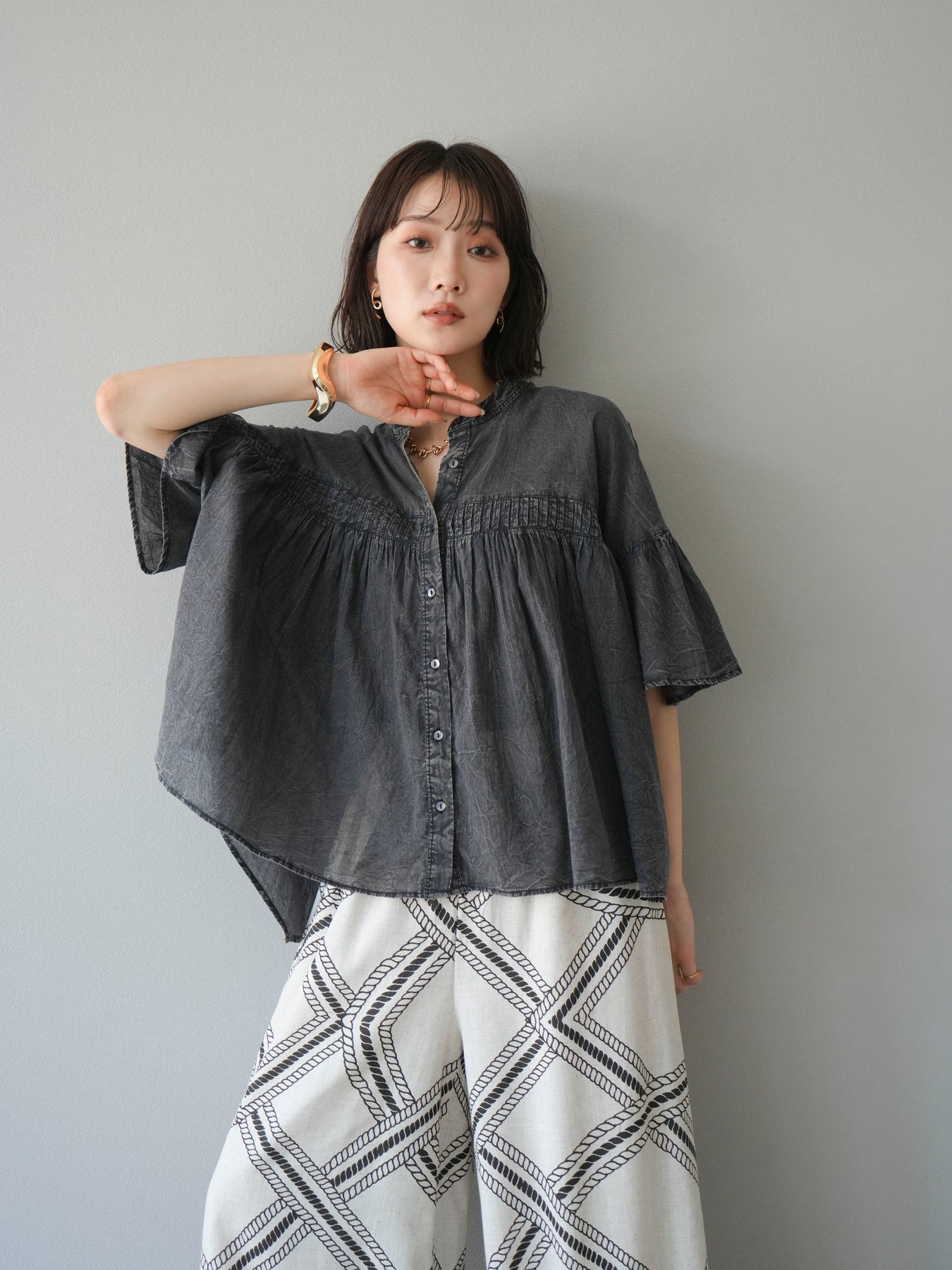 軽やかなインド製コットンボイル素材を使用した、シアー感とヴィンテージ加工が魅力のデニムシャツ。たっぷりとギャザーを施したフレアシルエットが女性らしい抜け感を演出し、動きのある着こなしに。ワッシャー加工による表情のある風合いがこなれ感をプラスし、さらりと羽織るだけで主役級の存在感を放ちます。ヒップが隠れる長め丈で体型カバー効果も◎。ボトムを選ばず、カジュアルにもフェミニンにも着回せる万能アイテムです。 ※ボトムス、キャミソール(インナー)以外の商品は一律でインナーは付属していません。