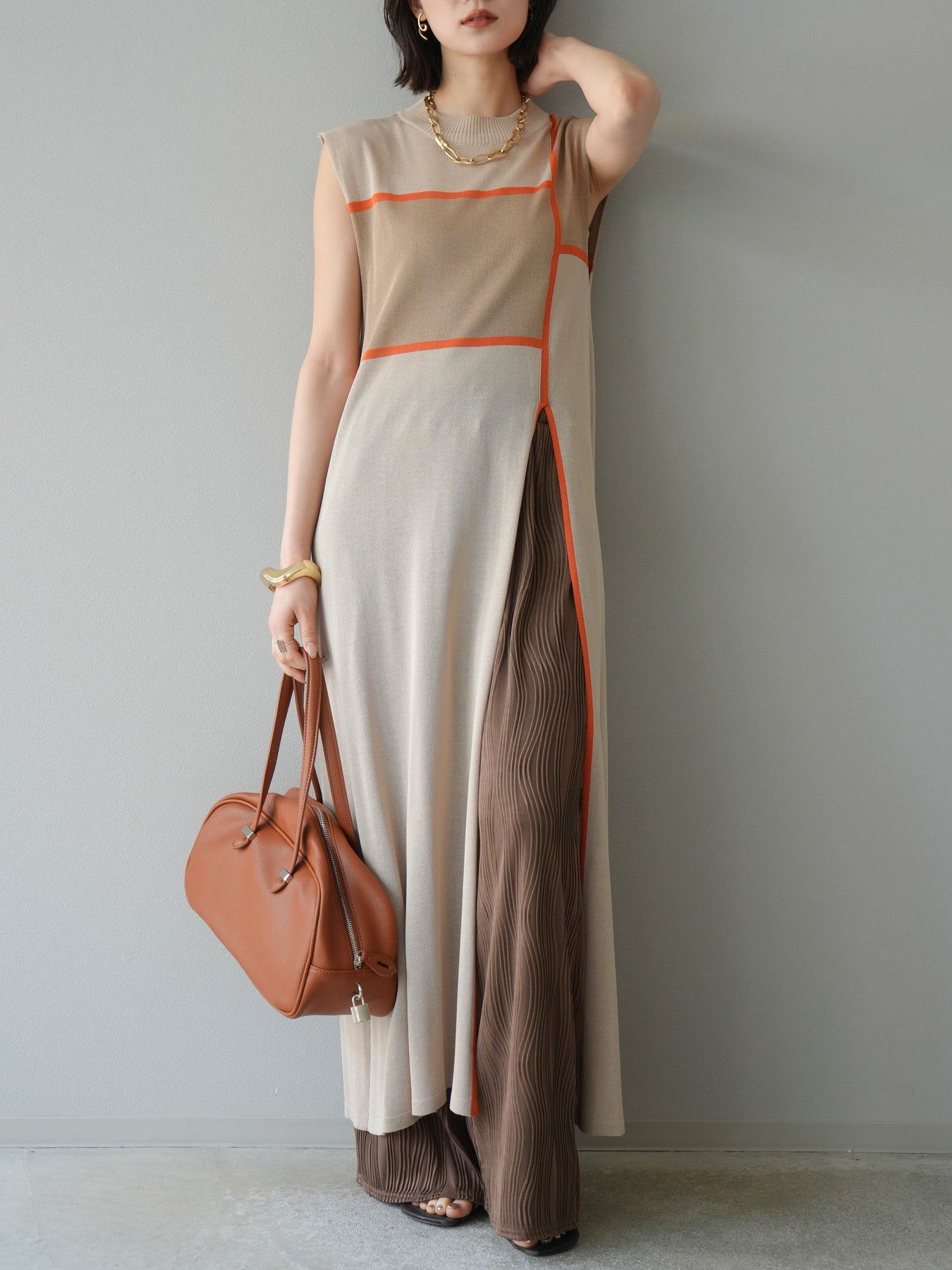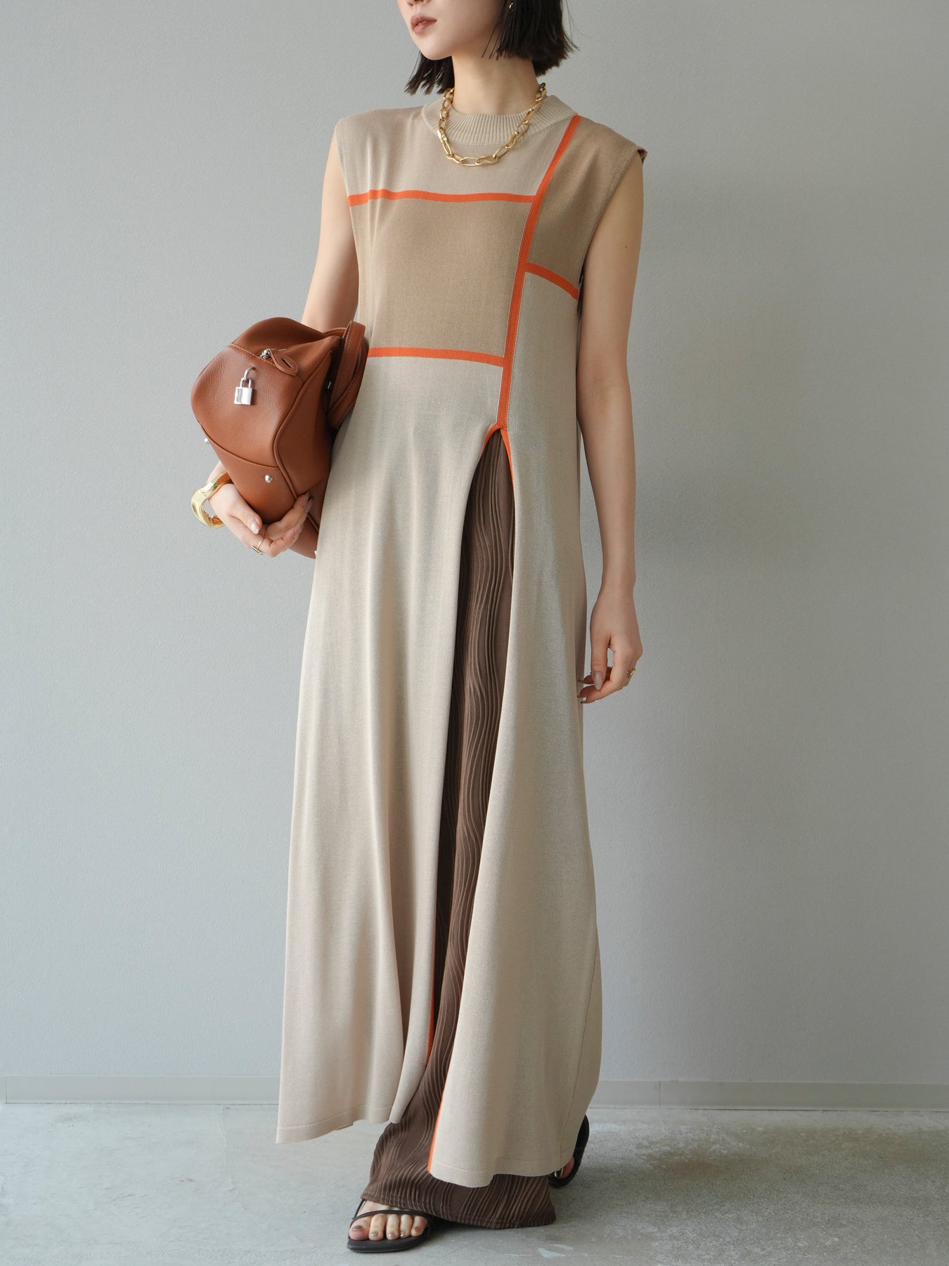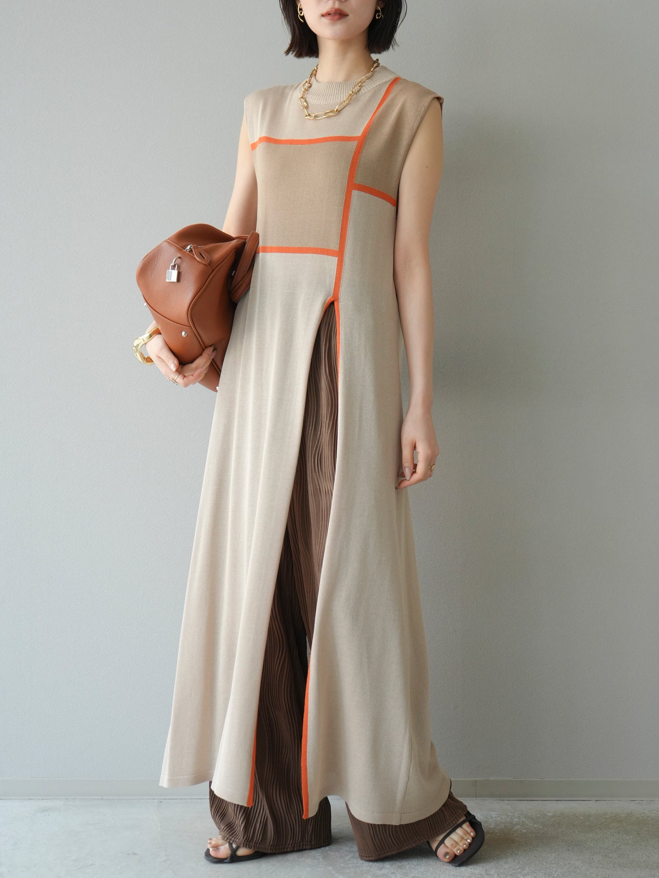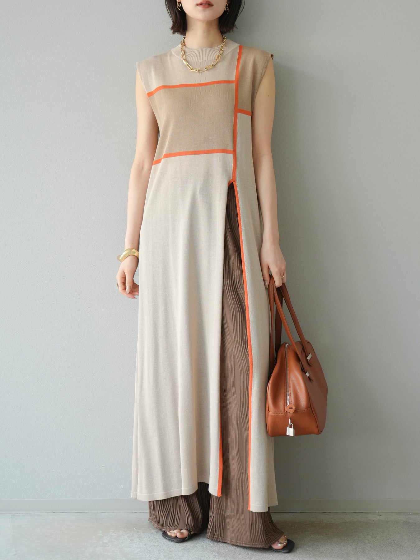 大胆なブロッキングデザインが目を惹く、配色スリットニットワンピース。軽やかなシアーニット素材を使用し、程よい透け感が春夏らしい抜け感を演出します。アートのような配色が視線を惹きつけるデザインで、1枚で存在感のある着こなしに。サイドには深めのスリット入りで、動きやすさとレイヤードスタイルの楽しさを両立。パンツやキャミワンピとの重ね着にもぴったりな、モードとリラックスを兼ね備えた1枚です。 ※ボトムス、キャミソール(インナー)以外の商品は一律でインナーは付属していません。
