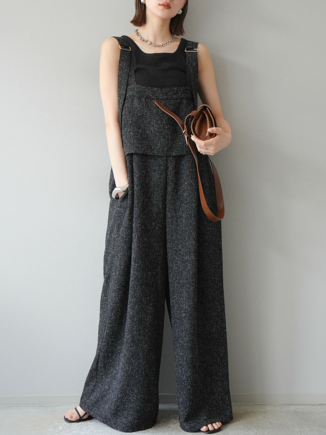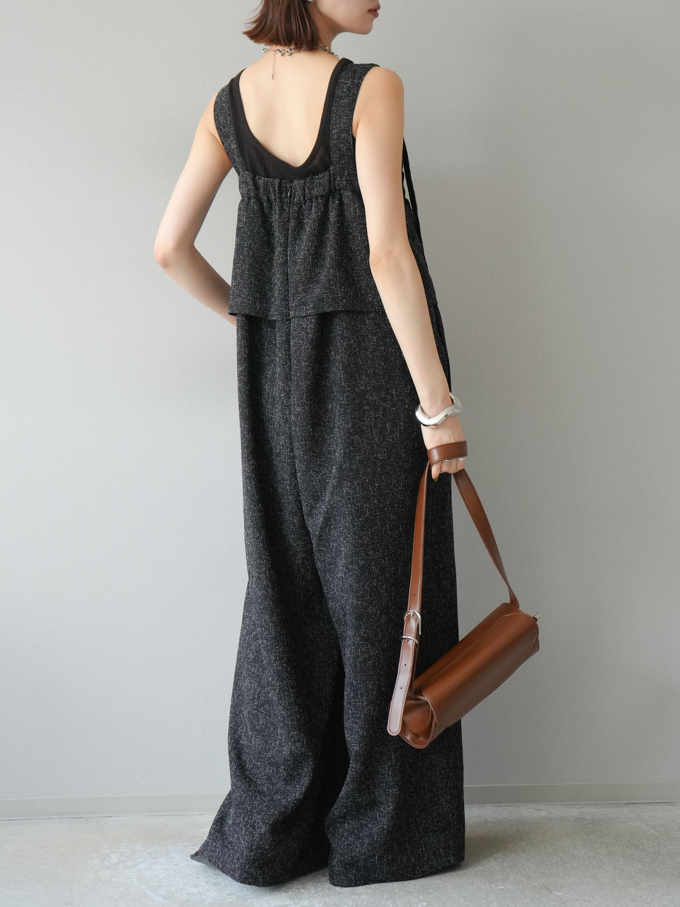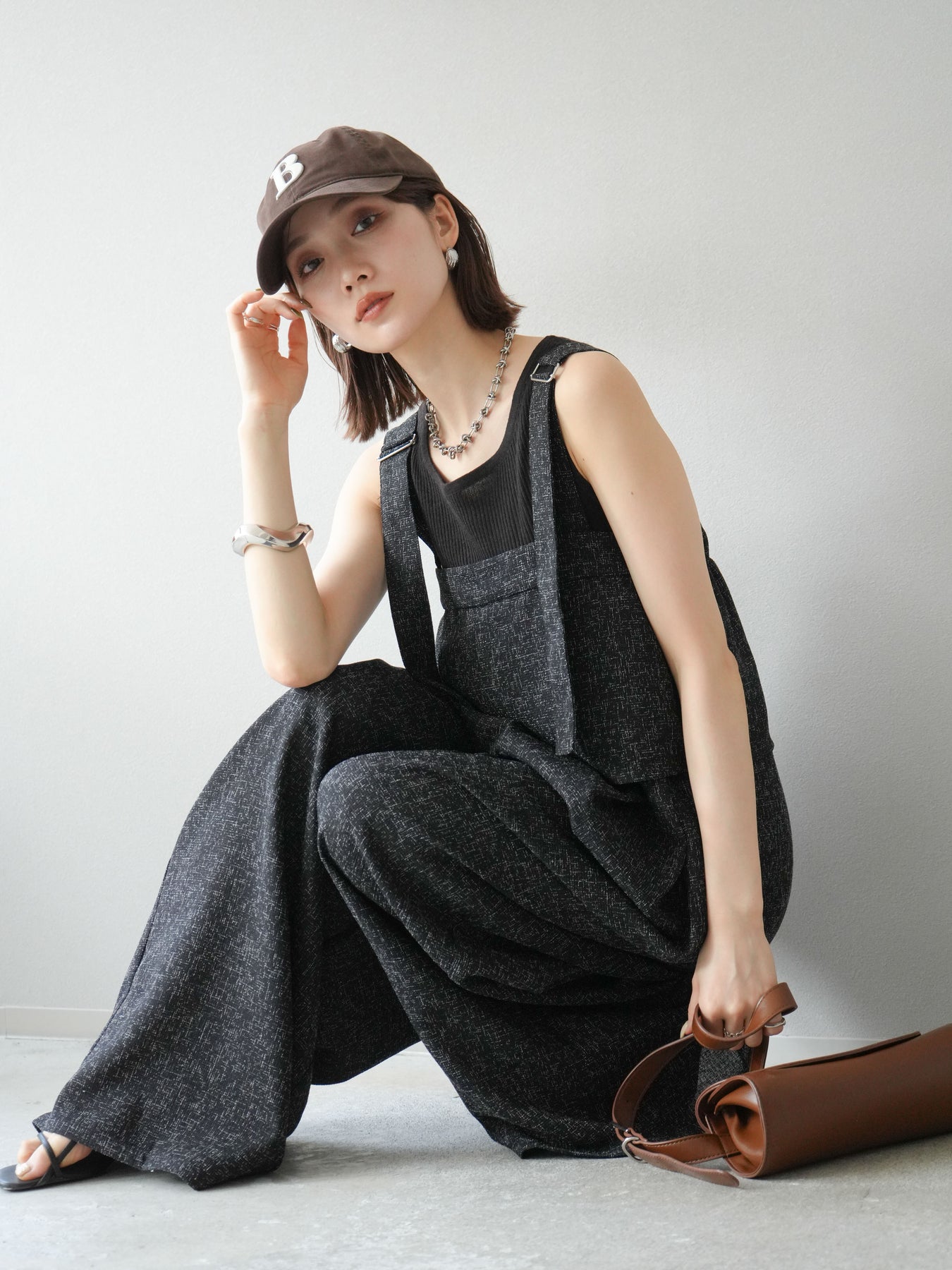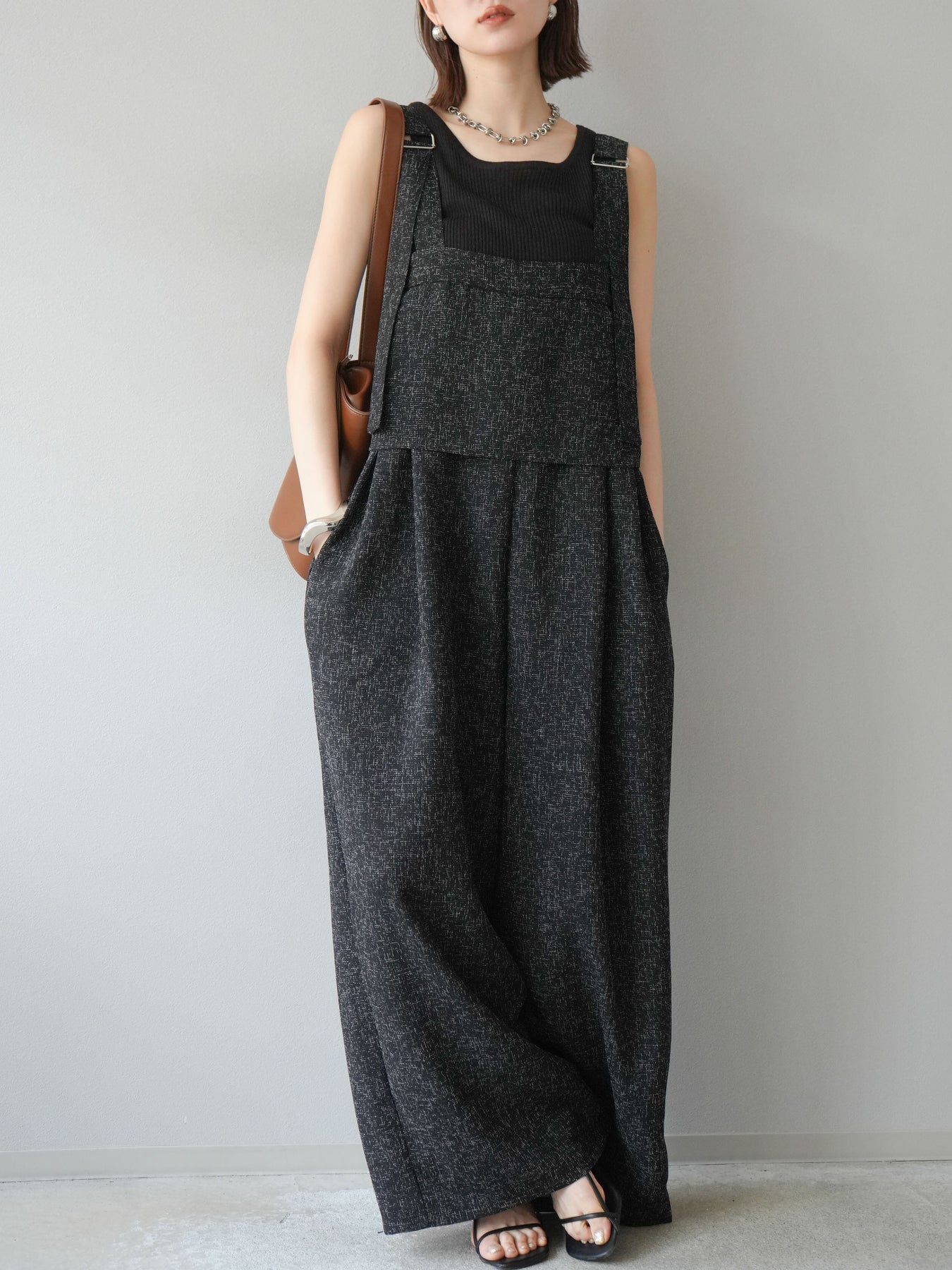 軽やかなサマーツイード素材を使用した、きれいめカジュアルな雰囲気漂うケープデザインサロペット。胸元にレイヤードされたケープ風ディテールが印象的で、シンプルながらも目を惹くアクセントに。 ストレートに落ちるワイドシルエットが体のラインを拾わず、リラクシーな着心地を叶えます。肩紐部分は太めのデザインで、インナーとのレイヤードもしやすい仕様。 Tシャツやリブタンクと合わせるだけで、季節感のあるスタイリングが完成する、大人のためのモードサロペットです。 ※ボトムス、キャミソール(インナー)以外の商品は一律でインナーは付属していません。