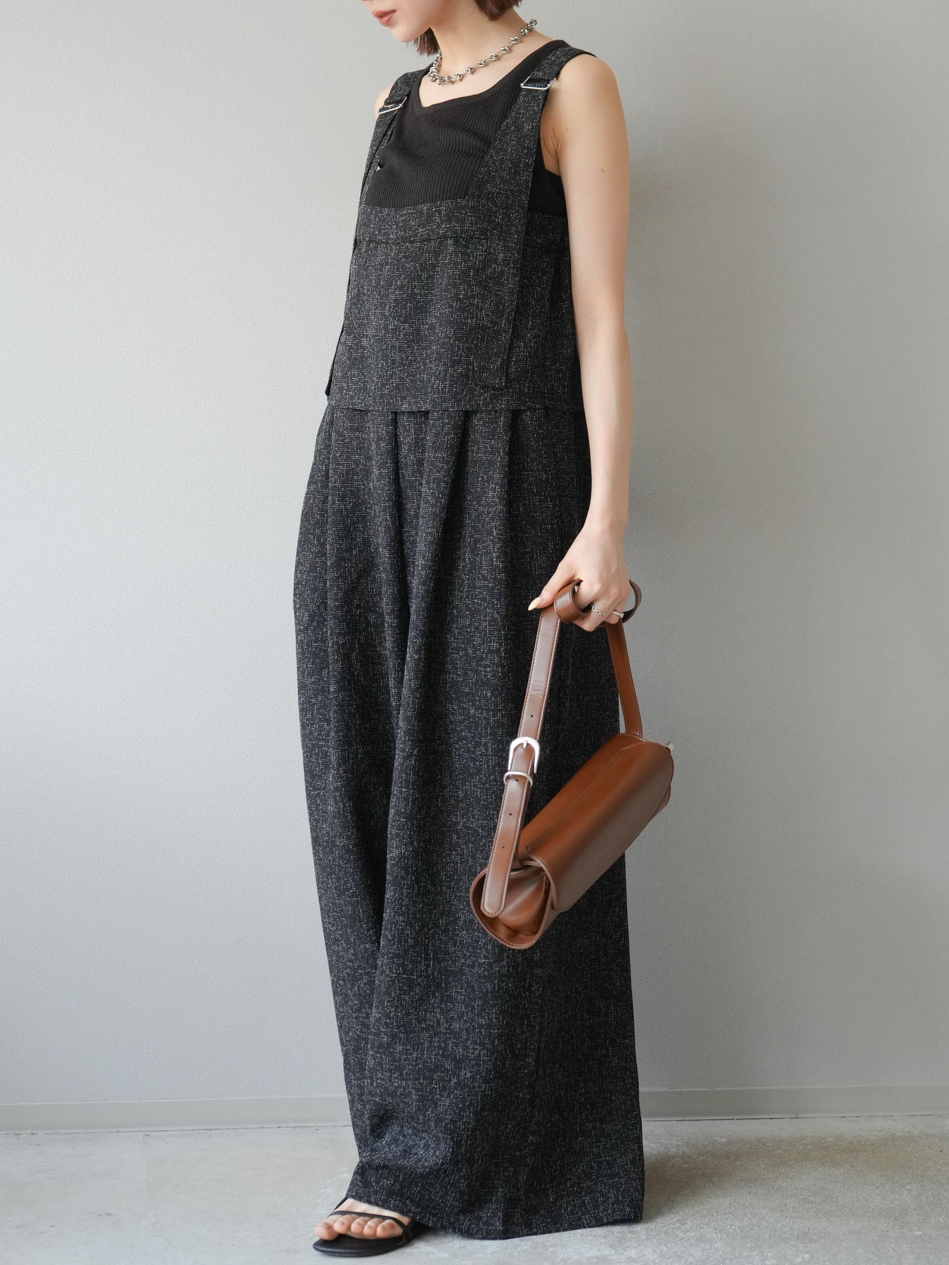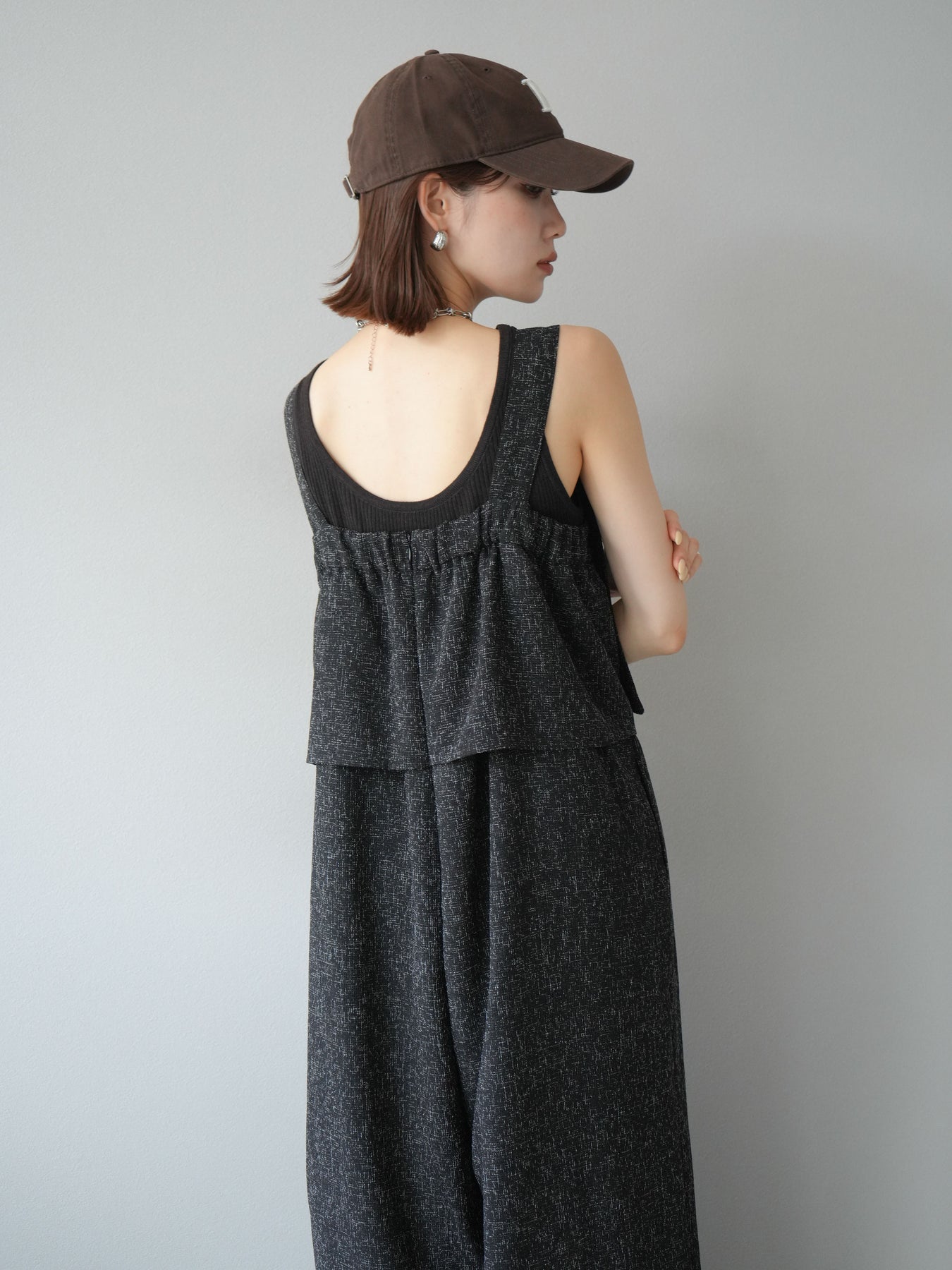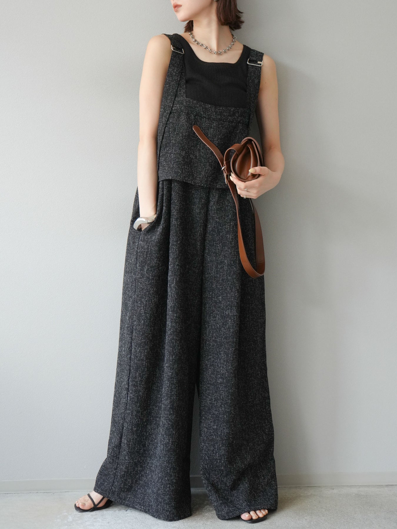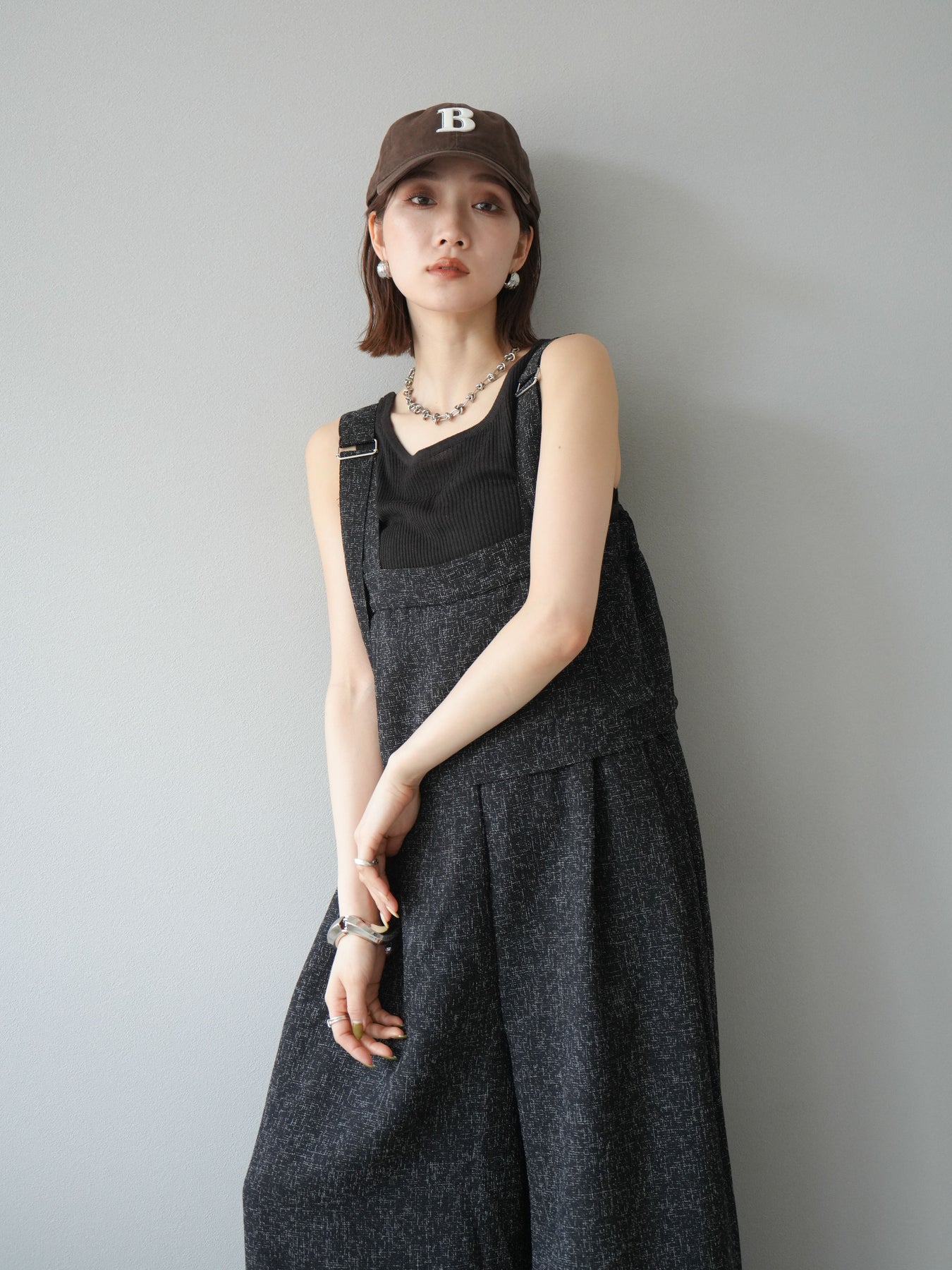 軽やかなサマーツイード素材を使用した、きれいめカジュアルな雰囲気漂うケープデザインサロペット。胸元にレイヤードされたケープ風ディテールが印象的で、シンプルながらも目を惹くアクセントに。 ストレートに落ちるワイドシルエットが体のラインを拾わず、リラクシーな着心地を叶えます。肩紐部分は太めのデザインで、インナーとのレイヤードもしやすい仕様。 Tシャツやリブタンクと合わせるだけで、季節感のあるスタイリングが完成する、大人のためのモードサロペットです。 ※ボトムス、キャミソール(インナー)以外の商品は一律でインナーは付属していません。