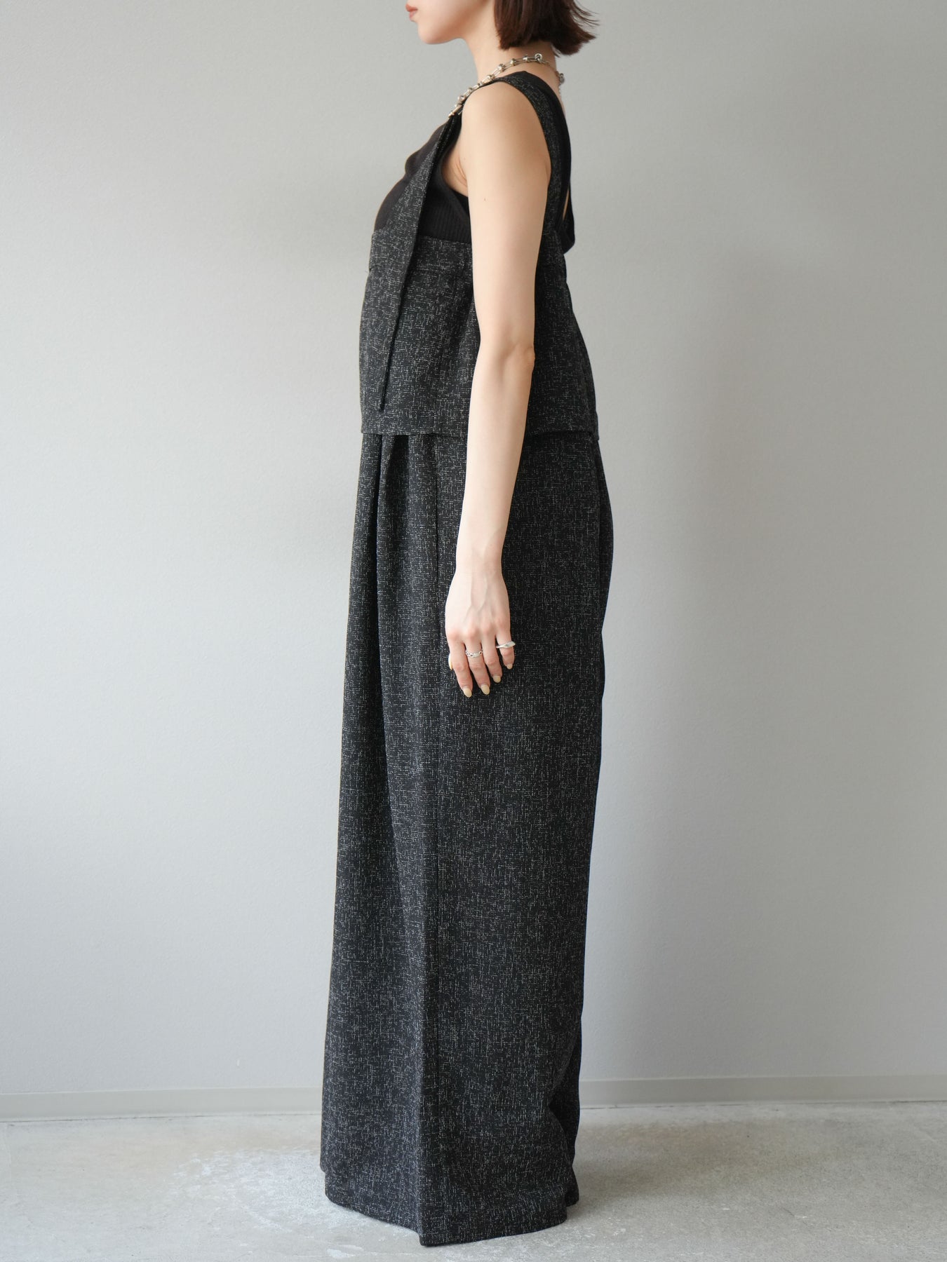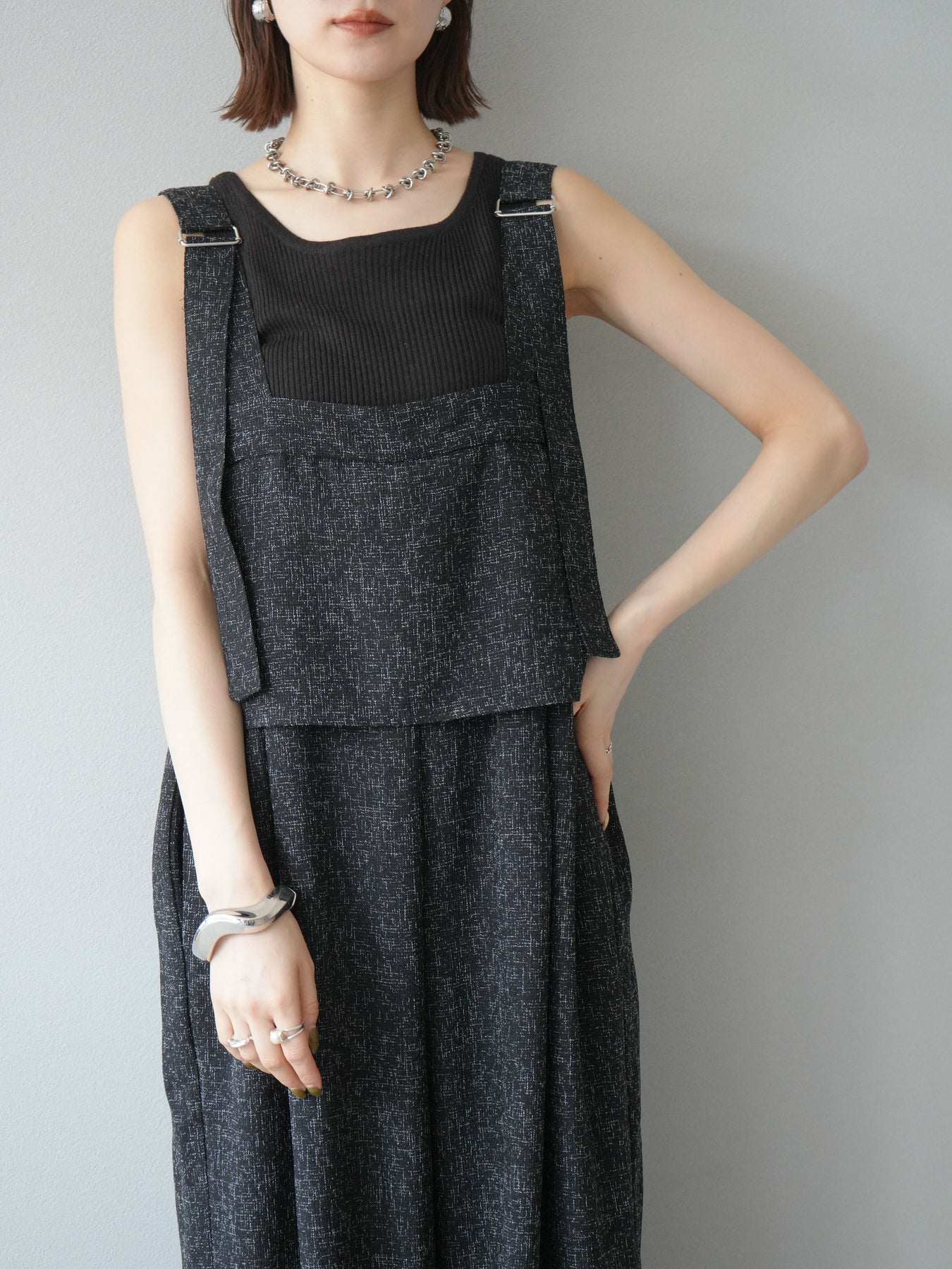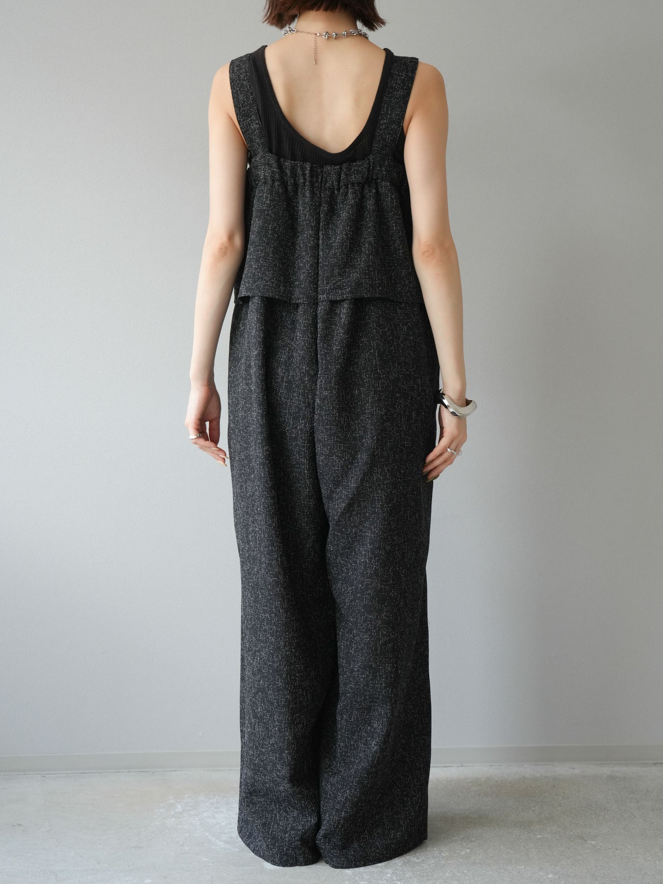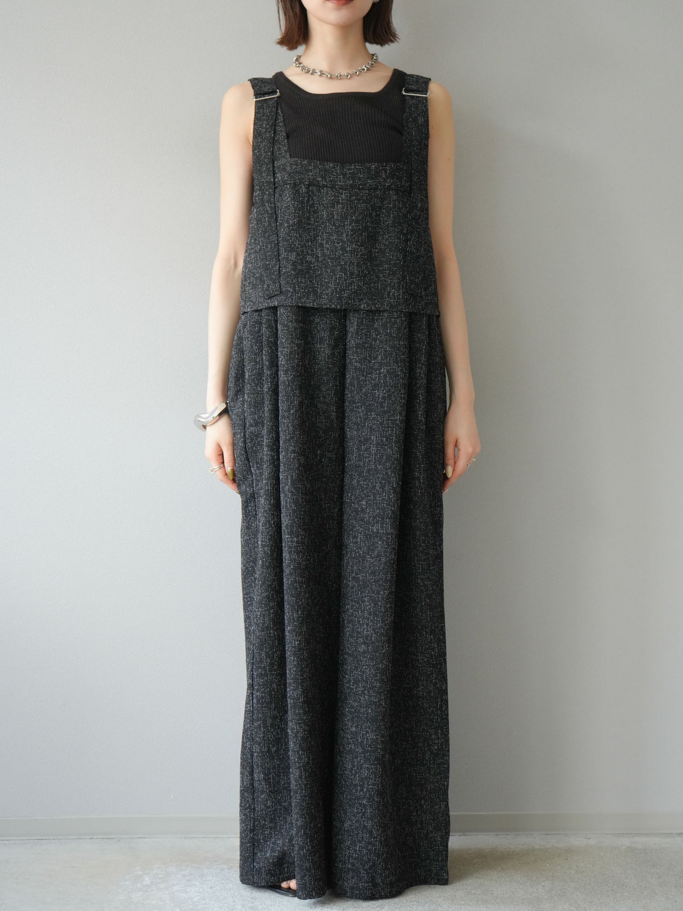 軽やかなサマーツイード素材を使用した、きれいめカジュアルな雰囲気漂うケープデザインサロペット。胸元にレイヤードされたケープ風ディテールが印象的で、シンプルながらも目を惹くアクセントに。 ストレートに落ちるワイドシルエットが体のラインを拾わず、リラクシーな着心地を叶えます。肩紐部分は太めのデザインで、インナーとのレイヤードもしやすい仕様。 Tシャツやリブタンクと合わせるだけで、季節感のあるスタイリングが完成する、大人のためのモードサロペットです。 ※ボトムス、キャミソール(インナー)以外の商品は一律でインナーは付属していません。