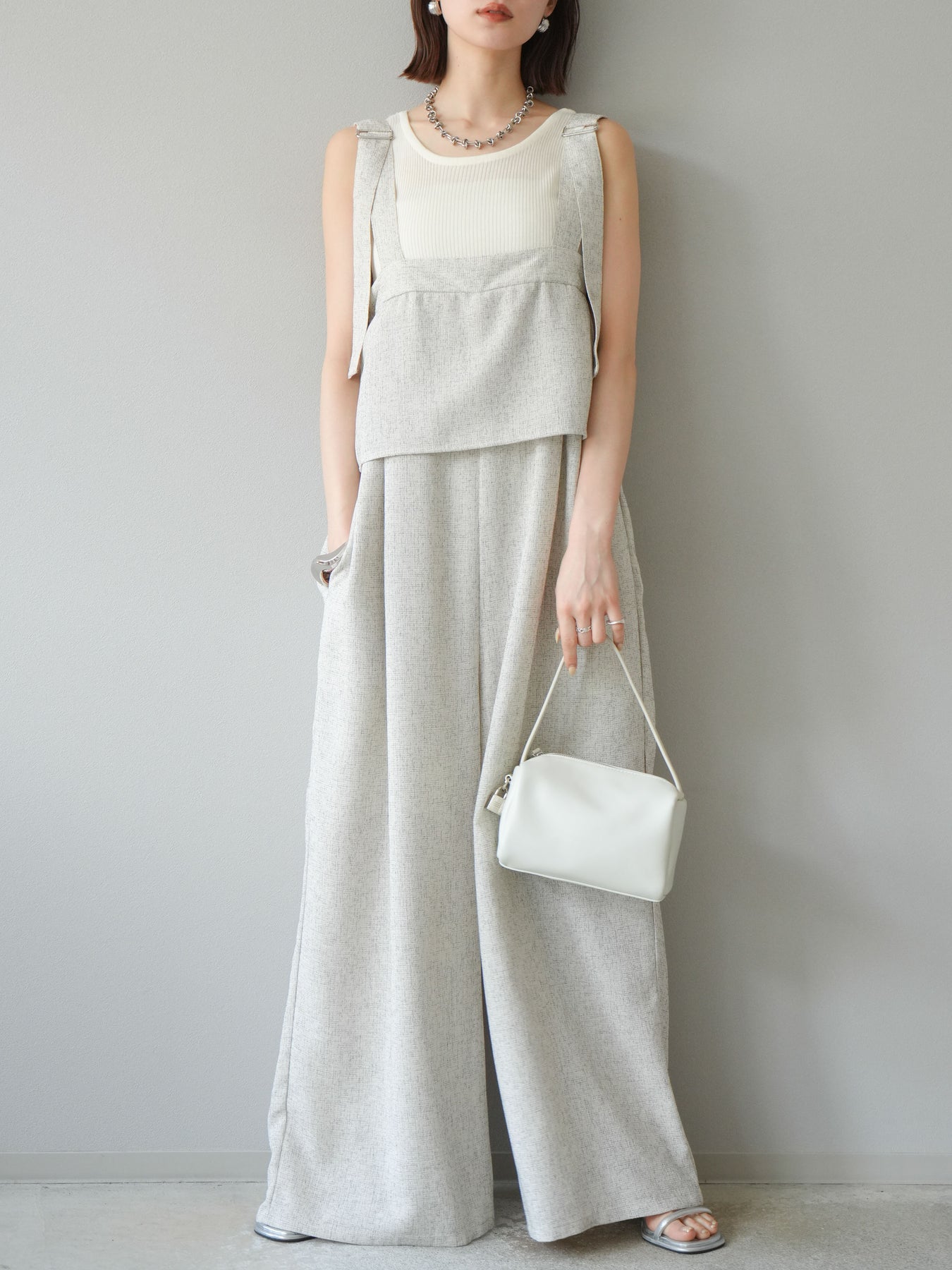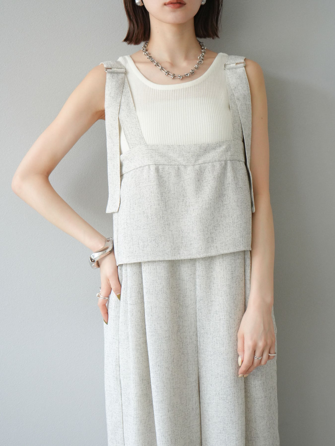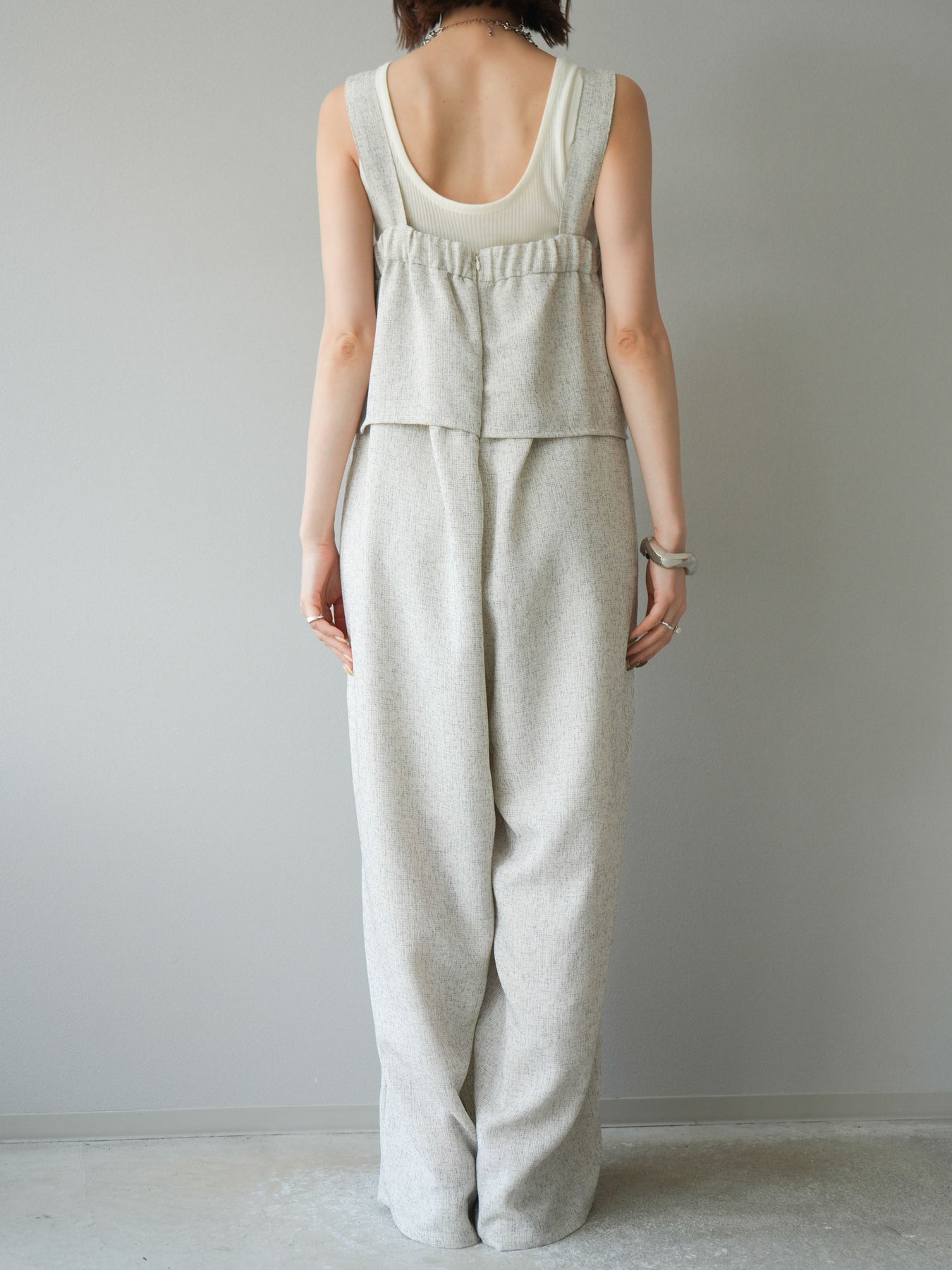 軽やかなサマーツイード素材を使用した、きれいめカジュアルな雰囲気漂うケープデザインサロペット。胸元にレイヤードされたケープ風ディテールが印象的で、シンプルながらも目を惹くアクセントに。 ストレートに落ちるワイドシルエットが体のラインを拾わず、リラクシーな着心地を叶えます。肩紐部分は太めのデザインで、インナーとのレイヤードもしやすい仕様。 Tシャツやリブタンクと合わせるだけで、季節感のあるスタイリングが完成する、大人のためのモードサロペットです。 ※ボトムス、キャミソール(インナー)以外の商品は一律でインナーは付属していません。