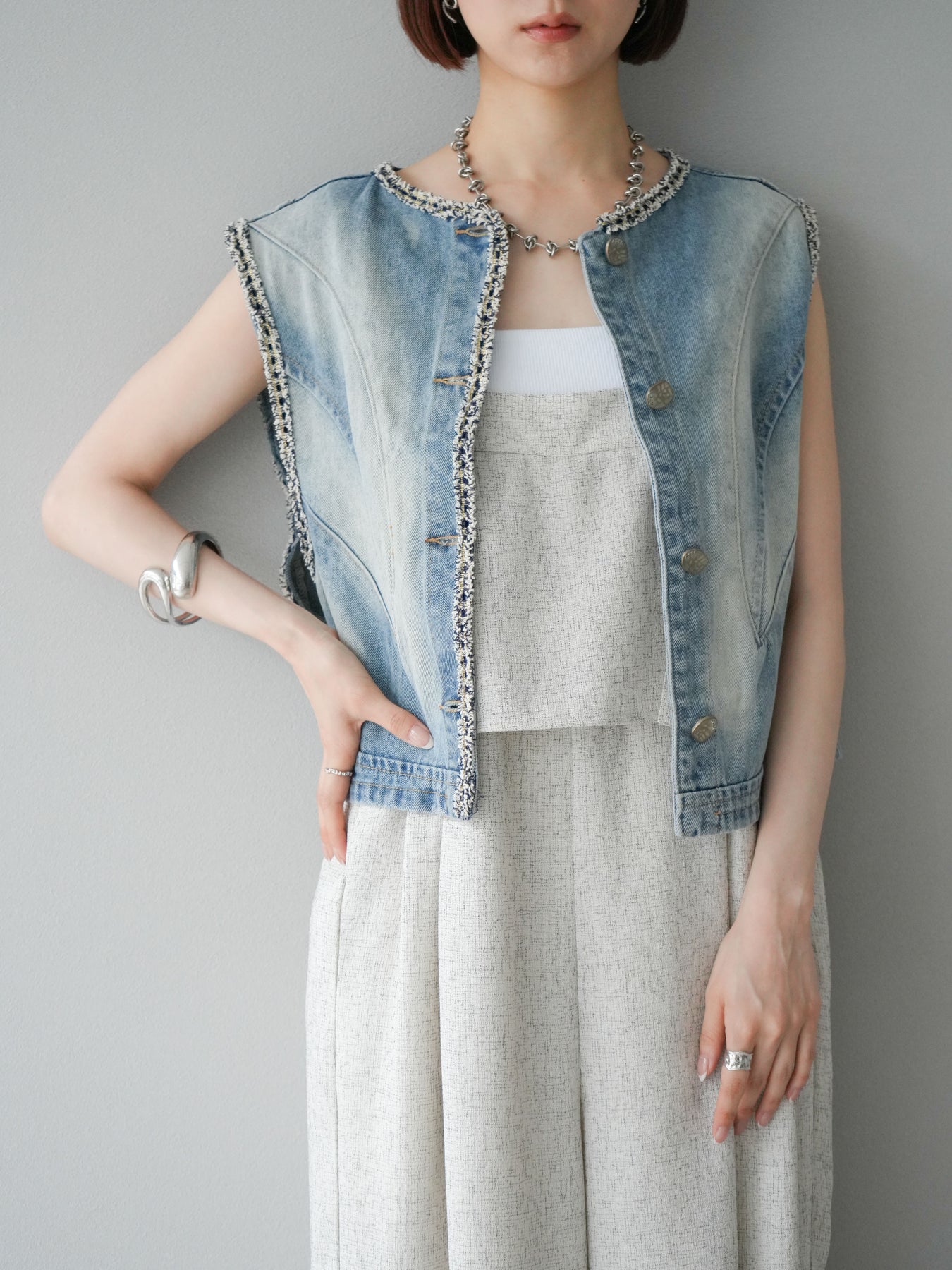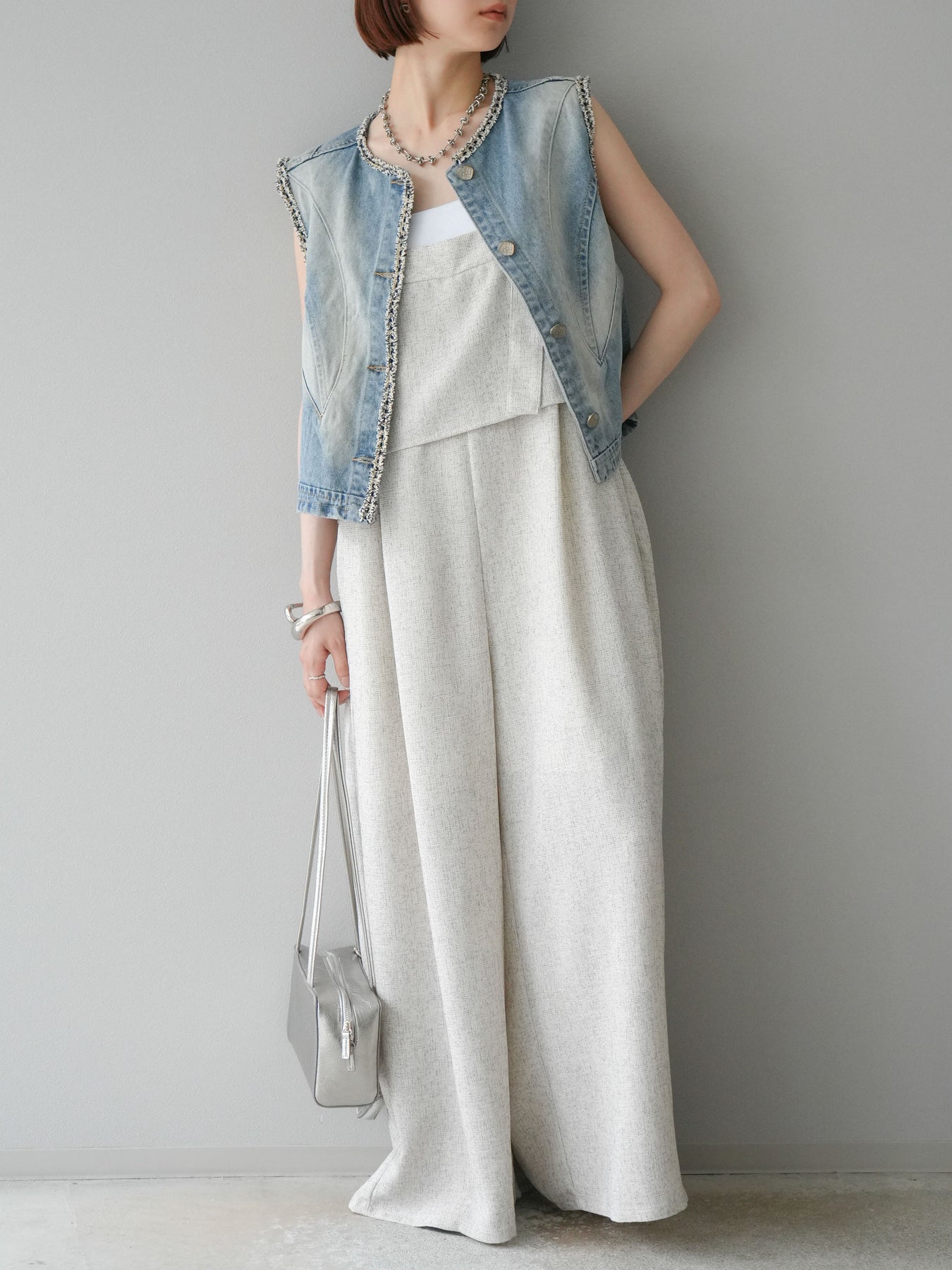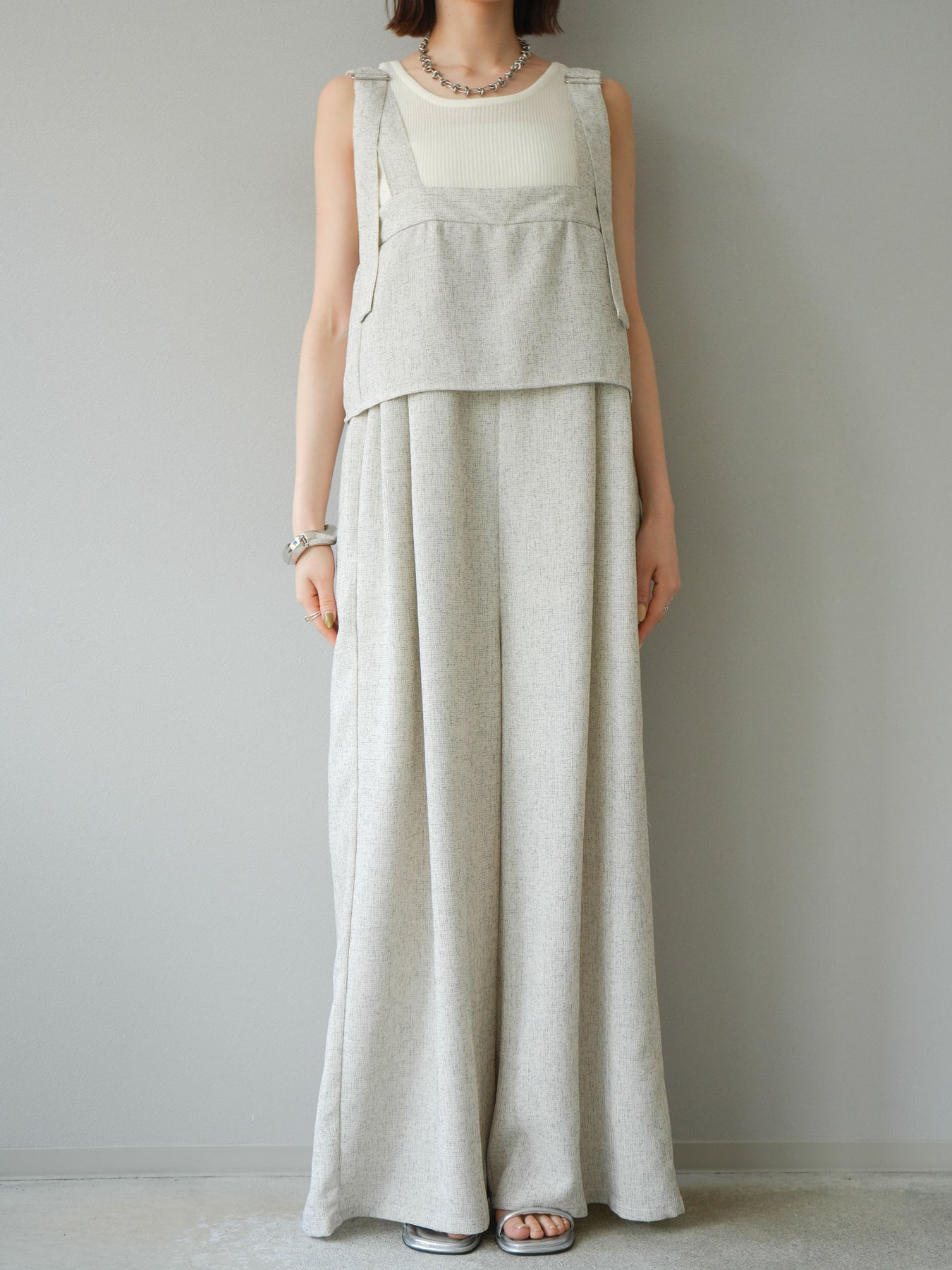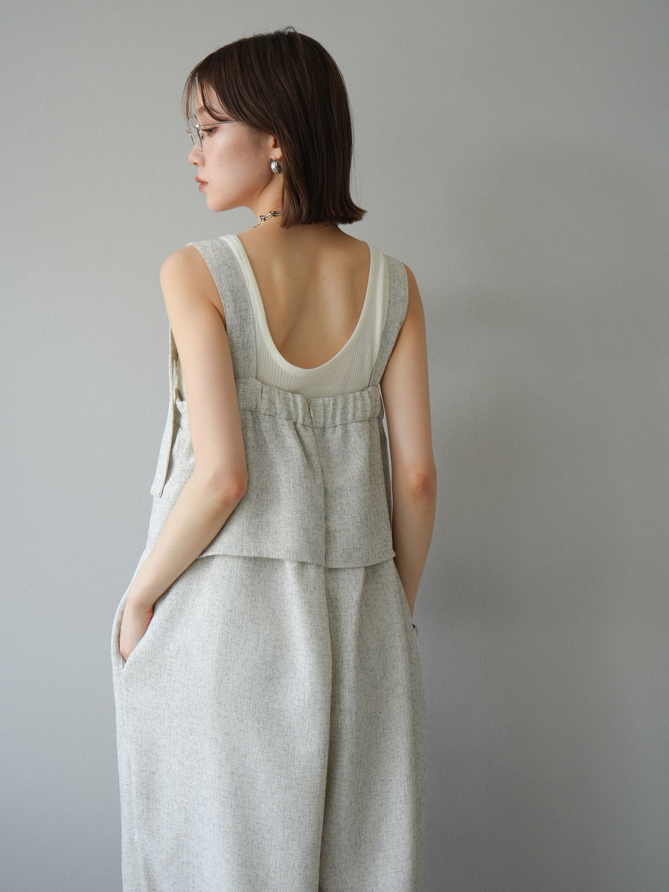 軽やかなサマーツイード素材を使用した、きれいめカジュアルな雰囲気漂うケープデザインサロペット。胸元にレイヤードされたケープ風ディテールが印象的で、シンプルながらも目を惹くアクセントに。 ストレートに落ちるワイドシルエットが体のラインを拾わず、リラクシーな着心地を叶えます。肩紐部分は太めのデザインで、インナーとのレイヤードもしやすい仕様。 Tシャツやリブタンクと合わせるだけで、季節感のあるスタイリングが完成する、大人のためのモードサロペットです。 ※ボトムス、キャミソール(インナー)以外の商品は一律でインナーは付属していません。