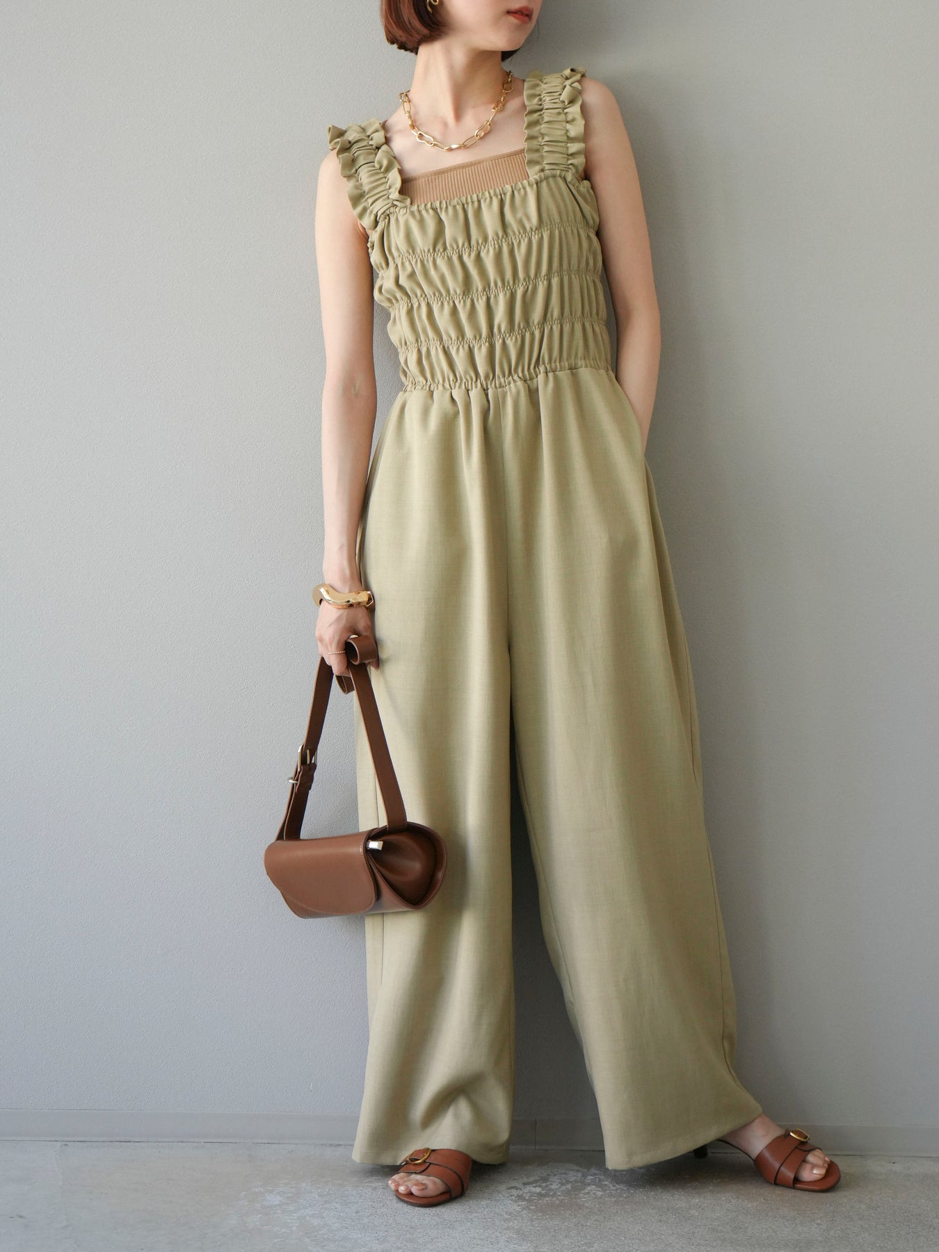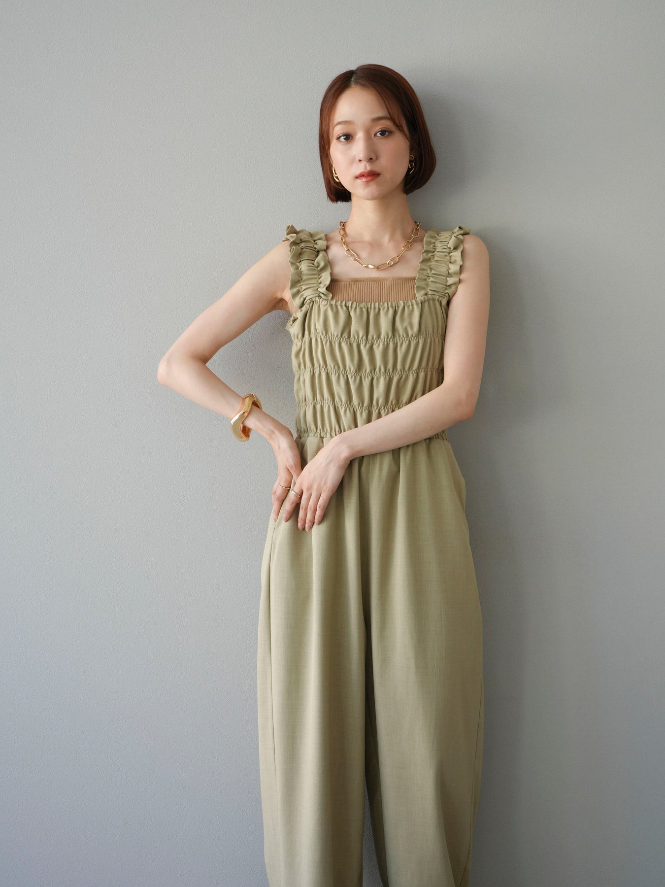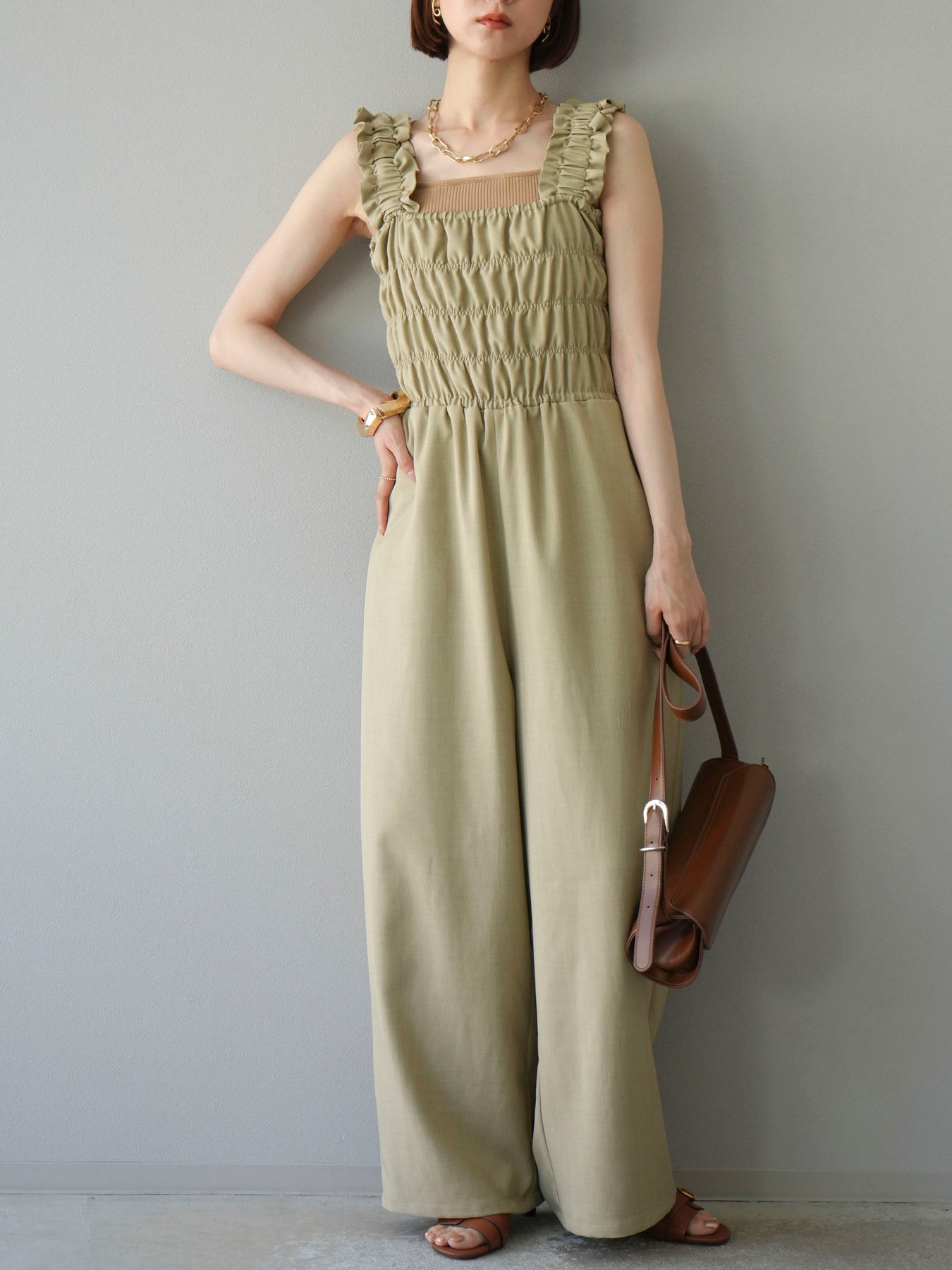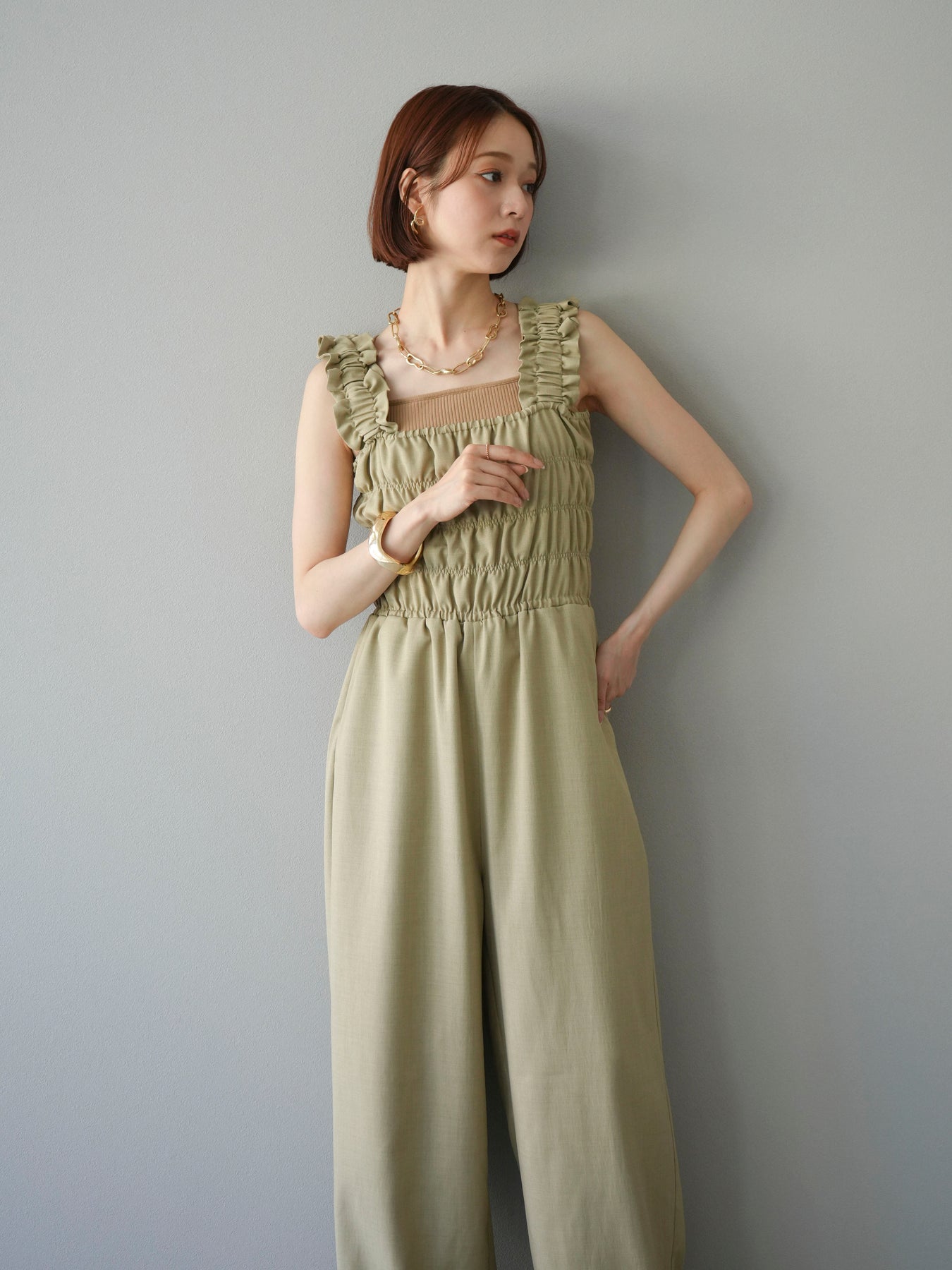 ふんわりと寄せたシャーリングデザインと、肩のフリルが華やかさを添えるサロペット。 ヘザー調のエステル素材が軽やかで涼しげな印象を演出します。 ウエスト周りは伸縮性があり、リラクシーな着心地ながらもスタイルアップが叶うシルエット。 Tシャツやタンクトップと合わせるだけで、女性らしいスタイリングが完成します。 ※ボトムス、キャミソール(インナー)以外の商品は一律でインナーは付属していません。