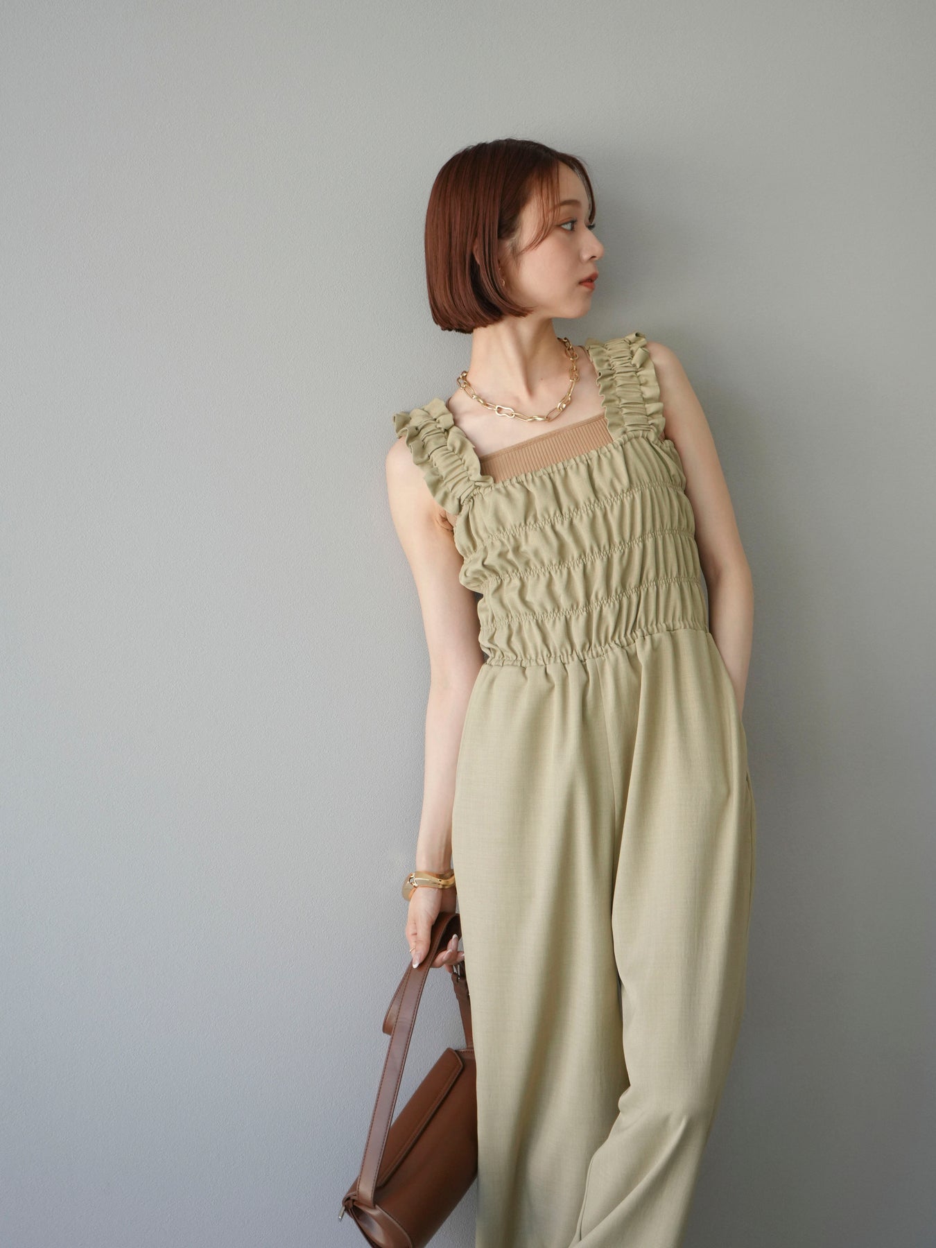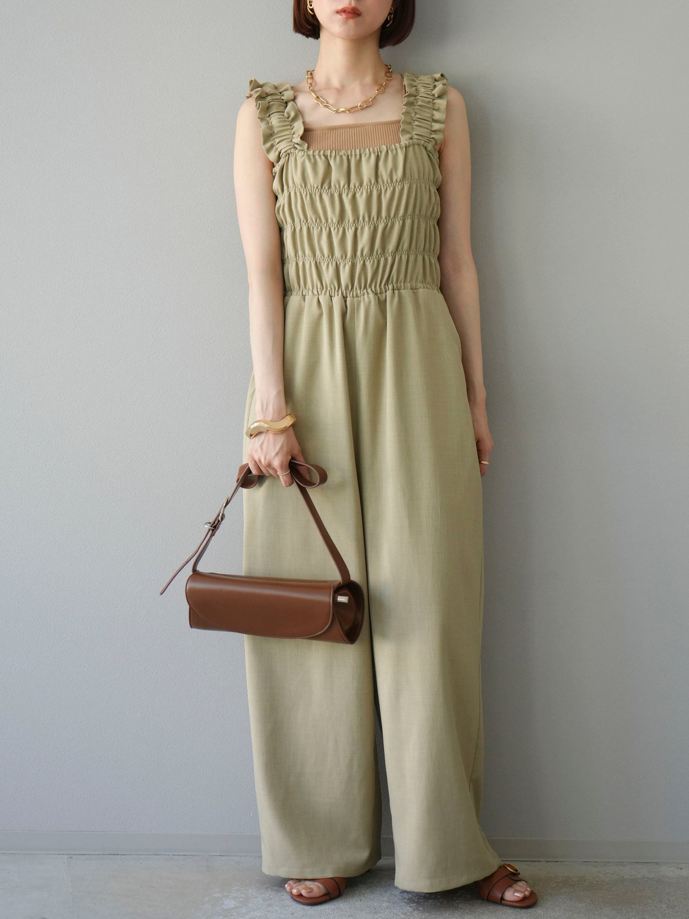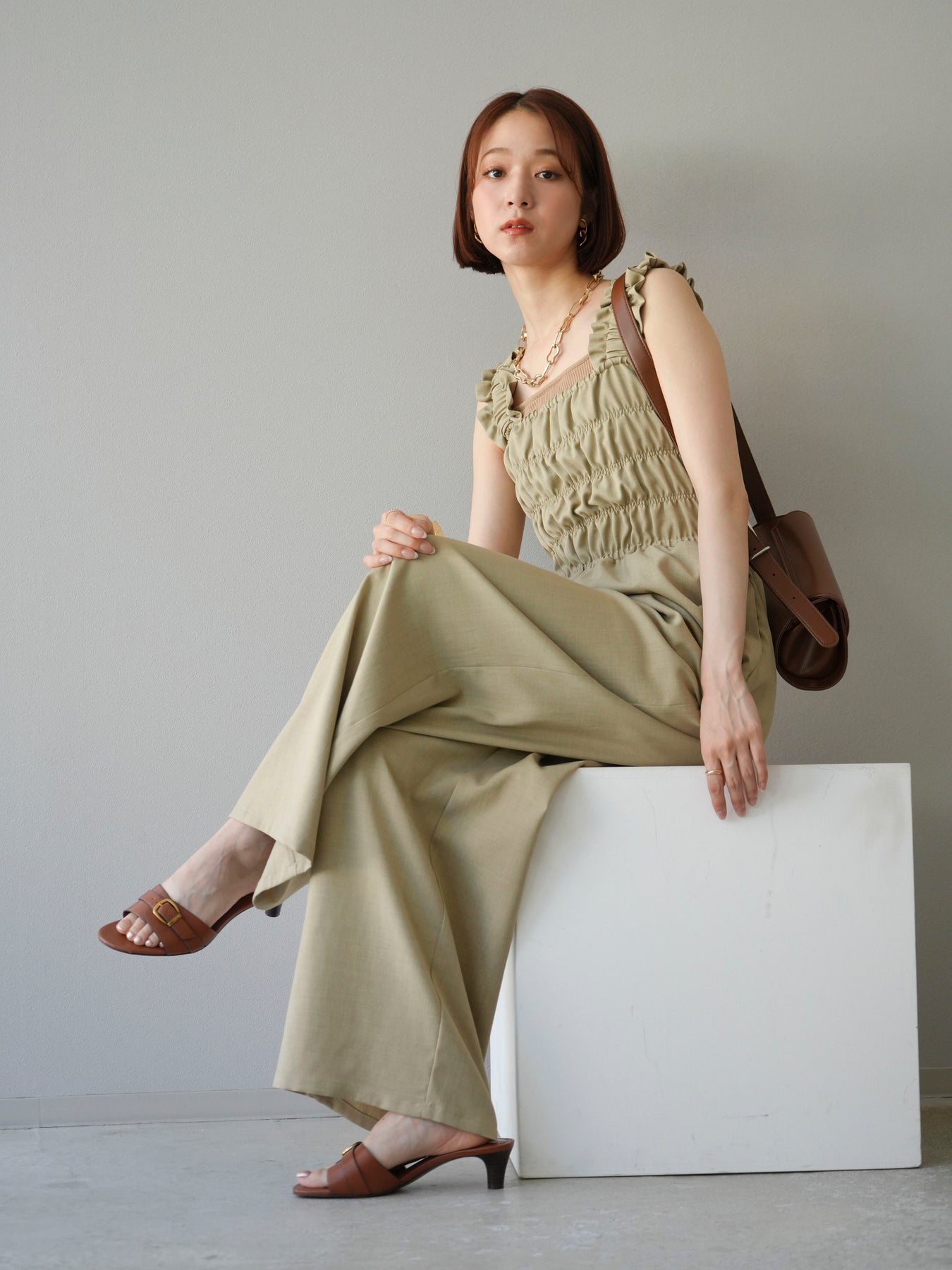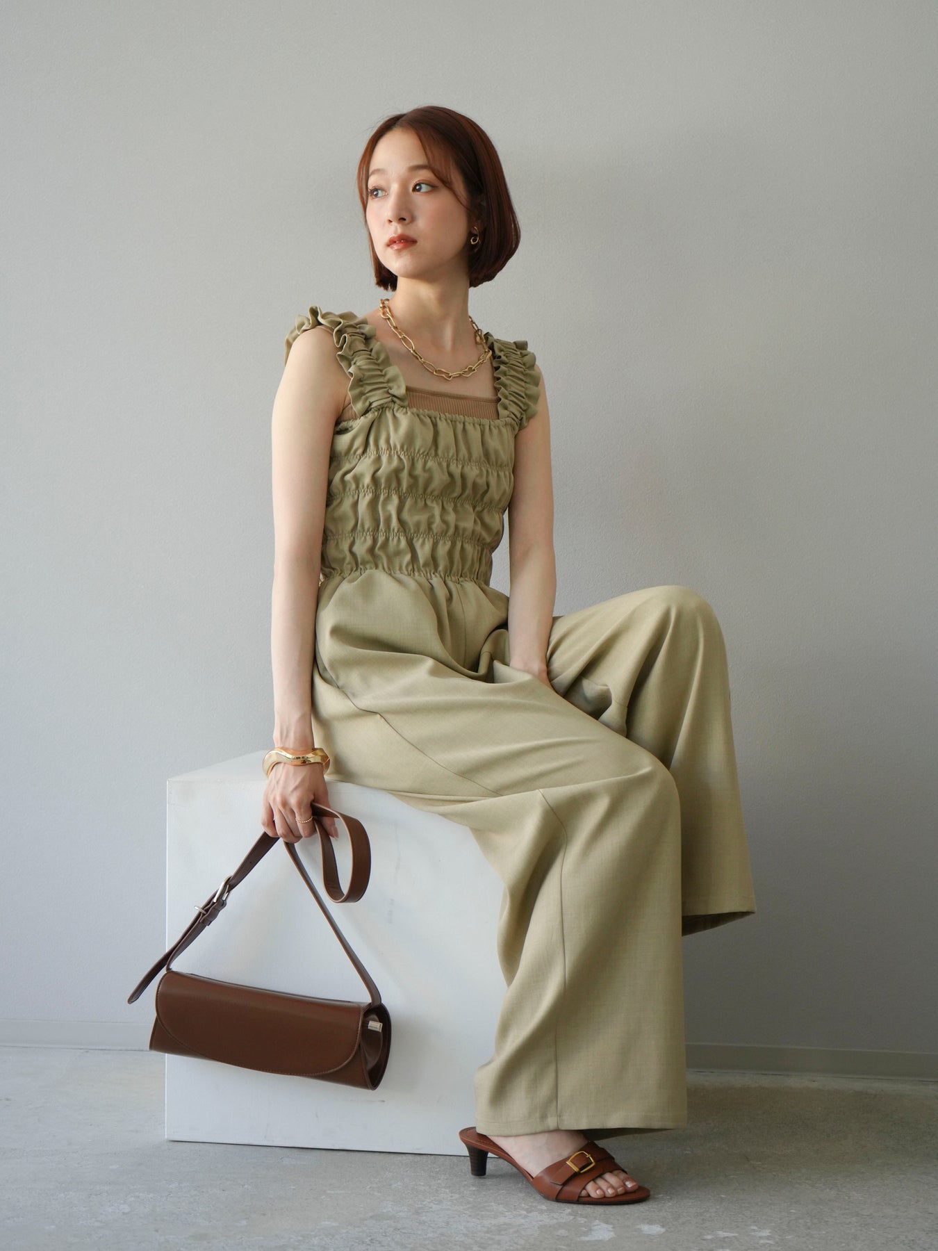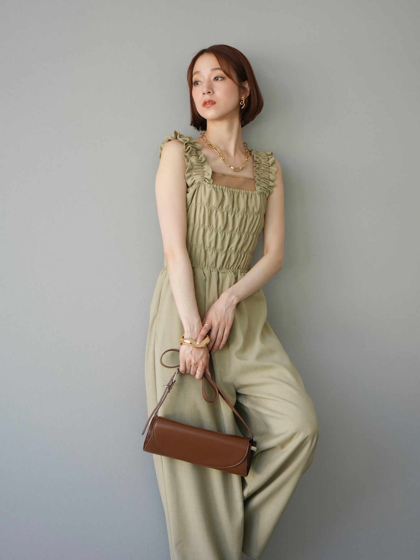 ふんわりと寄せたシャーリングデザインと、肩のフリルが華やかさを添えるサロペット。 ヘザー調のエステル素材が軽やかで涼しげな印象を演出します。 ウエスト周りは伸縮性があり、リラクシーな着心地ながらもスタイルアップが叶うシルエット。 Tシャツやタンクトップと合わせるだけで、女性らしいスタイリングが完成します。 ※ボトムス、キャミソール(インナー)以外の商品は一律でインナーは付属していません。
