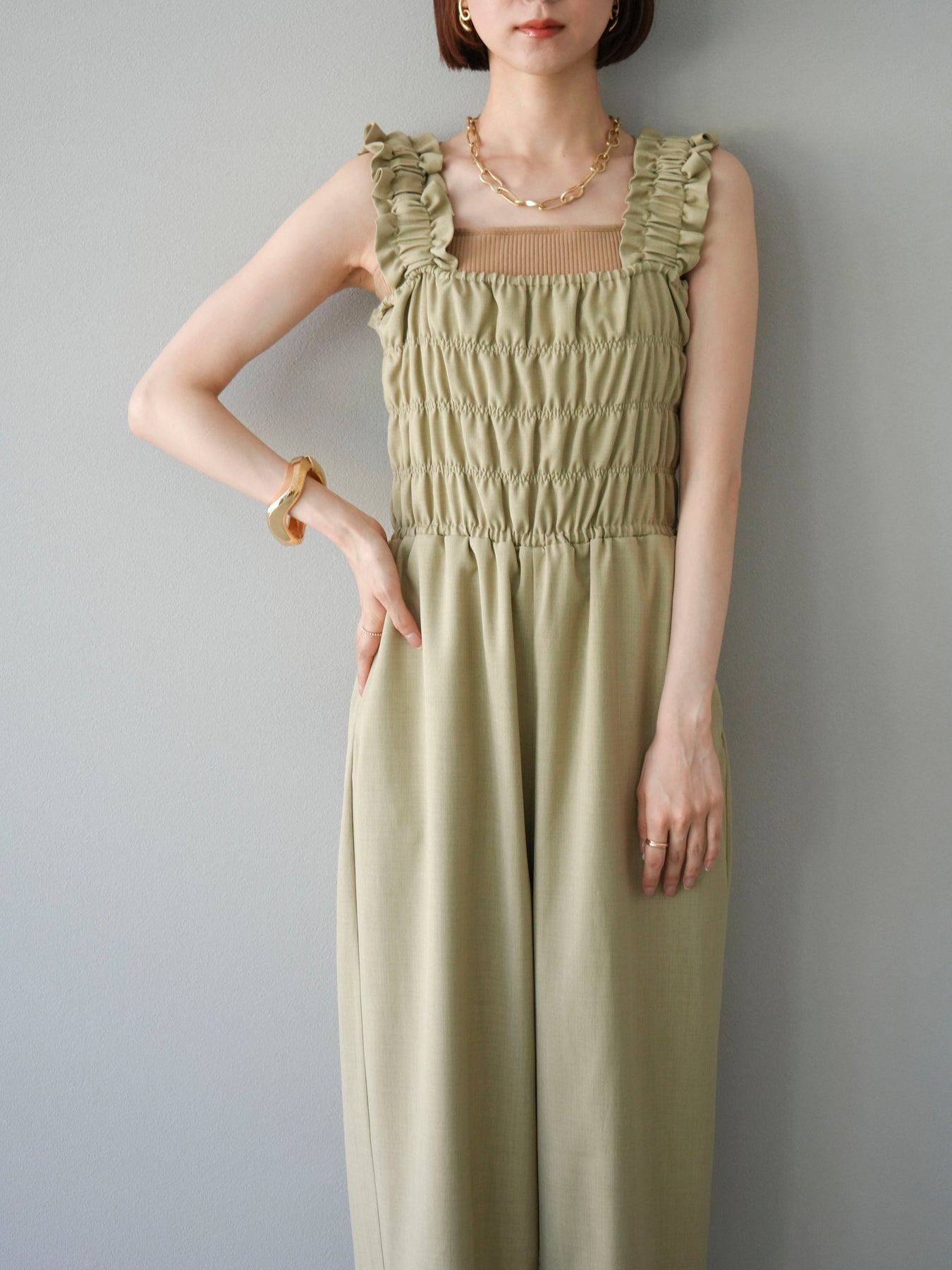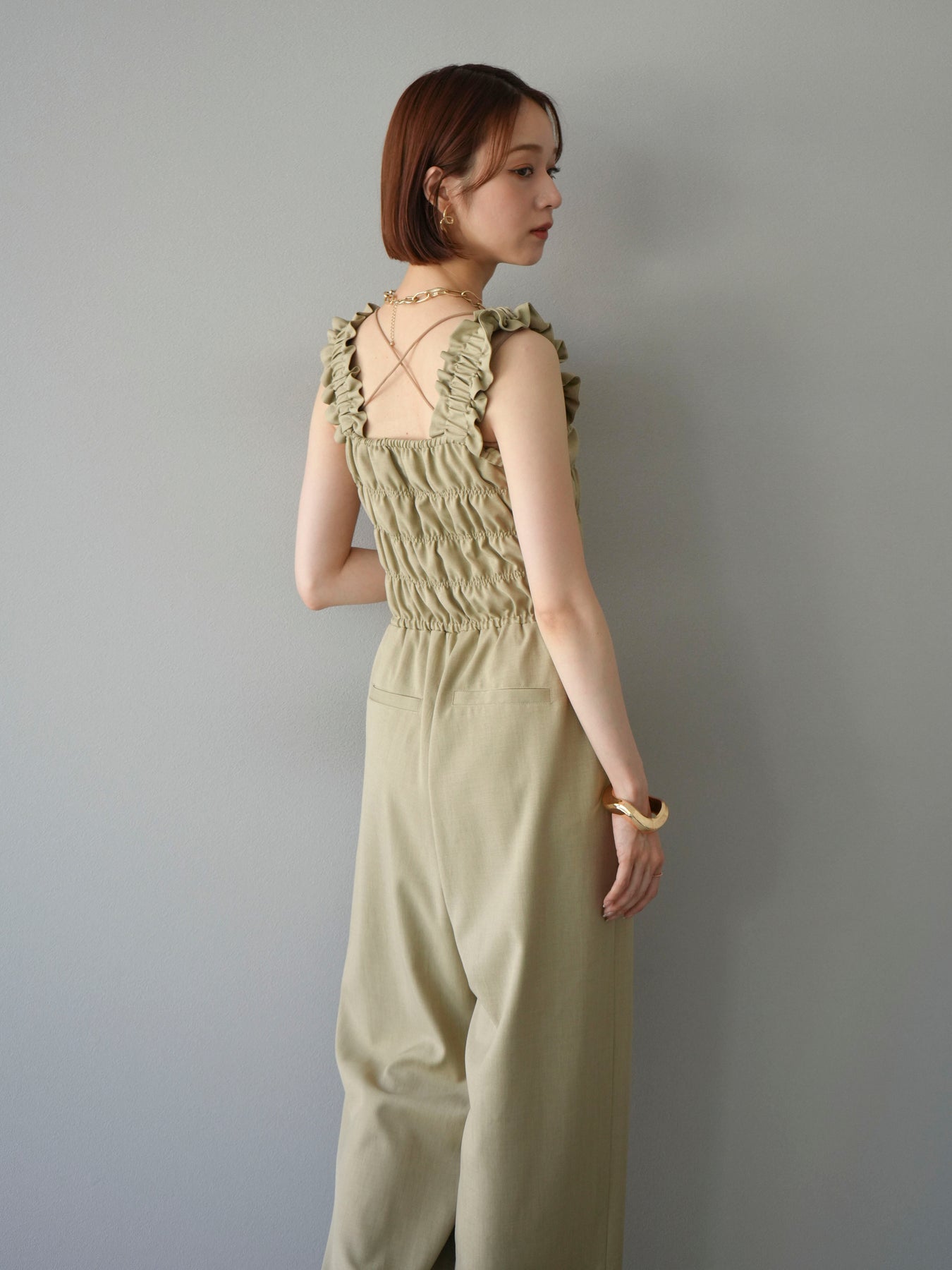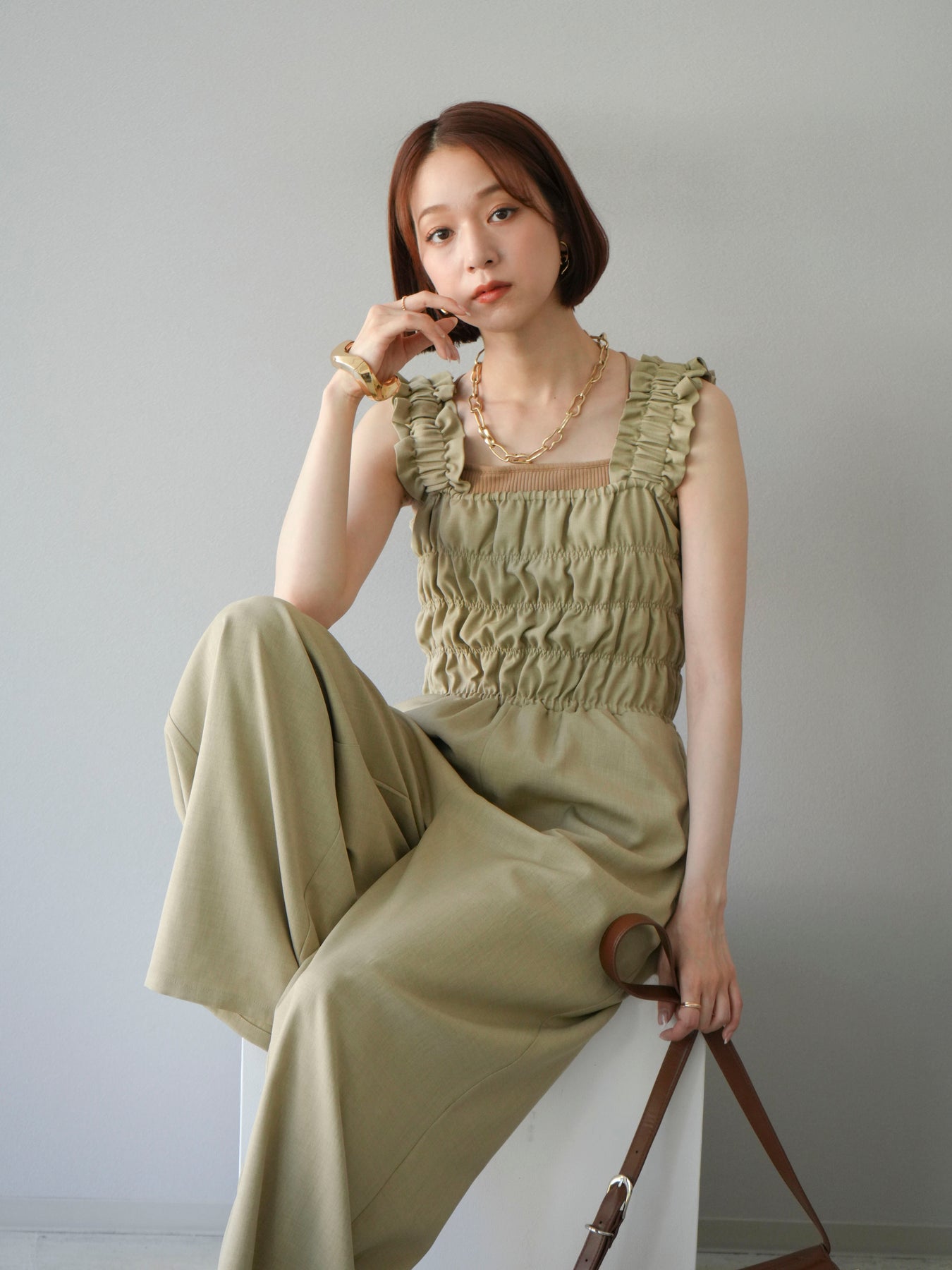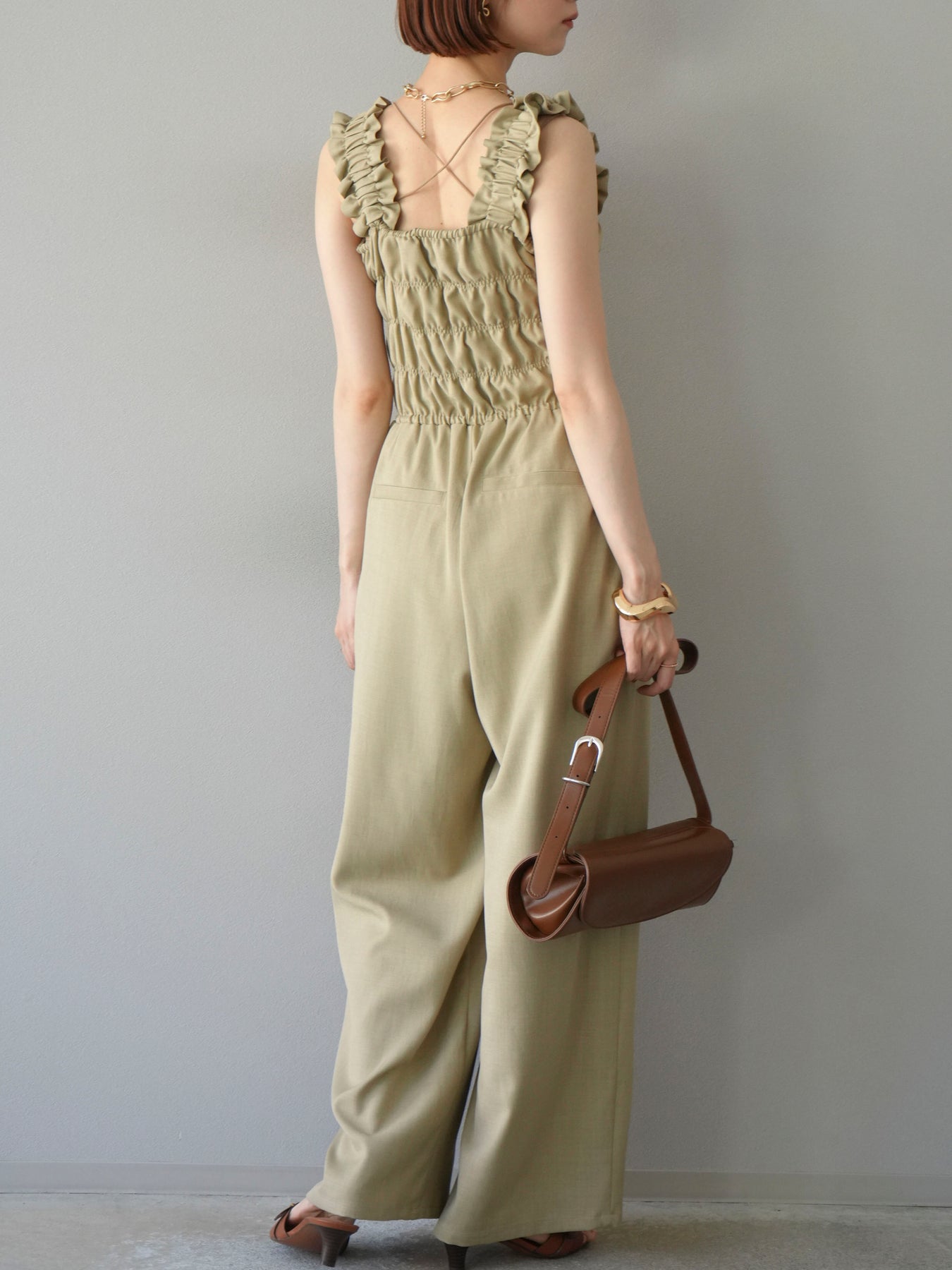 ふんわりと寄せたシャーリングデザインと、肩のフリルが華やかさを添えるサロペット。 ヘザー調のエステル素材が軽やかで涼しげな印象を演出します。 ウエスト周りは伸縮性があり、リラクシーな着心地ながらもスタイルアップが叶うシルエット。 Tシャツやタンクトップと合わせるだけで、女性らしいスタイリングが完成します。 ※ボトムス、キャミソール(インナー)以外の商品は一律でインナーは付属していません。