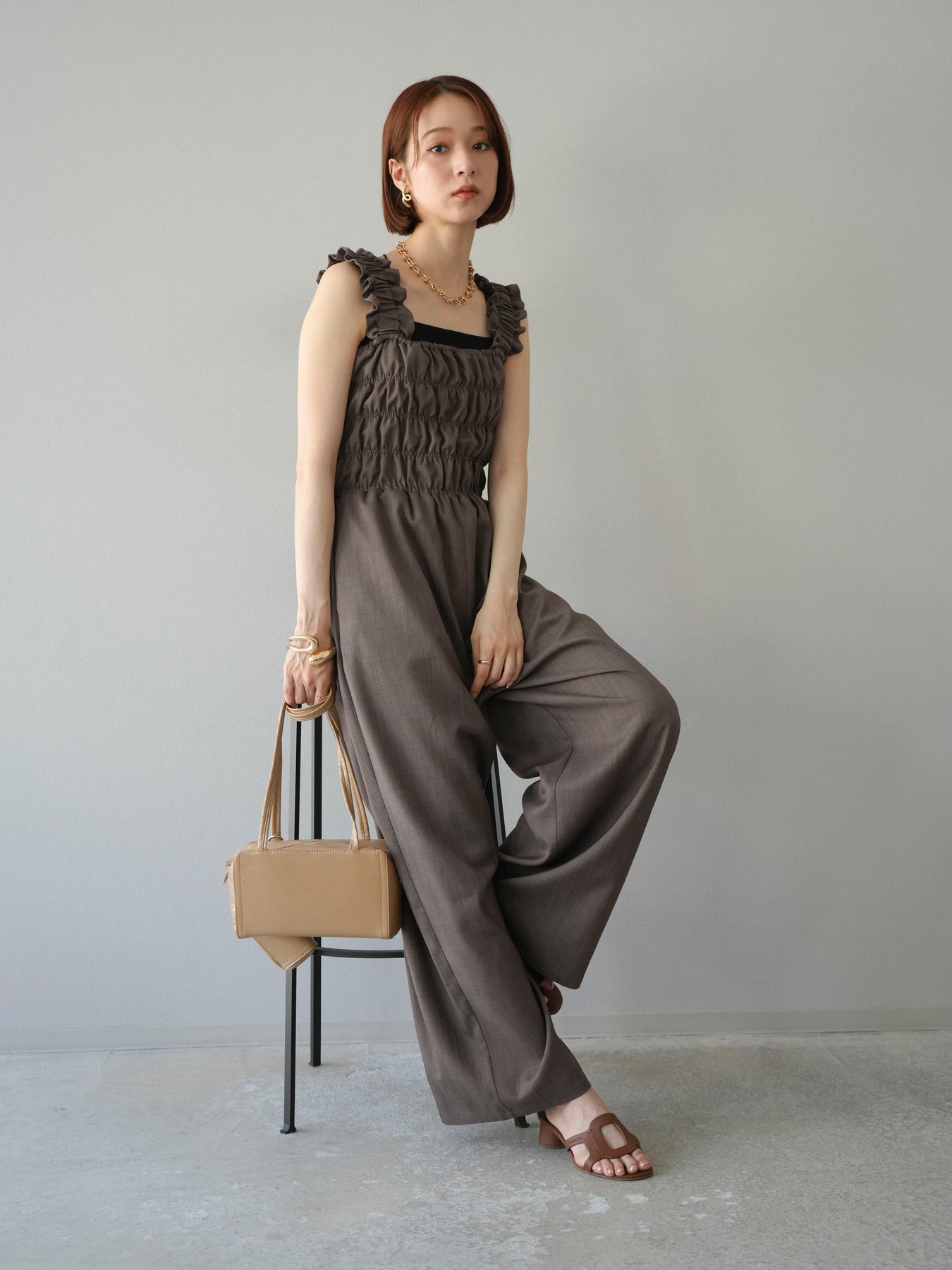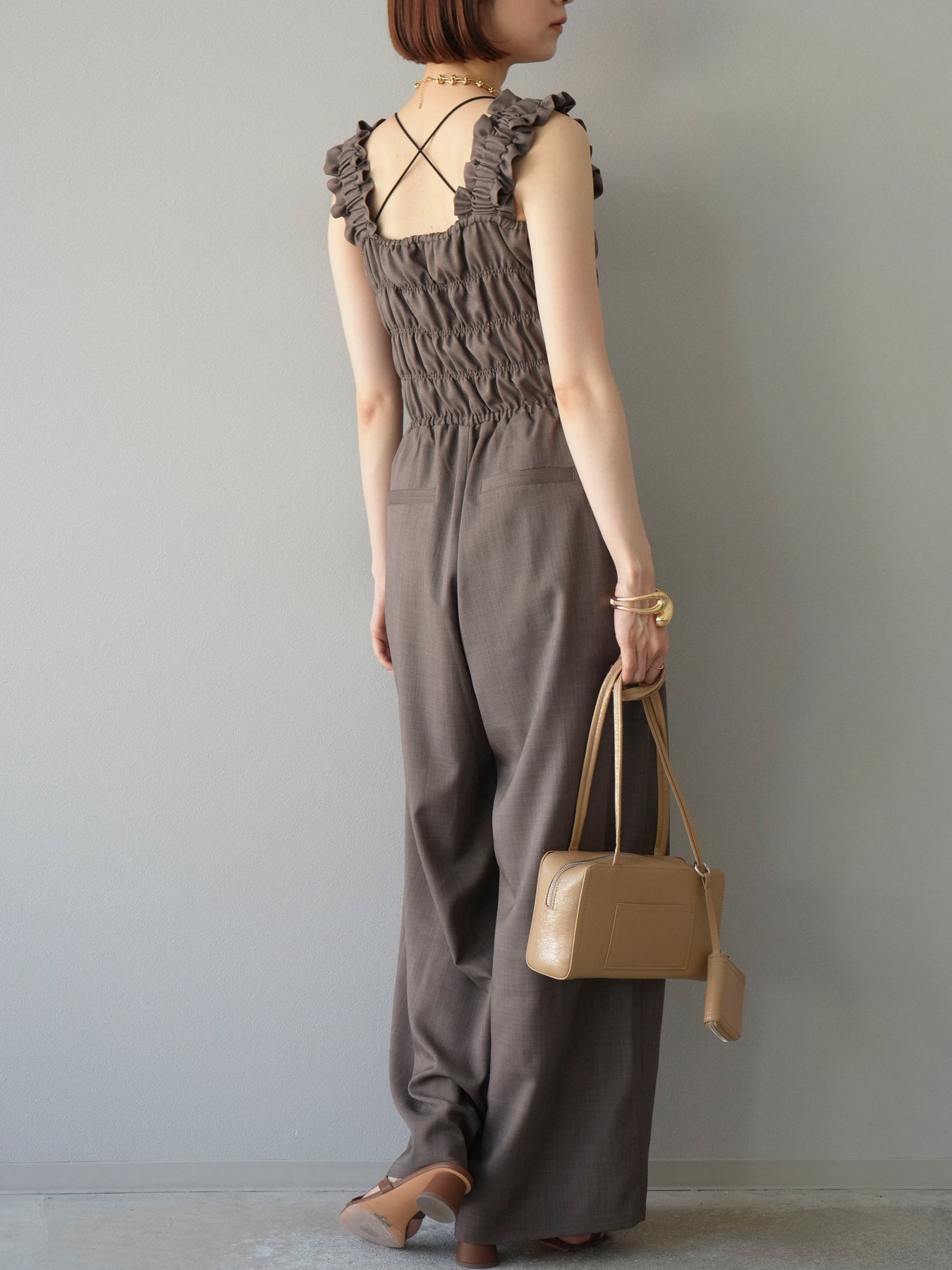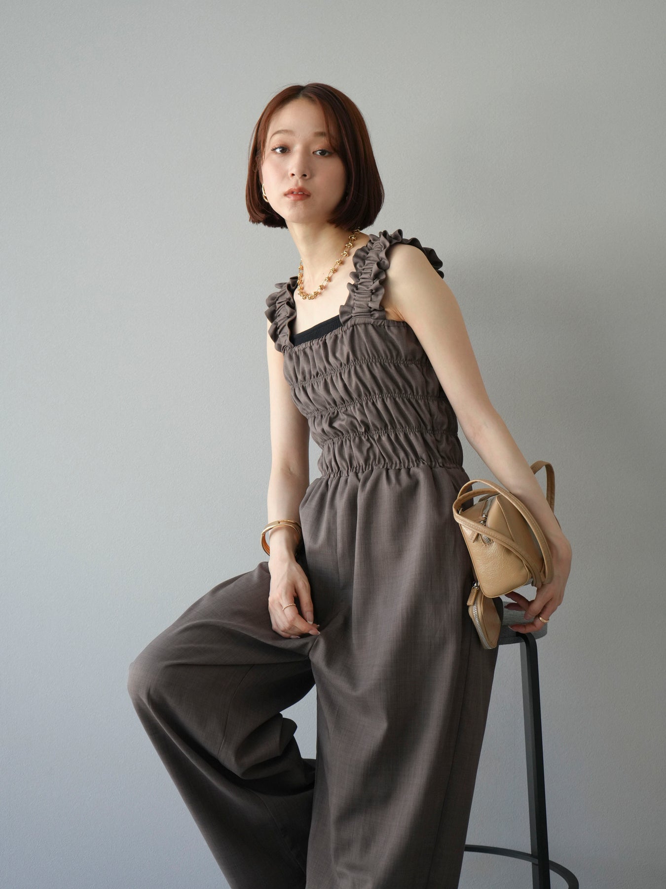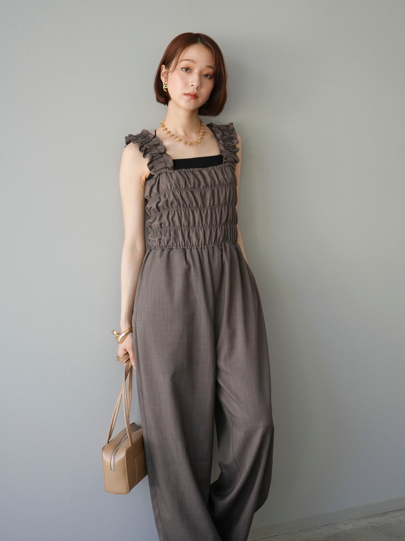ふんわりと寄せたシャーリングデザインと、肩のフリルが華やかさを添えるサロペット。 ヘザー調のエステル素材が軽やかで涼しげな印象を演出します。 ウエスト周りは伸縮性があり、リラクシーな着心地ながらもスタイルアップが叶うシルエット。 Tシャツやタンクトップと合わせるだけで、女性らしいスタイリングが完成します。 ※ボトムス、キャミソール(インナー)以外の商品は一律でインナーは付属していません。