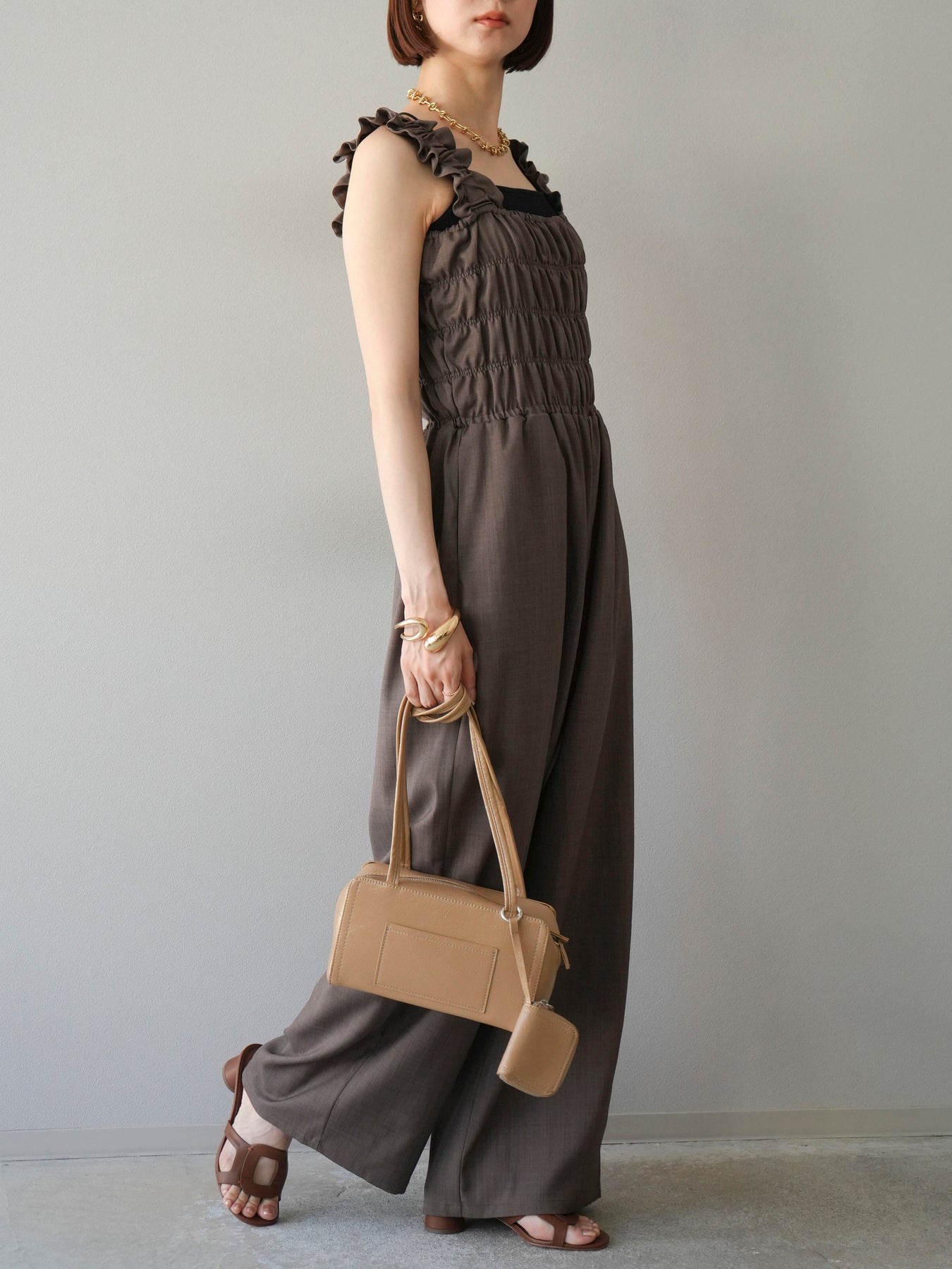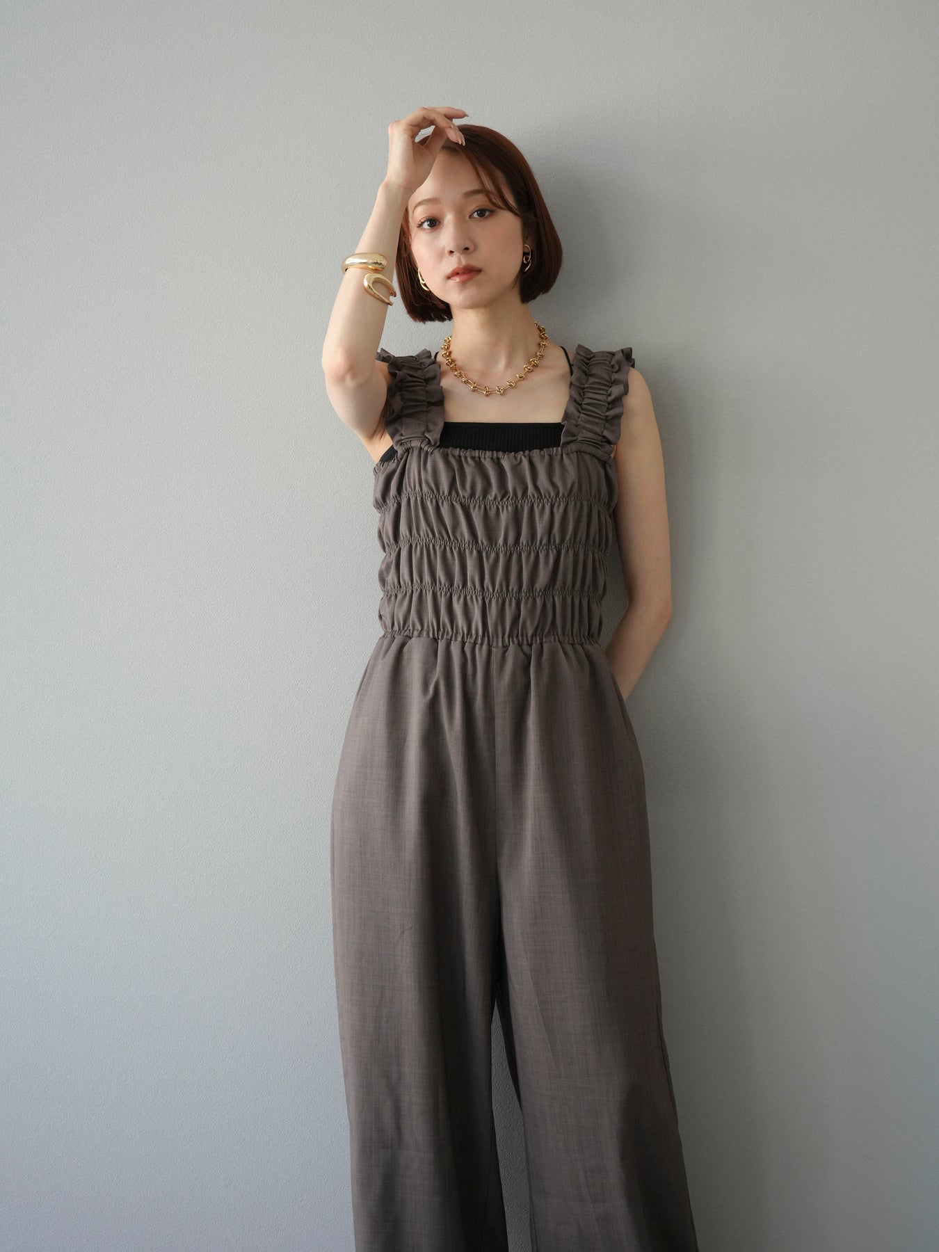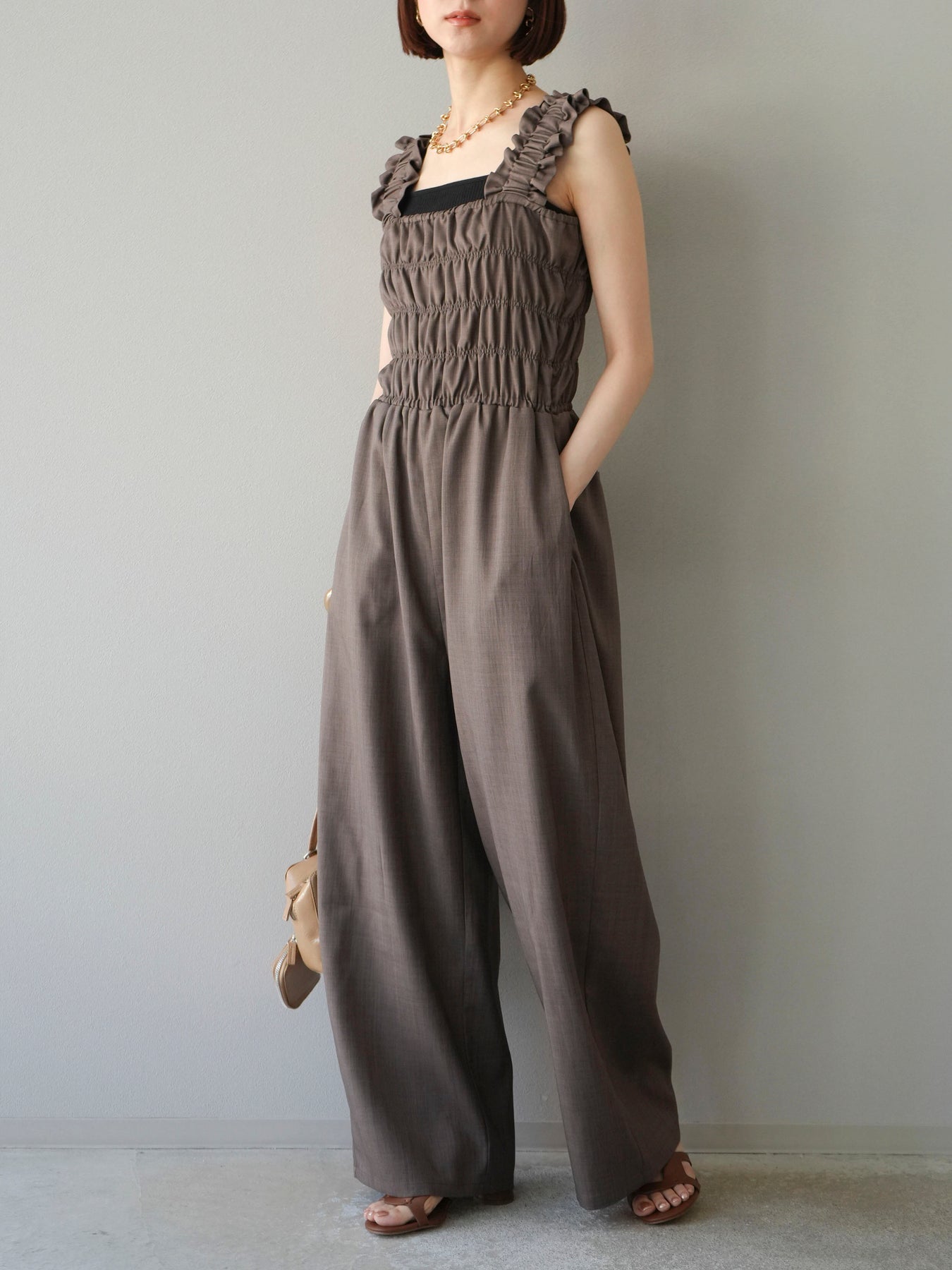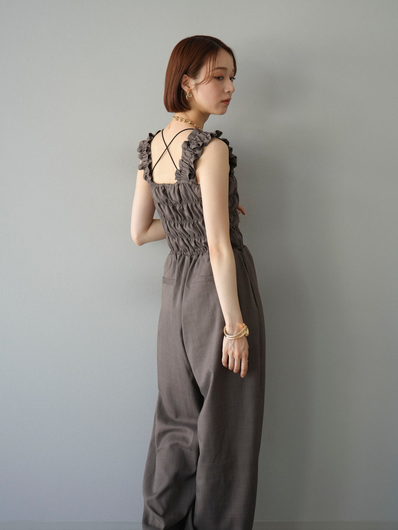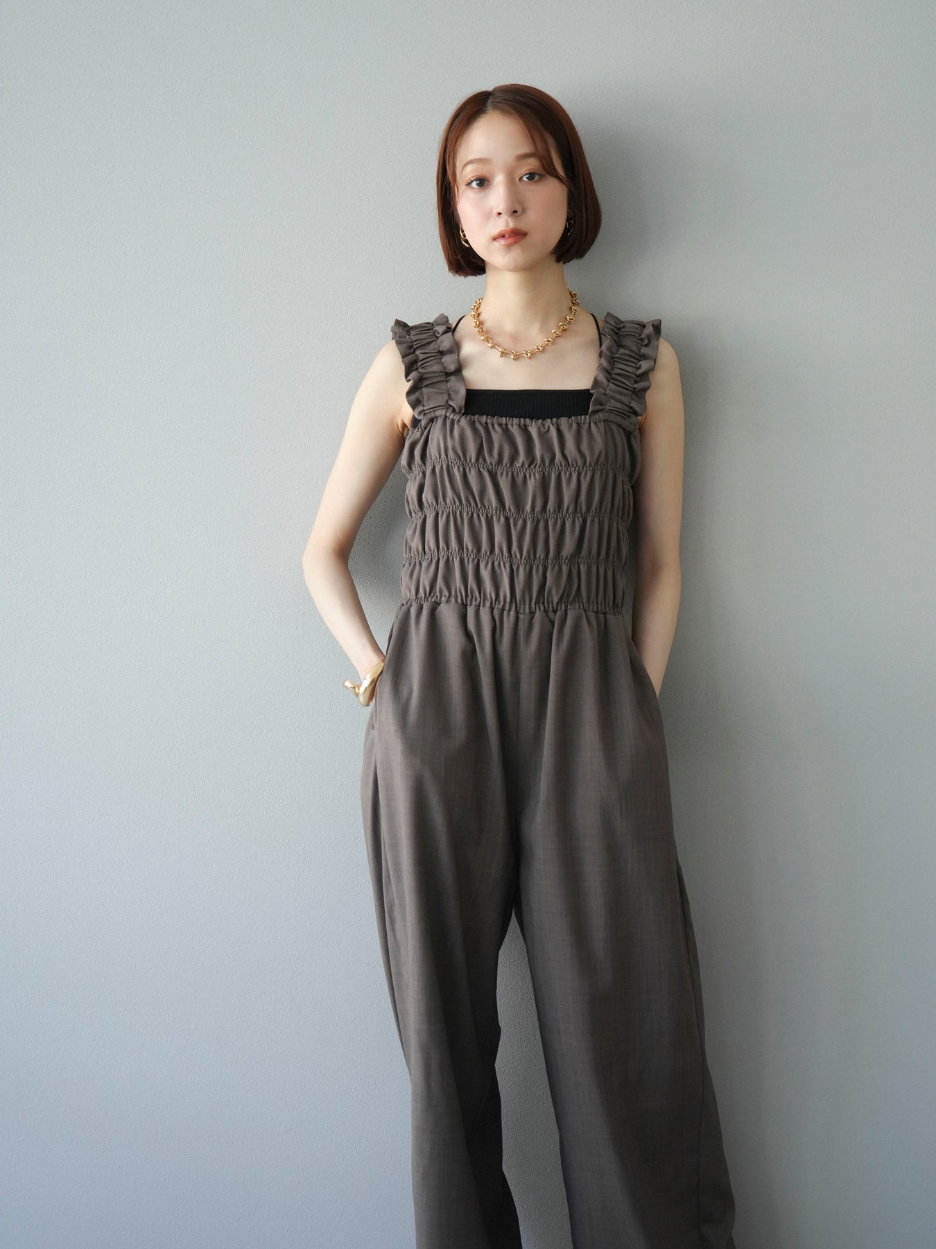 ふんわりと寄せたシャーリングデザインと、肩のフリルが華やかさを添えるサロペット。 ヘザー調のエステル素材が軽やかで涼しげな印象を演出します。 ウエスト周りは伸縮性があり、リラクシーな着心地ながらもスタイルアップが叶うシルエット。 Tシャツやタンクトップと合わせるだけで、女性らしいスタイリングが完成します。 ※ボトムス、キャミソール(インナー)以外の商品は一律でインナーは付属していません。
