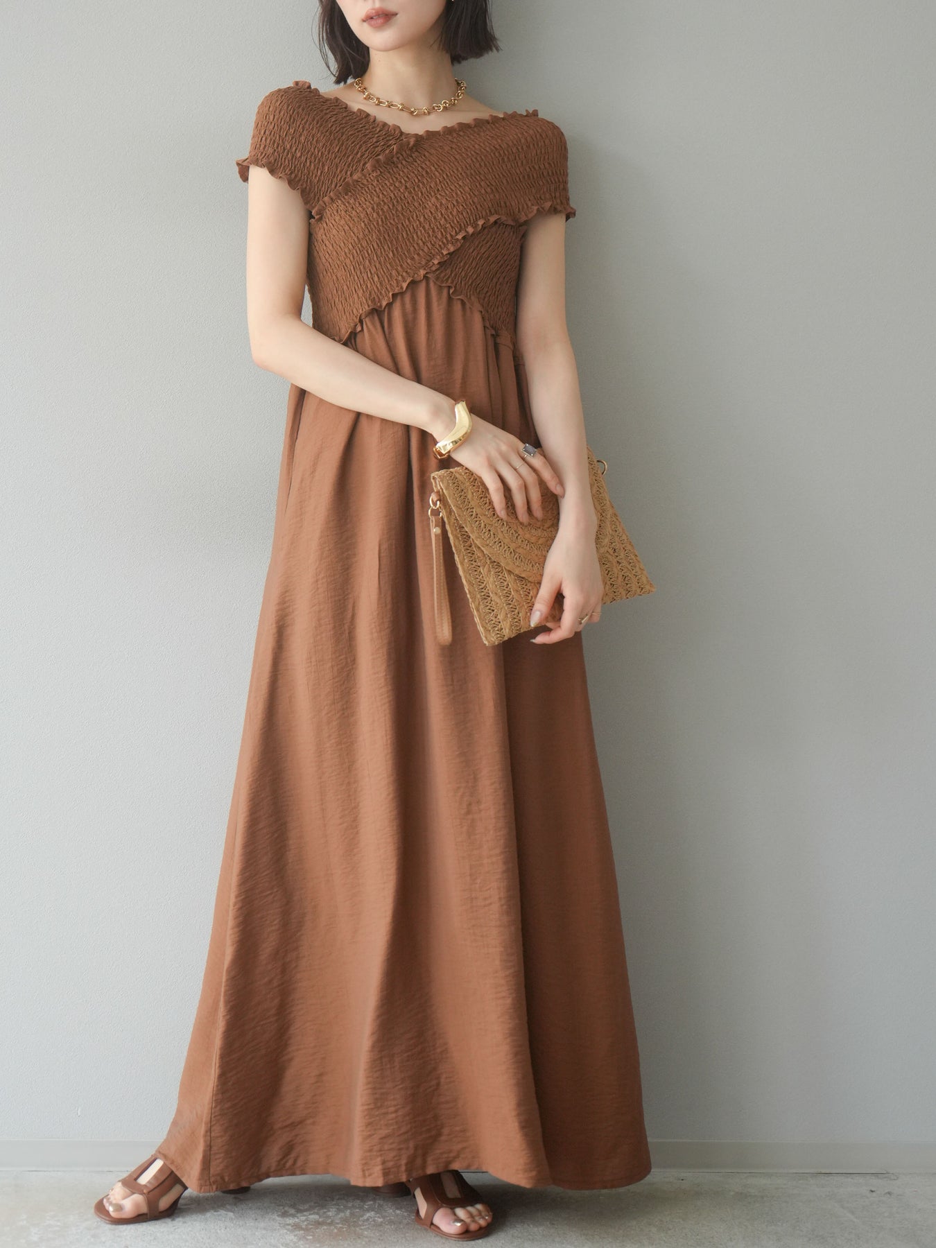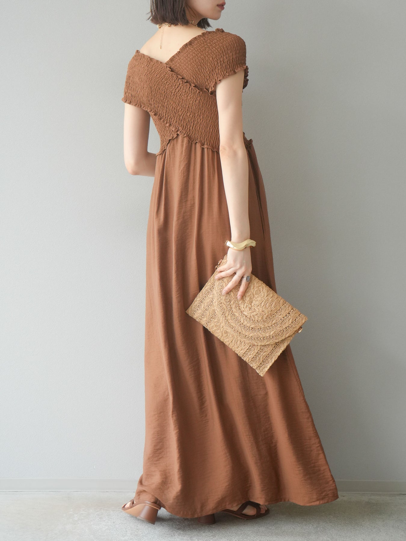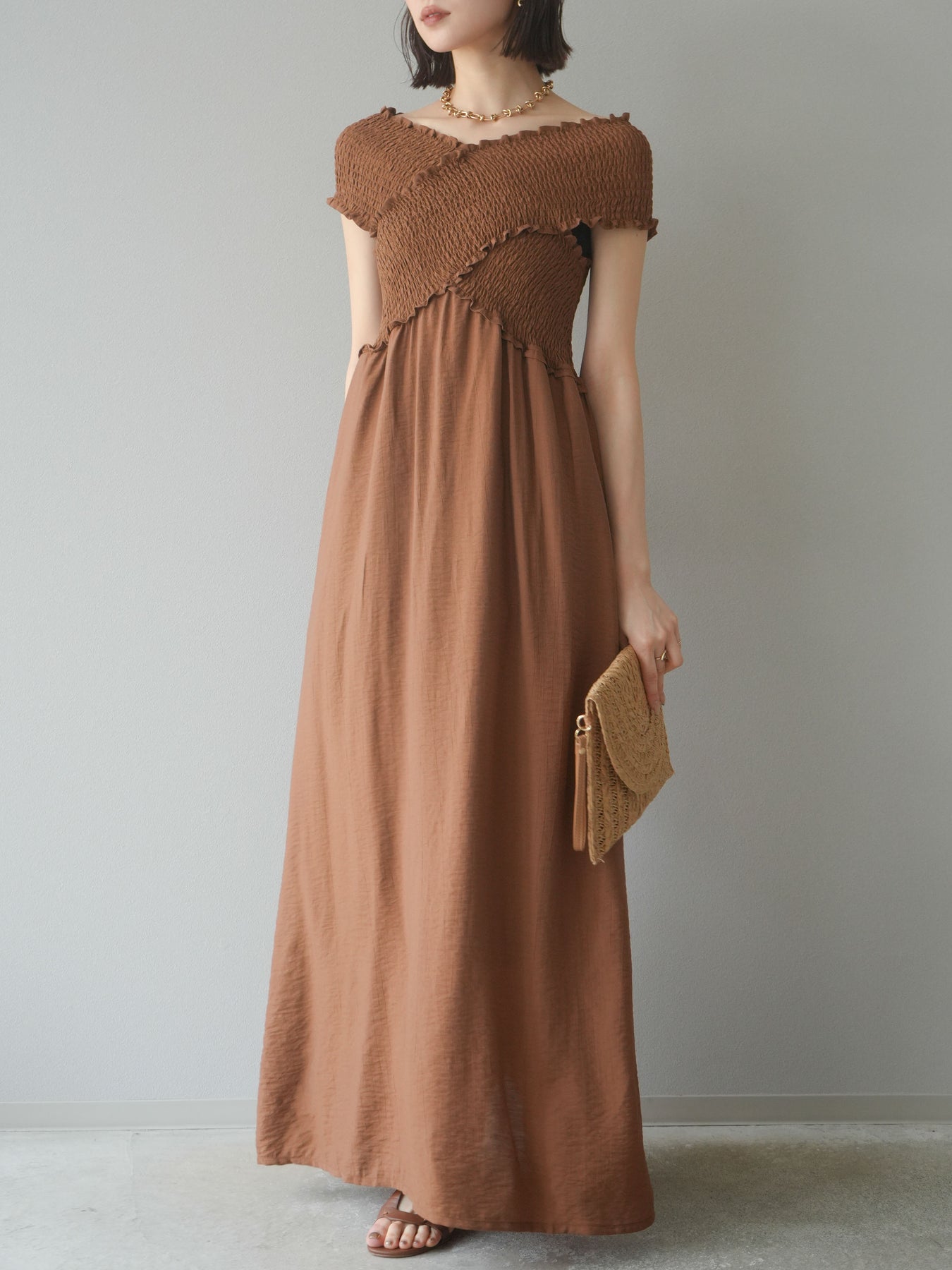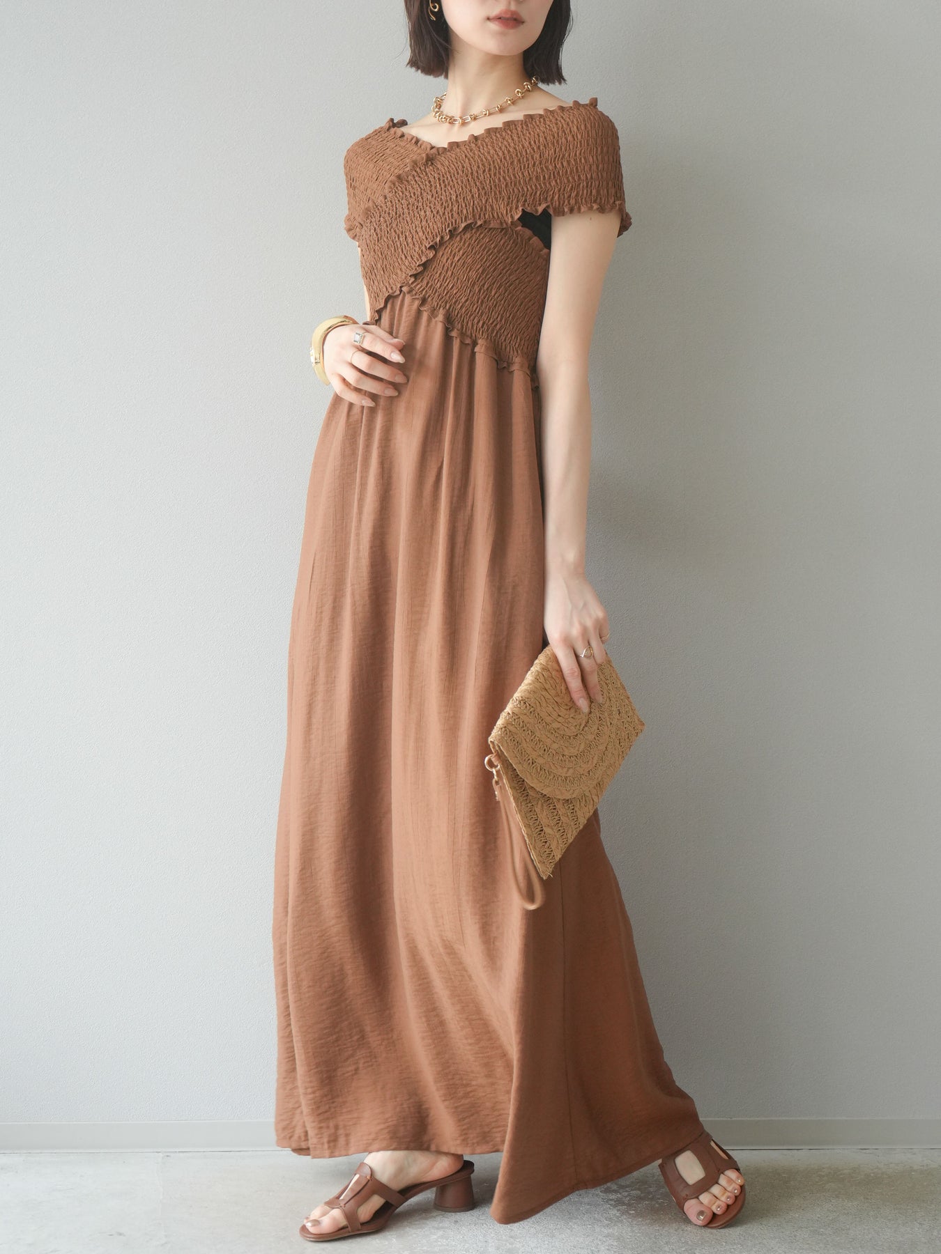 胸元にたっぷりと施されたシャーリングと、クロスデザインが印象的なシャーリングクロスワンピース。伸縮性のあるシャーリングが身体に優しくフィットし、立体感のある女性らしいシルエットを演出します。スカート部分は落ち感のある素材で、歩くたびに美しく揺れるフレアラインが魅力。バックスタイルまで華やかなデザインで、1枚でスタイリングが完成します。カジュアルにもリゾートにも映える、存在感たっぷりの主役ワンピースです。 ※ボトムス、キャミソール(インナー)以外の商品は一律でインナーは付属していません。