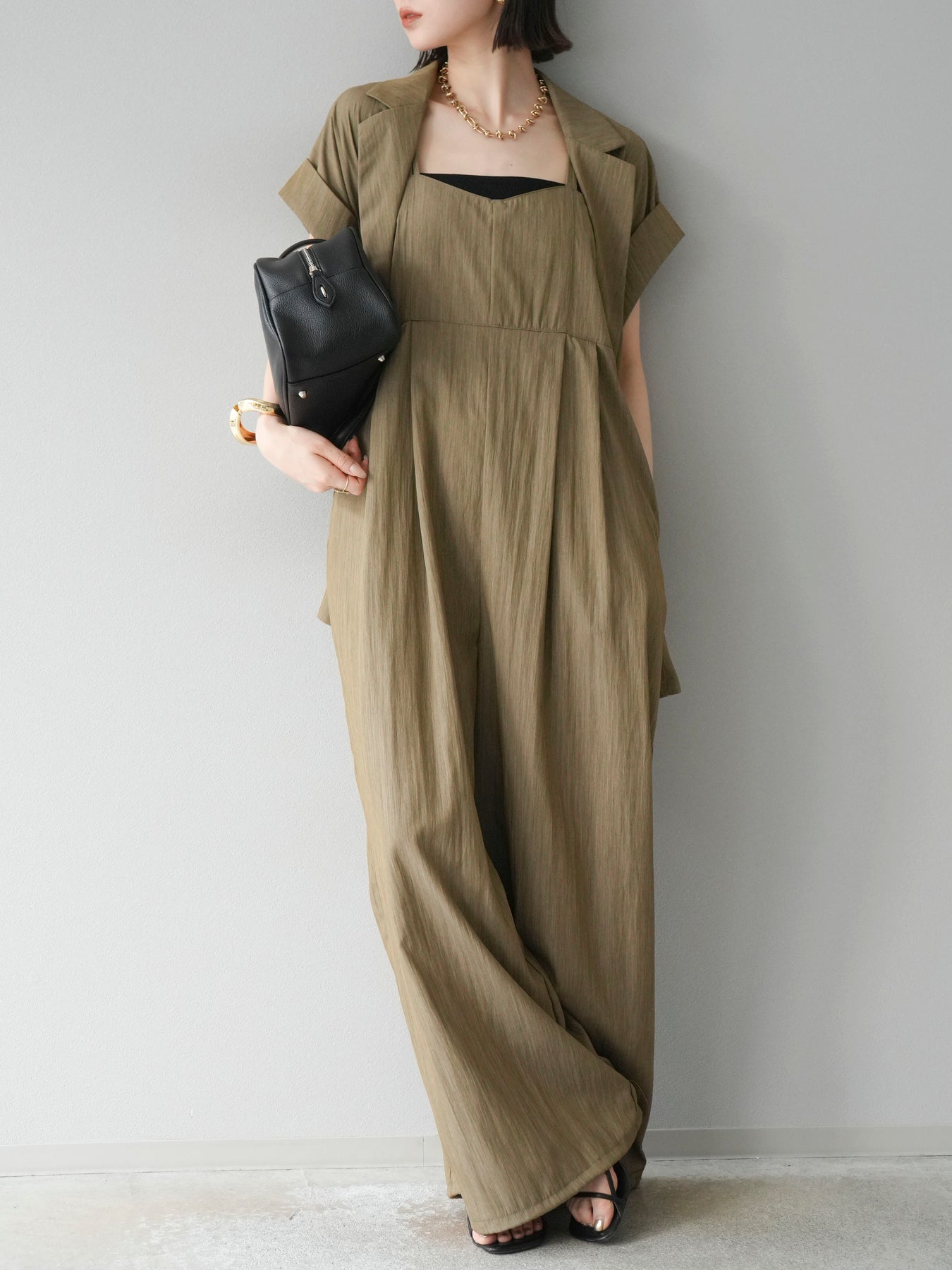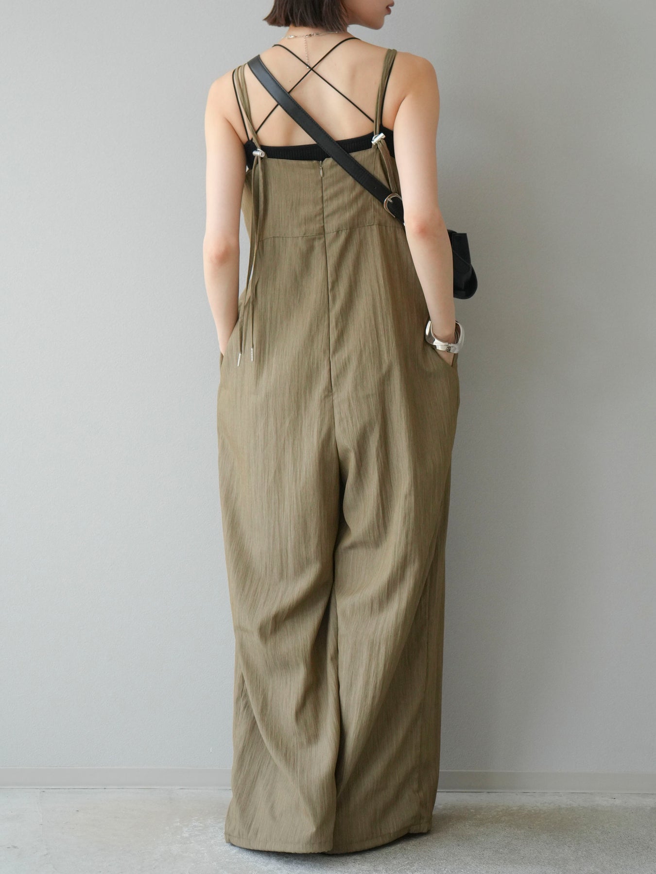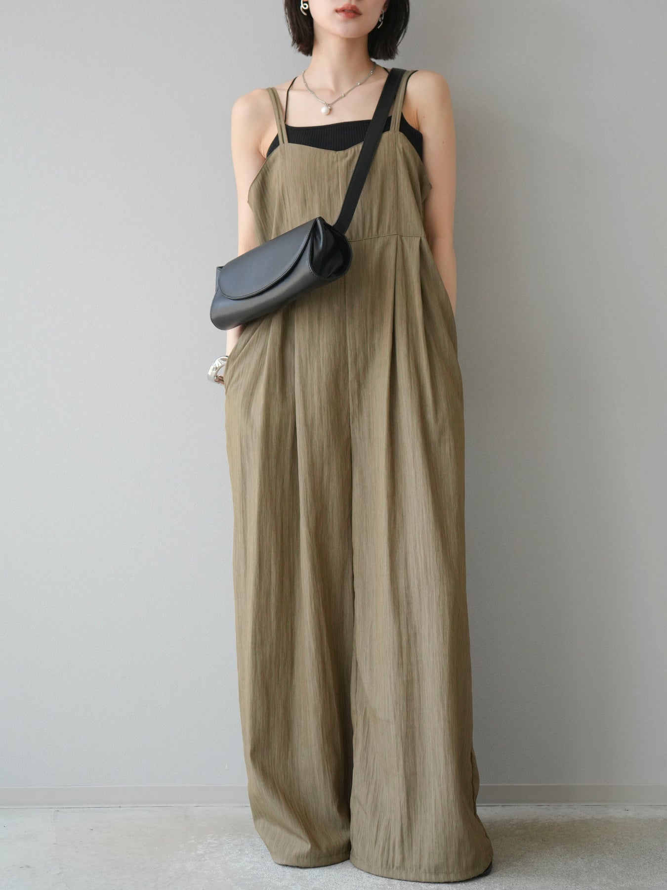 ビスチェ風の胸元デザインがポイントの、リネンライクビスチェデザインサロペット。ストンと落ちるワイドストレートシルエットと、リネン見えするさらりとした素材感が夏らしい抜け感を演出します。肩ひもは華奢なダブルストラップ仕様で、女性らしくヘルシーな肌見せが叶うデザイン。ハイウエスト位置の切替がスタイルアップ効果を高め、シンプルなインナーと合わせるだけでこなれた印象に。Tシャツやタンクトップ、シアーインナーとのレイヤードもおすすめの、大人のカジュアルスタイルに映える1枚です。 ※ボトムス、キャミソール(インナー)以外の商品は一律でインナーは付属していません。