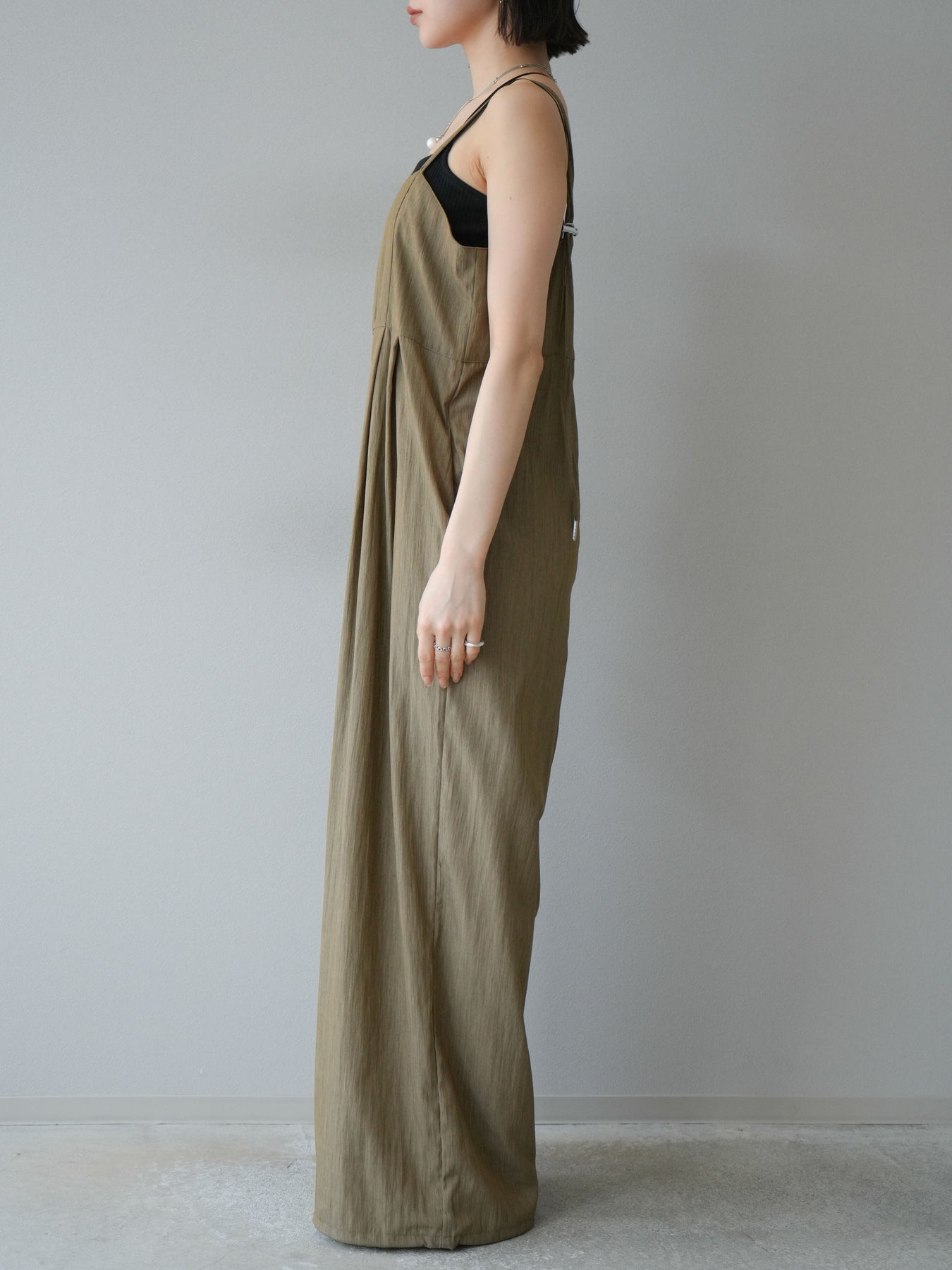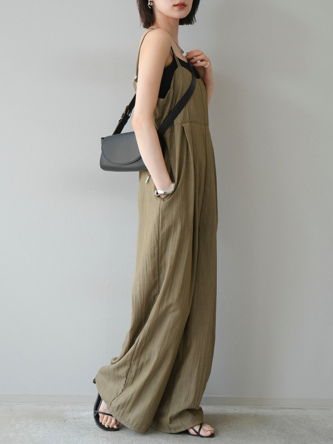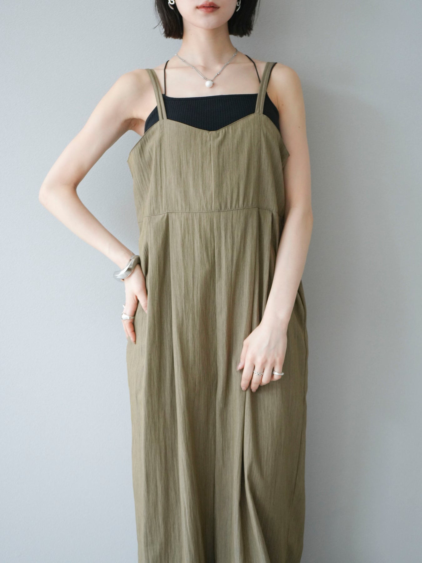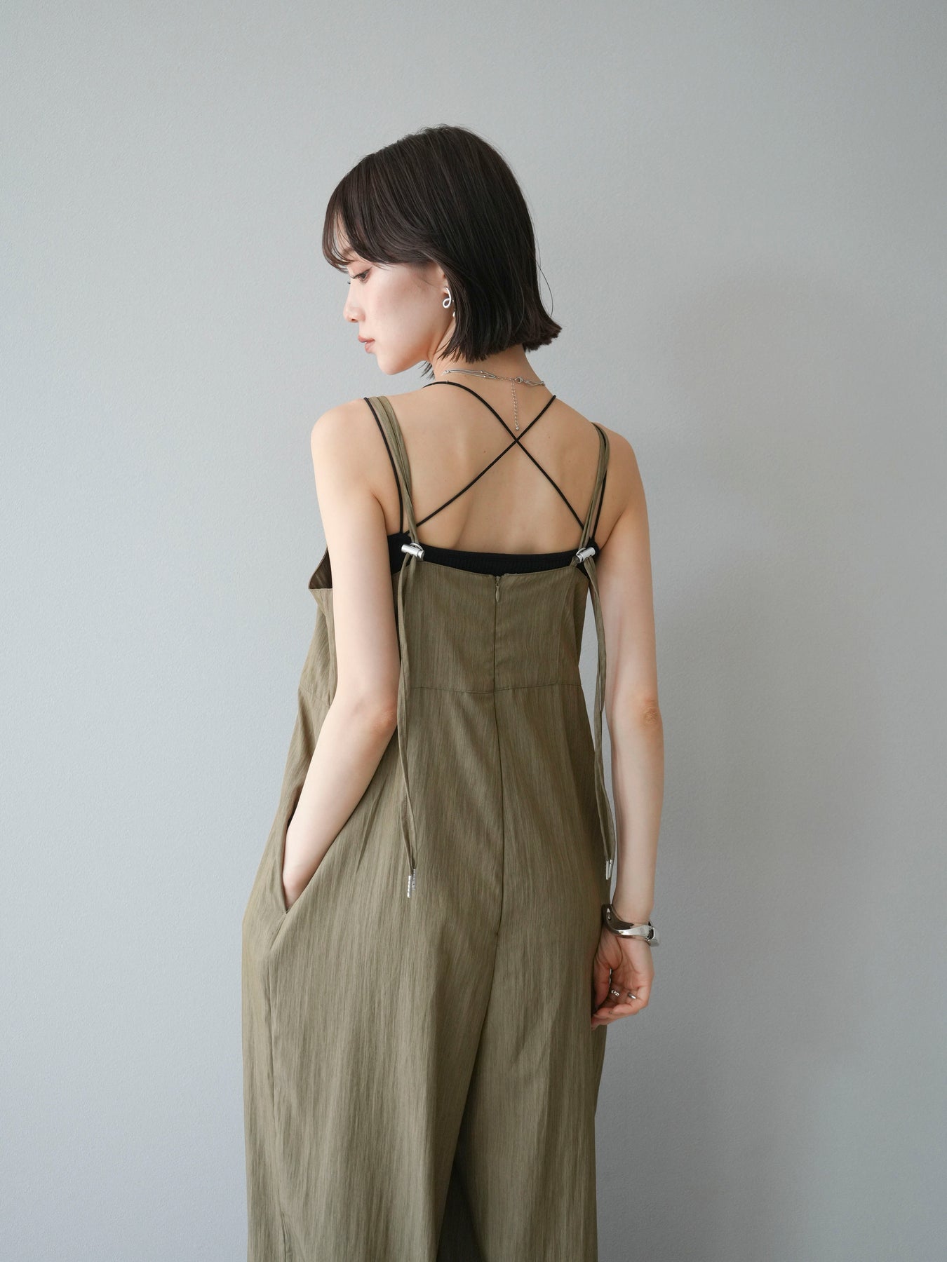 バスト90cm 着丈124cm(肩紐部分除く) 股下66cm 渡幅38cm 肩紐全長70cm(結んで調節可) 裾幅調節可能 裏地なし エクリュ・グレージュのみ透け感ややあり 伸縮性なし サイドポケットあり バックジップあり
