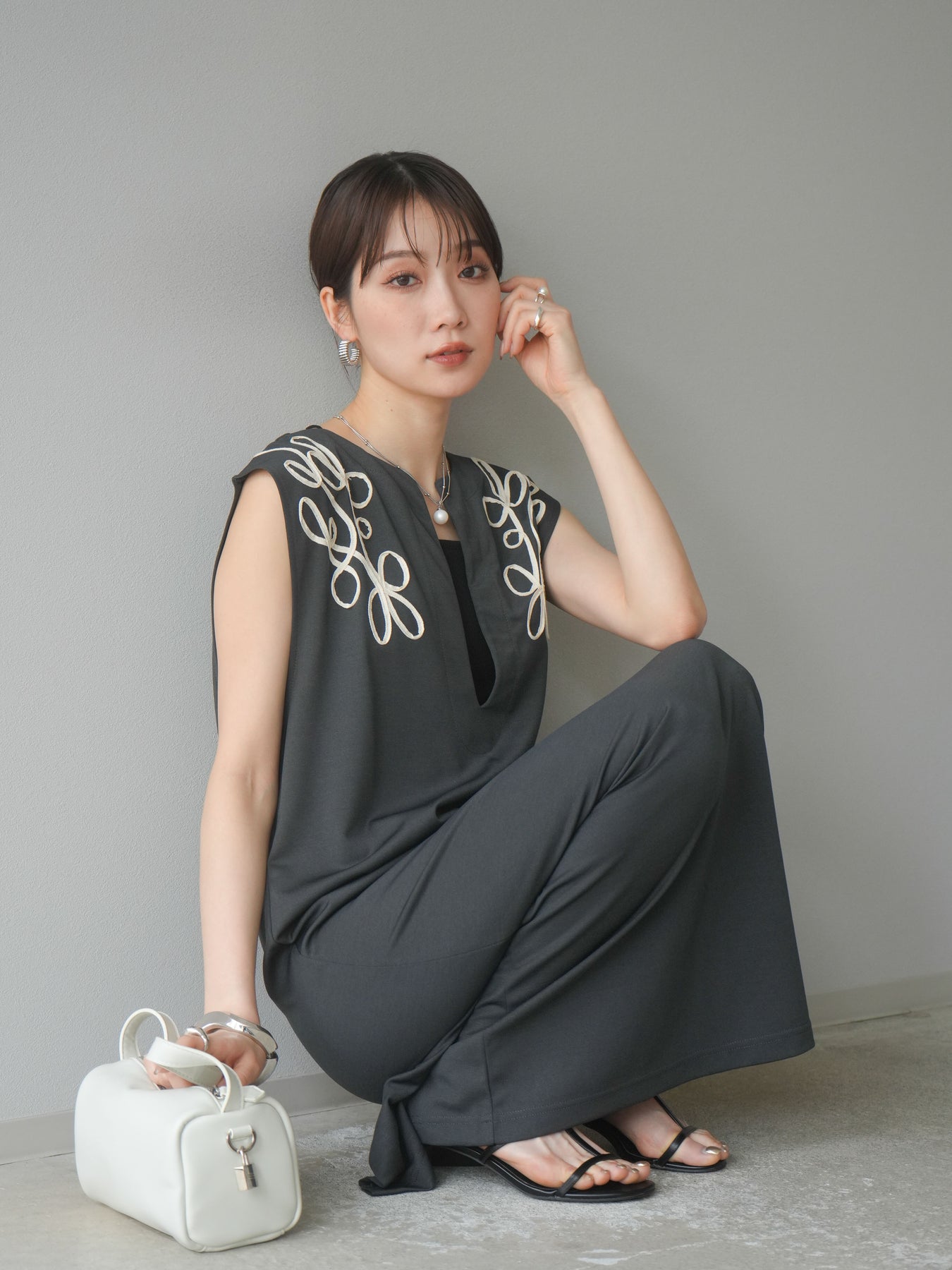 軽やかで落ち感のあるライトポンチ素材を使用した、コード刺繍が目を惹くワンピース。肩に施された立体感のあるコード刺繍が上品なアクセントになり、1枚で華やかな印象を与えてくれます。すっきりとしたVネックラインとストレートシルエットで、体のラインを拾いすぎずリラクシーな着心地。カジュアルにもきれいめにも着まわせる万能な1着で、小物次第でデイリーからちょっとしたお出かけまで対応可能です。 ※ボトムス、キャミソール(インナー)以外の商品は一律でインナーは付属していません。