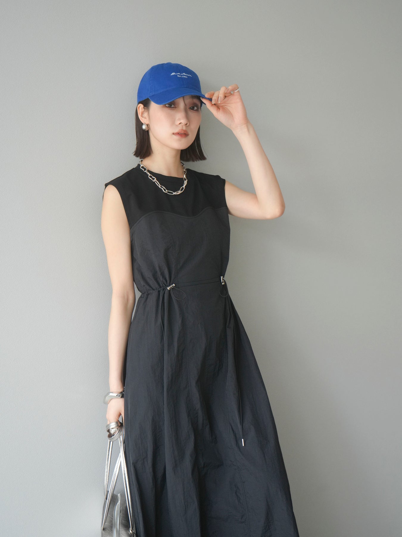 異素材の組み合わせが印象的な、カットドッキングナイロンワンピース。上身頃は肌あたりの良いカットソー素材、スカート部分はハリ感のあるナイロン素材で切り替えられており、スポーティーとフェミニンが融合したバランスの取れたデザインに仕上がっています。ウエストのドロストコードでシルエットの調整が可能で、スタイルアップ効果も◎。1枚でスタイリングが決まる、デイリーにもレジャーにも活躍する万能ワンピースです。 ※ボトムス、キャミソール(インナー)以外の商品は一律でインナーは付属していません。