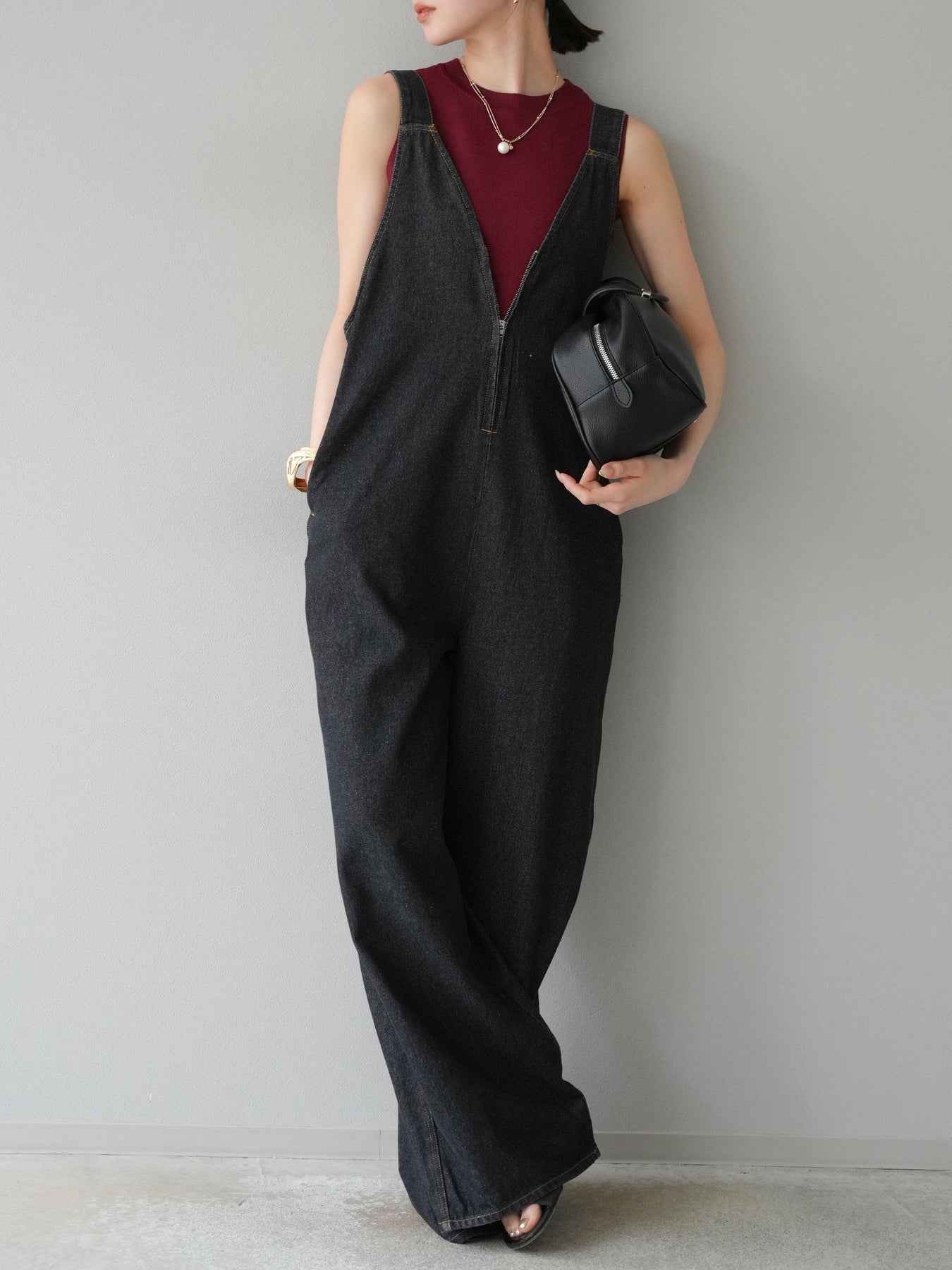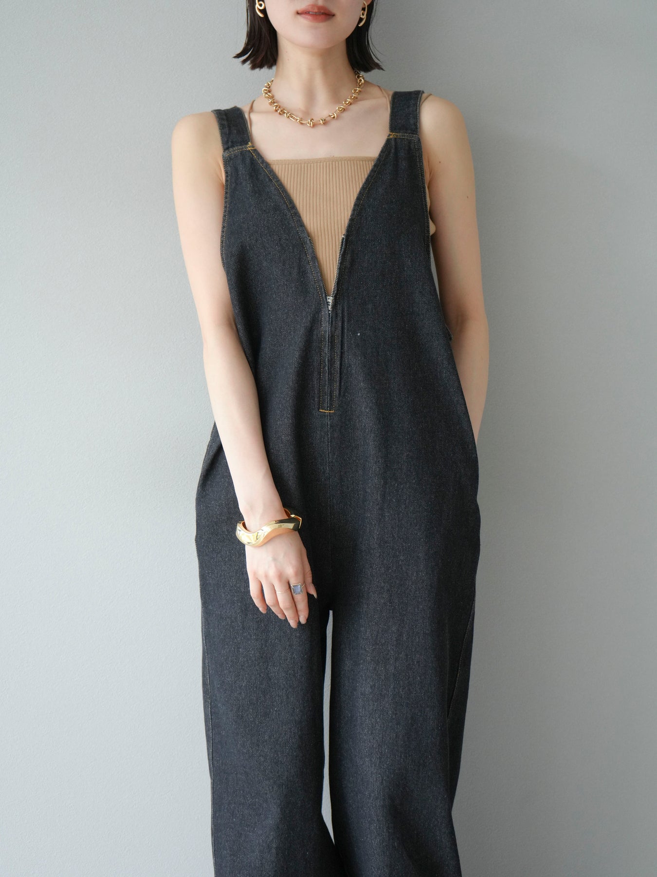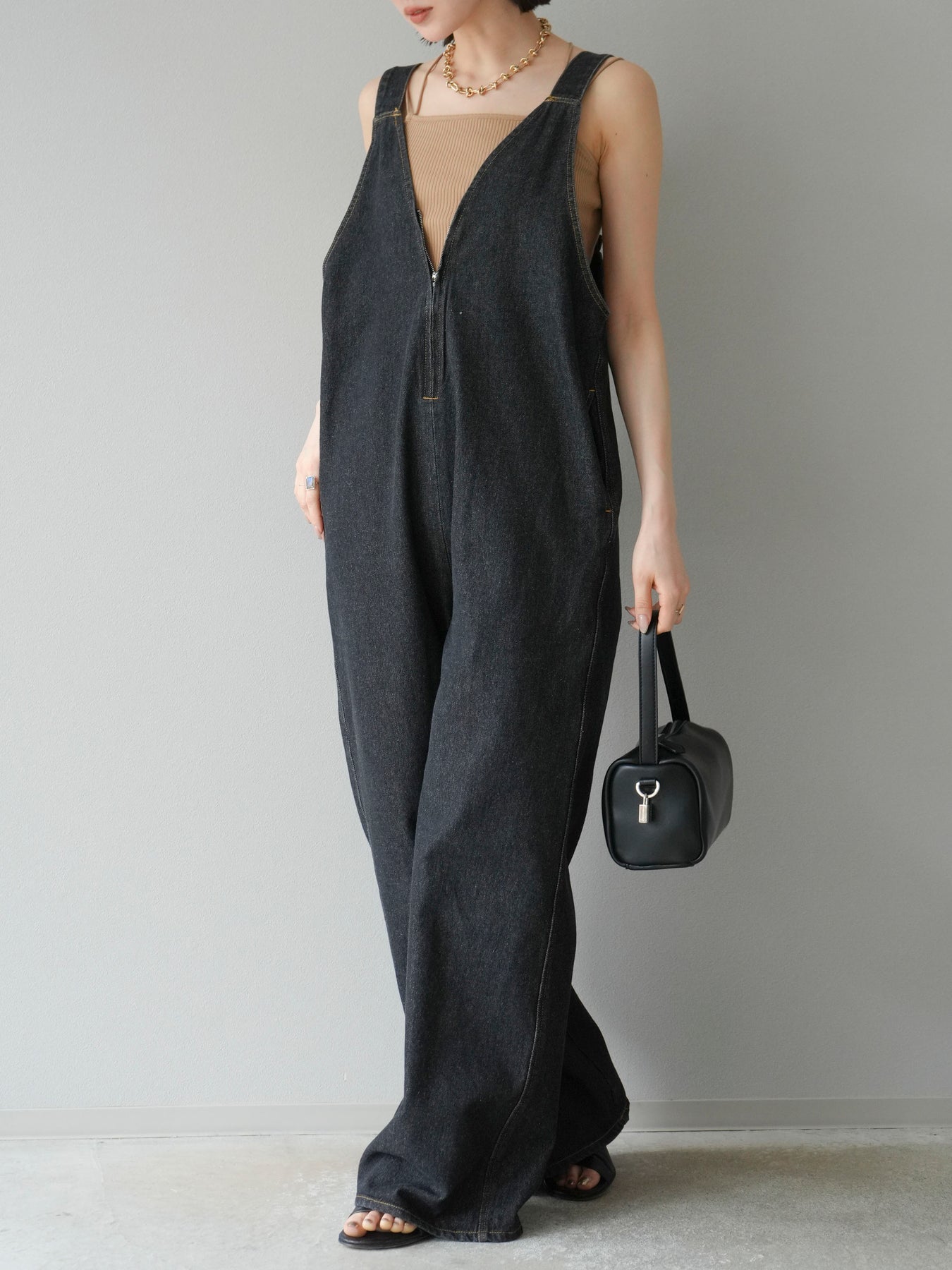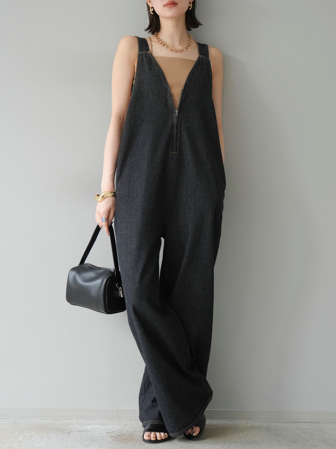 [予約]フロントZIP Vネックデニムサロペット/ブラック