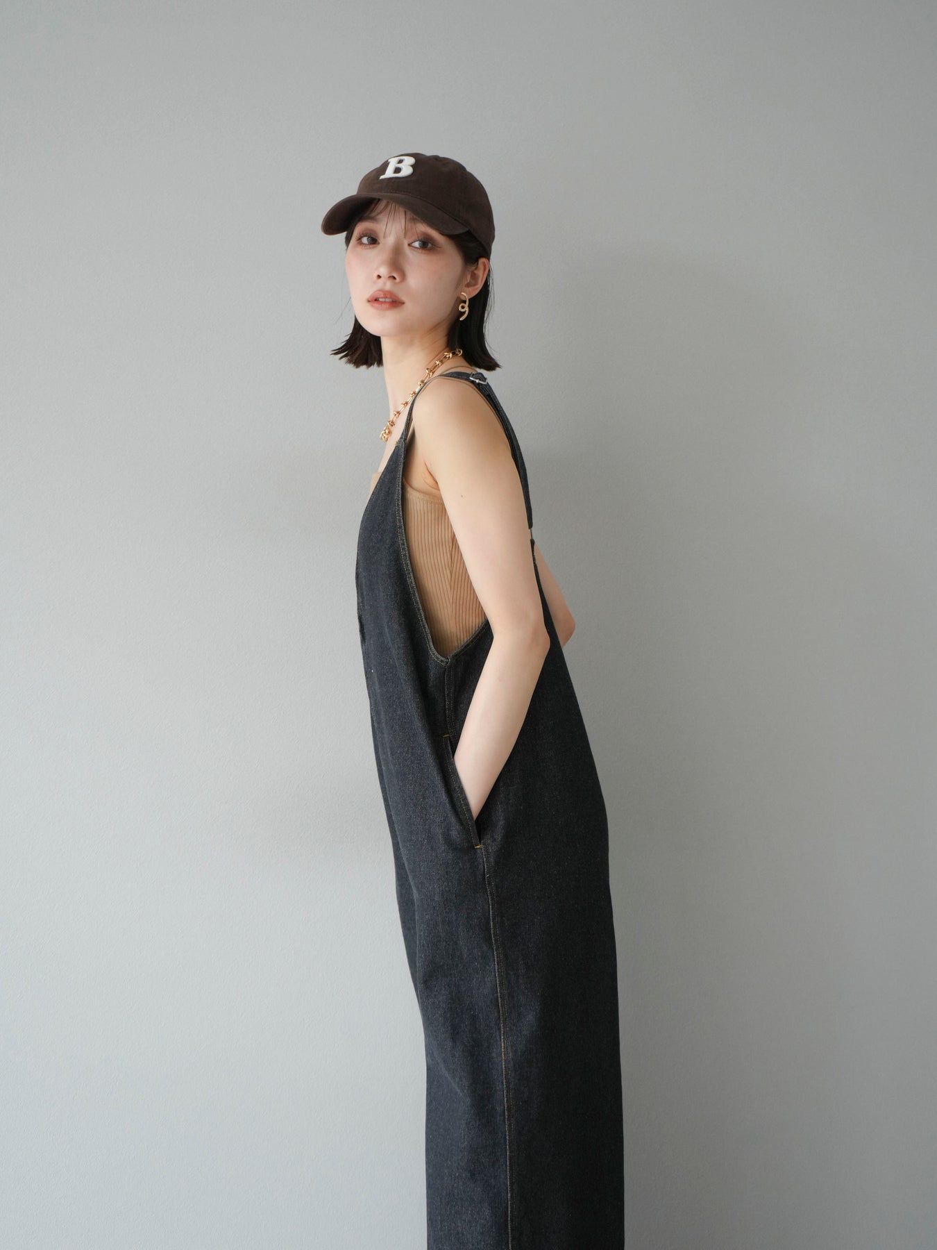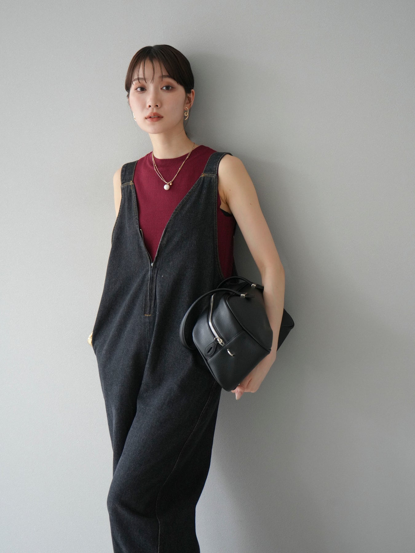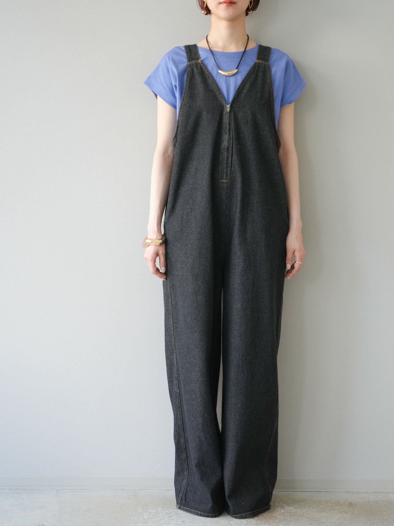 [予約]フロントZIP Vネックデニムサロペット/ブラック