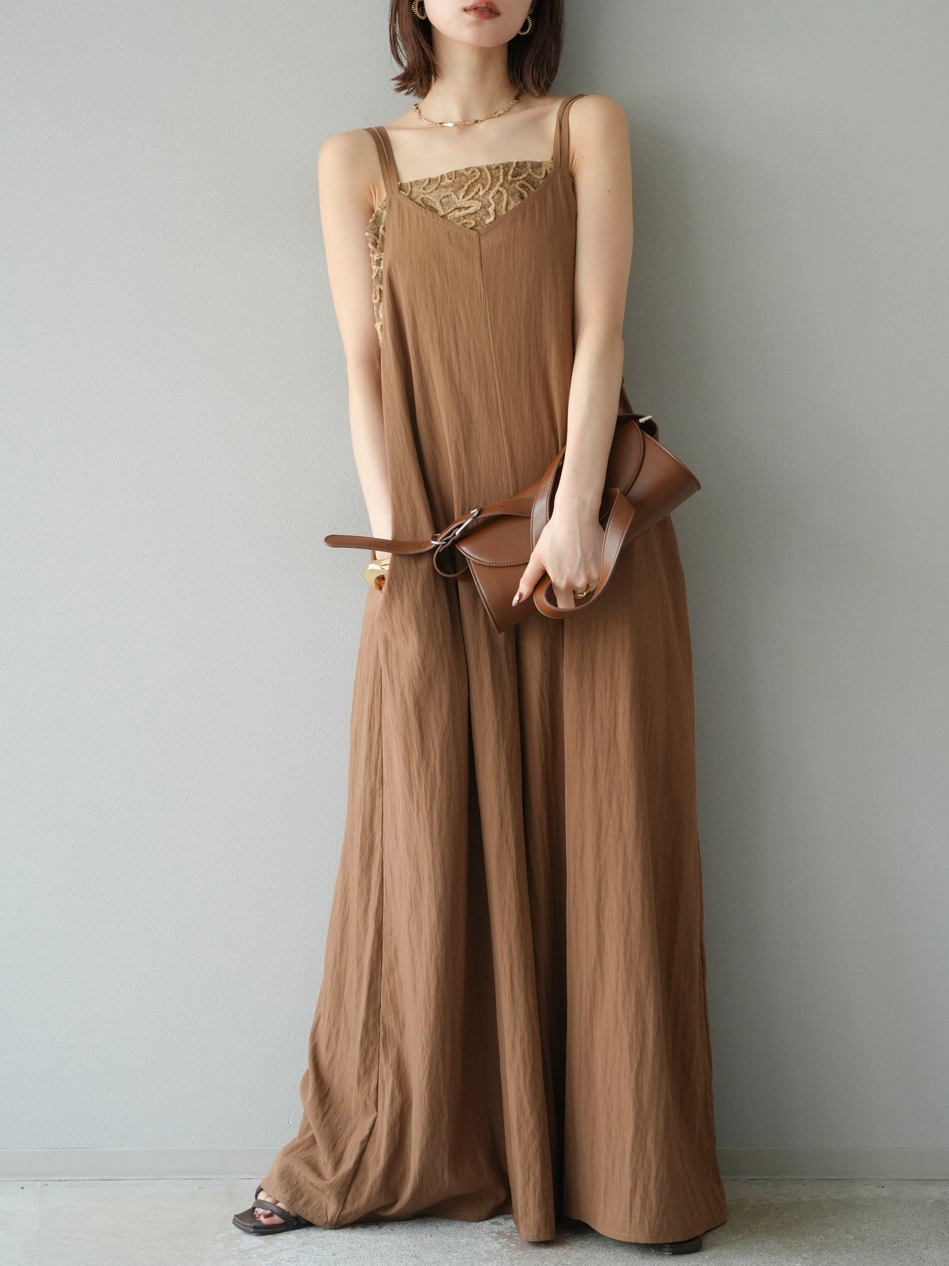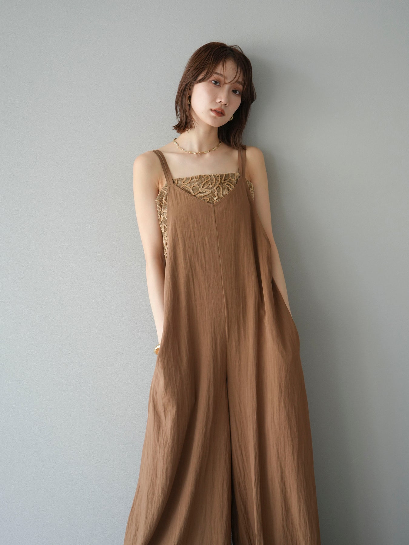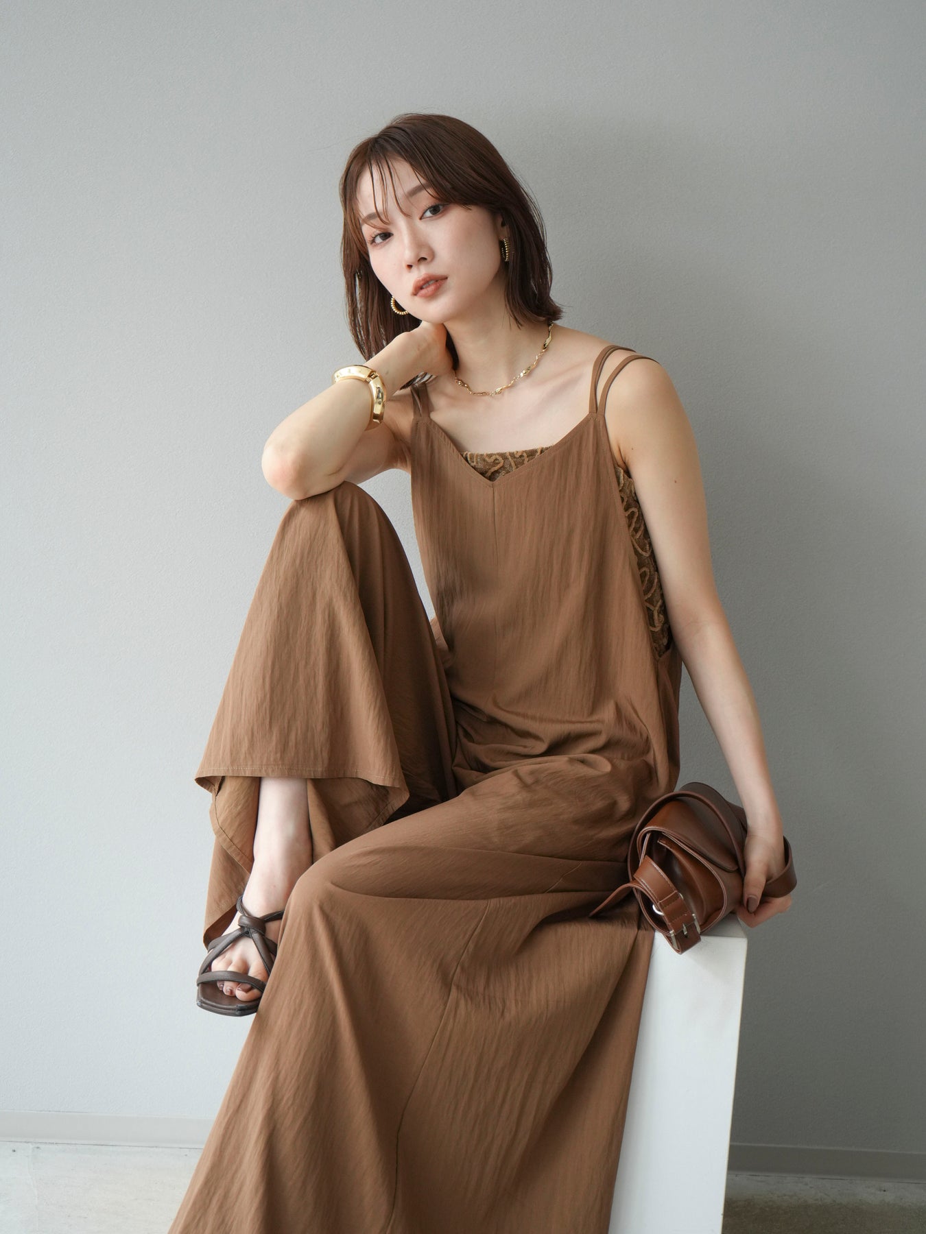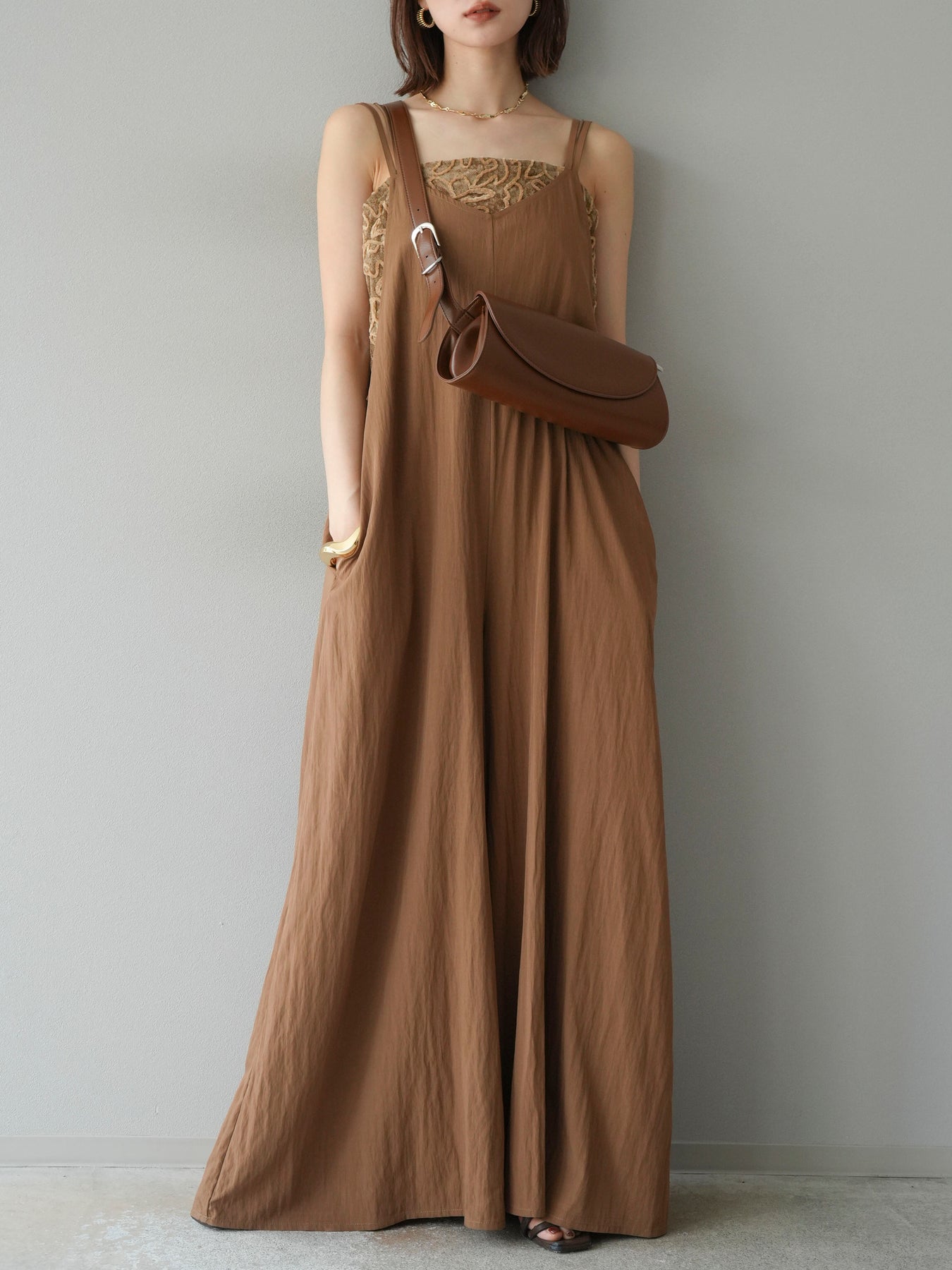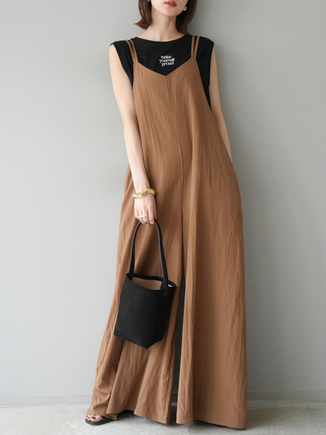 落ち感のあるレーヨン混素材が、リラクシーかつ上品な印象を与えるVネックサロペット。 深めのVネックと肩紐デザインが顔まわりをすっきり見せ、レイヤードスタイルにもぴったり。ゆとりあるワイドシルエットが体型を自然にカバーしつつ、こなれ感を演出してくれます。 柔らかな素材で肌あたりも優しく、長時間の着用でも快適。インナー次第でカジュアルからキレイめまで幅広く活躍する、着回し力の高い1着です。 ポケット付きで実用性も◎。シーズンレスに楽しめる、大人のデイリーサロペットです。