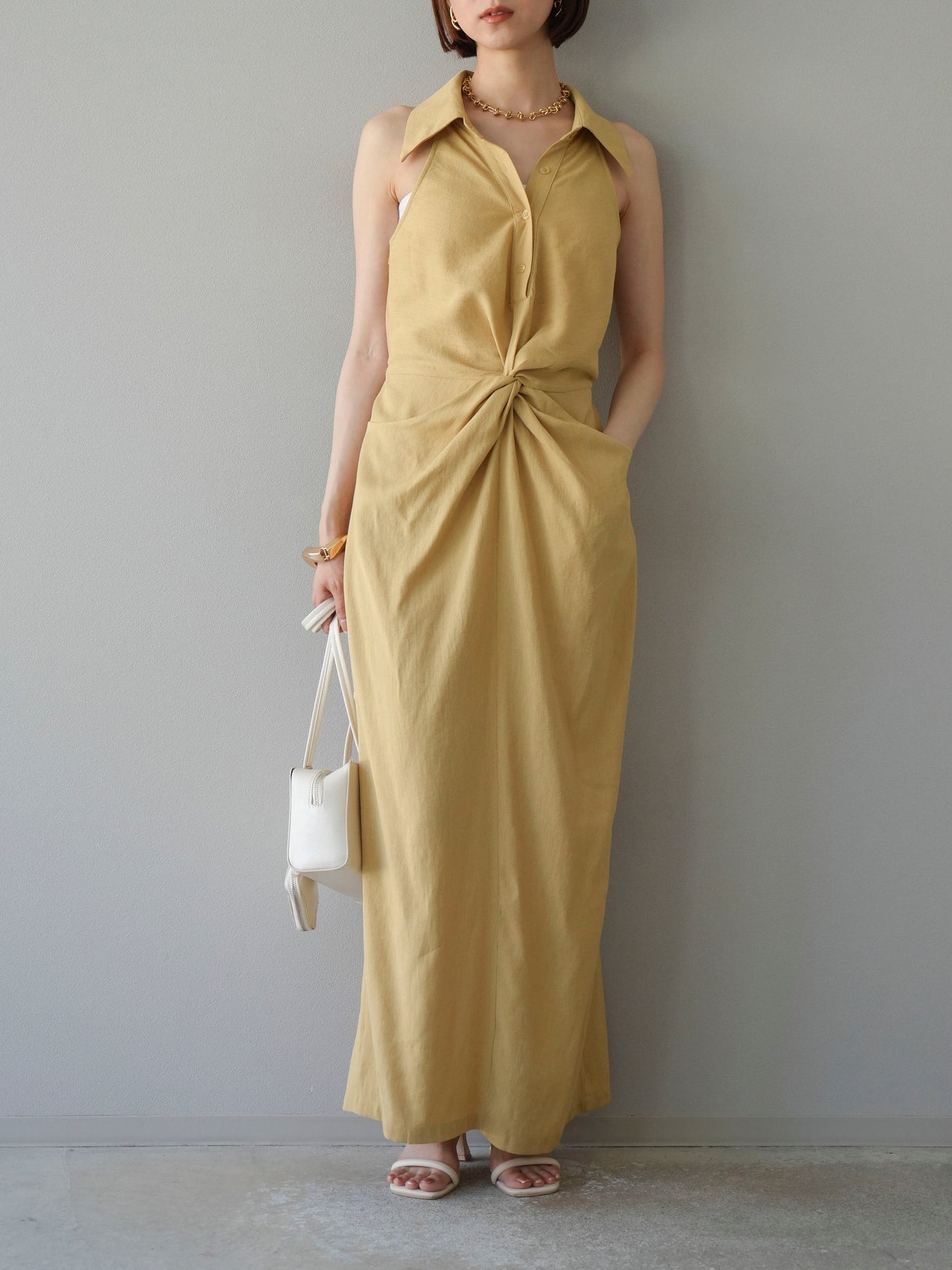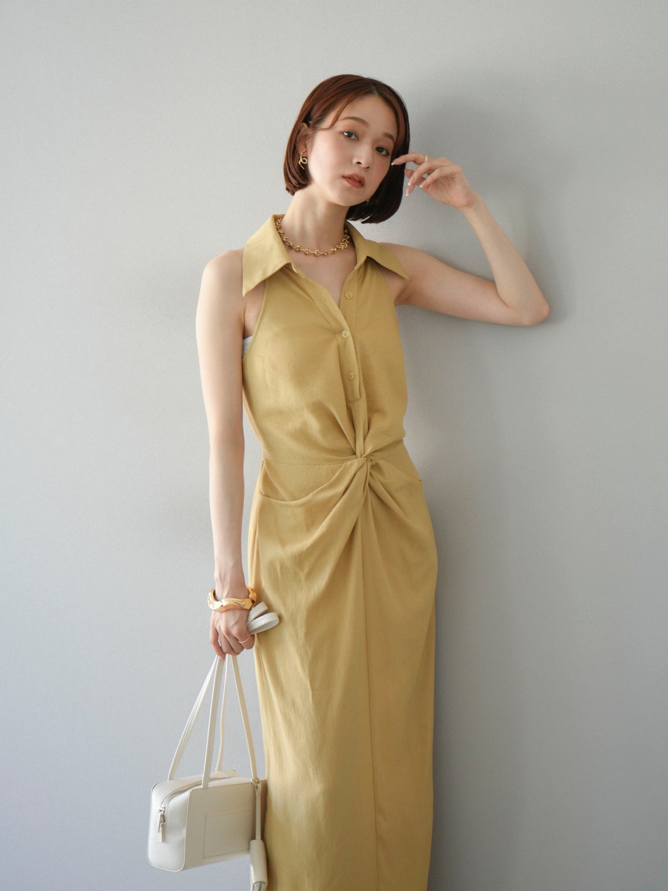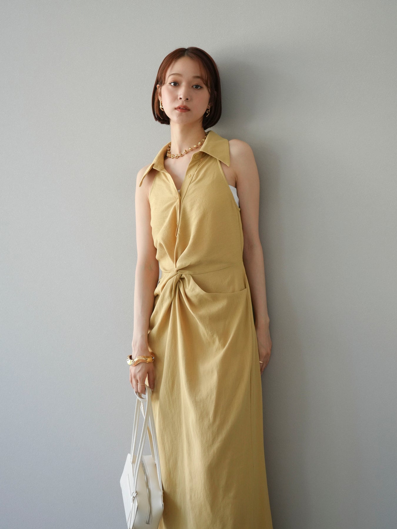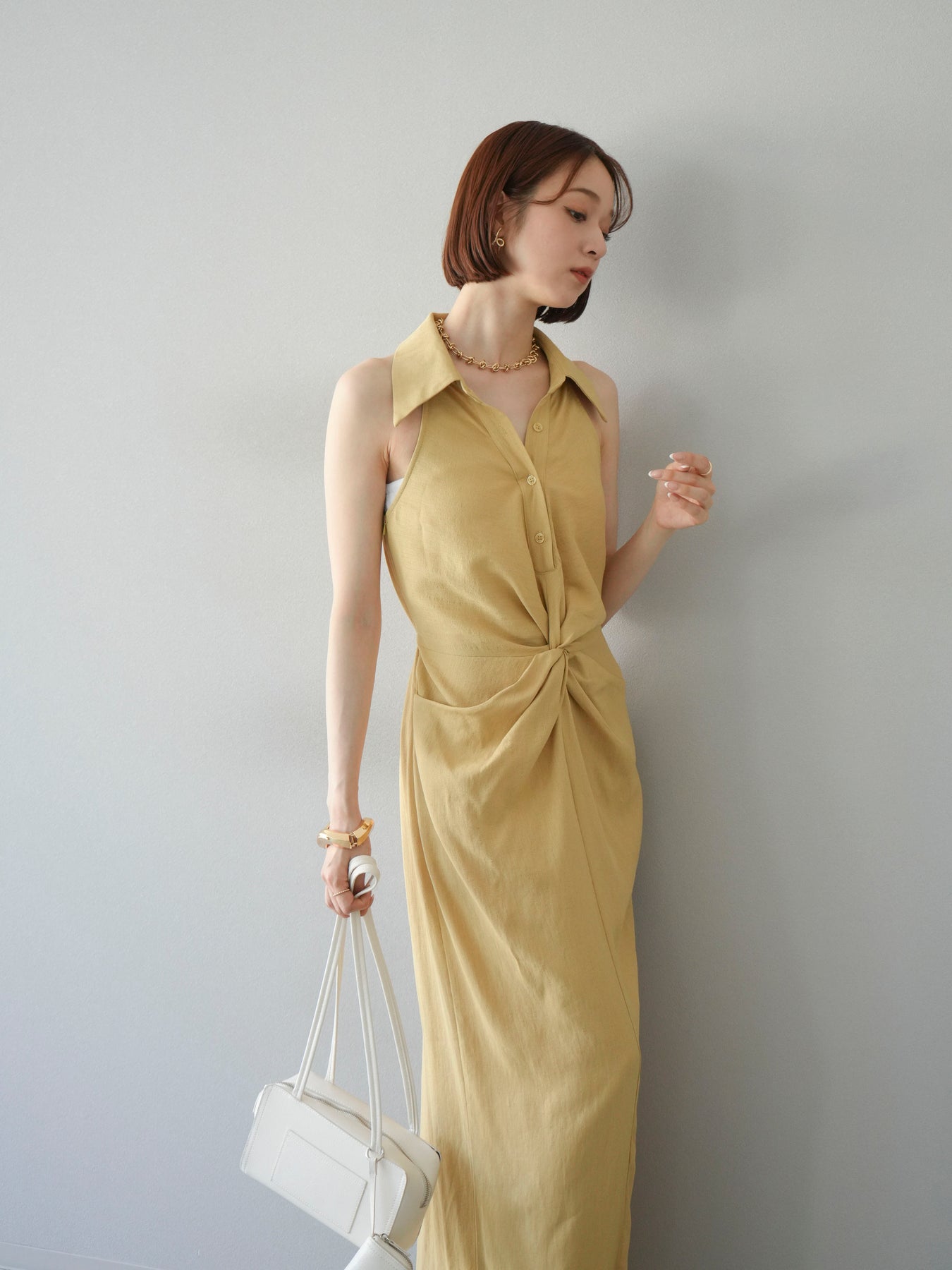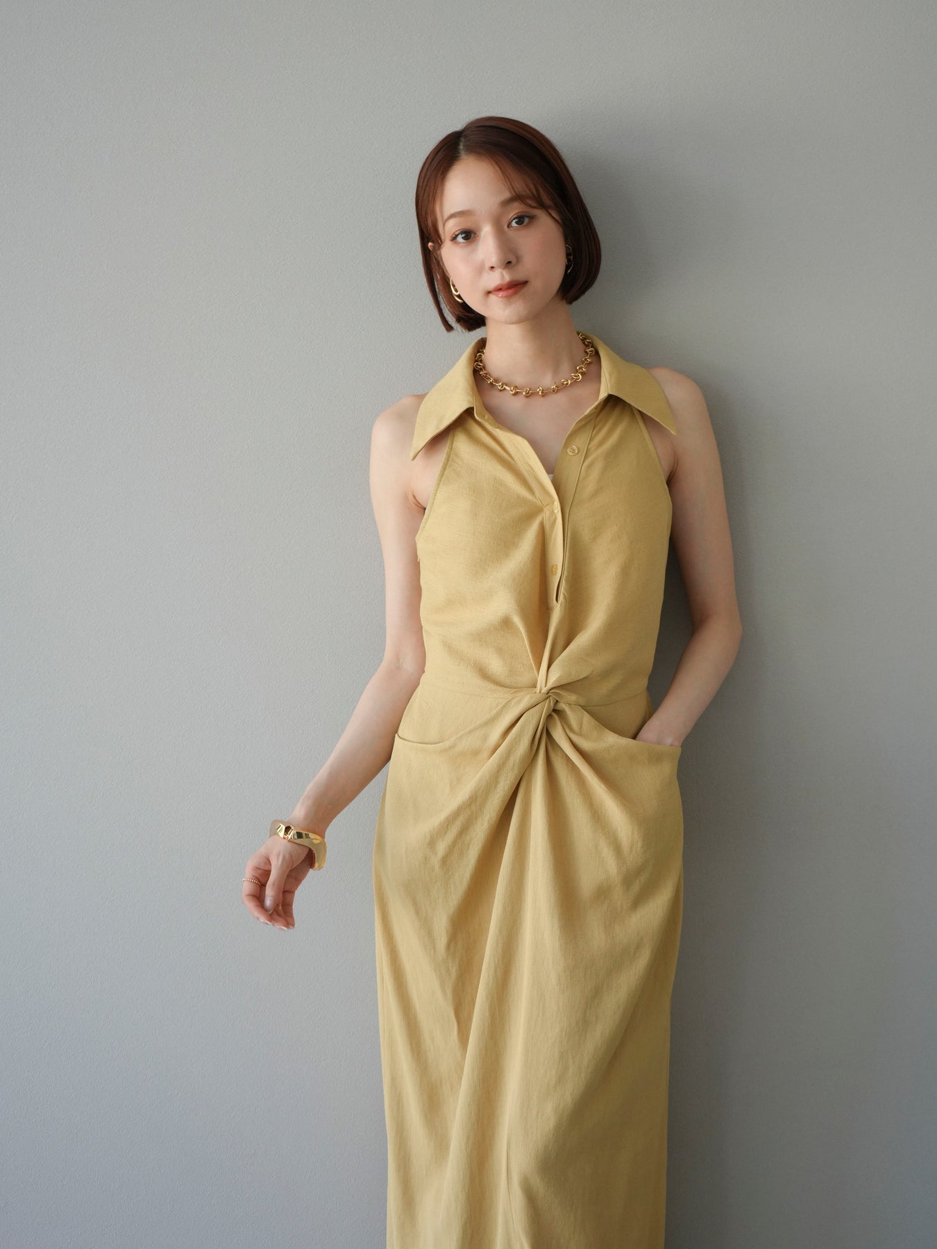 シャツカラーとホルターデザインを掛け合わせた、洗練された印象のノースリーブワンピース。 フロントウエストのツイストディテールが、立体感のある美しいシルエットを演出し、スタイルアップも叶えます。 リネンライクな軽やかな素材感で、涼しげな着心地と品のある表情を両立。 デイリーからリゾートまで、幅広いシーンに映える一着です。 ※ボトムス、キャミソール(インナー)以外の商品は一律でインナーは付属していません