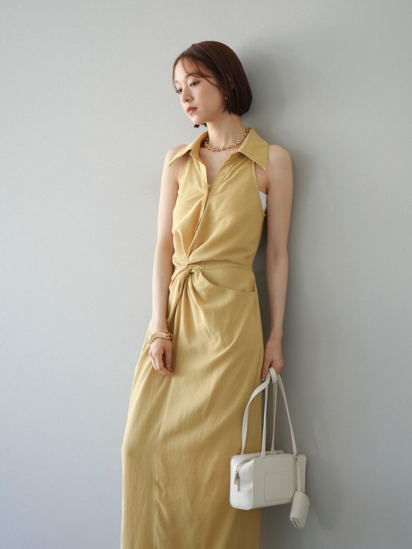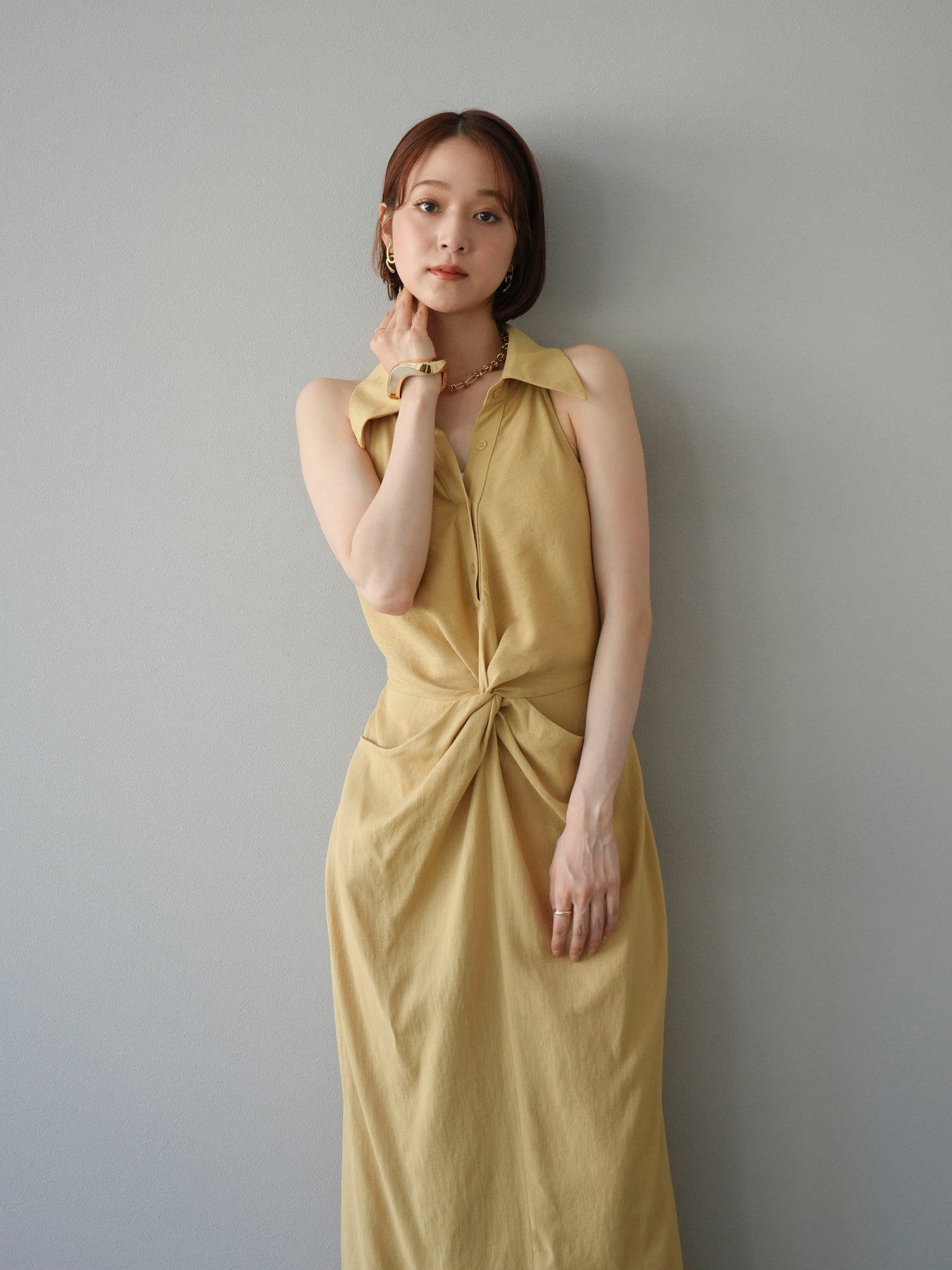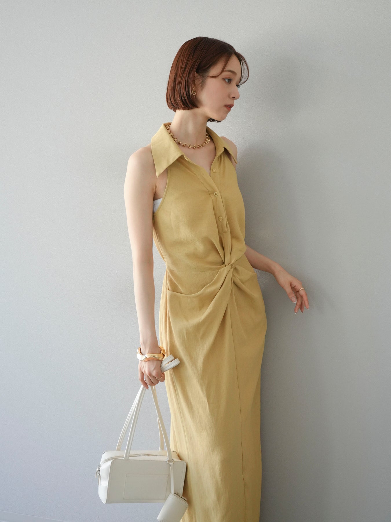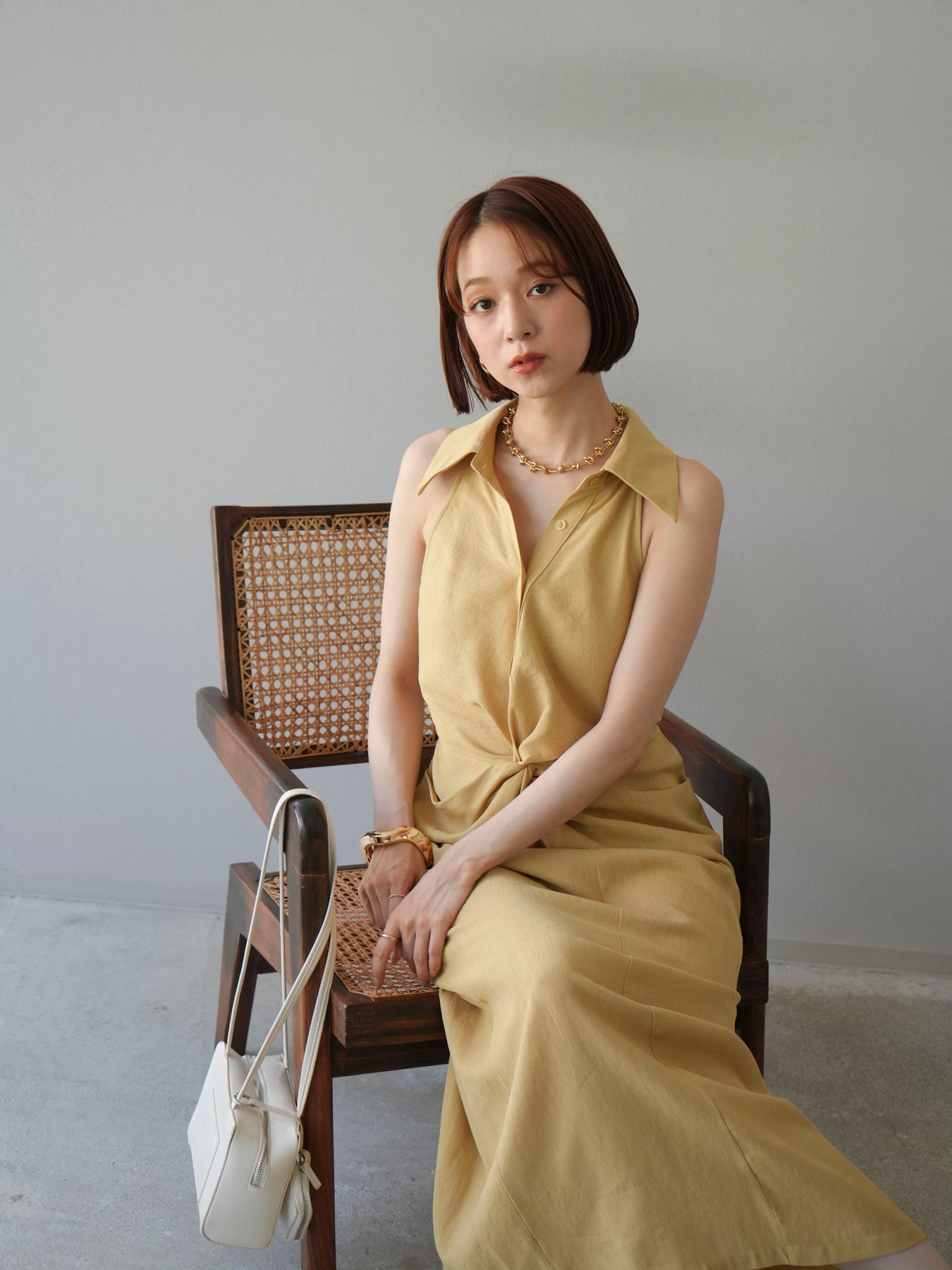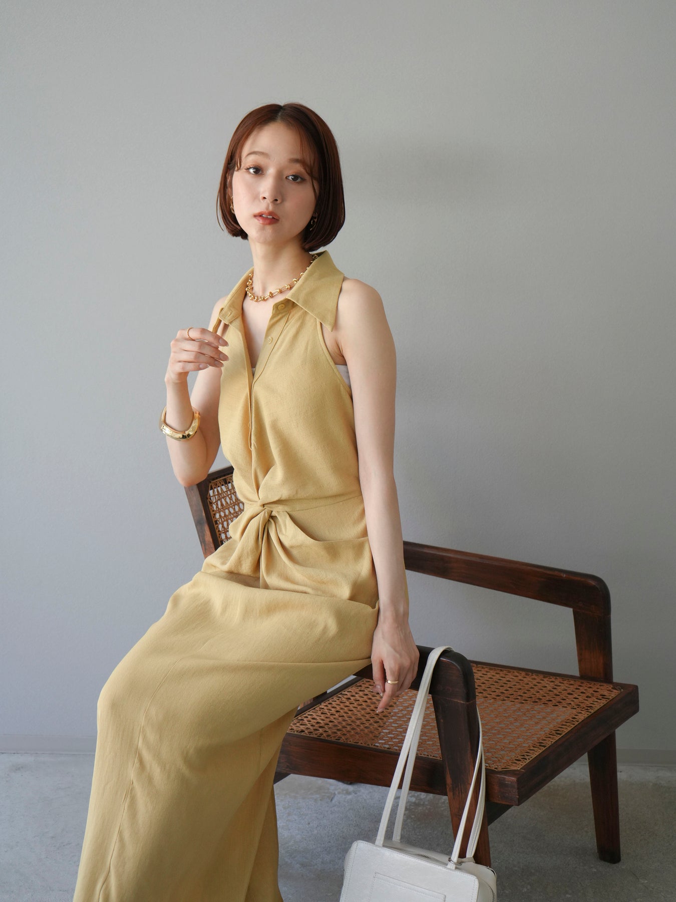 シャツカラーとホルターデザインを掛け合わせた、洗練された印象のノースリーブワンピース。 フロントウエストのツイストディテールが、立体感のある美しいシルエットを演出し、スタイルアップも叶えます。 リネンライクな軽やかな素材感で、涼しげな着心地と品のある表情を両立。 デイリーからリゾートまで、幅広いシーンに映える一着です。 ※ボトムス、キャミソール(インナー)以外の商品は一律でインナーは付属していません