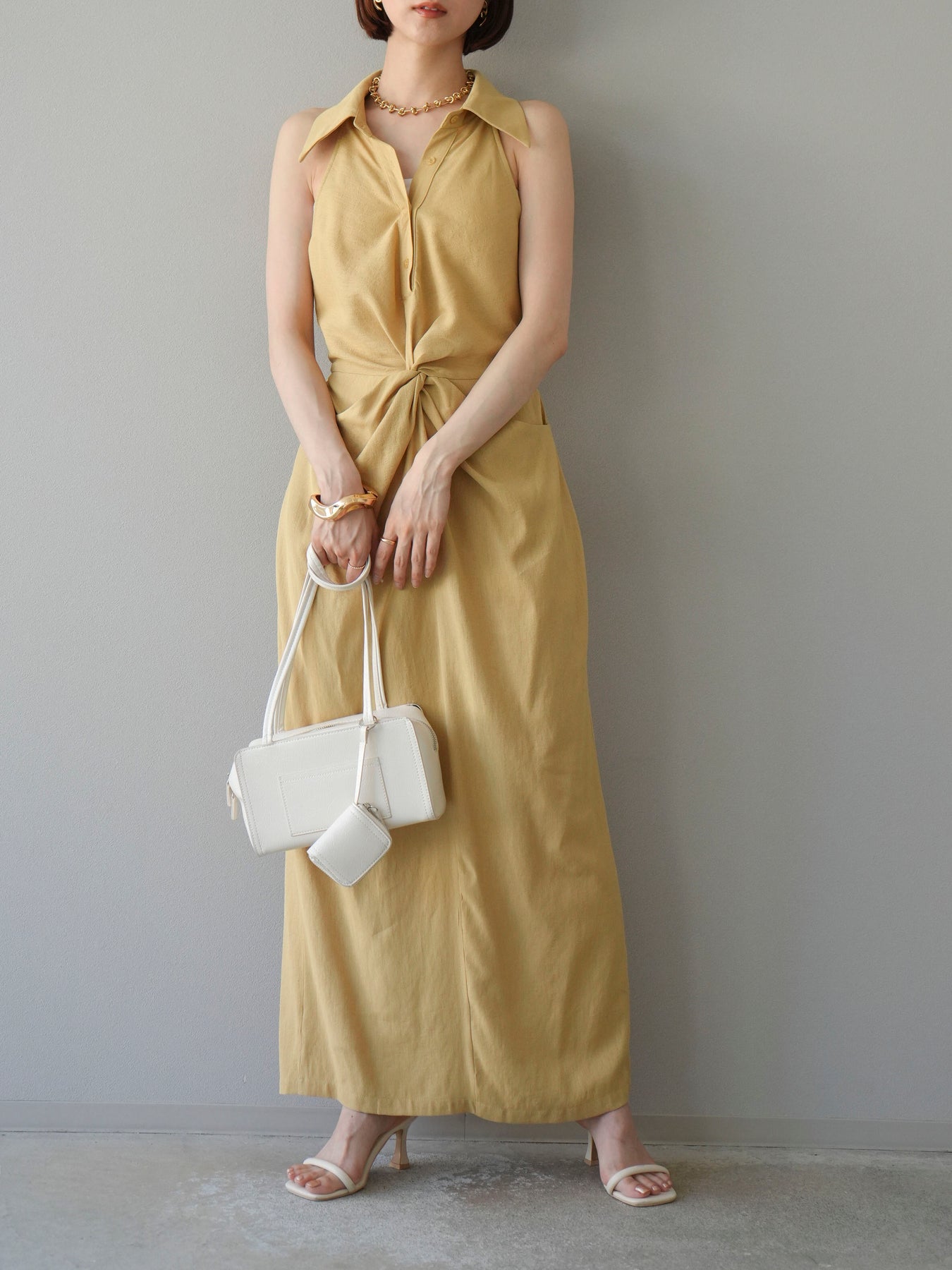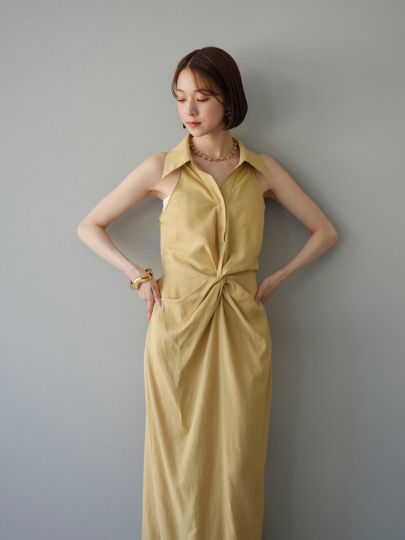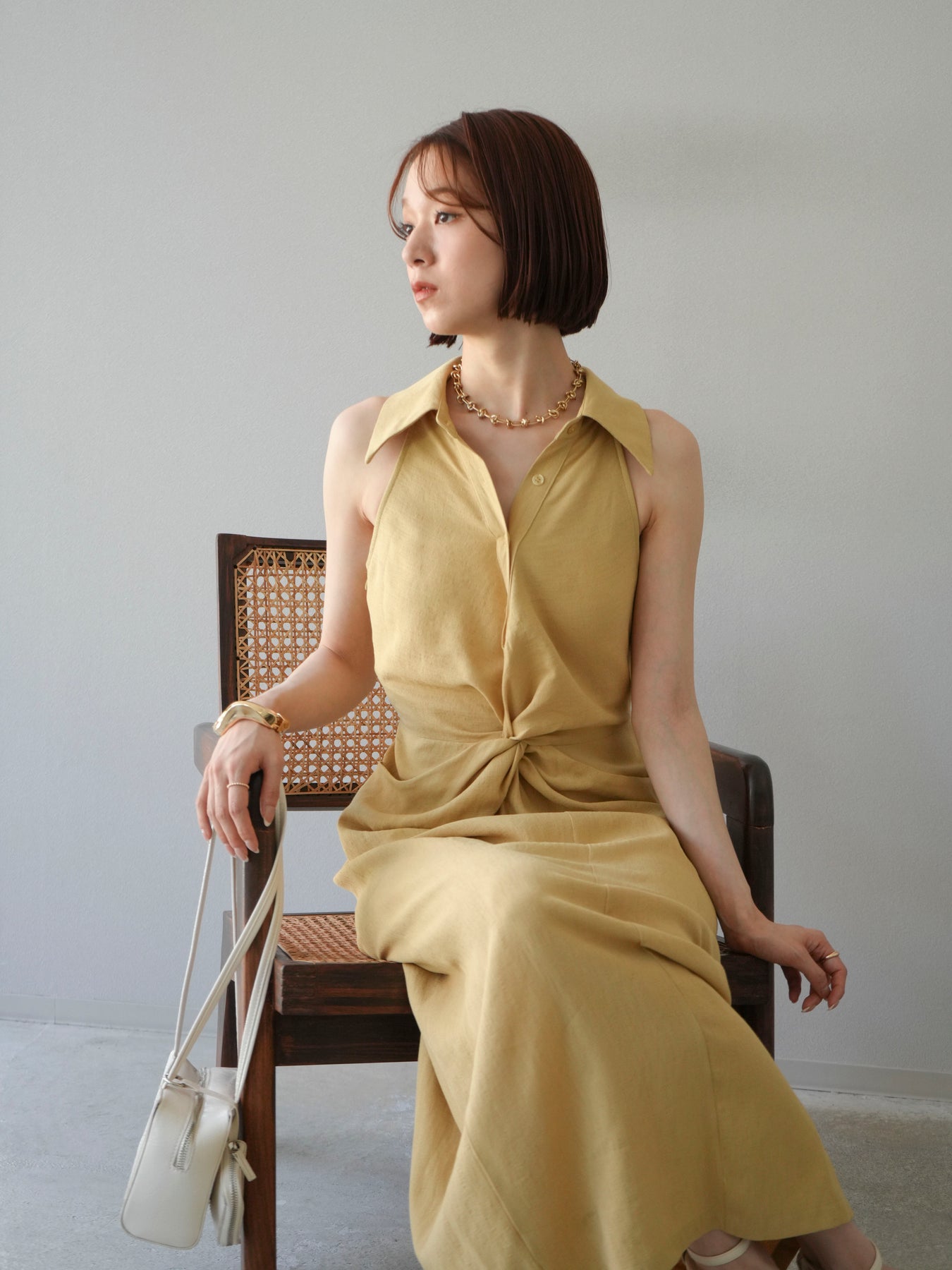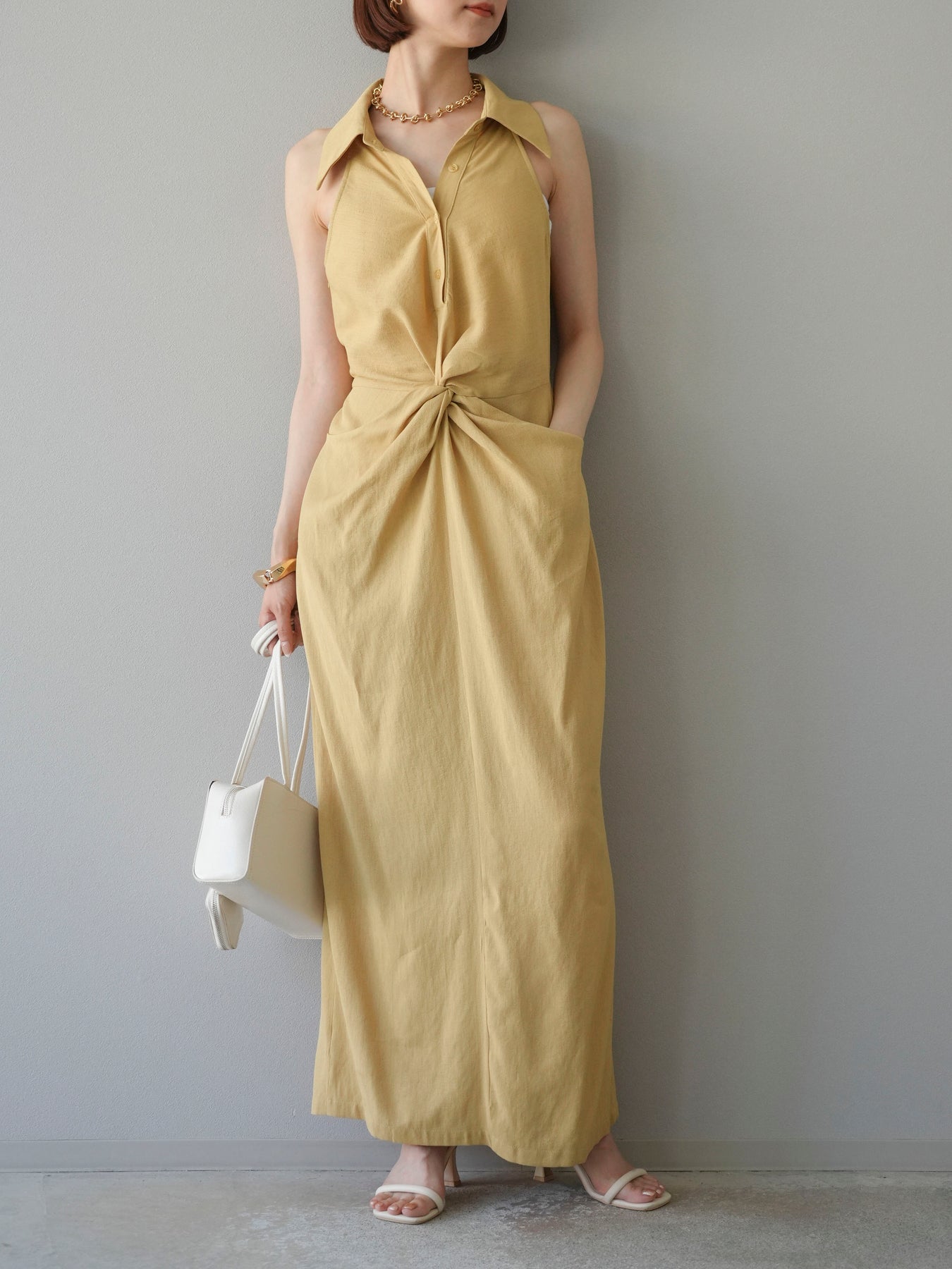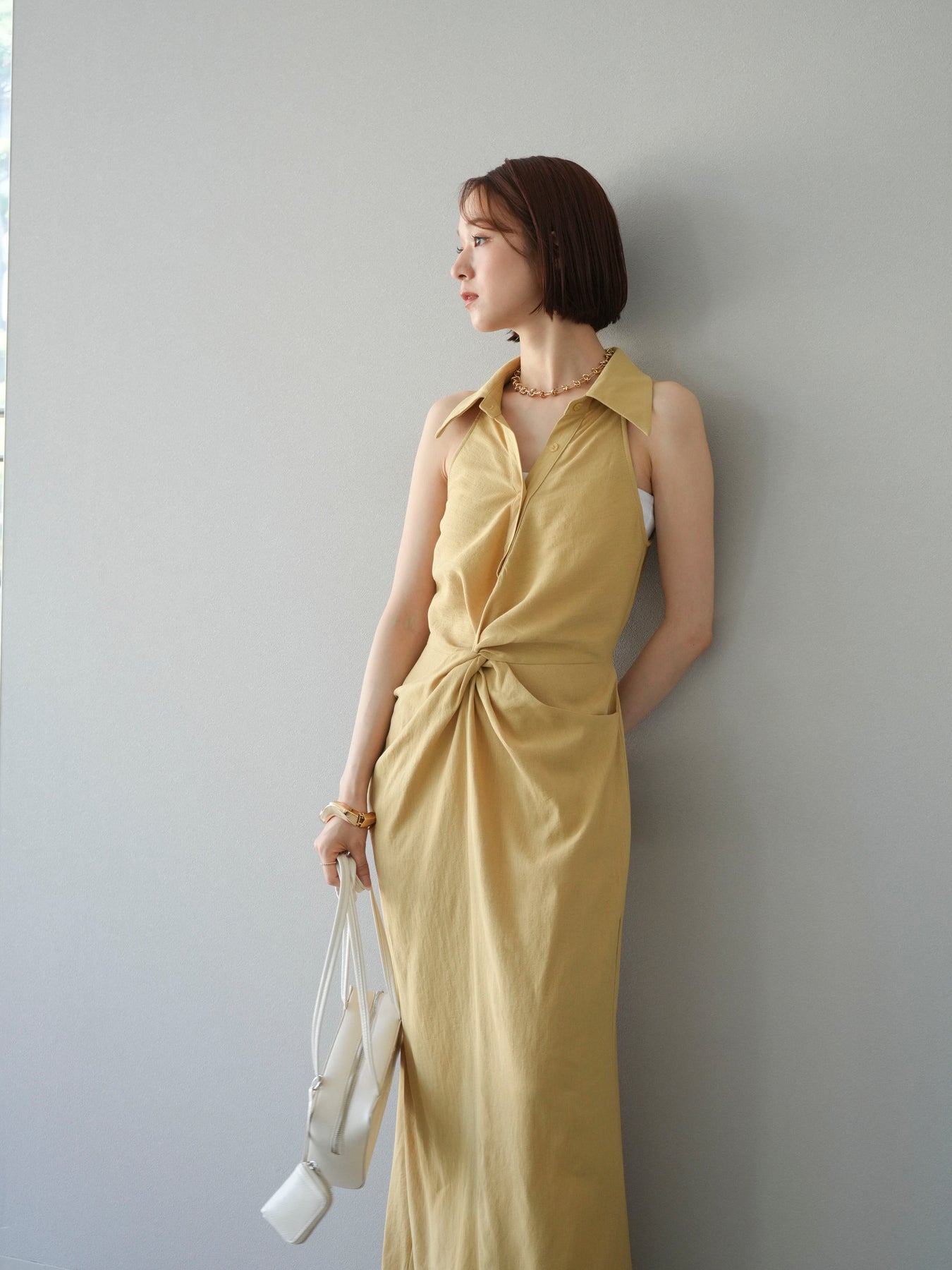 シャツカラーとホルターデザインを掛け合わせた、洗練された印象のノースリーブワンピース。 フロントウエストのツイストディテールが、立体感のある美しいシルエットを演出し、スタイルアップも叶えます。 リネンライクな軽やかな素材感で、涼しげな着心地と品のある表情を両立。 デイリーからリゾートまで、幅広いシーンに映える一着です。 ※ボトムス、キャミソール(インナー)以外の商品は一律でインナーは付属していません