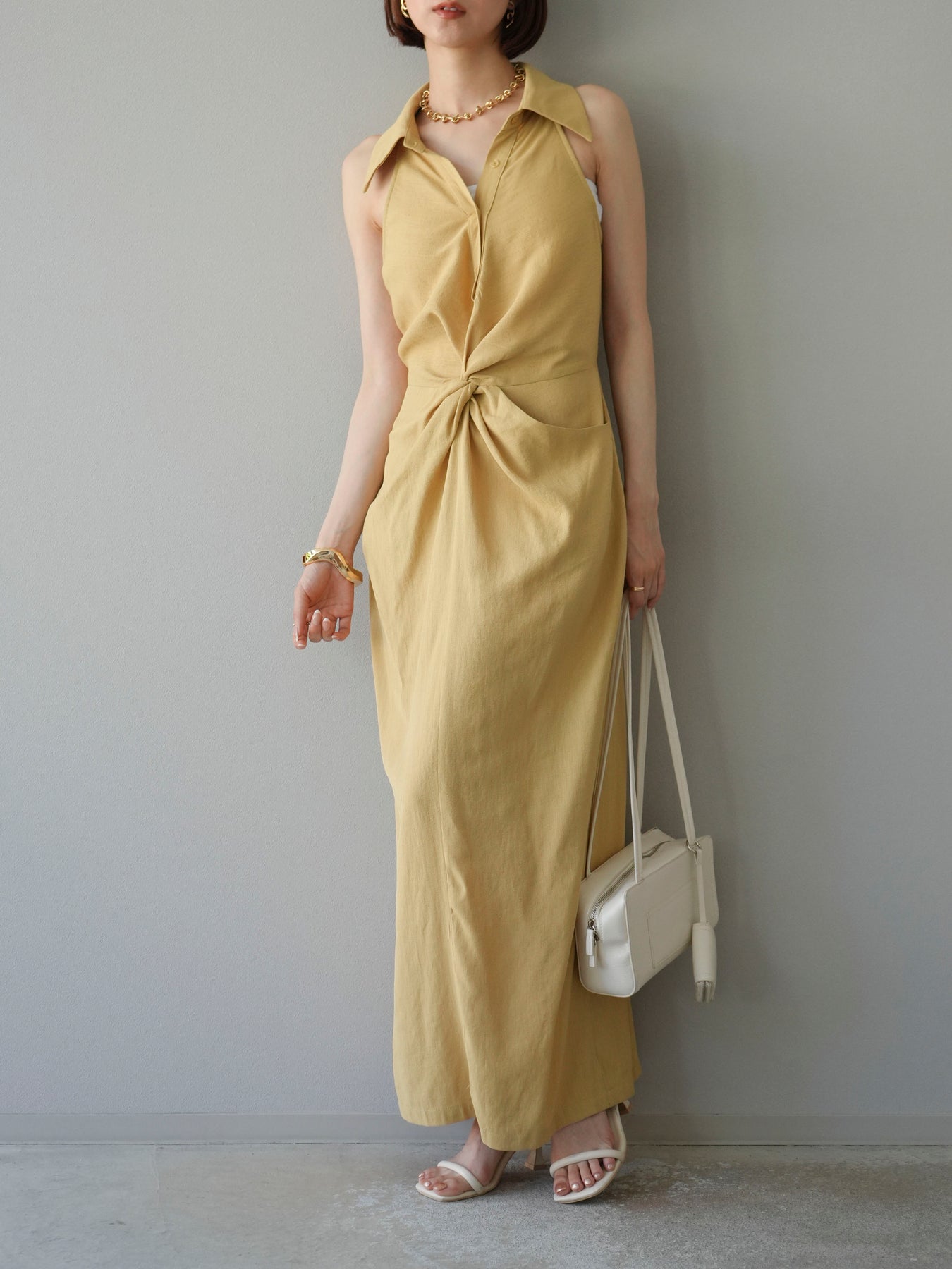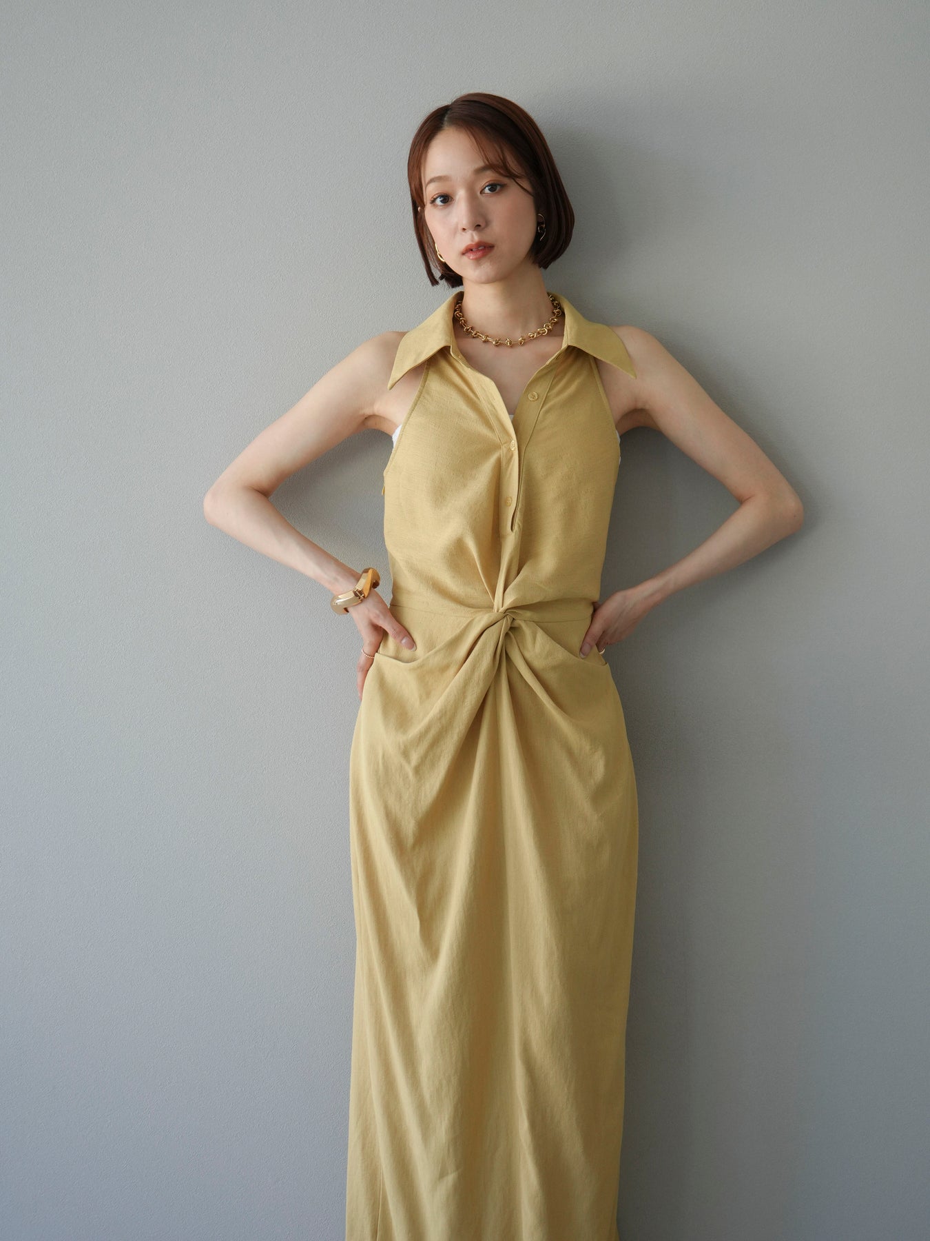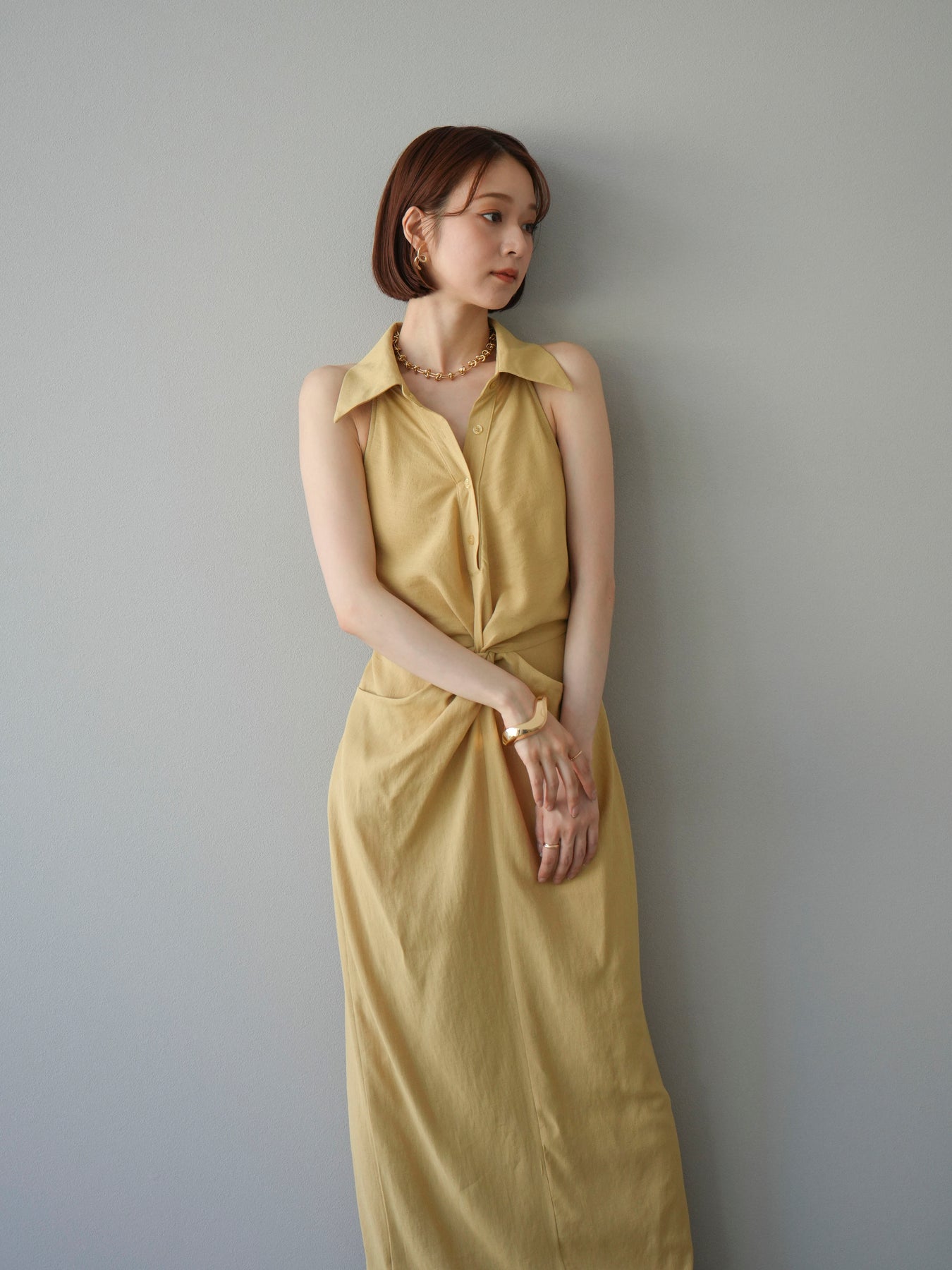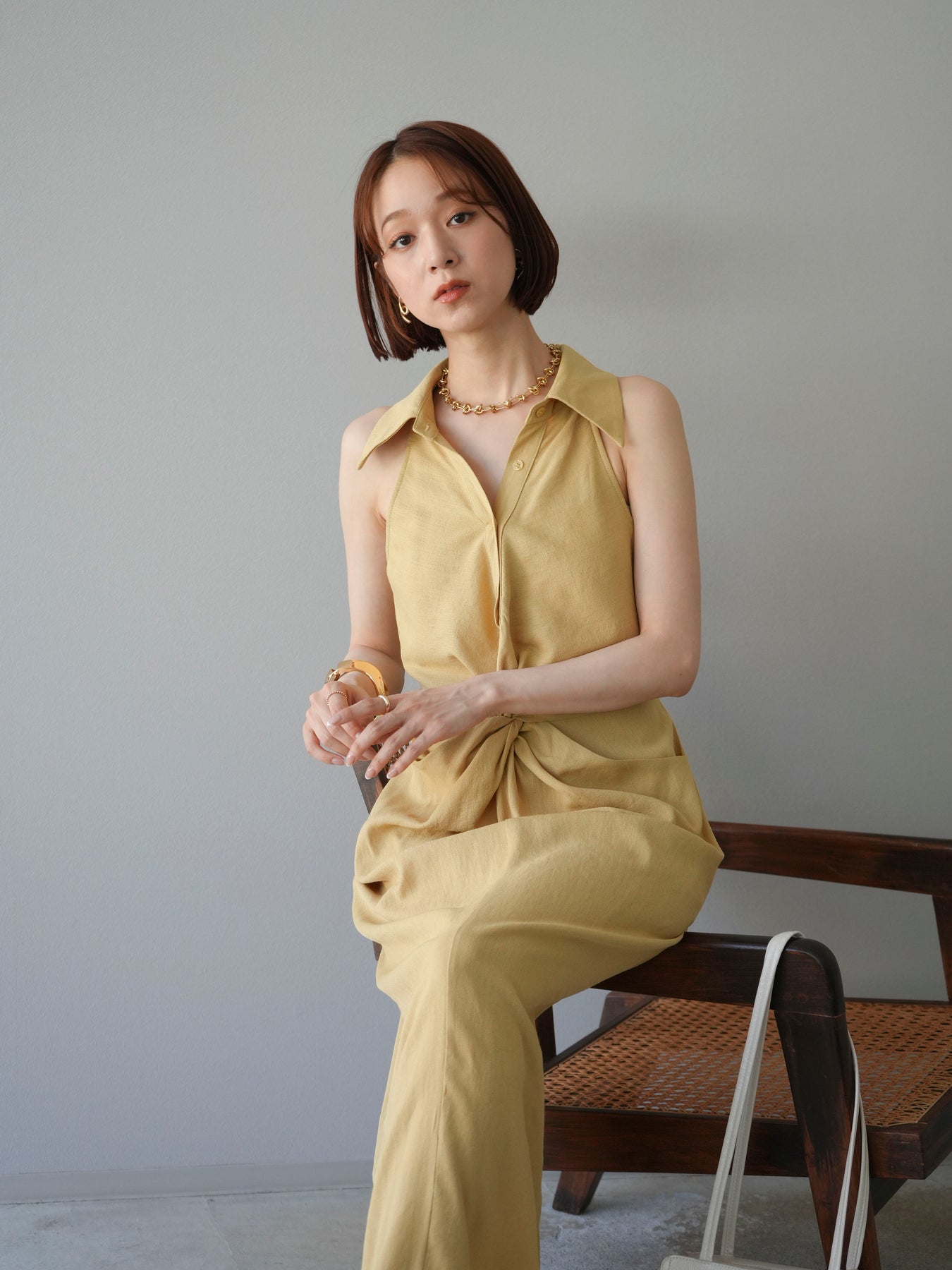 シャツカラーとホルターデザインを掛け合わせた、洗練された印象のノースリーブワンピース。 フロントウエストのツイストディテールが、立体感のある美しいシルエットを演出し、スタイルアップも叶えます。 リネンライクな軽やかな素材感で、涼しげな着心地と品のある表情を両立。 デイリーからリゾートまで、幅広いシーンに映える一着です。 ※ボトムス、キャミソール(インナー)以外の商品は一律でインナーは付属していません