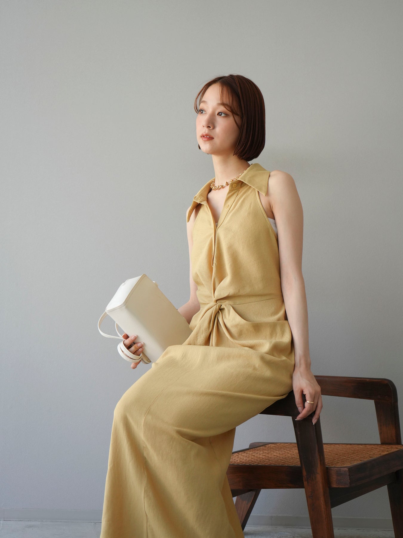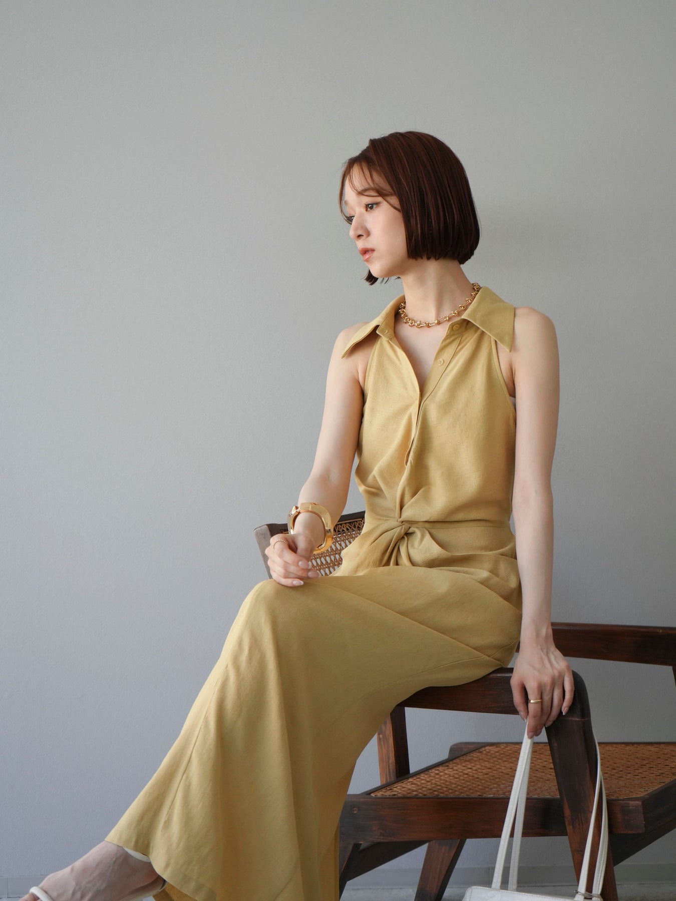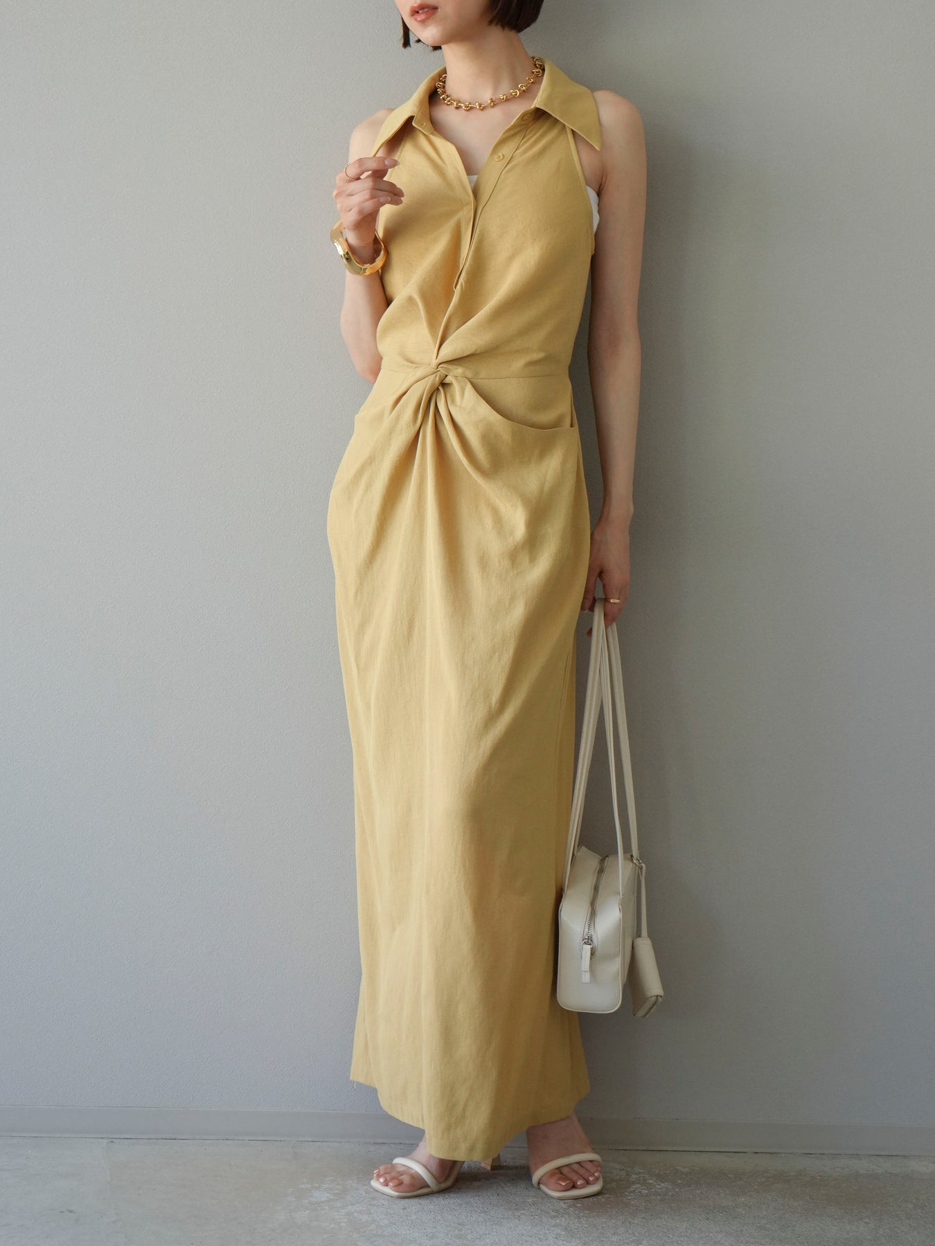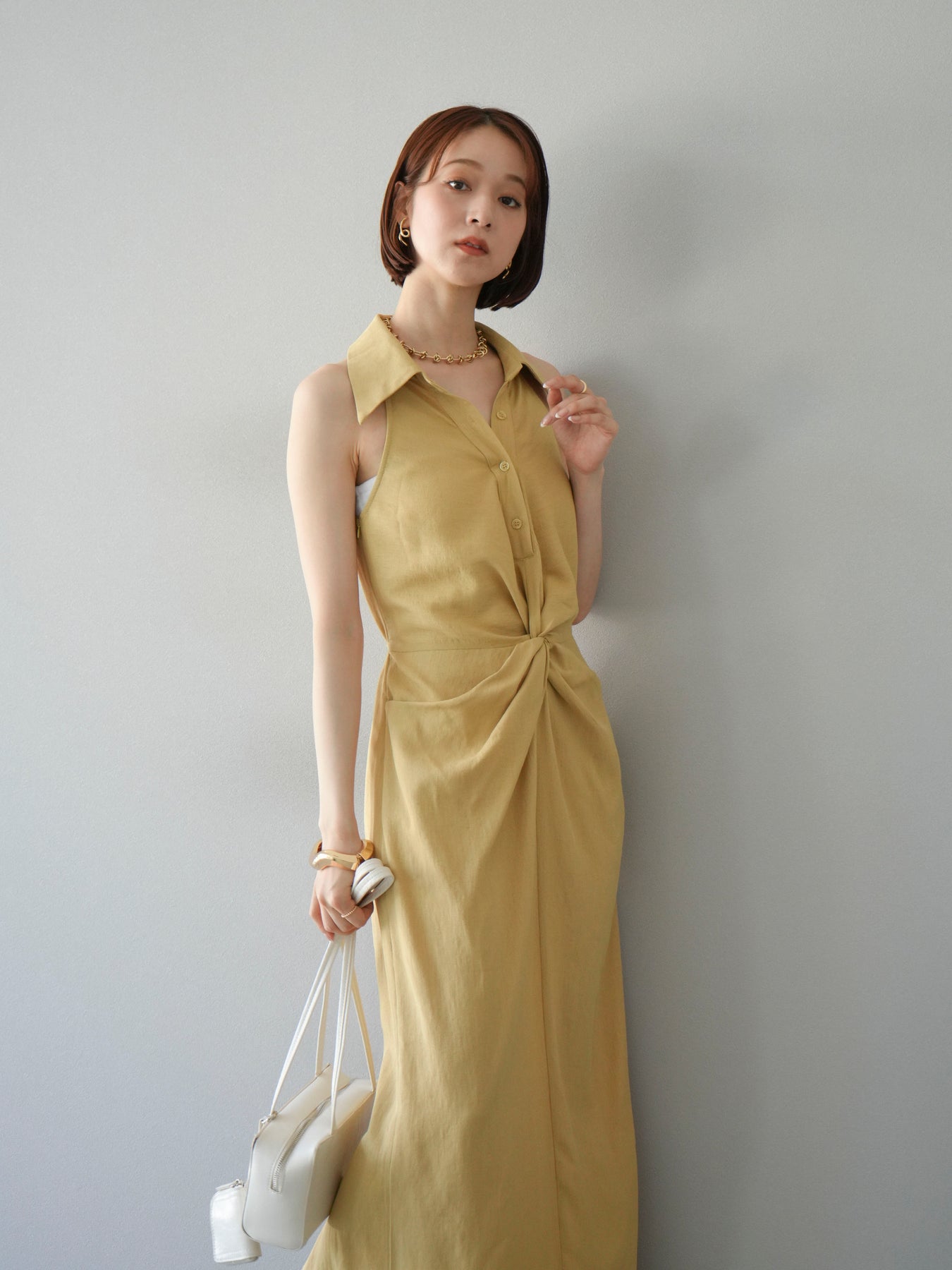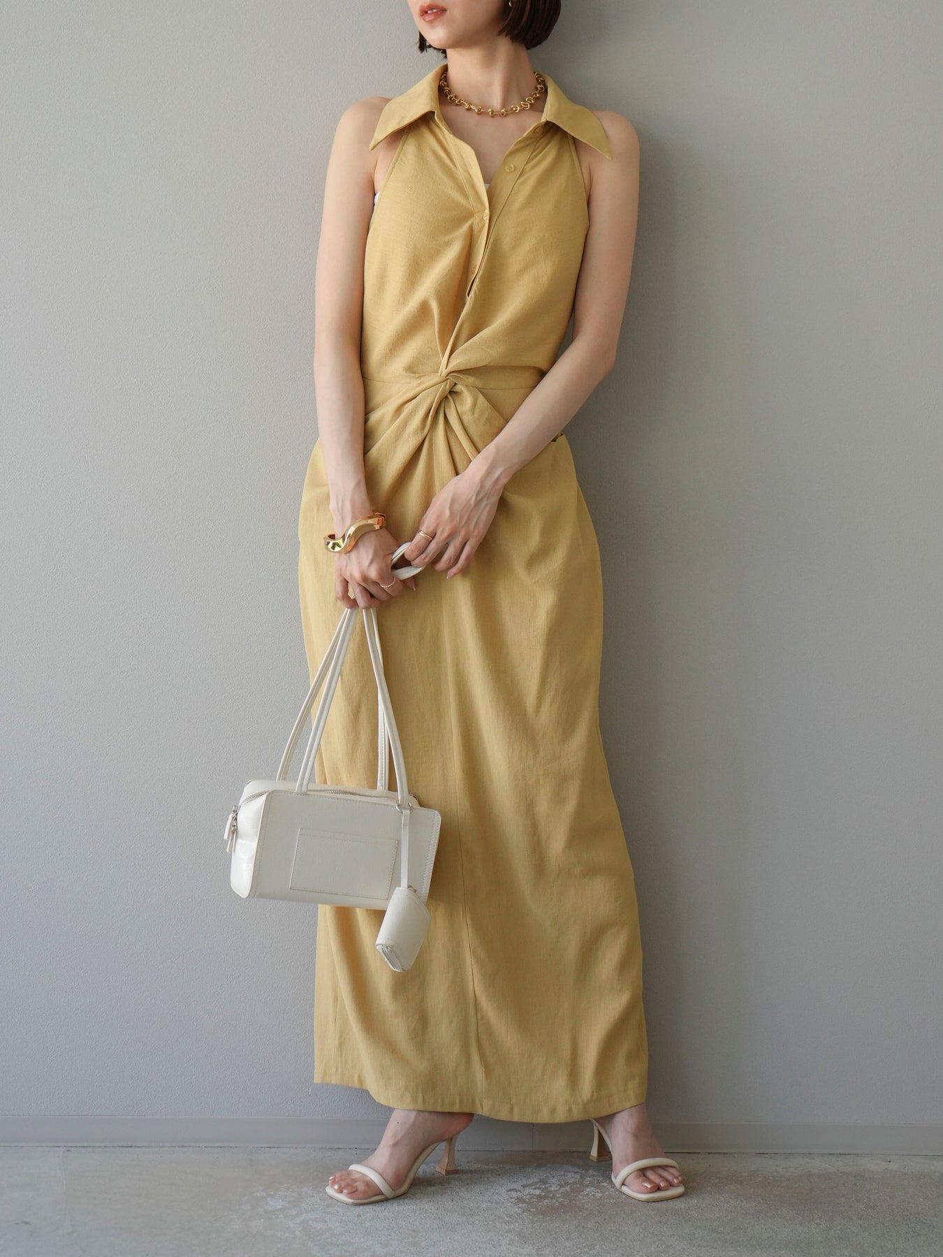 シャツカラーとホルターデザインを掛け合わせた、洗練された印象のノースリーブワンピース。 フロントウエストのツイストディテールが、立体感のある美しいシルエットを演出し、スタイルアップも叶えます。 リネンライクな軽やかな素材感で、涼しげな着心地と品のある表情を両立。 デイリーからリゾートまで、幅広いシーンに映える一着です。 ※ボトムス、キャミソール(インナー)以外の商品は一律でインナーは付属していません
