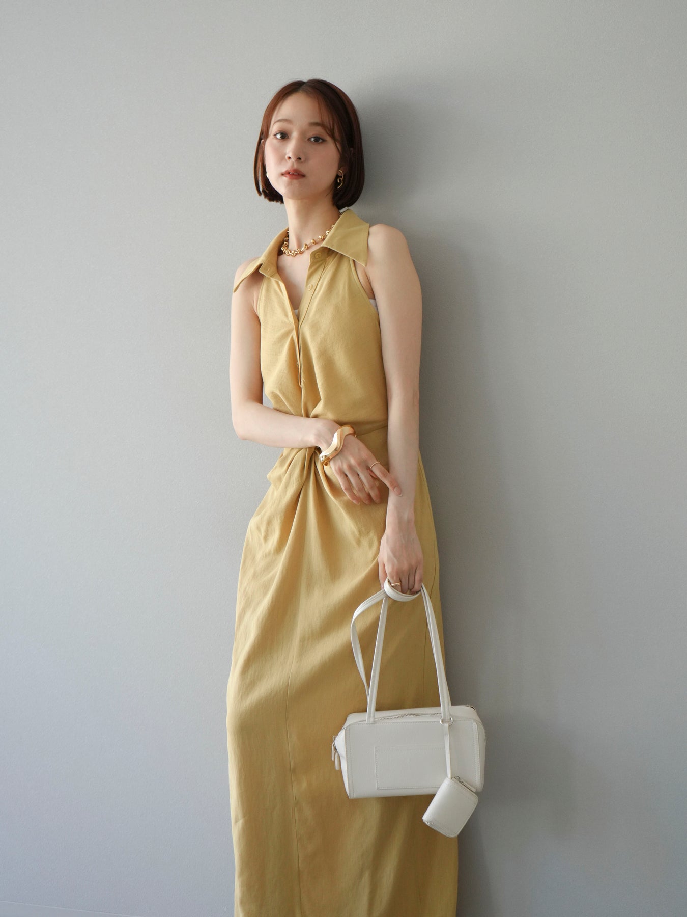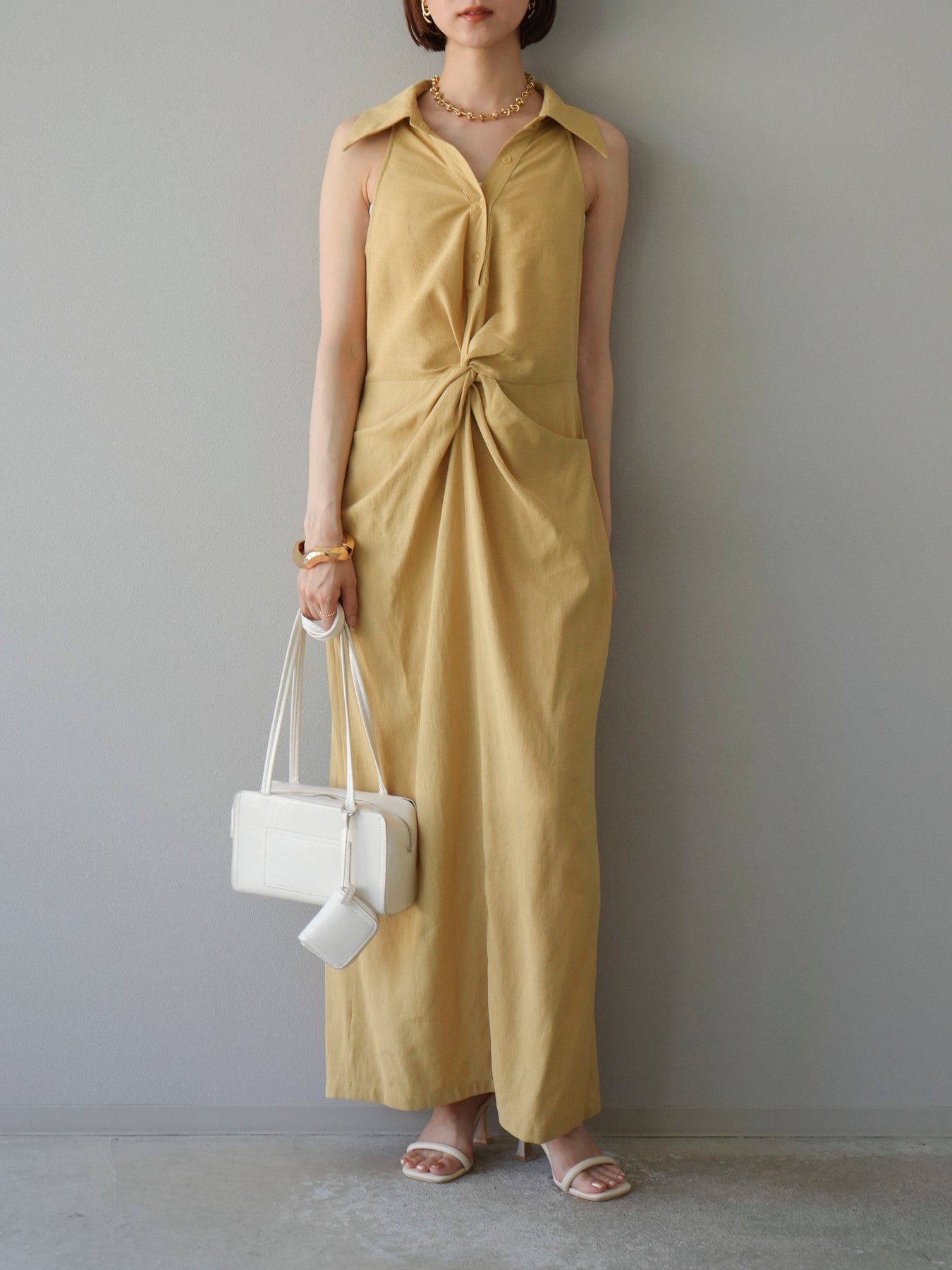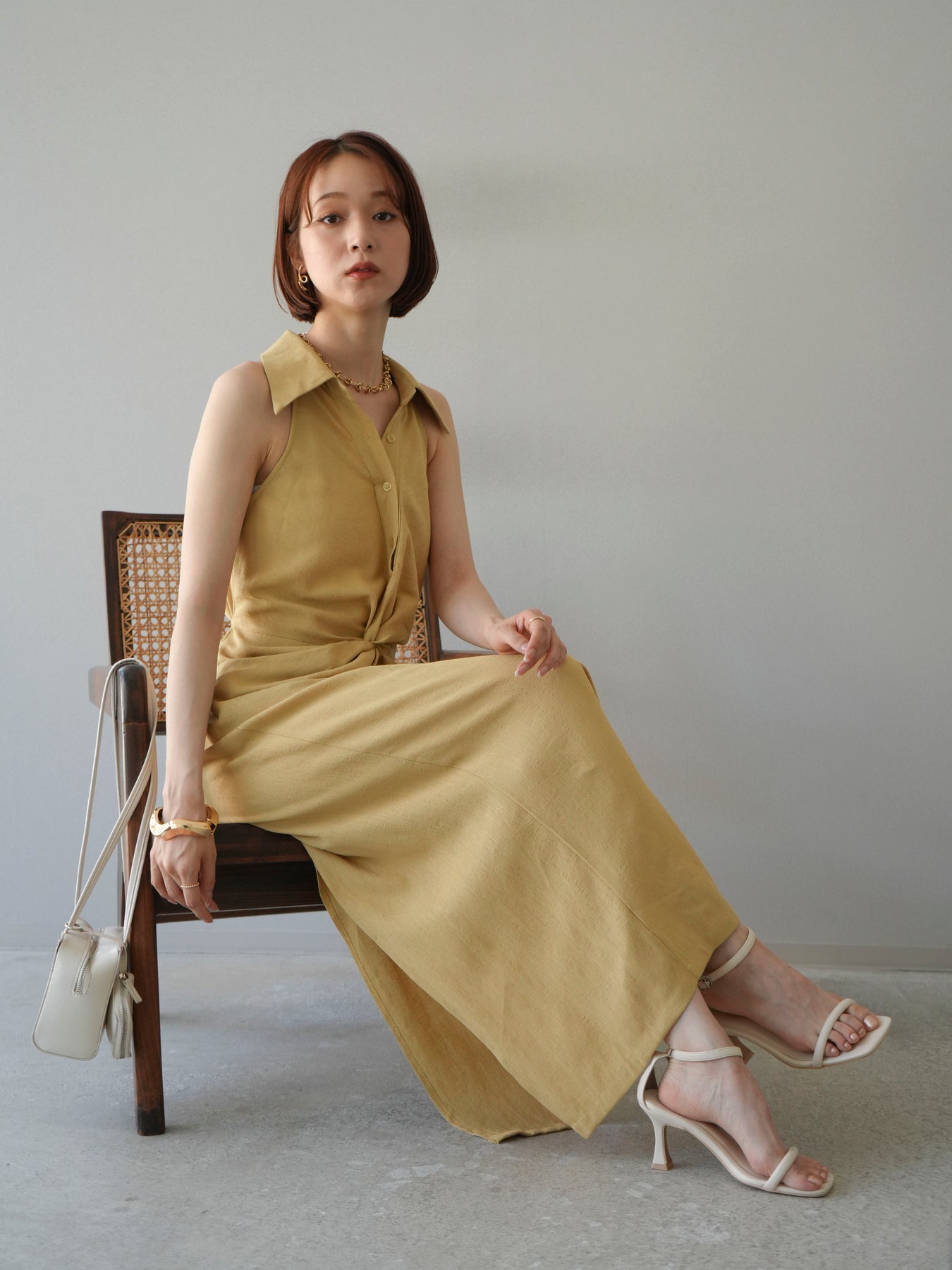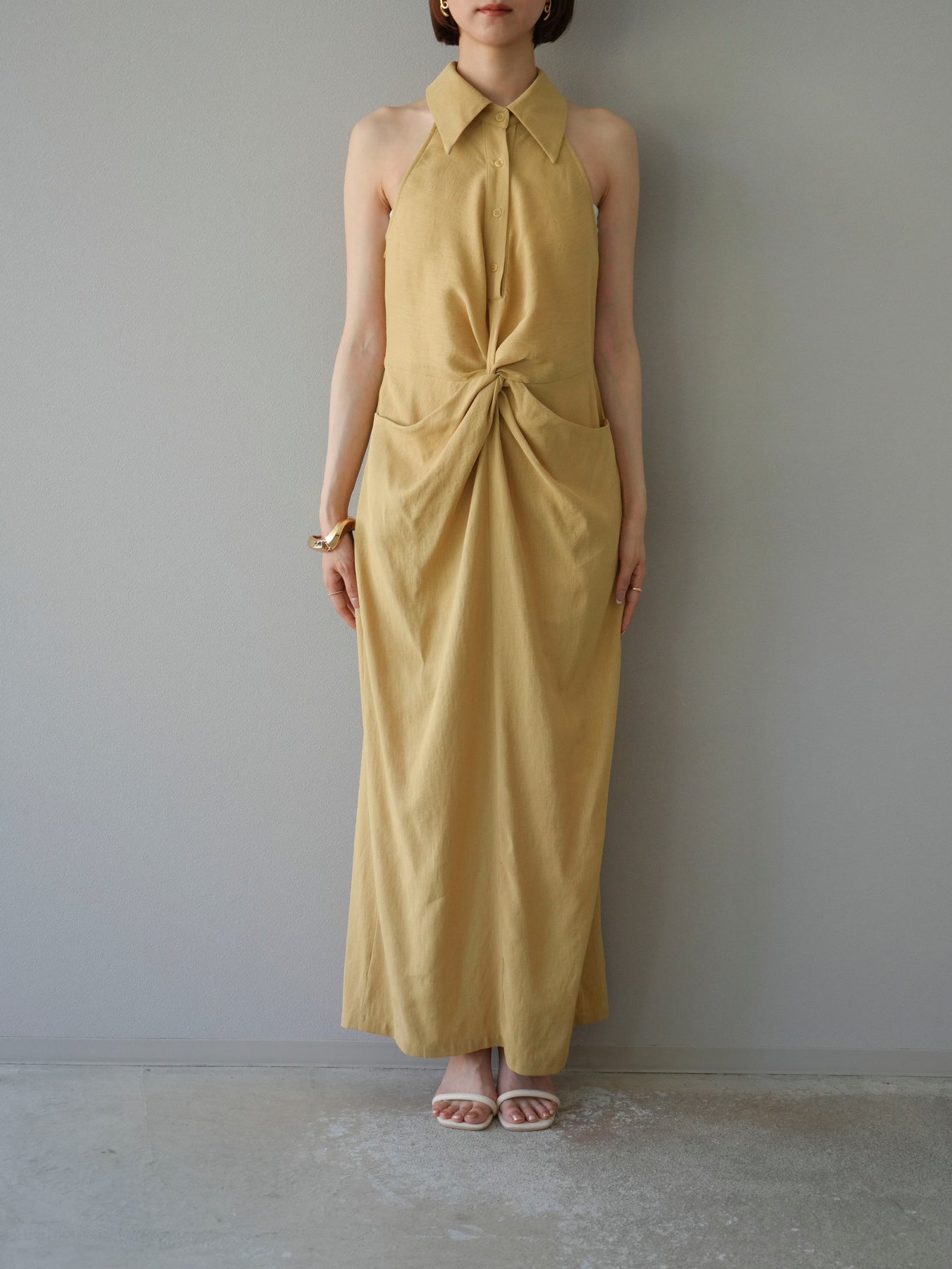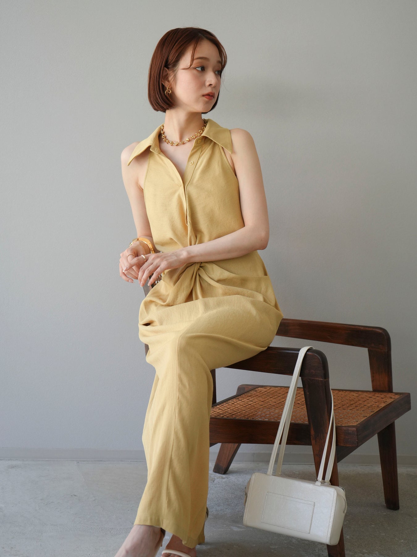 シャツカラーとホルターデザインを掛け合わせた、洗練された印象のノースリーブワンピース。 フロントウエストのツイストディテールが、立体感のある美しいシルエットを演出し、スタイルアップも叶えます。 リネンライクな軽やかな素材感で、涼しげな着心地と品のある表情を両立。 デイリーからリゾートまで、幅広いシーンに映える一着です。 ※ボトムス、キャミソール(インナー)以外の商品は一律でインナーは付属していません