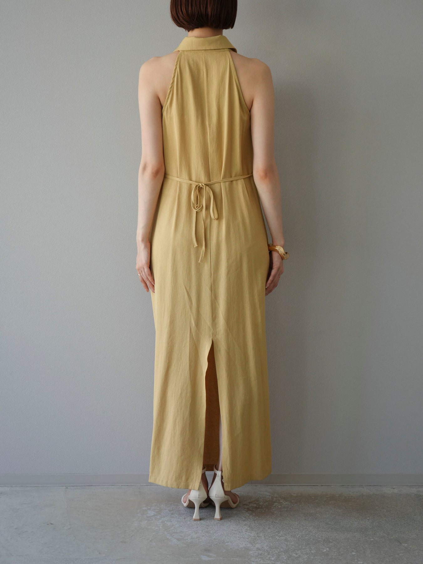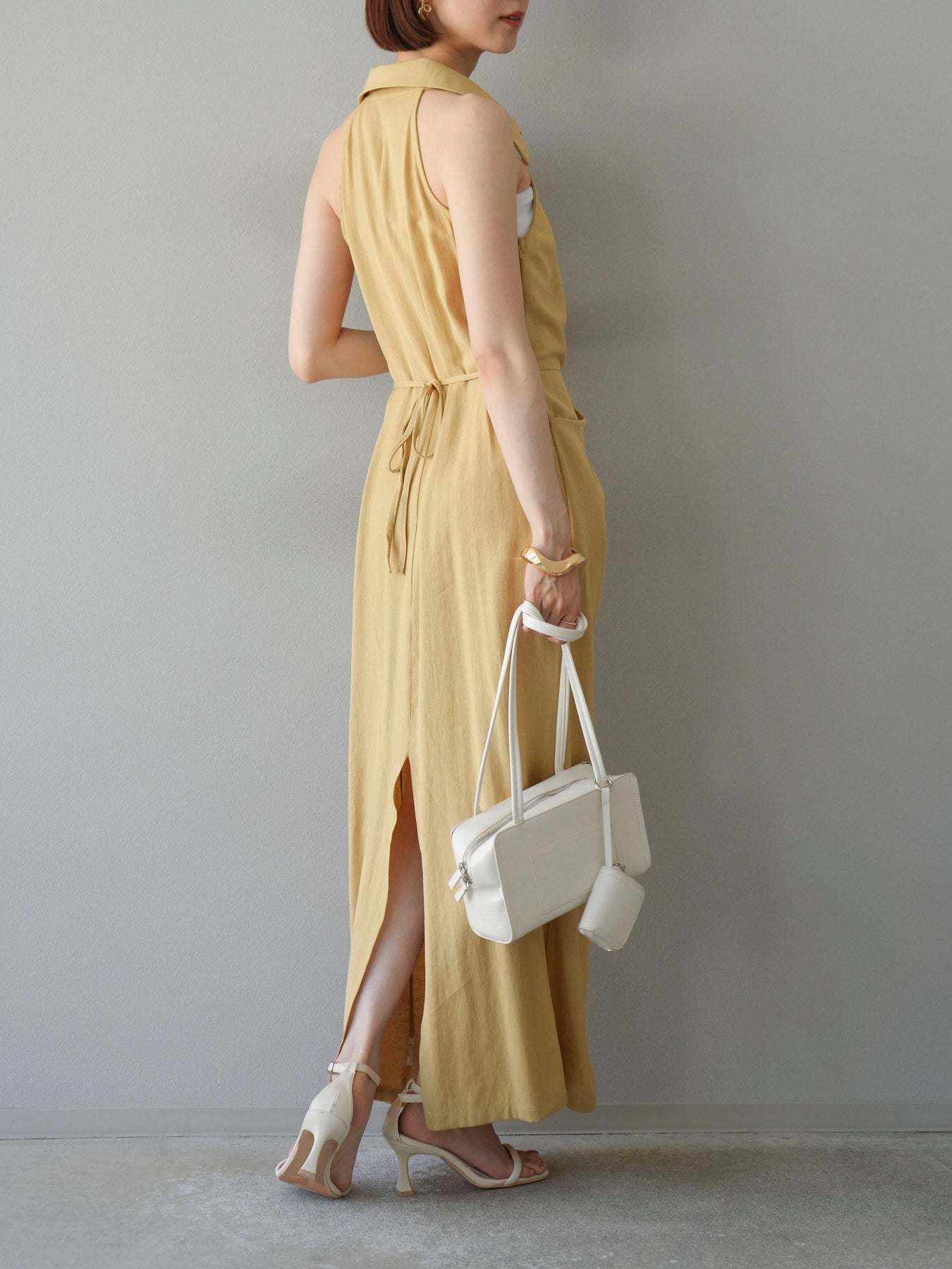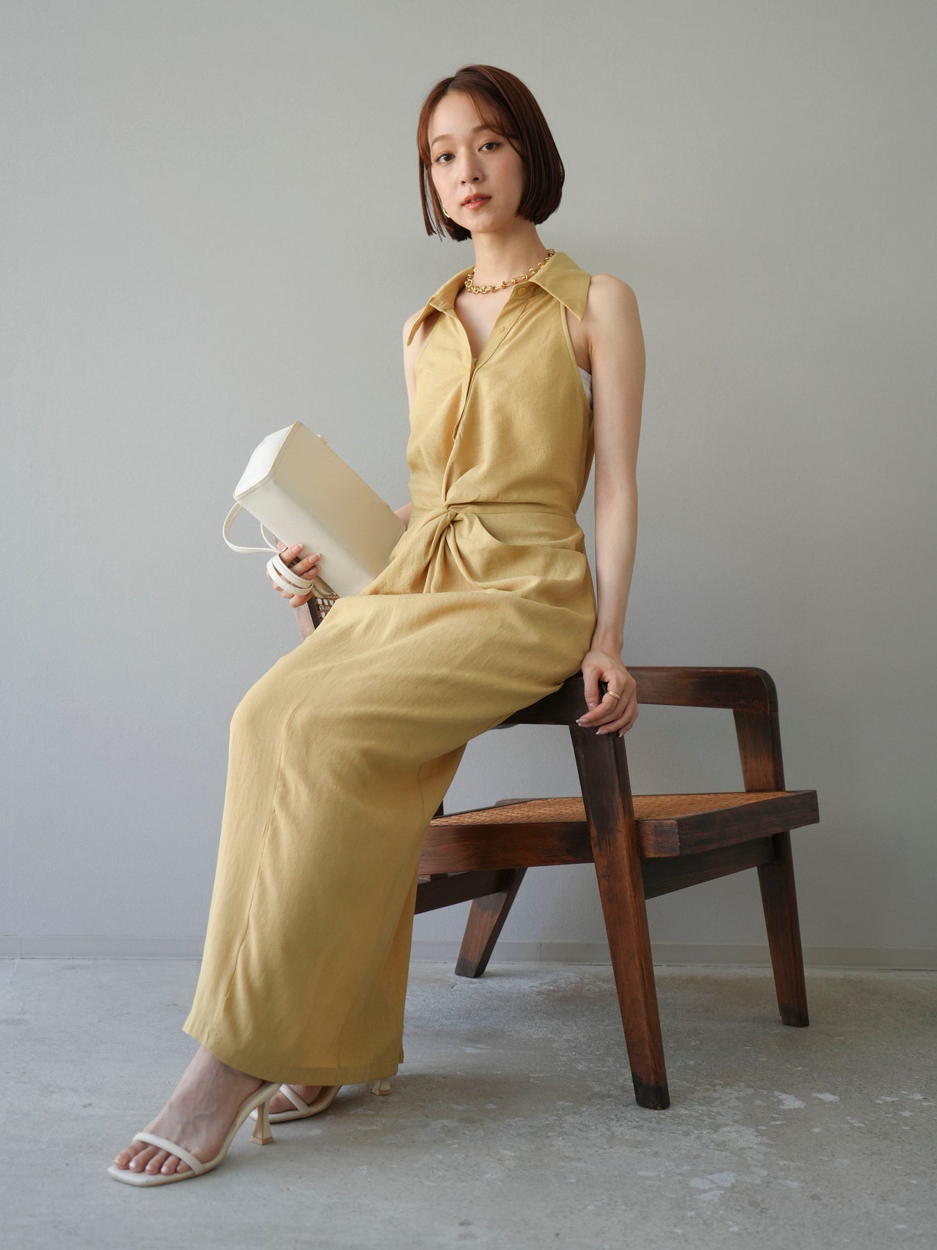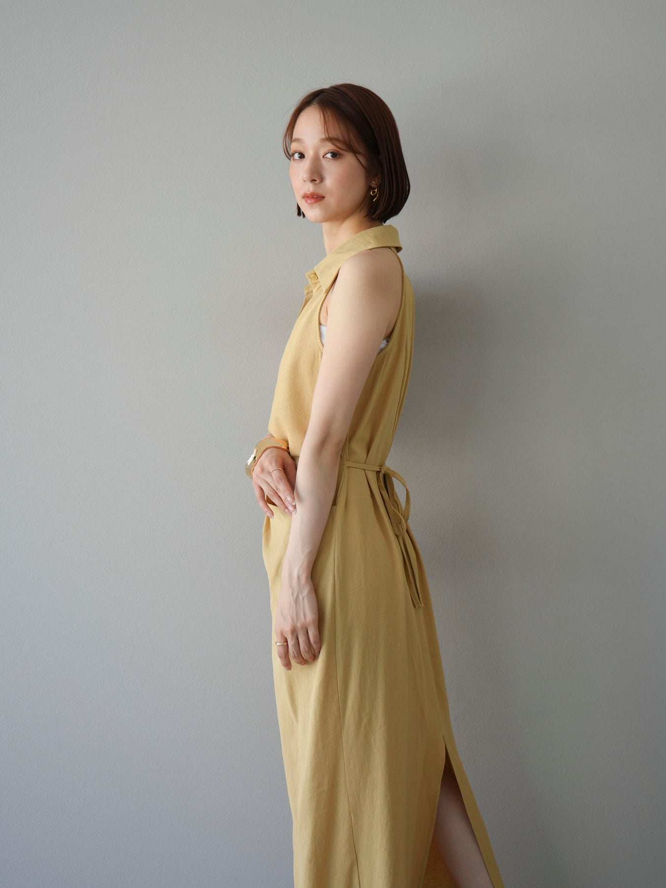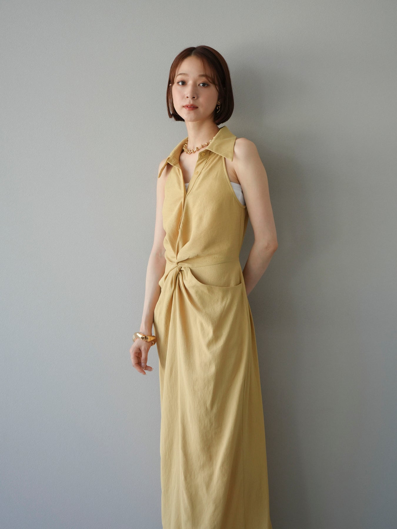 シャツカラーとホルターデザインを掛け合わせた、洗練された印象のノースリーブワンピース。 フロントウエストのツイストディテールが、立体感のある美しいシルエットを演出し、スタイルアップも叶えます。 リネンライクな軽やかな素材感で、涼しげな着心地と品のある表情を両立。 デイリーからリゾートまで、幅広いシーンに映える一着です。 ※ボトムス、キャミソール(インナー)以外の商品は一律でインナーは付属していません
