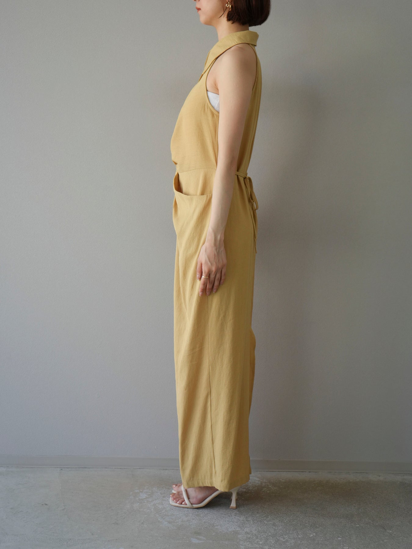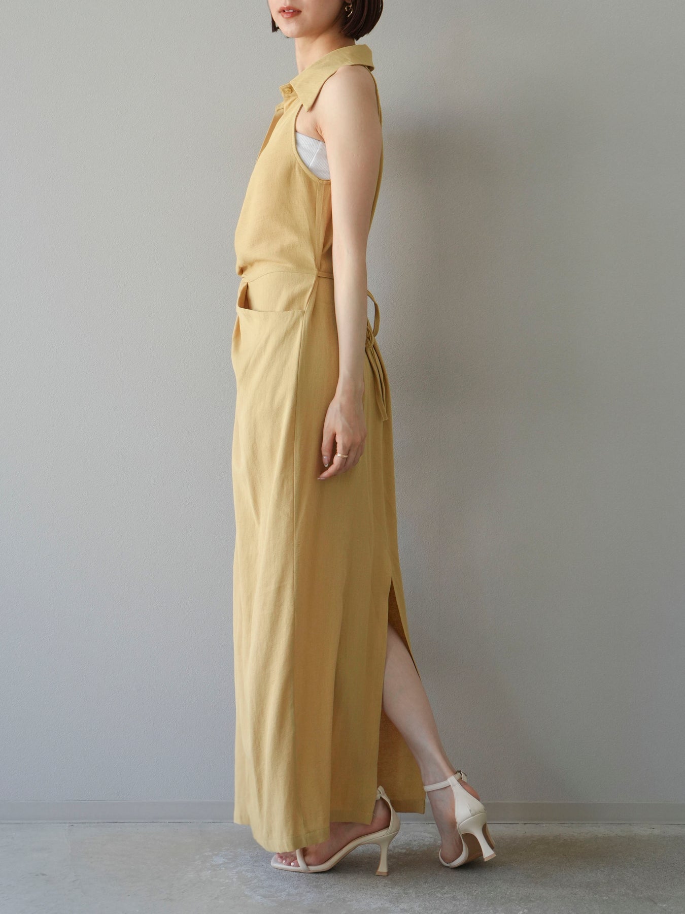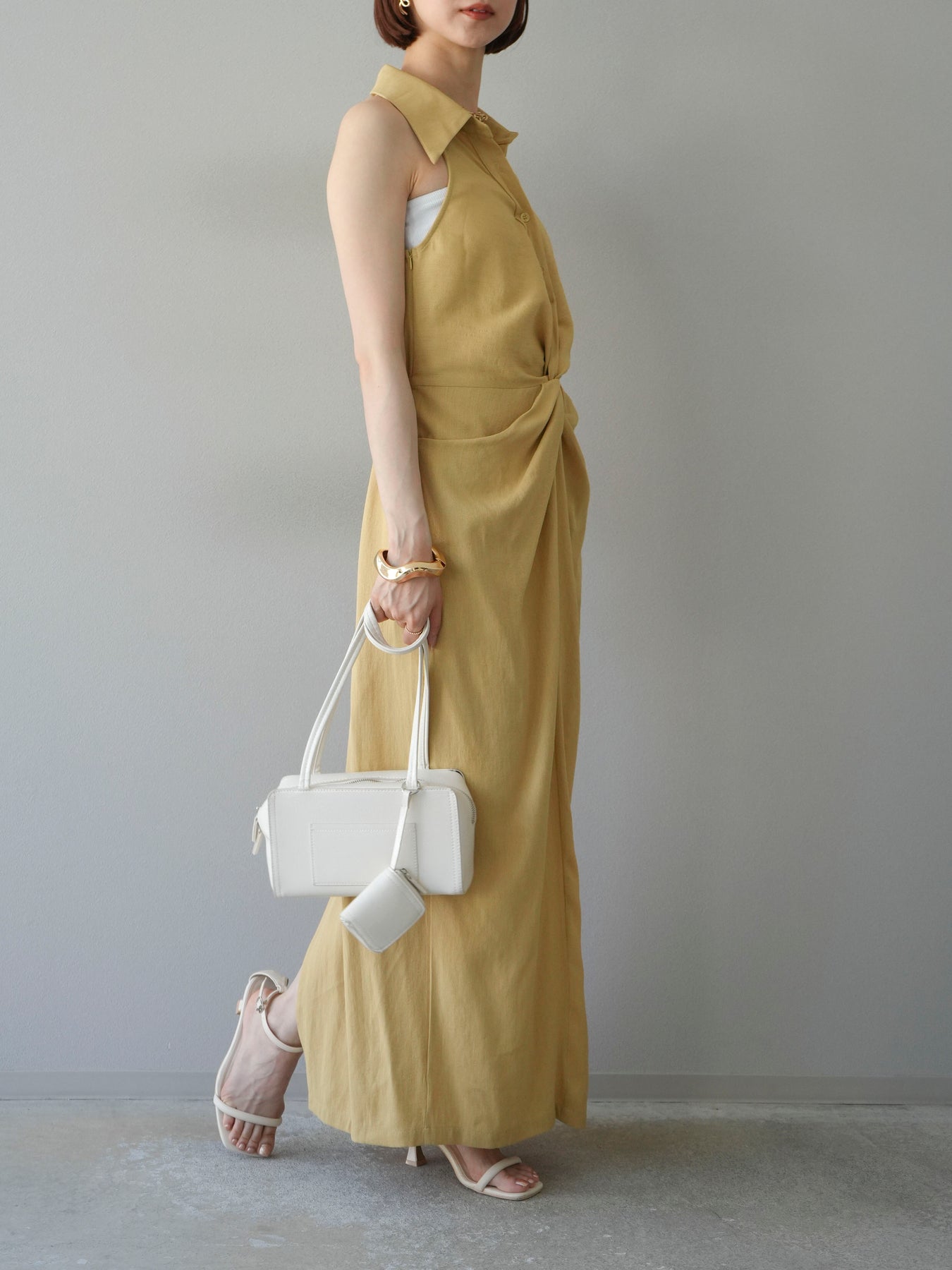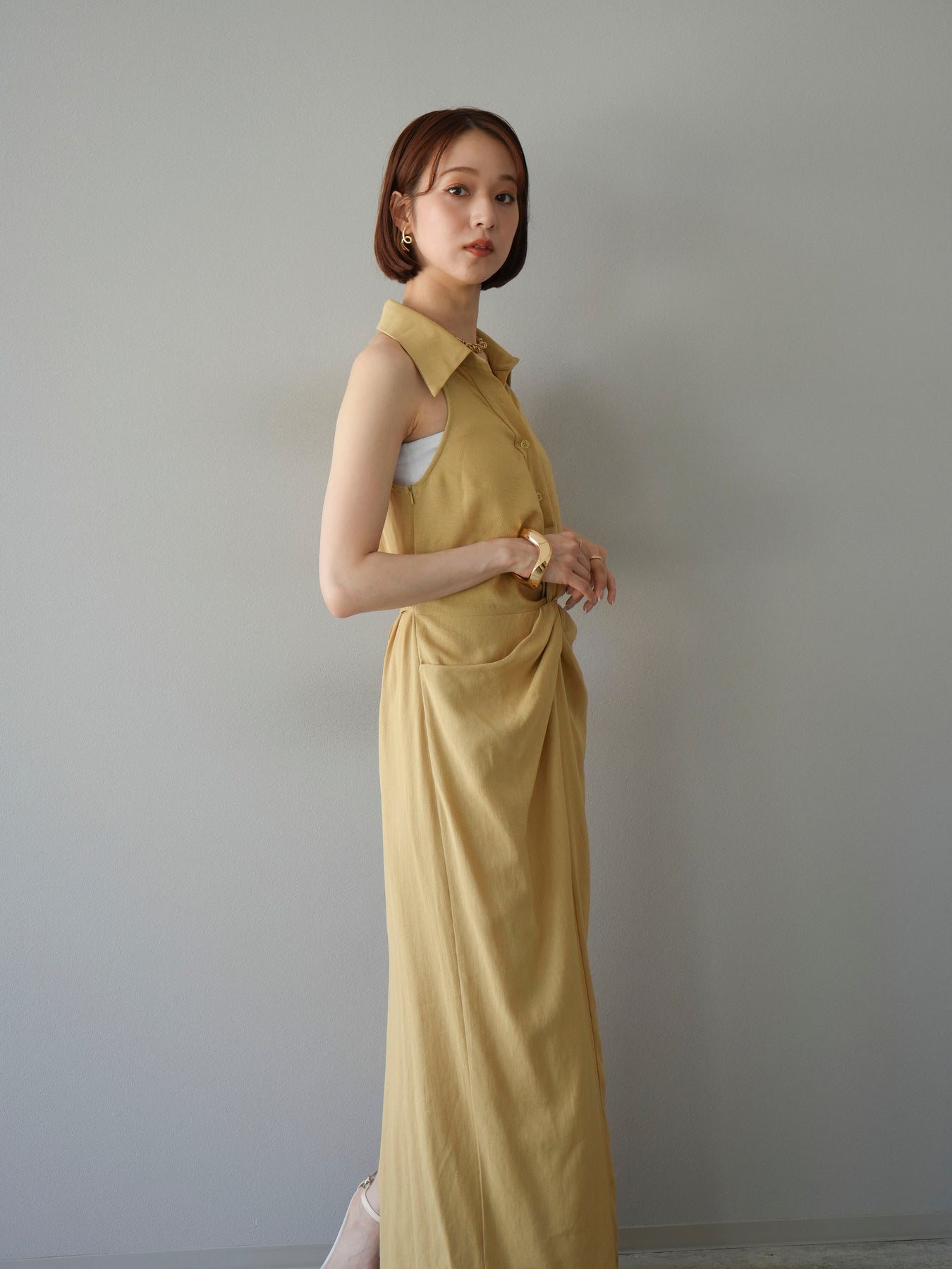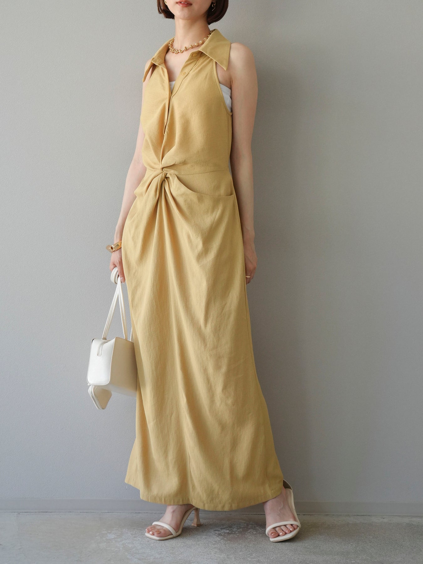 シャツカラーとホルターデザインを掛け合わせた、洗練された印象のノースリーブワンピース。 フロントウエストのツイストディテールが、立体感のある美しいシルエットを演出し、スタイルアップも叶えます。 リネンライクな軽やかな素材感で、涼しげな着心地と品のある表情を両立。 デイリーからリゾートまで、幅広いシーンに映える一着です。 ※ボトムス、キャミソール(インナー)以外の商品は一律でインナーは付属していません