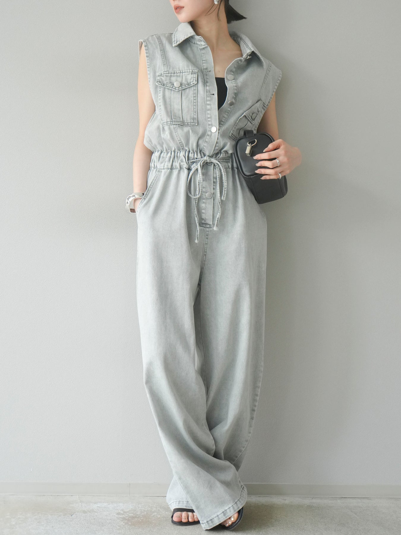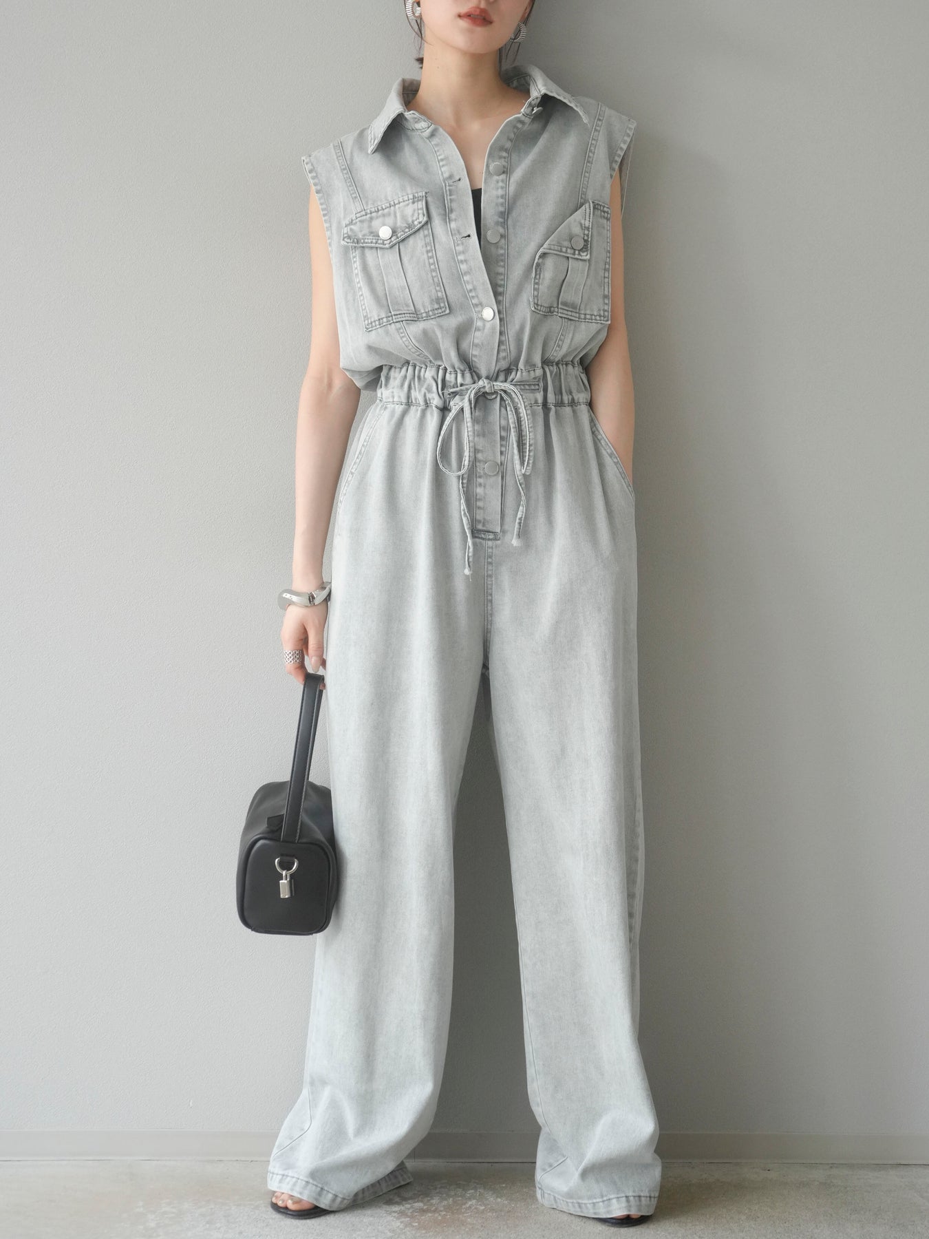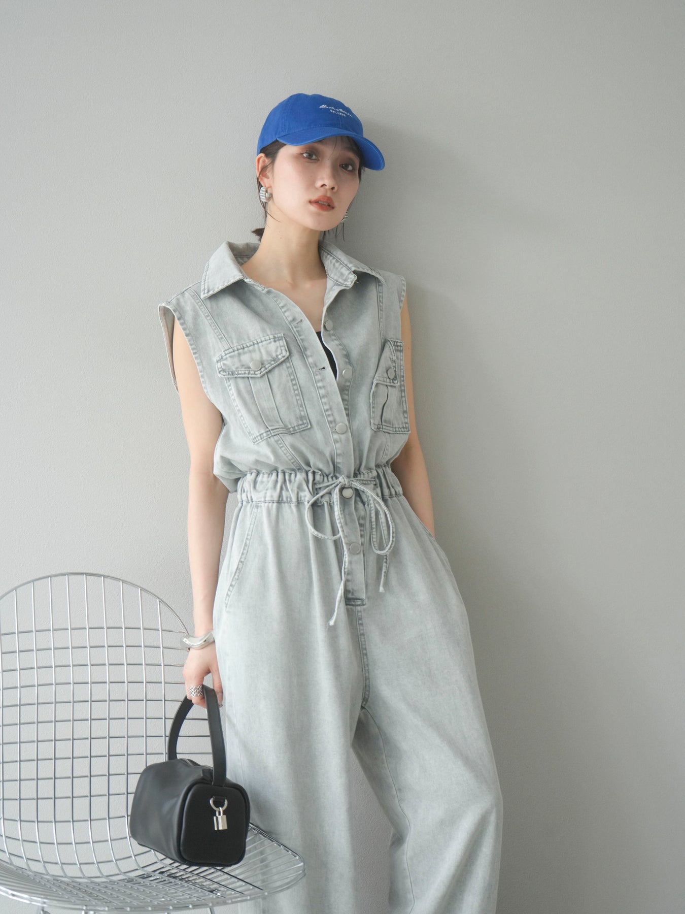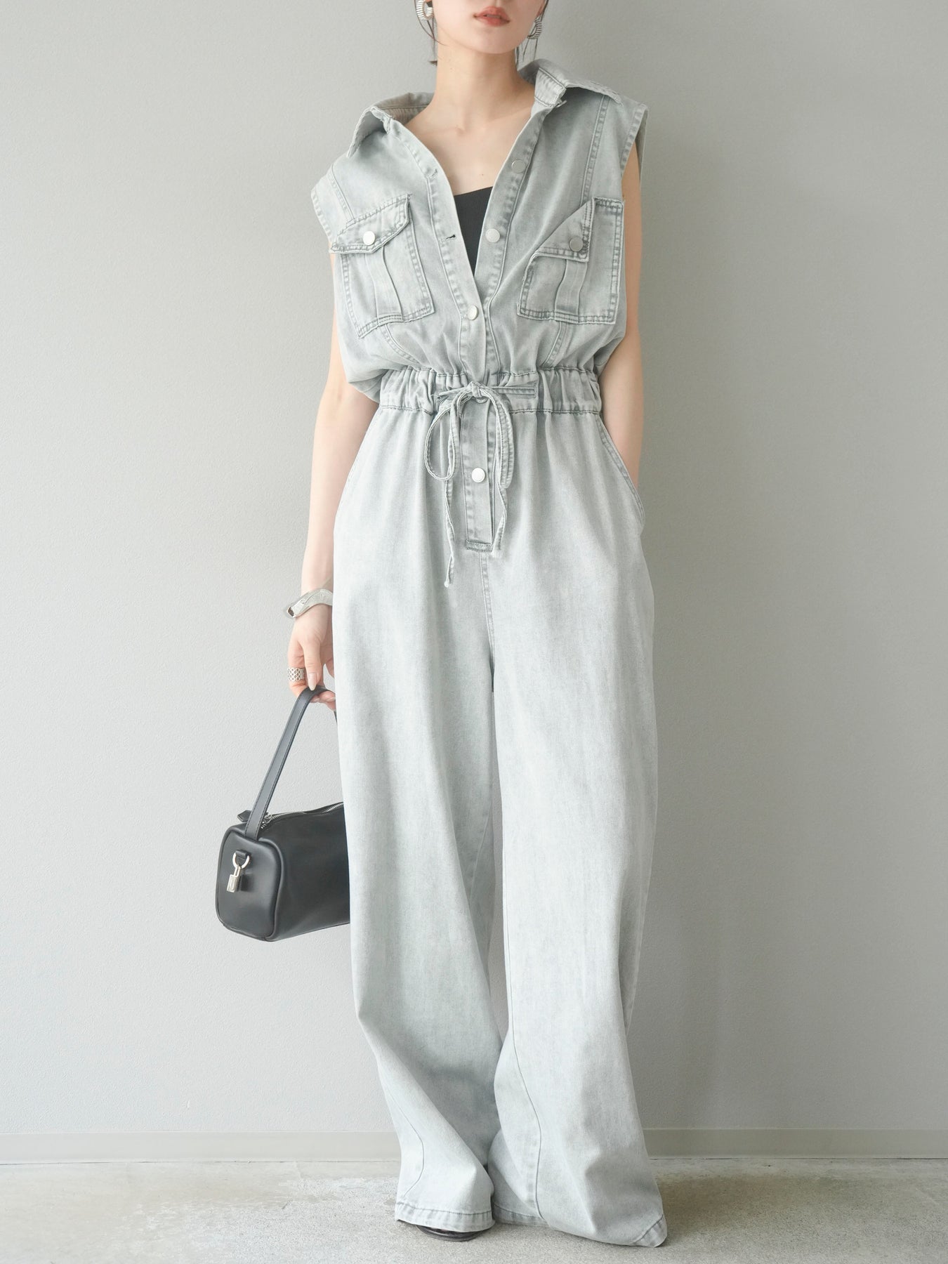 フロントのフラップポケットがアクセントになった、カジュアルさとスタイルアップ効果を両立するデニムオールインワン。ウエストはドローストリング仕様で、自分好みのシルエットに調整可能。すっきりとしたノースリーブとロング丈のバランスが、縦ラインを強調してスタイル良く見せてくれます。柔らかなデニム素材で着心地も良く、1枚でサマになる主役級アイテム。カジュアルにもキレイめにも着まわせる万能オールインワンです。 ※ボトムス、キャミソール(インナー)以外の商品は一律でインナーは付属していません。