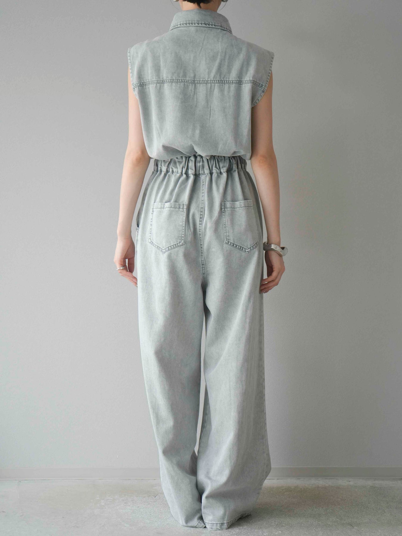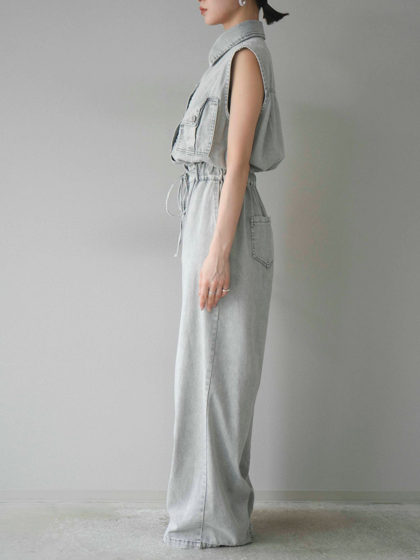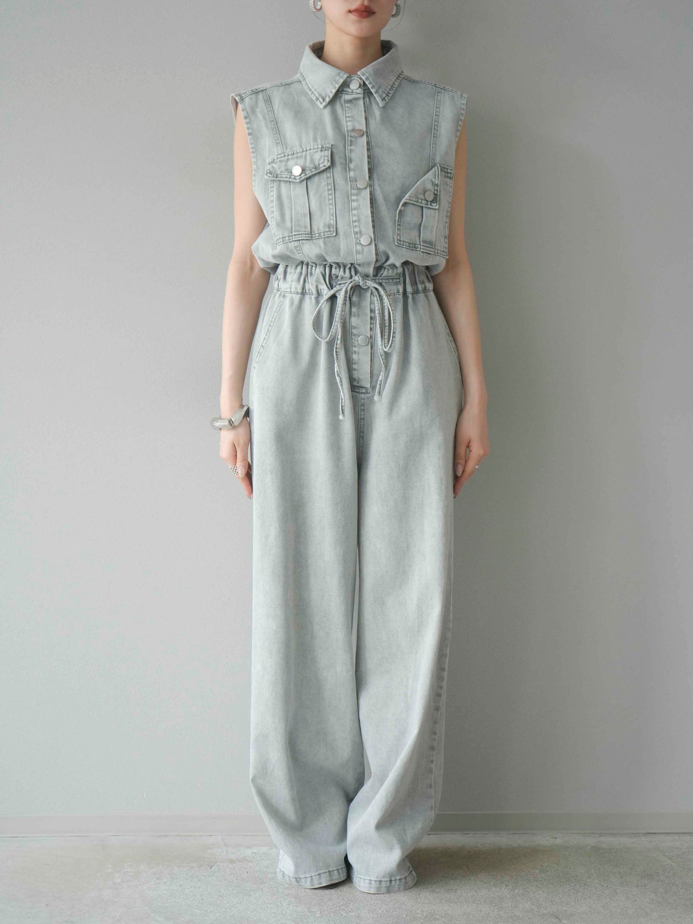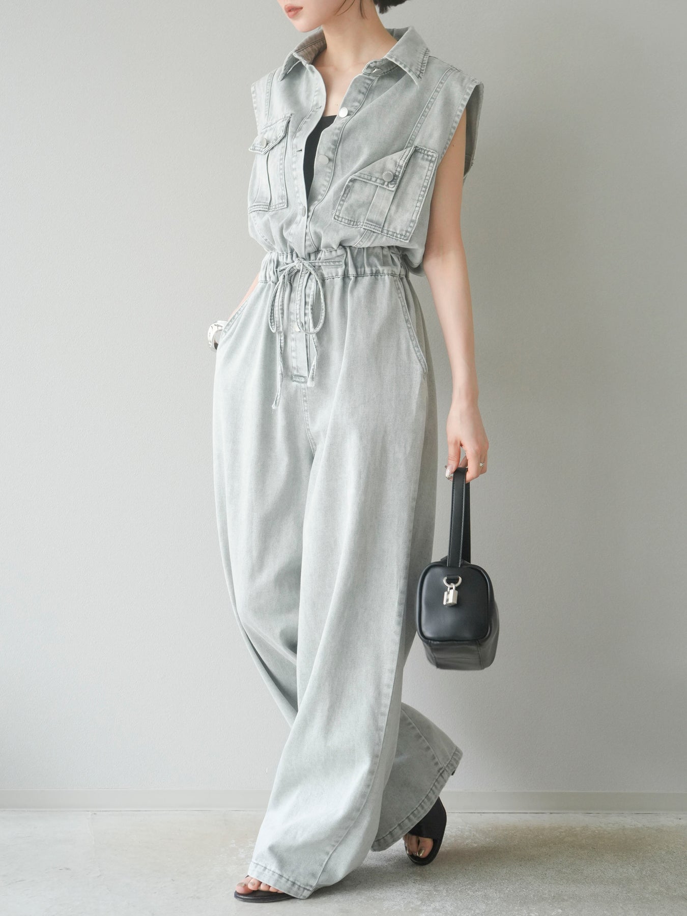 フロントのフラップポケットがアクセントになった、カジュアルさとスタイルアップ効果を両立するデニムオールインワン。ウエストはドローストリング仕様で、自分好みのシルエットに調整可能。すっきりとしたノースリーブとロング丈のバランスが、縦ラインを強調してスタイル良く見せてくれます。柔らかなデニム素材で着心地も良く、1枚でサマになる主役級アイテム。カジュアルにもキレイめにも着まわせる万能オールインワンです。 ※ボトムス、キャミソール(インナー)以外の商品は一律でインナーは付属していません。