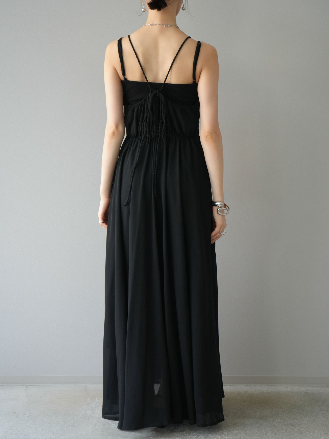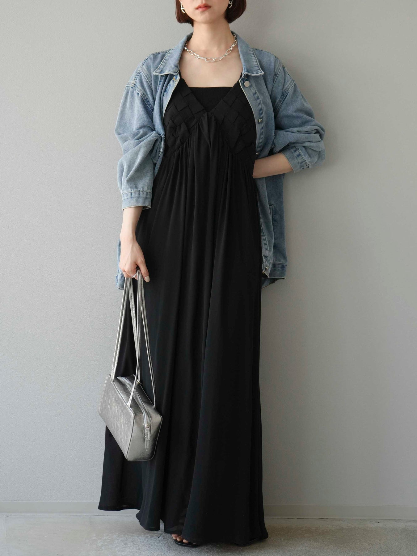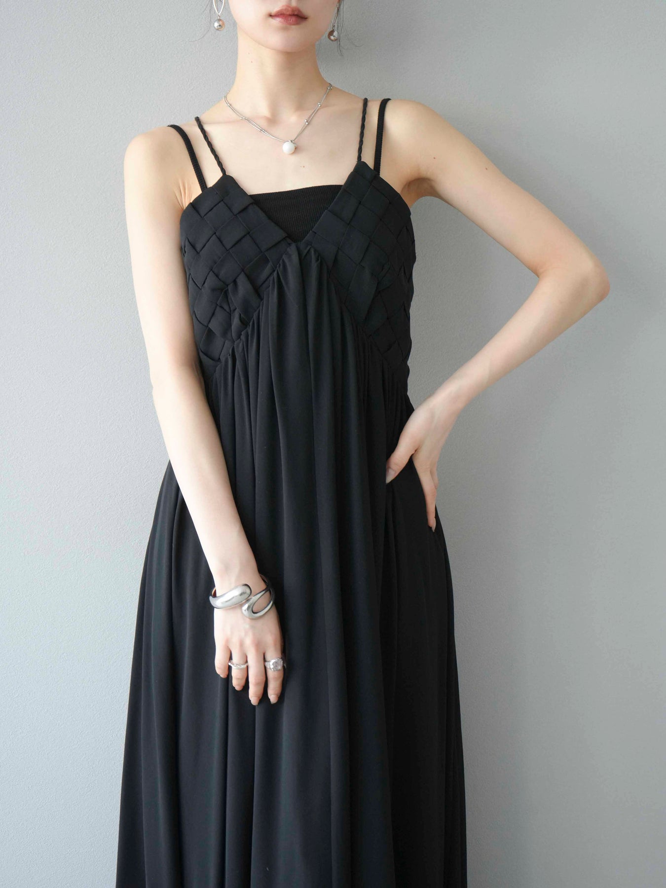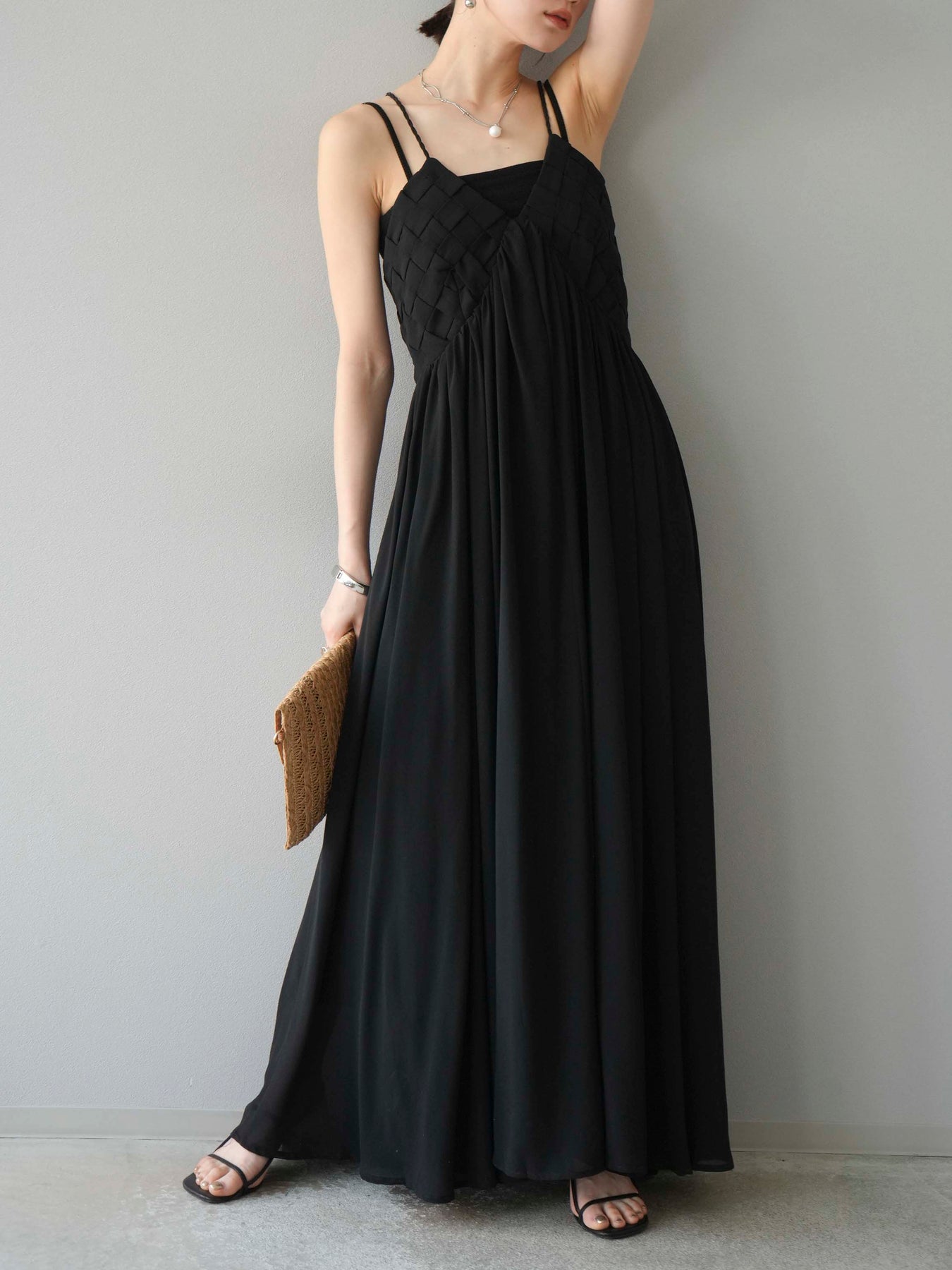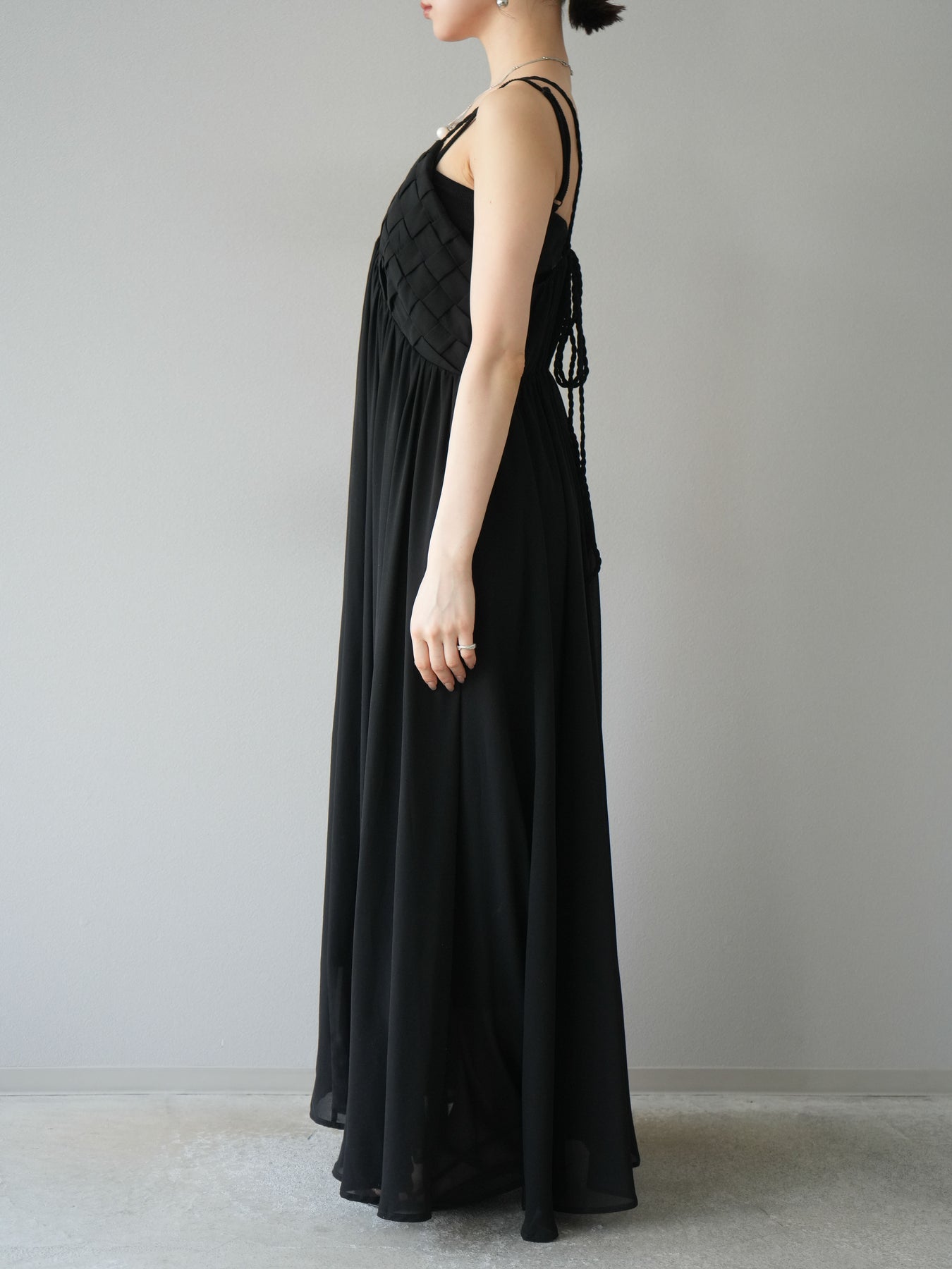 [予約]編み込みデザインシフォンワンピース/ブラック