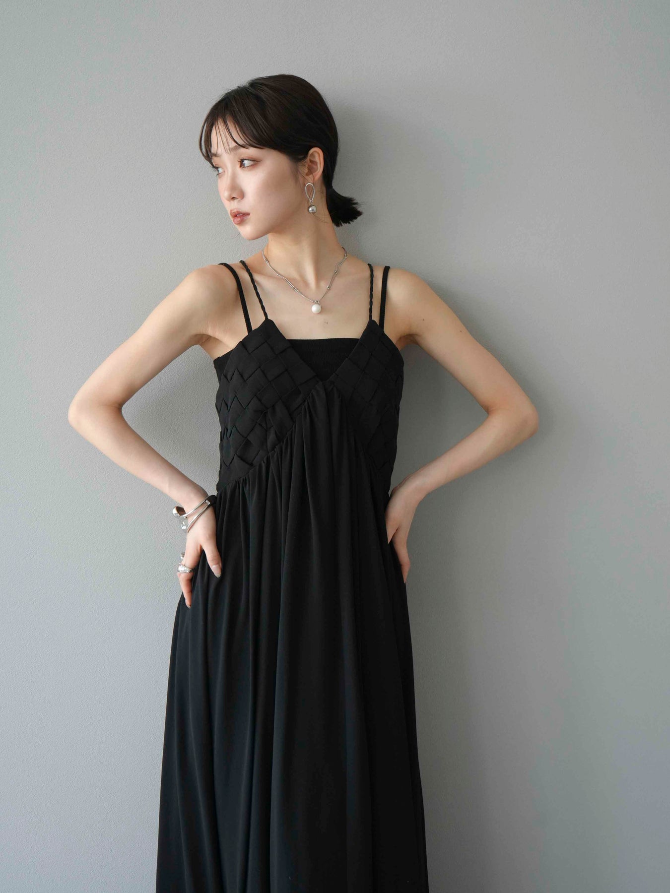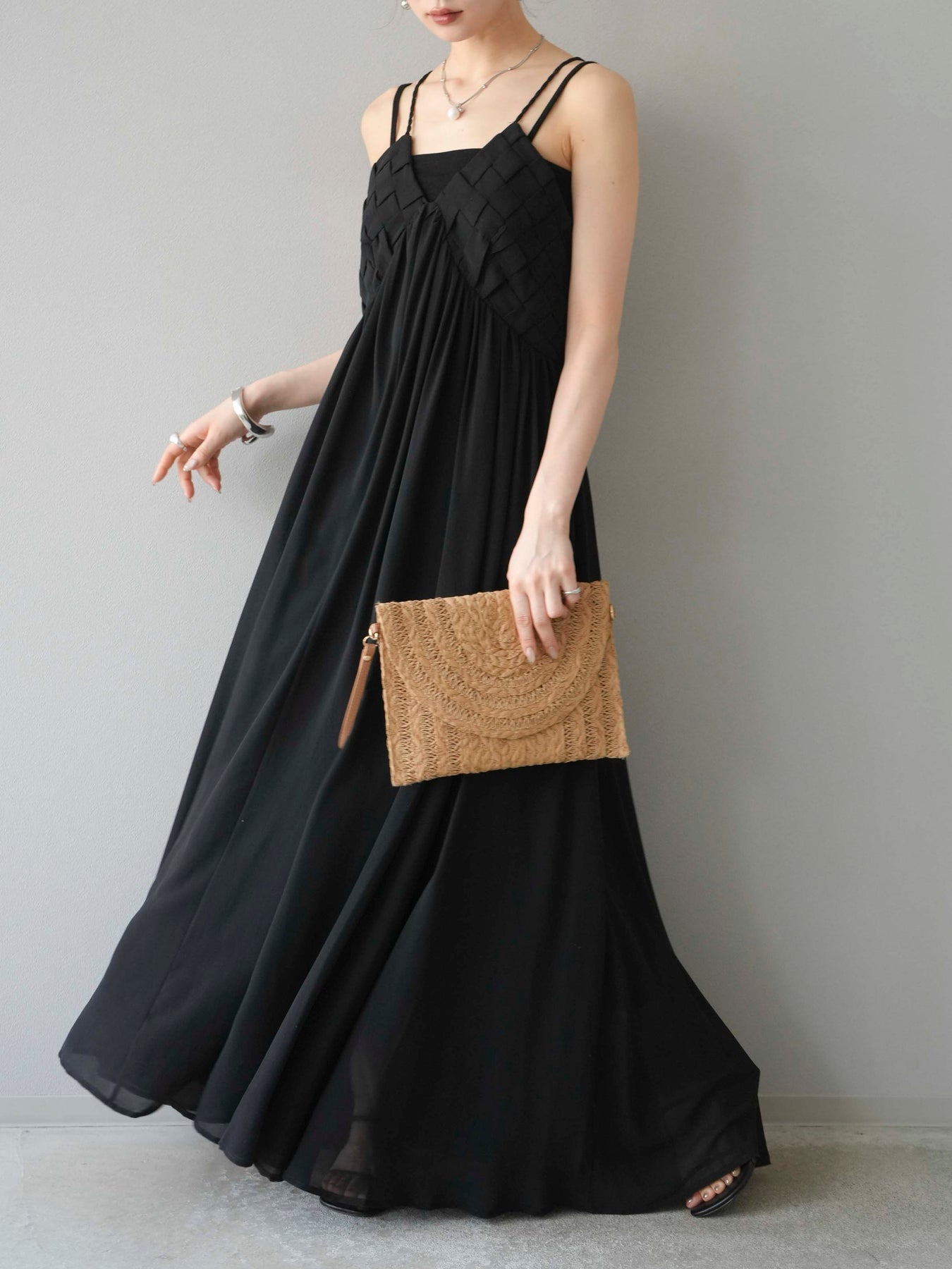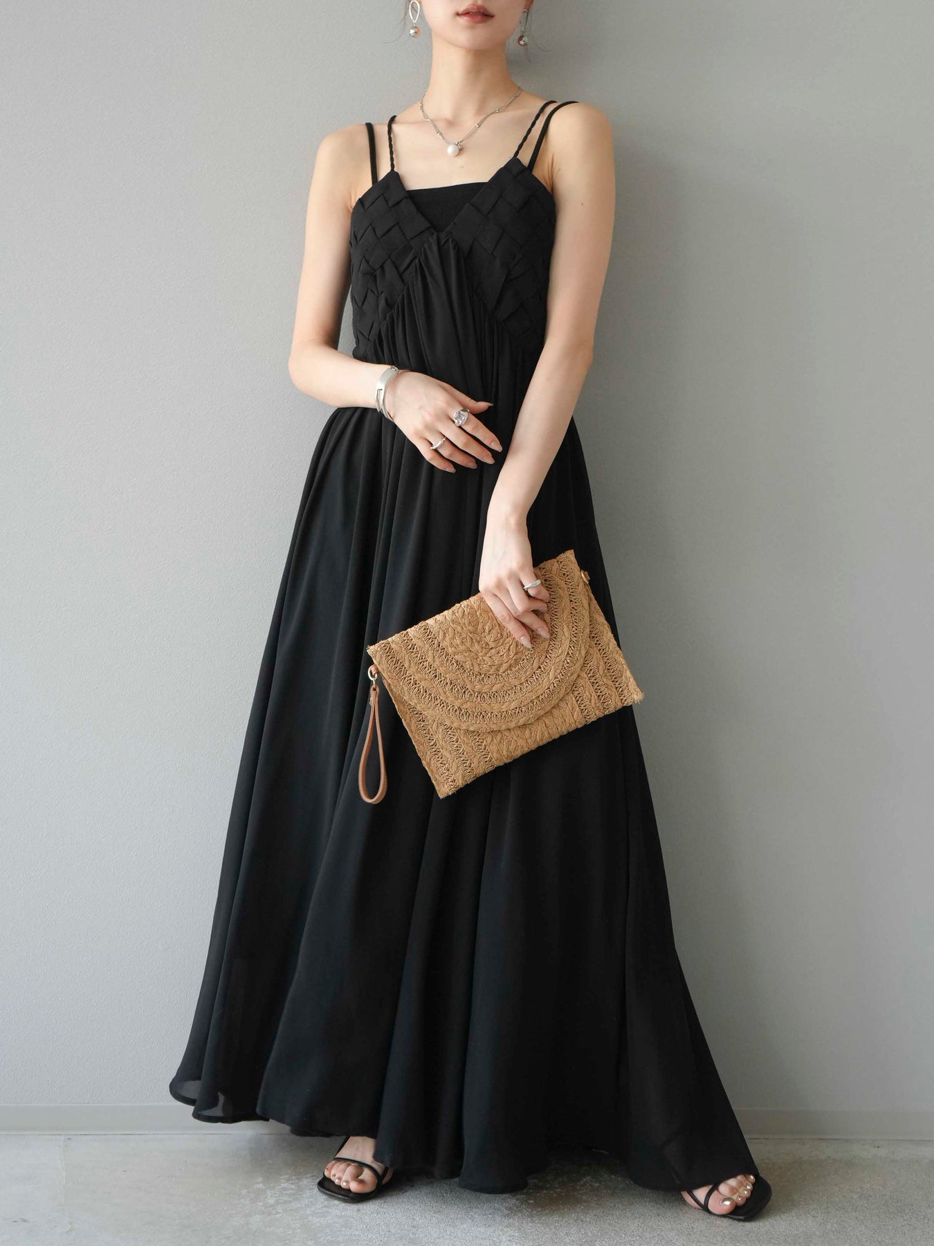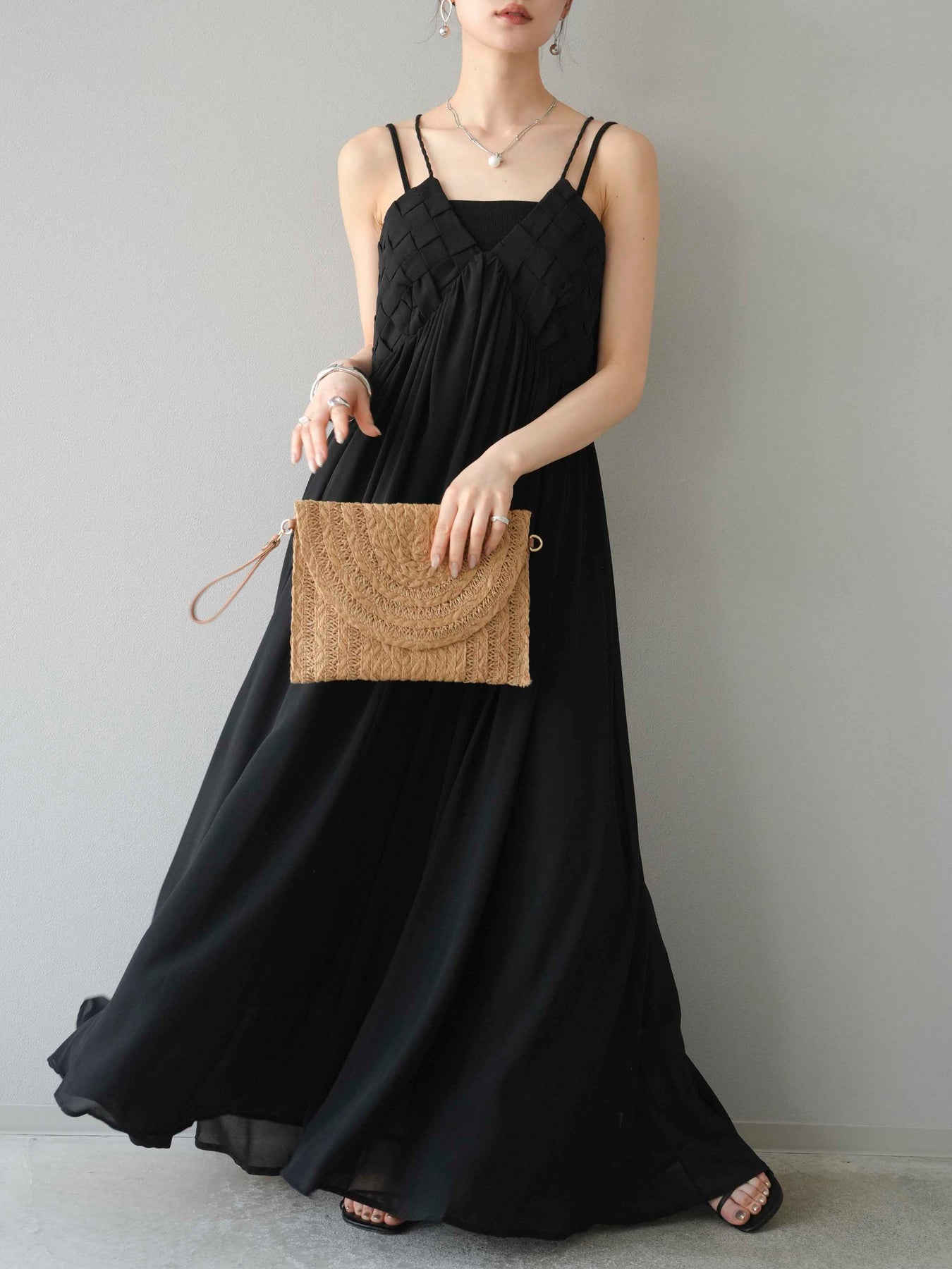 胸元にあしらわれた立体的な編み込みデザインが目を惹く、シフォン素材のキャミワンピース。軽やかで動きのあるフレアシルエットが、歩くたびにふんわりと揺れ、上品で女性らしい印象を演出します。華奢なダブルストラップと繊細なディテールが夏らしい抜け感をプラス。1枚で華やかなスタイリングが完成し、リゾートからデイリーまで幅広いシーンで活躍してくれるアイテムです。 ※ボトムス、キャミソール(インナー)以外の商品は一律でインナーは付属していません。