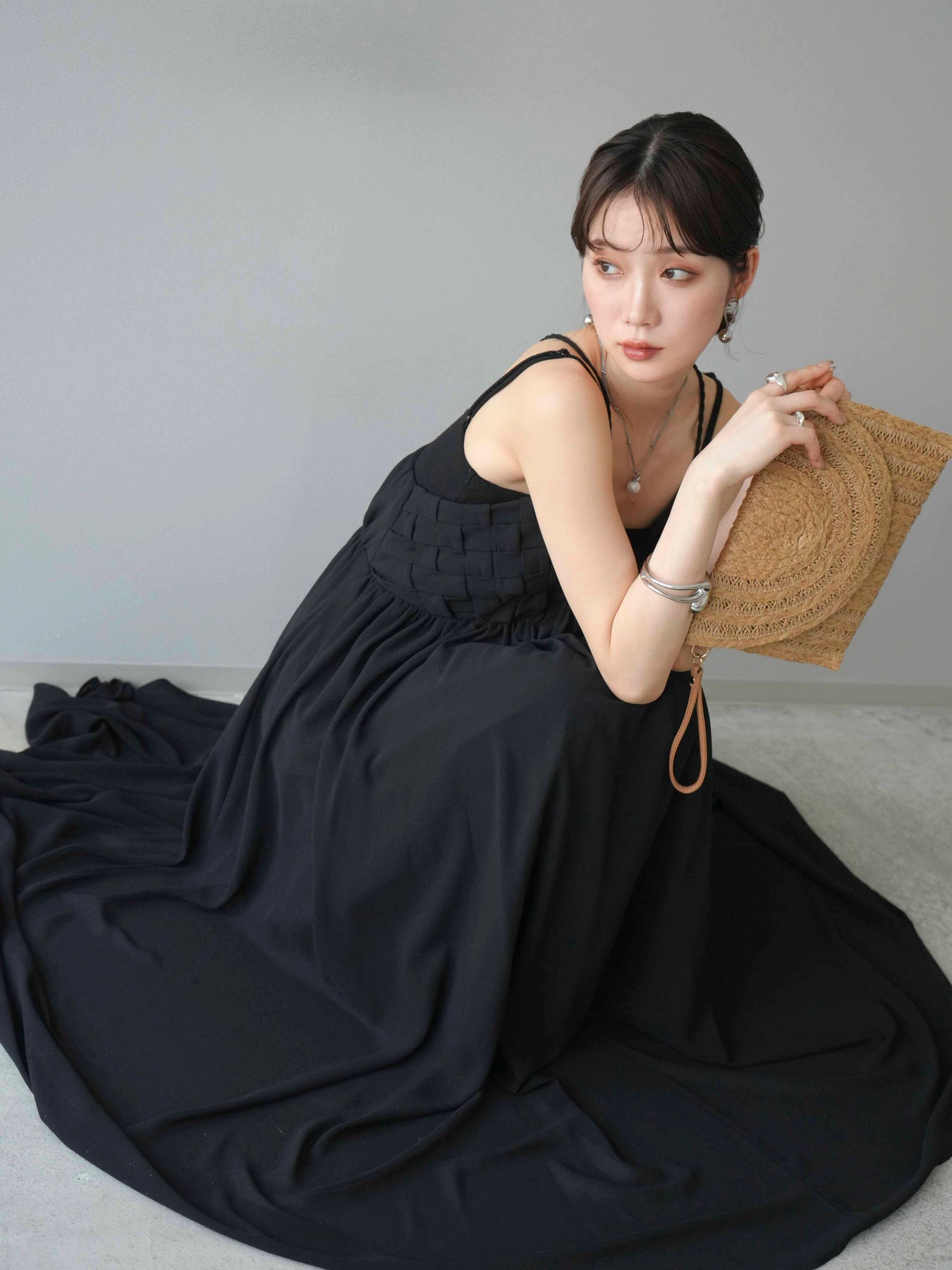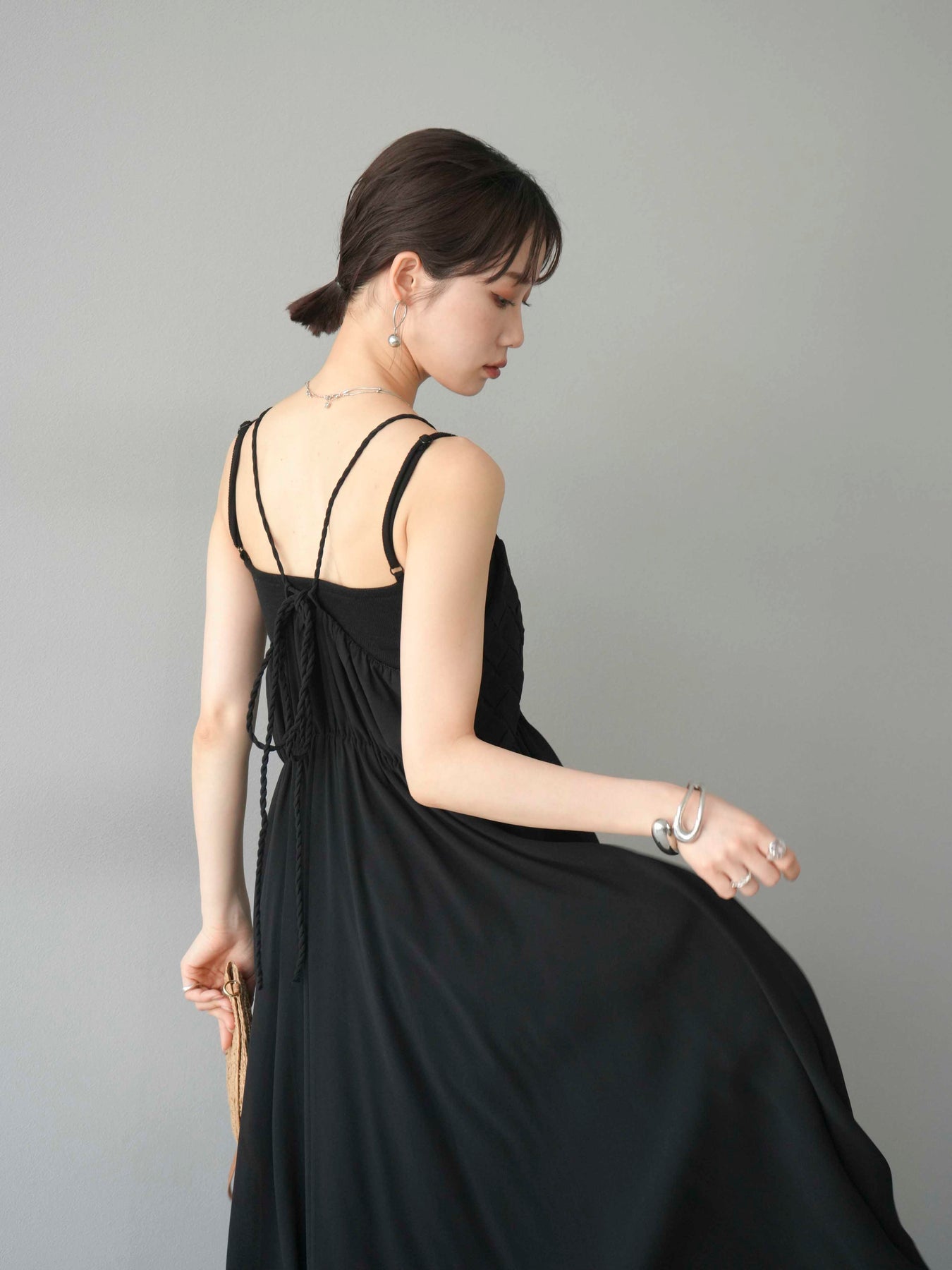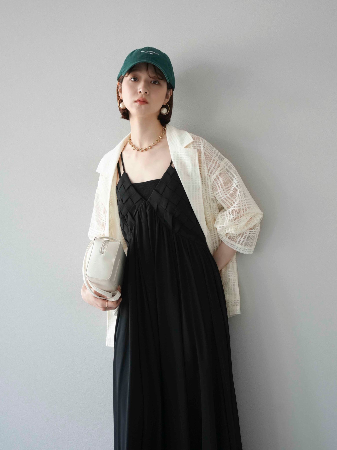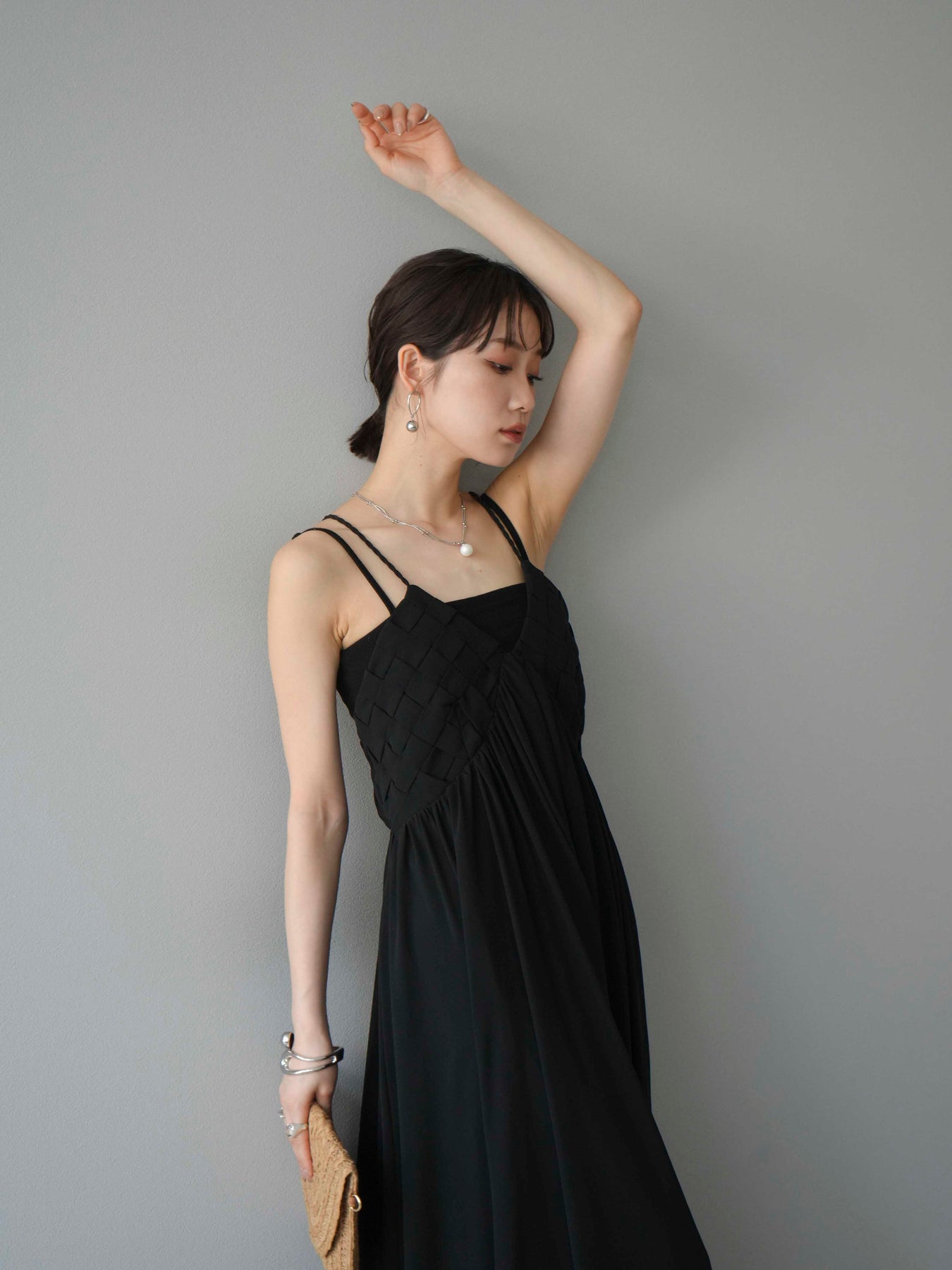 胸元にあしらわれた立体的な編み込みデザインが目を惹く、シフォン素材のキャミワンピース。軽やかで動きのあるフレアシルエットが、歩くたびにふんわりと揺れ、上品で女性らしい印象を演出します。華奢なダブルストラップと繊細なディテールが夏らしい抜け感をプラス。1枚で華やかなスタイリングが完成し、リゾートからデイリーまで幅広いシーンで活躍してくれるアイテムです。 ※ボトムス、キャミソール(インナー)以外の商品は一律でインナーは付属していません。