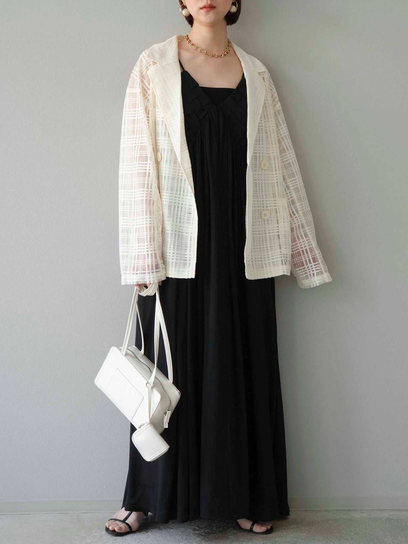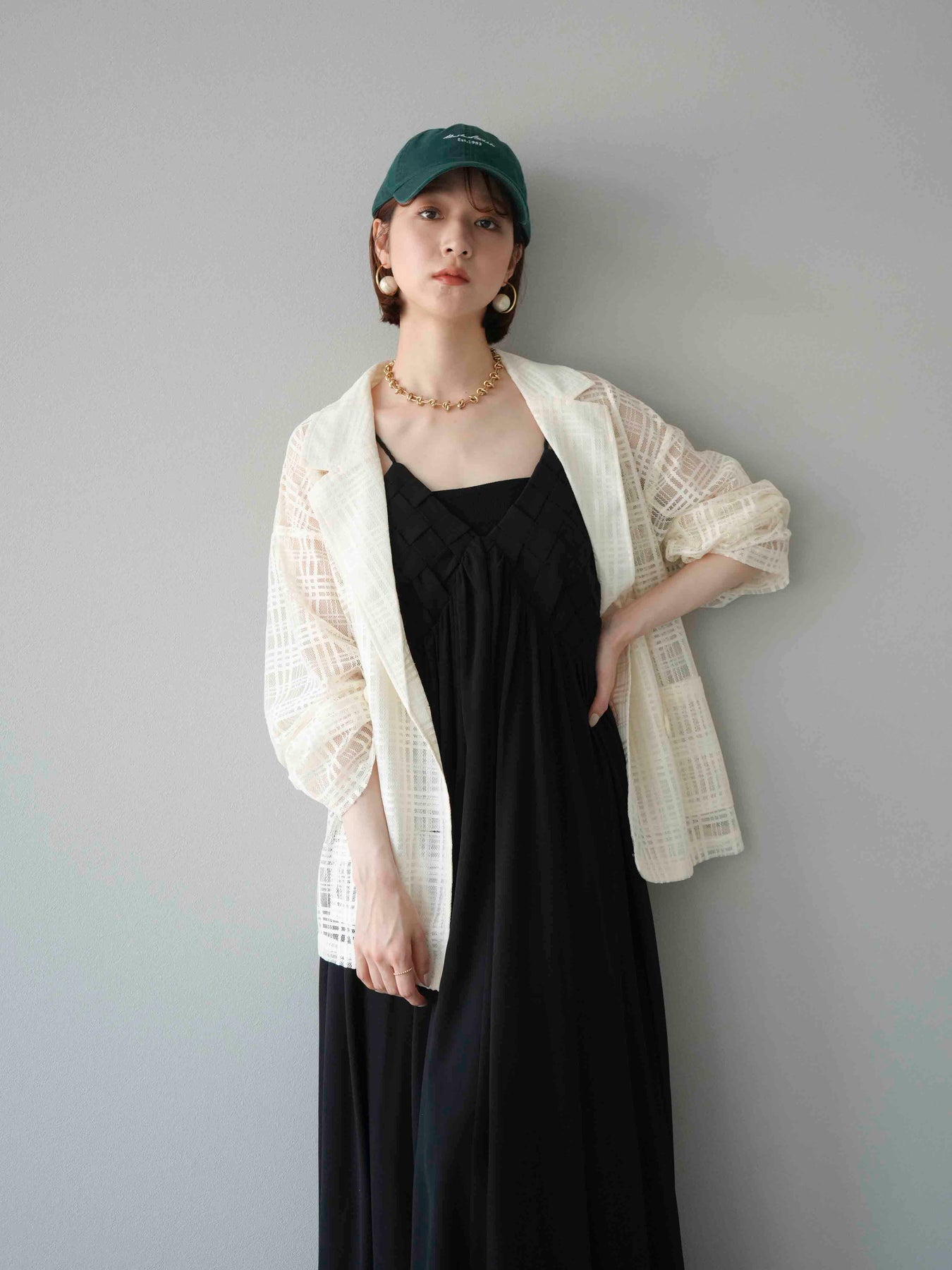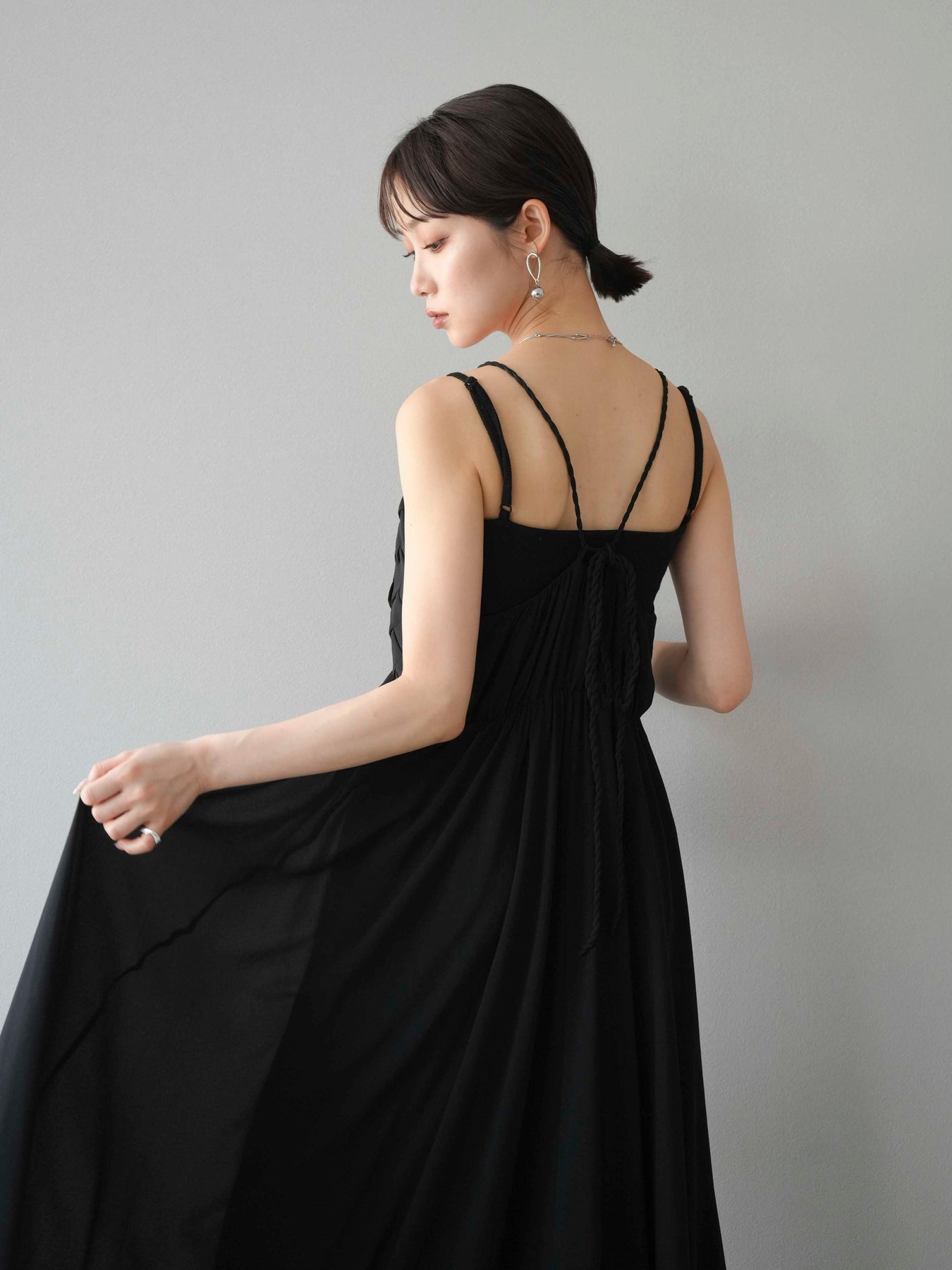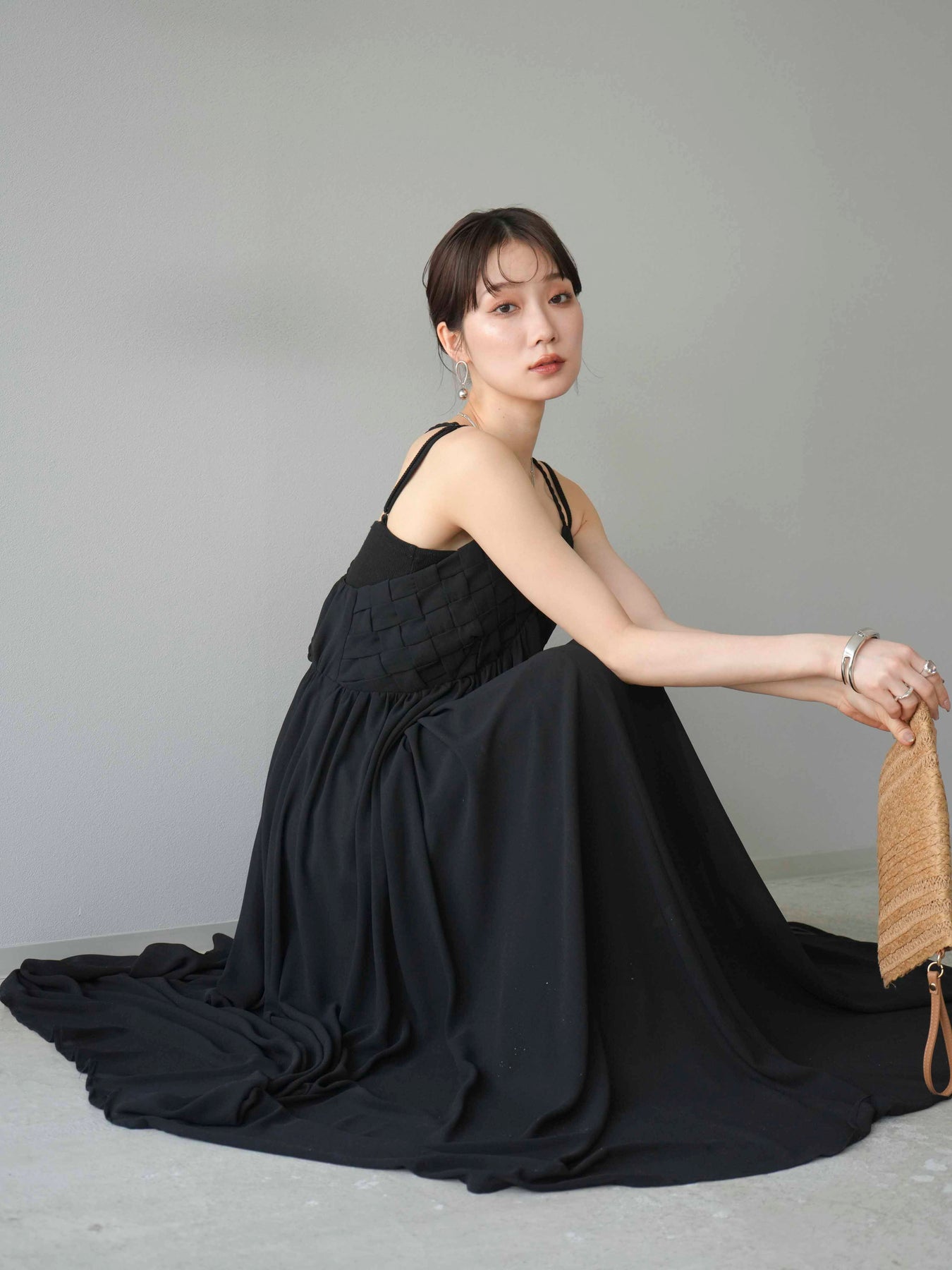 胸元にあしらわれた立体的な編み込みデザインが目を惹く、シフォン素材のキャミワンピース。軽やかで動きのあるフレアシルエットが、歩くたびにふんわりと揺れ、上品で女性らしい印象を演出します。華奢なダブルストラップと繊細なディテールが夏らしい抜け感をプラス。1枚で華やかなスタイリングが完成し、リゾートからデイリーまで幅広いシーンで活躍してくれるアイテムです。 ※ボトムス、キャミソール(インナー)以外の商品は一律でインナーは付属していません。