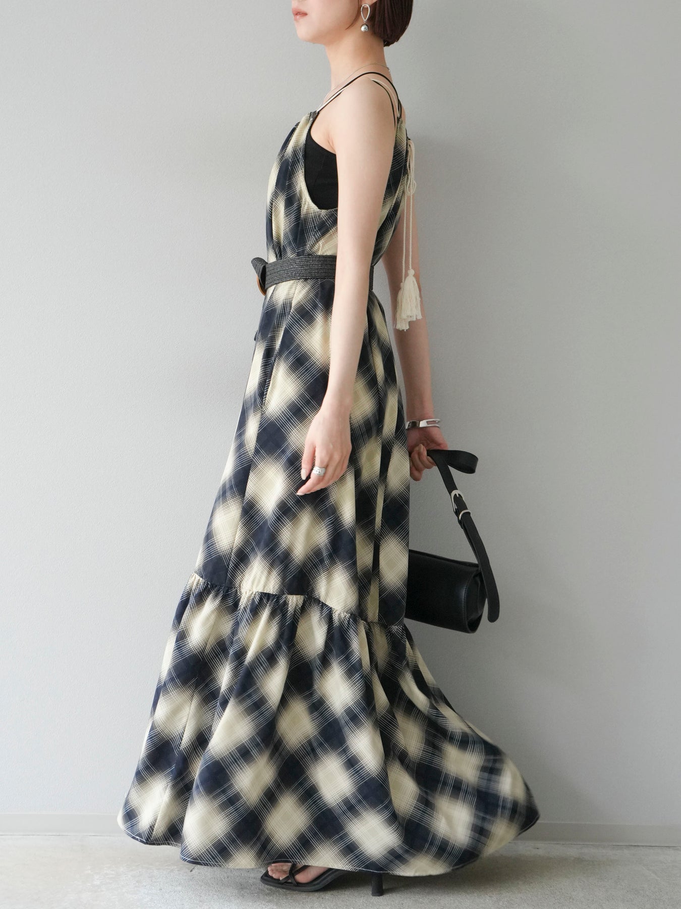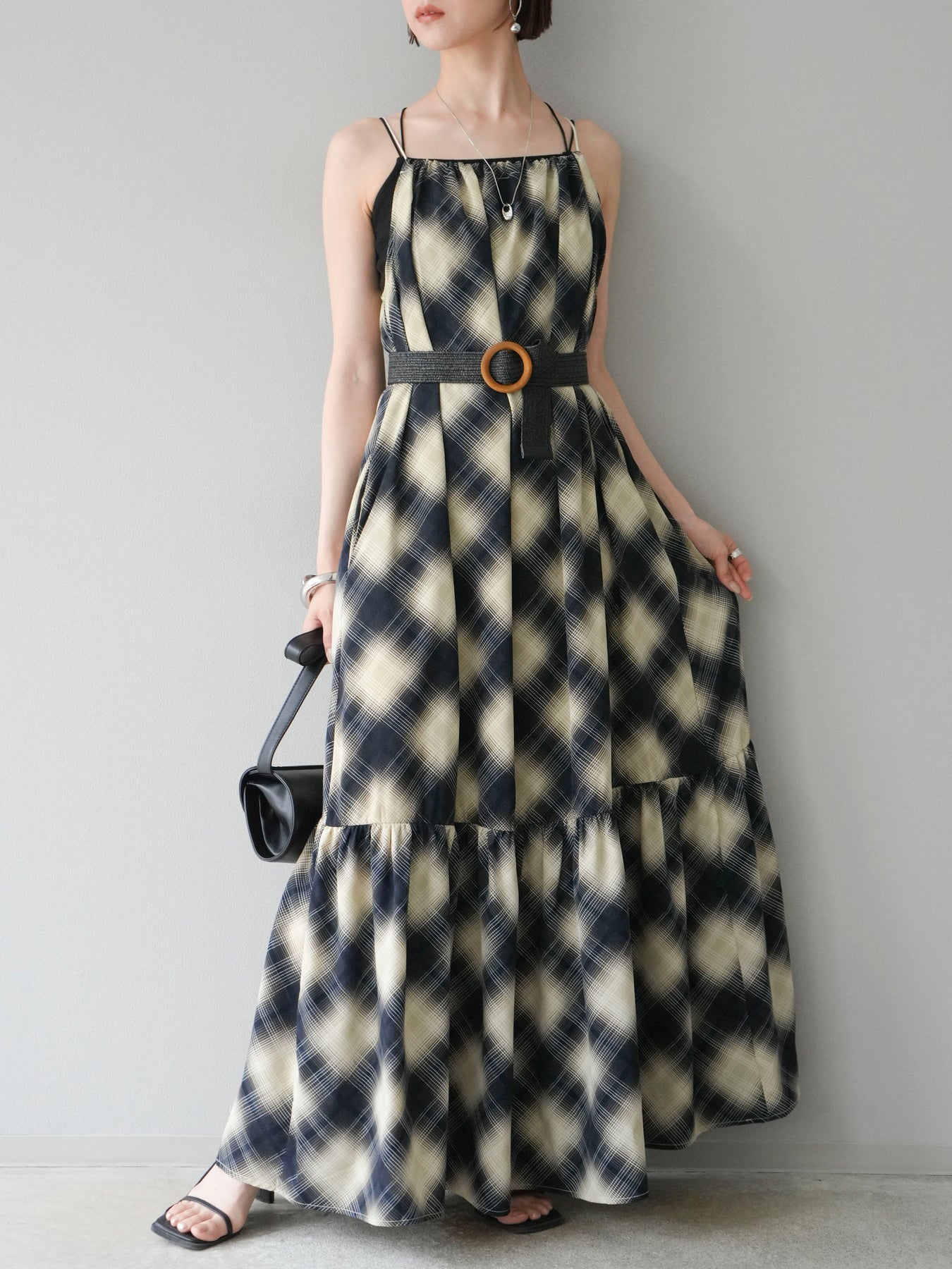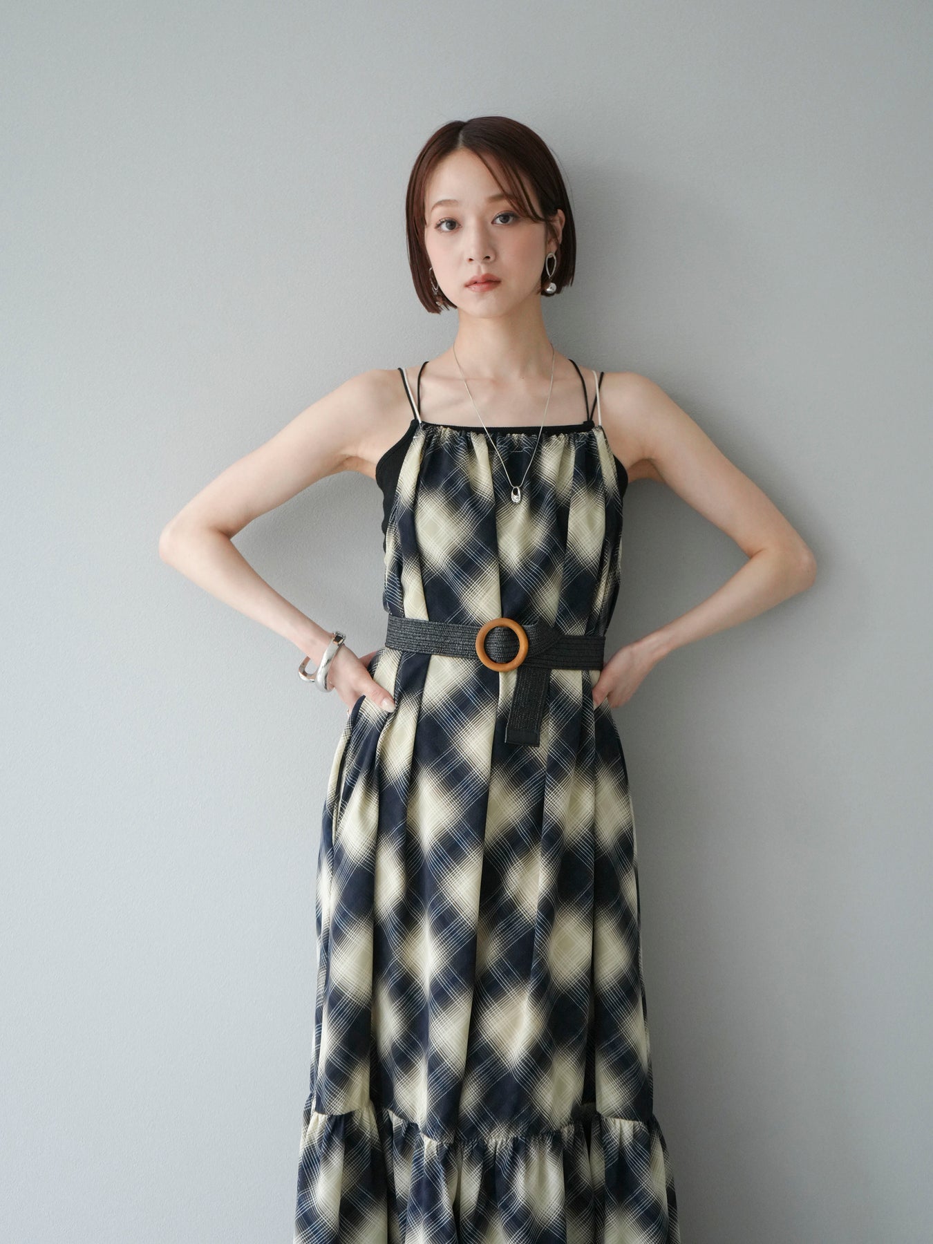 落ち着いた配色のチェック柄が魅力的な、ベルト付きノースリーブワンピース。繊細なショルダーストラップと、胸元ギャザーがフェミニンな印象を演出。ウエストマークできるベルト付きで、スタイルアップ効果も◎。裾にかけてふわっと広がるティアードシルエットが、軽やかな動きをプラスします。1枚でさらりと着るだけで、華やかで季節感のあるスタイルが完成するアイテムです。 ※ボトムス、キャミソール(インナー)以外の商品は一律でインナーは付属していません。