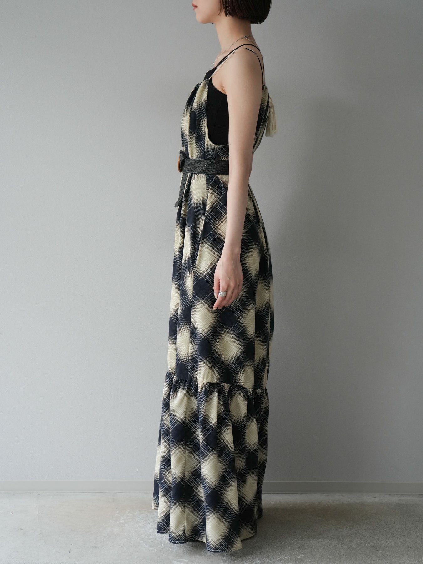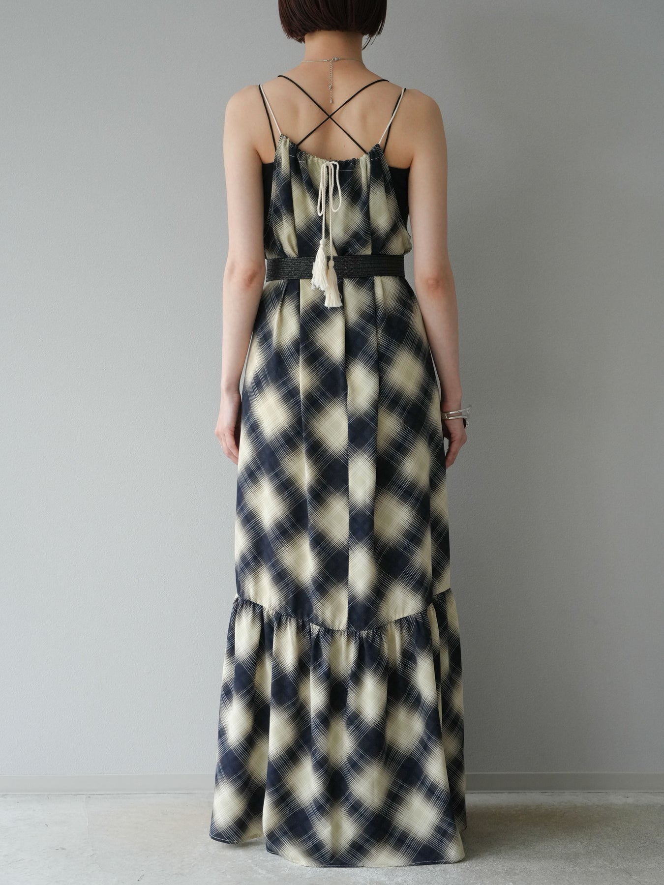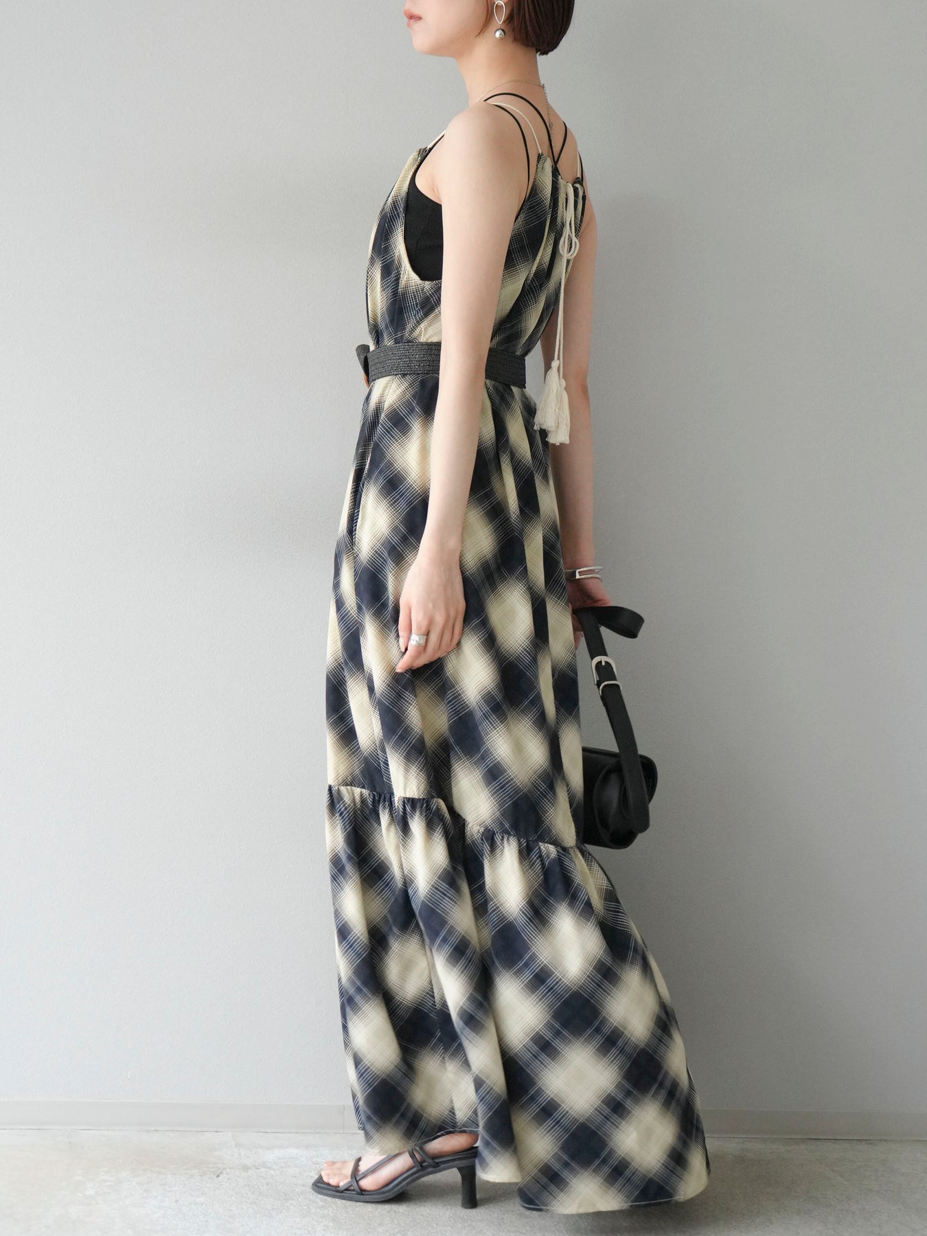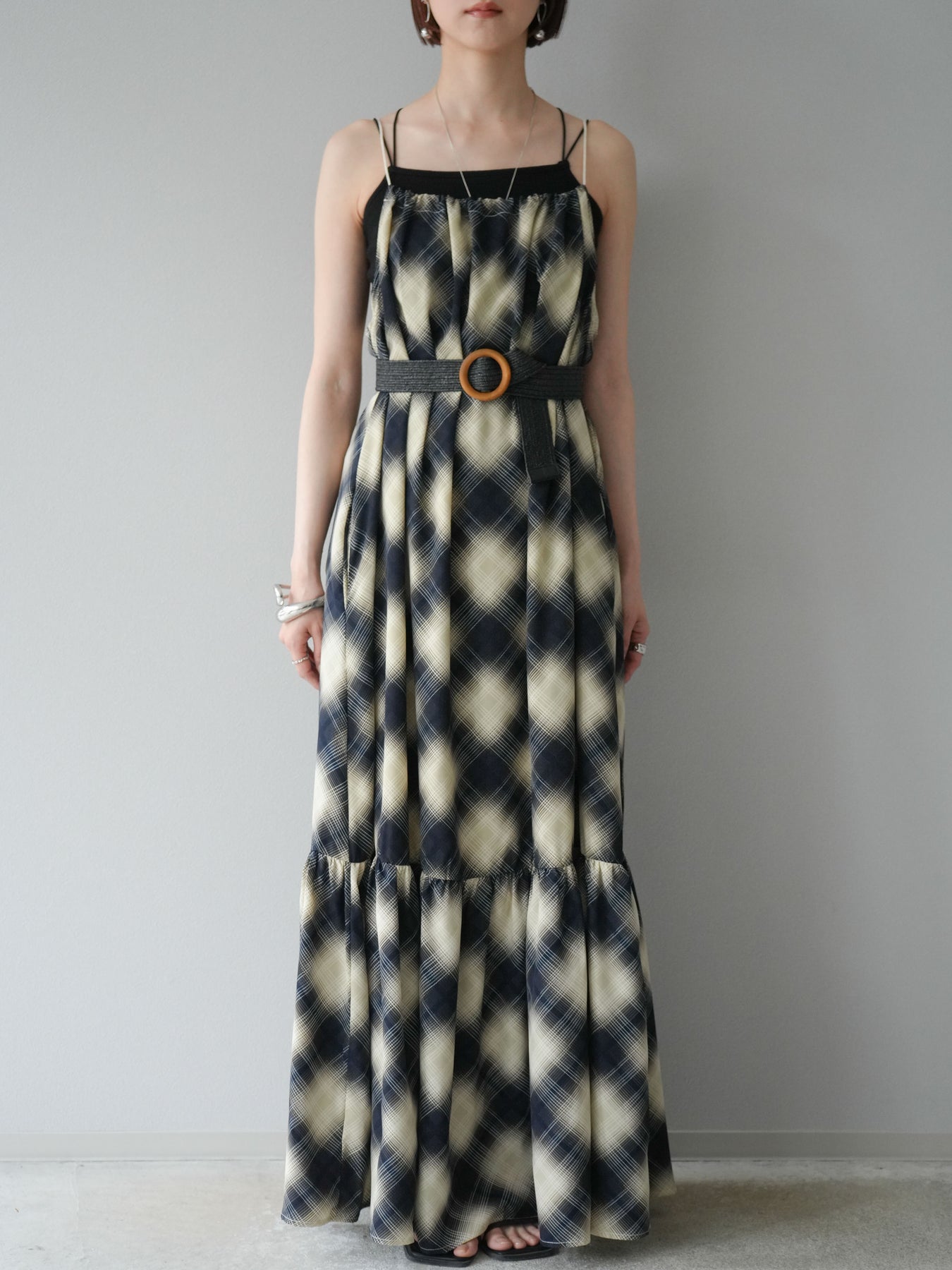 落ち着いた配色のチェック柄が魅力的な、ベルト付きノースリーブワンピース。繊細なショルダーストラップと、胸元ギャザーがフェミニンな印象を演出。ウエストマークできるベルト付きで、スタイルアップ効果も◎。裾にかけてふわっと広がるティアードシルエットが、軽やかな動きをプラスします。1枚でさらりと着るだけで、華やかで季節感のあるスタイルが完成するアイテムです。 ※ボトムス、キャミソール(インナー)以外の商品は一律でインナーは付属していません。