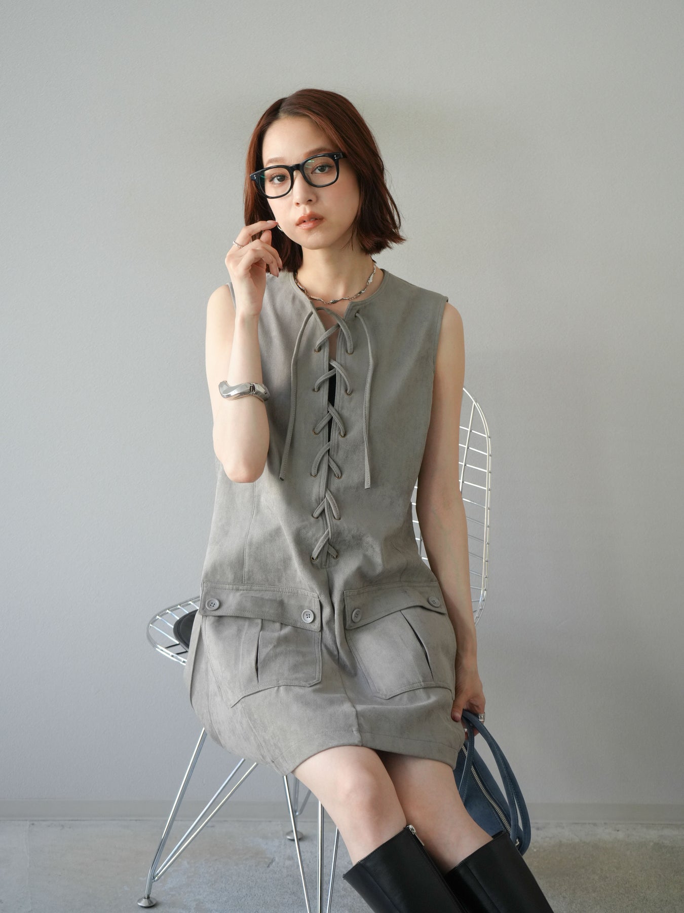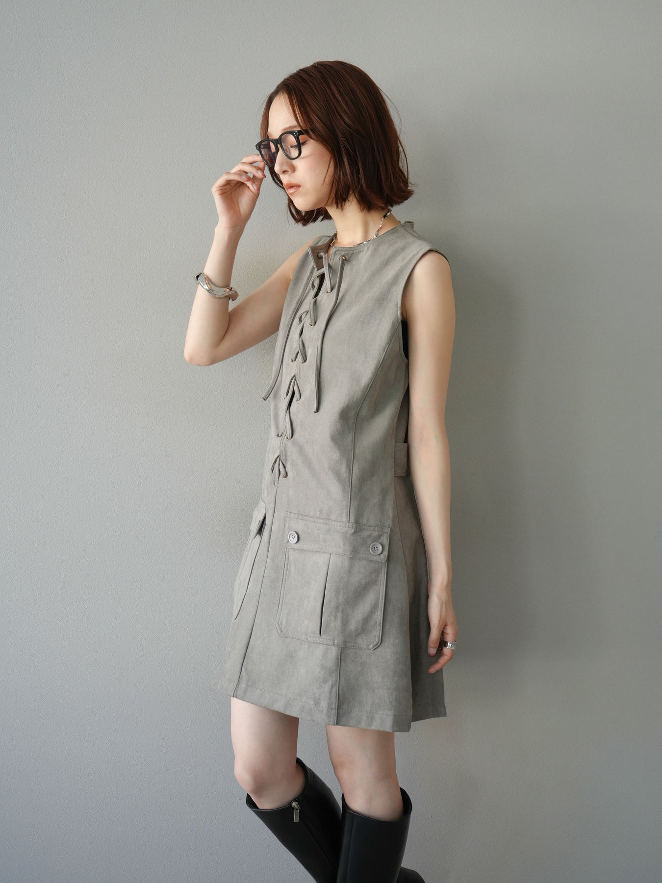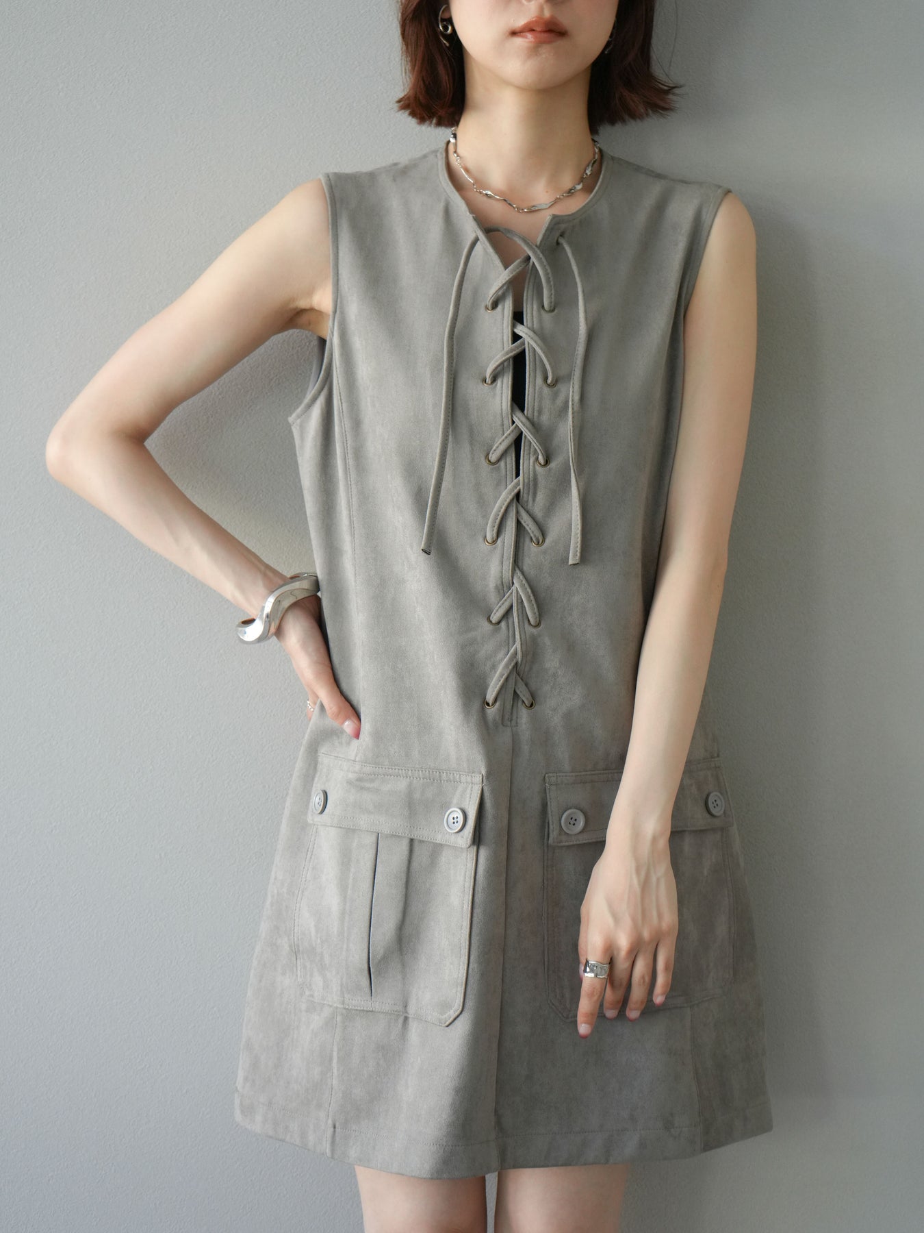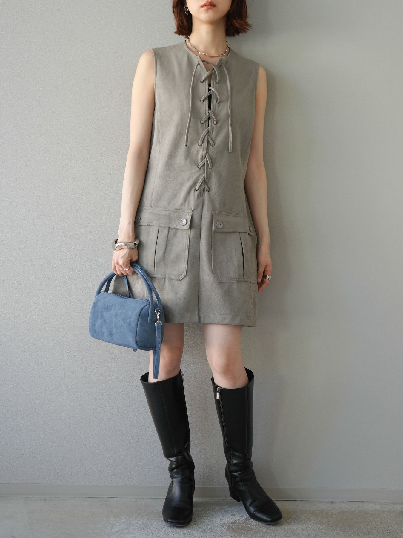 スエード調素材の上品な風合いに、フロントのレースアップデザインが目を惹くミニワンピース。程よく身体に沿うシルエットで女性らしさを演出しつつ、大きめのフラップポケットがカジュアルなアクセントを加えています。シンプルながら存在感があり、1枚で主役として着こなせるアイテム。インナーとのレイヤードや、ブーツ合わせでシーズンムードを高めるスタイリングもおすすめです。 ※ボトムス、キャミソール(インナー)以外の商品は一律でインナーは付属していません。