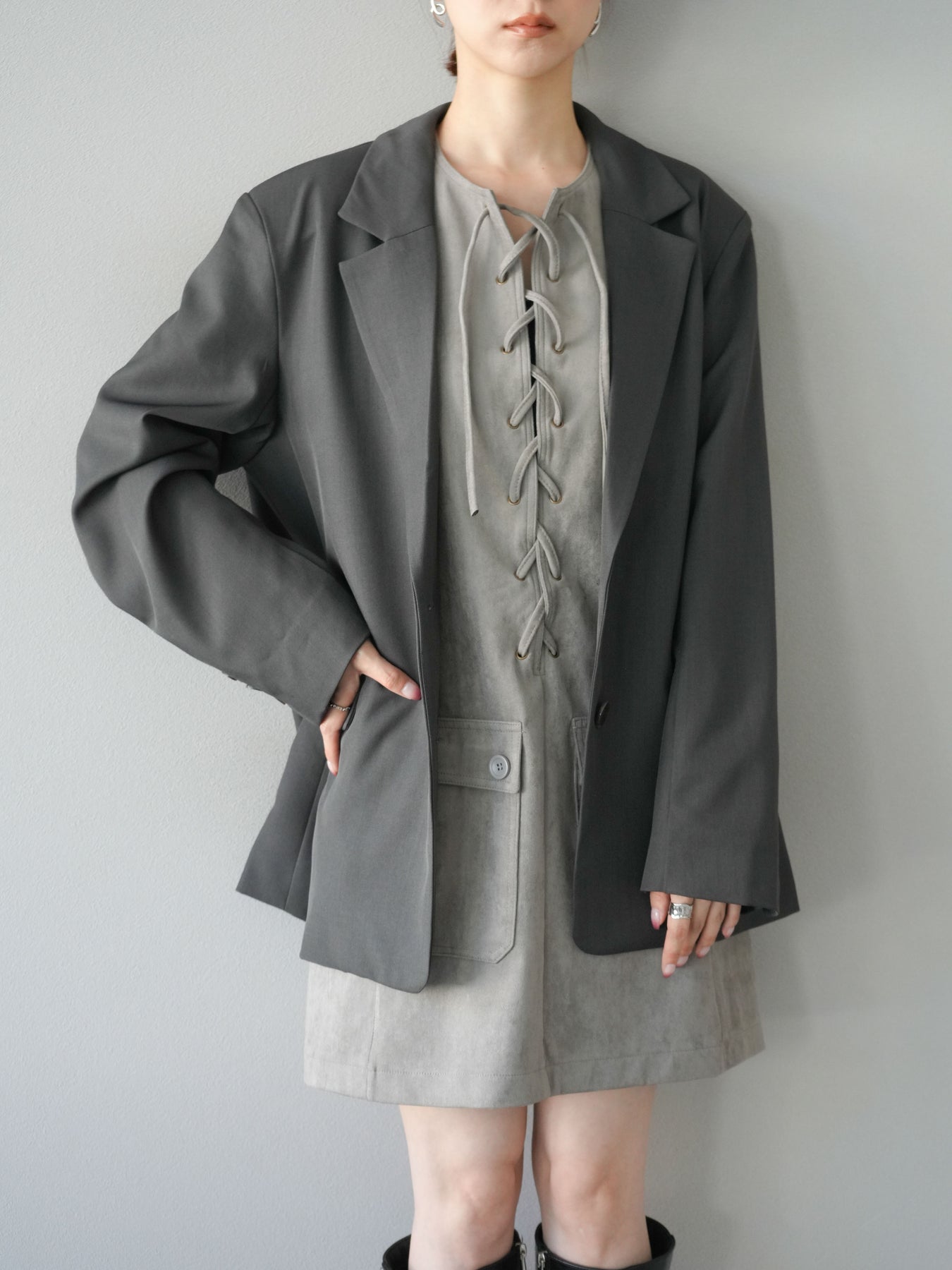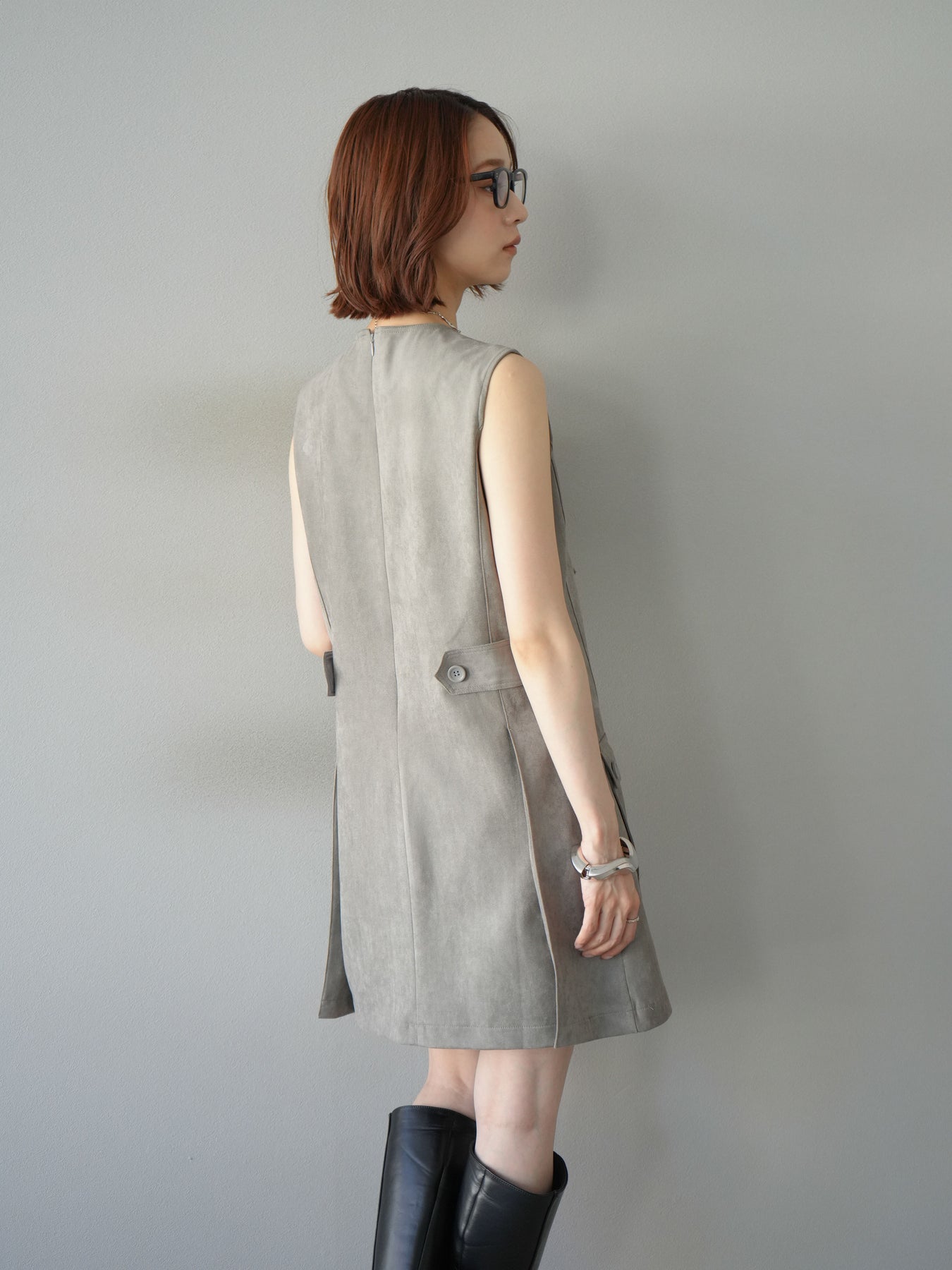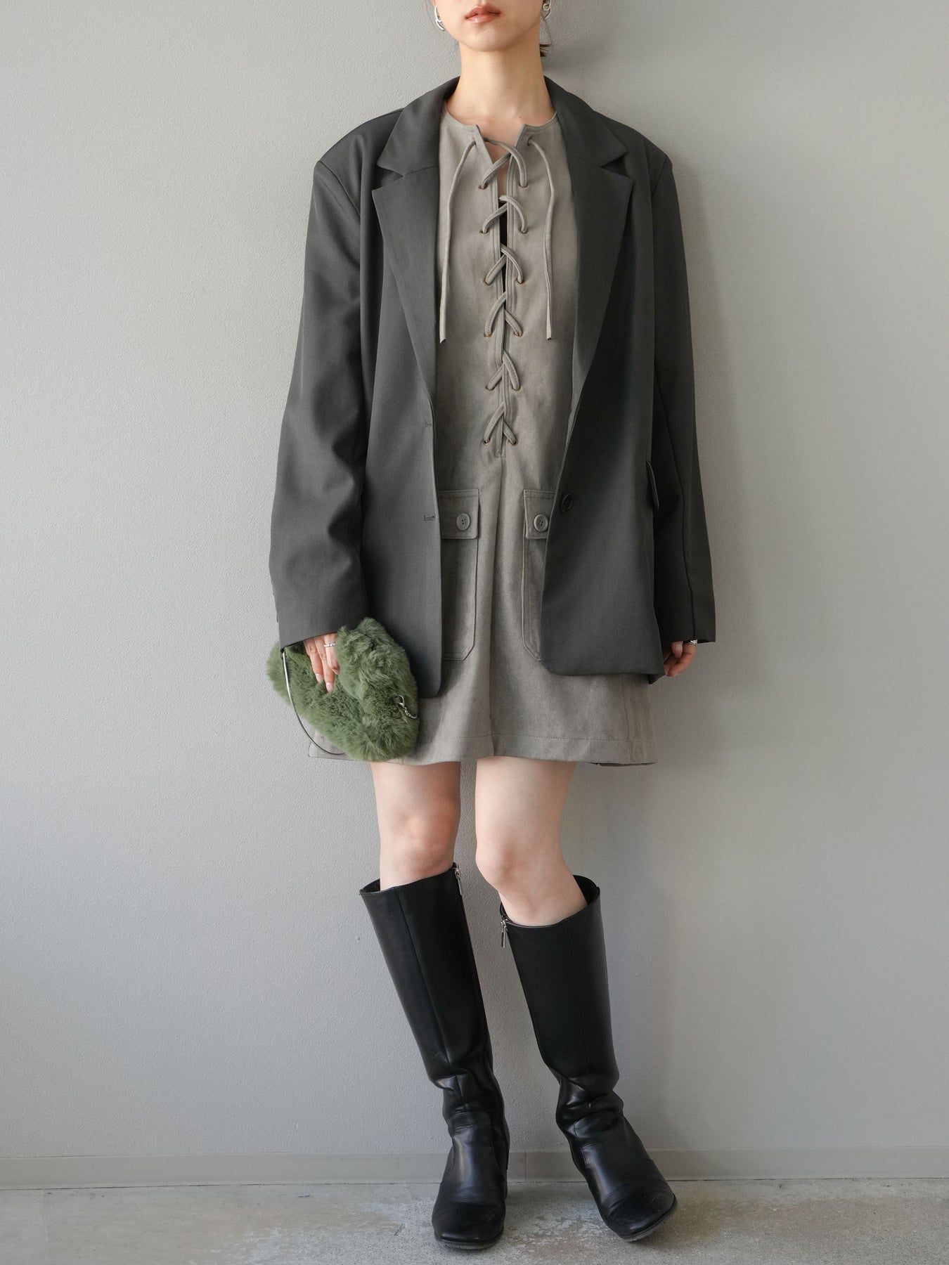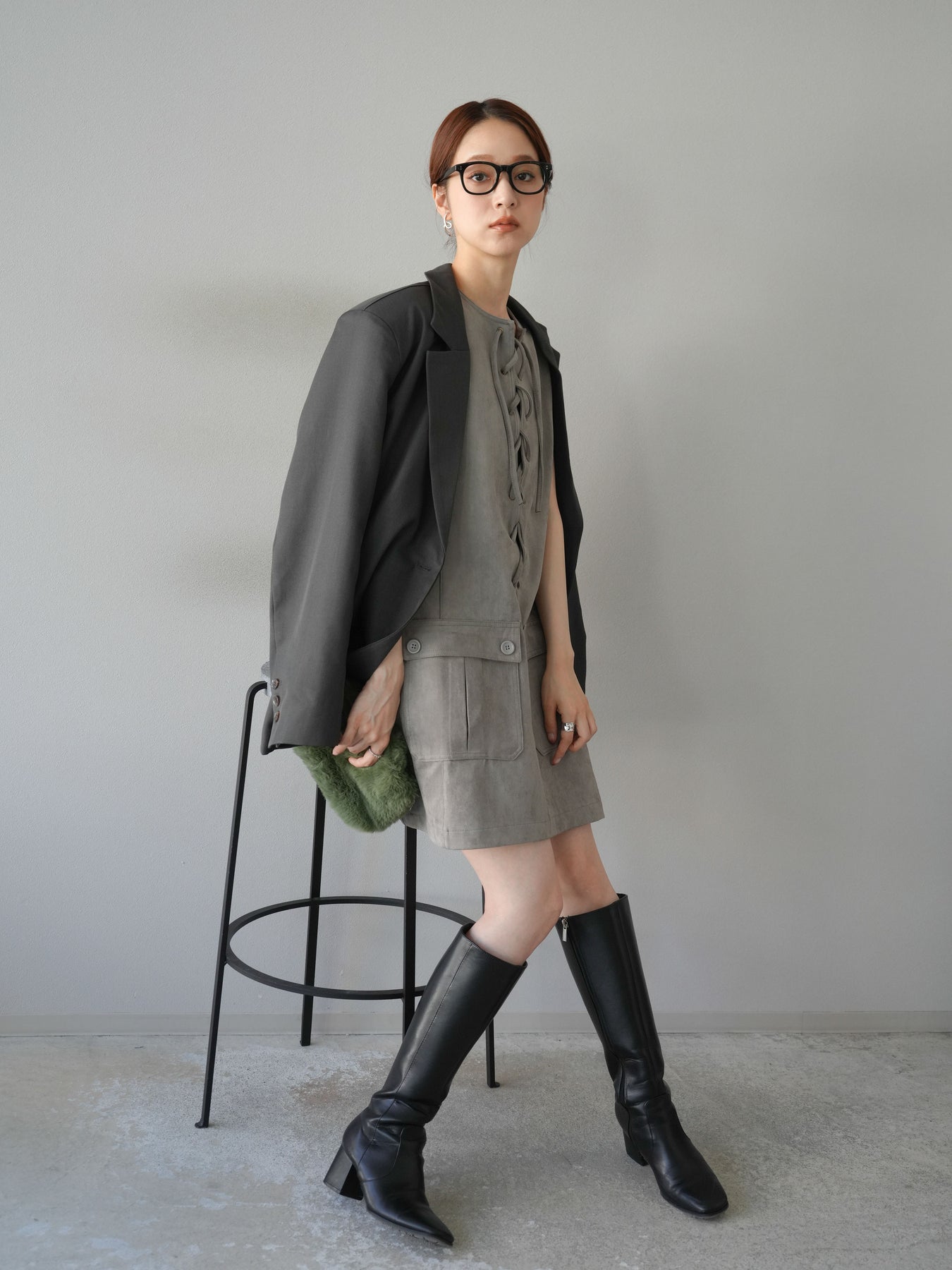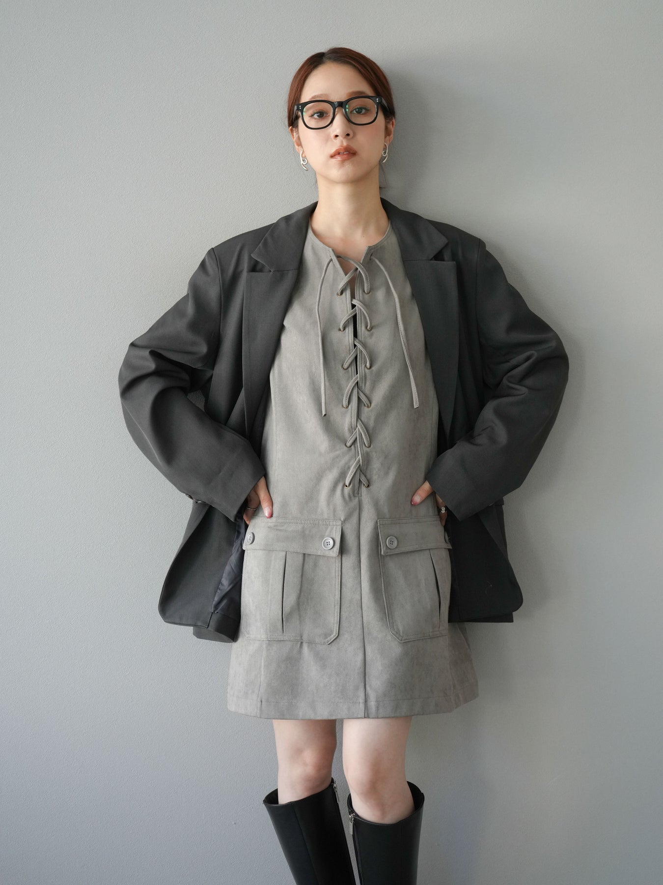 スエード調素材の上品な風合いに、フロントのレースアップデザインが目を惹くミニワンピース。程よく身体に沿うシルエットで女性らしさを演出しつつ、大きめのフラップポケットがカジュアルなアクセントを加えています。シンプルながら存在感があり、1枚で主役として着こなせるアイテム。インナーとのレイヤードや、ブーツ合わせでシーズンムードを高めるスタイリングもおすすめです。 ※ボトムス、キャミソール(インナー)以外の商品は一律でインナーは付属していません。