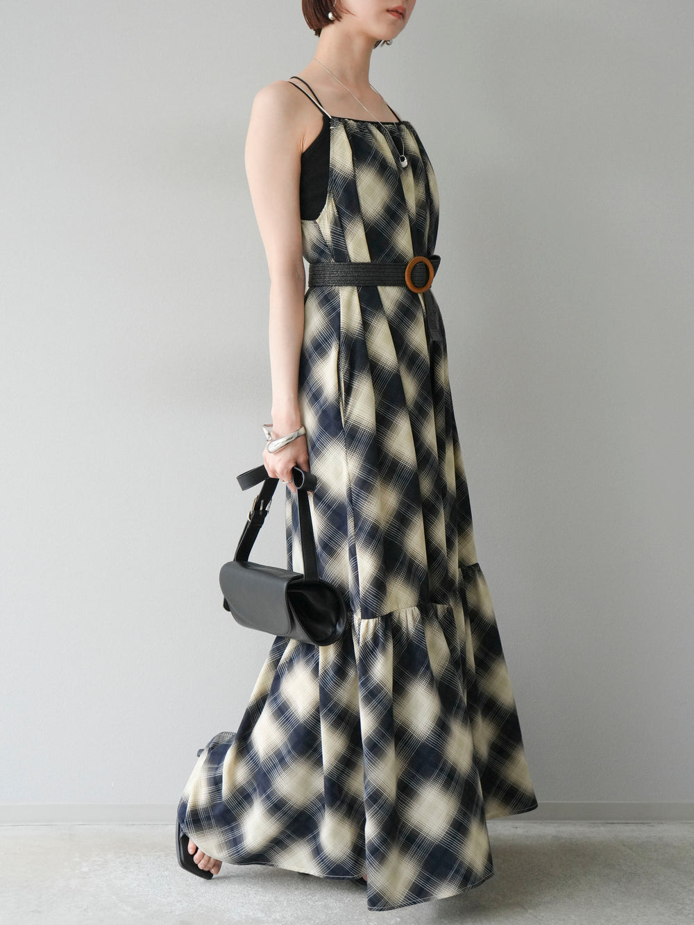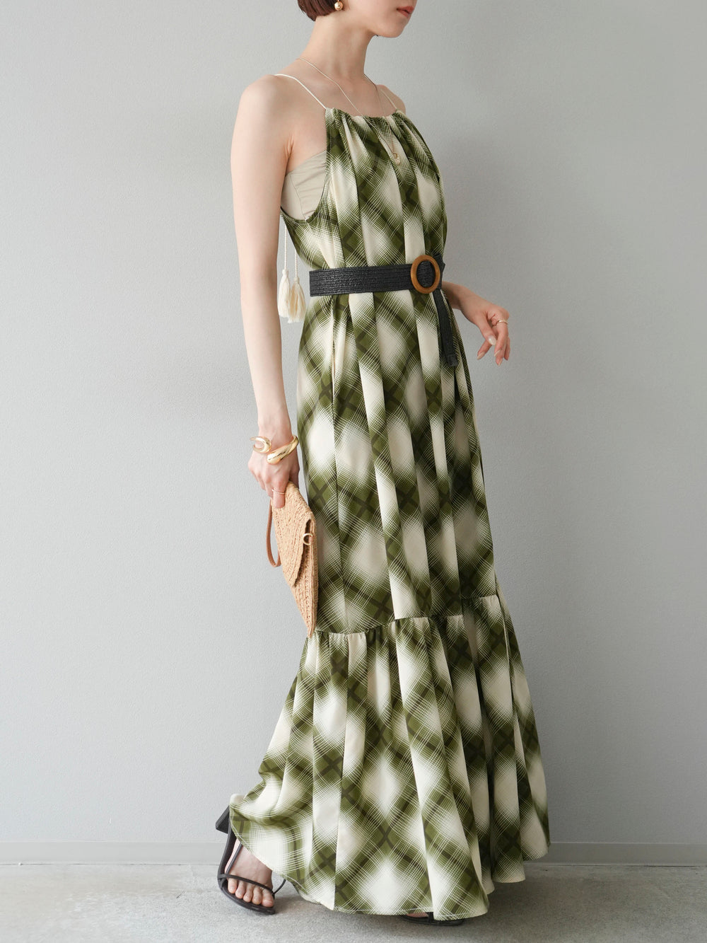 [予約]ベルト付チェックノースリーブワンピース/グリーン