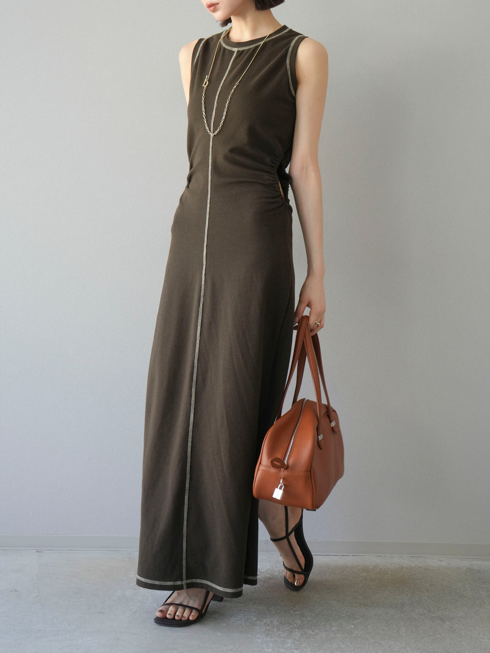[予約]ウエストオープンステッチカットワンピース/ブラウン