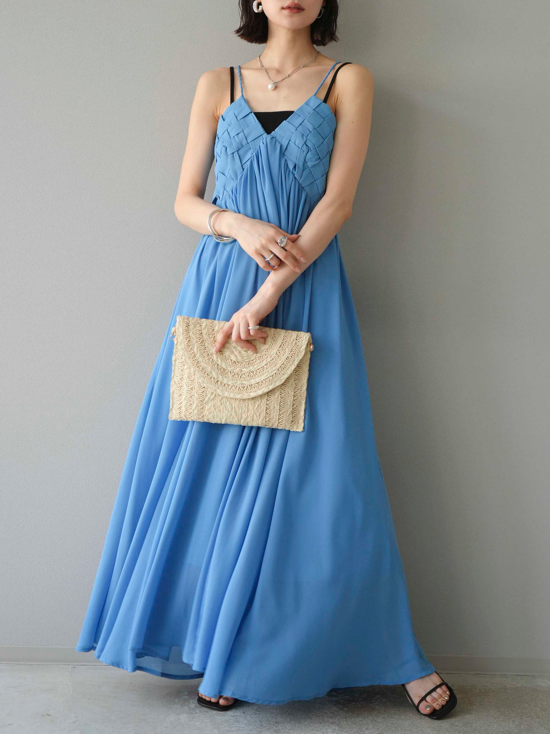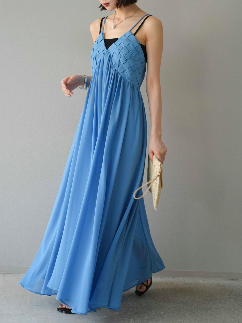 [予約]編み込みデザインシフォンワンピース/ブルー