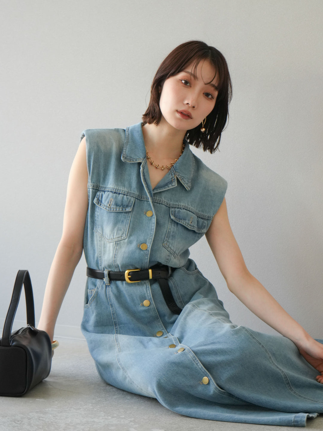 [予約]ベルト付デニムシャツデザインワンピース/ライトブルー