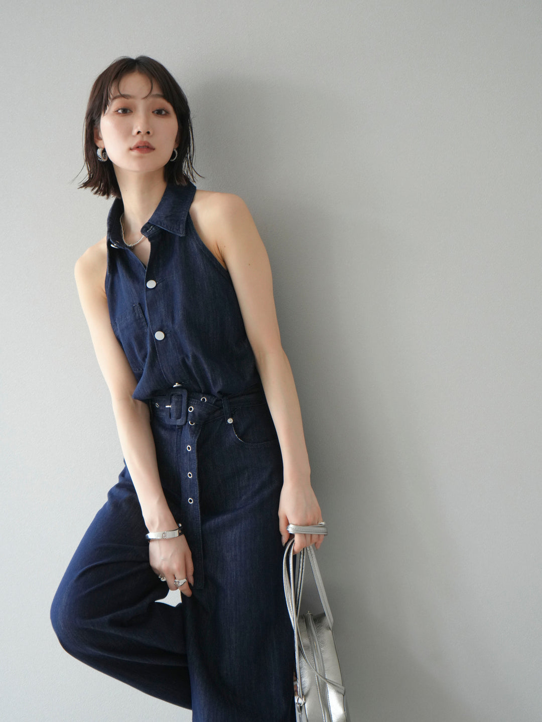 [予約]襟付きデニムオールインワン/ダークブルー
