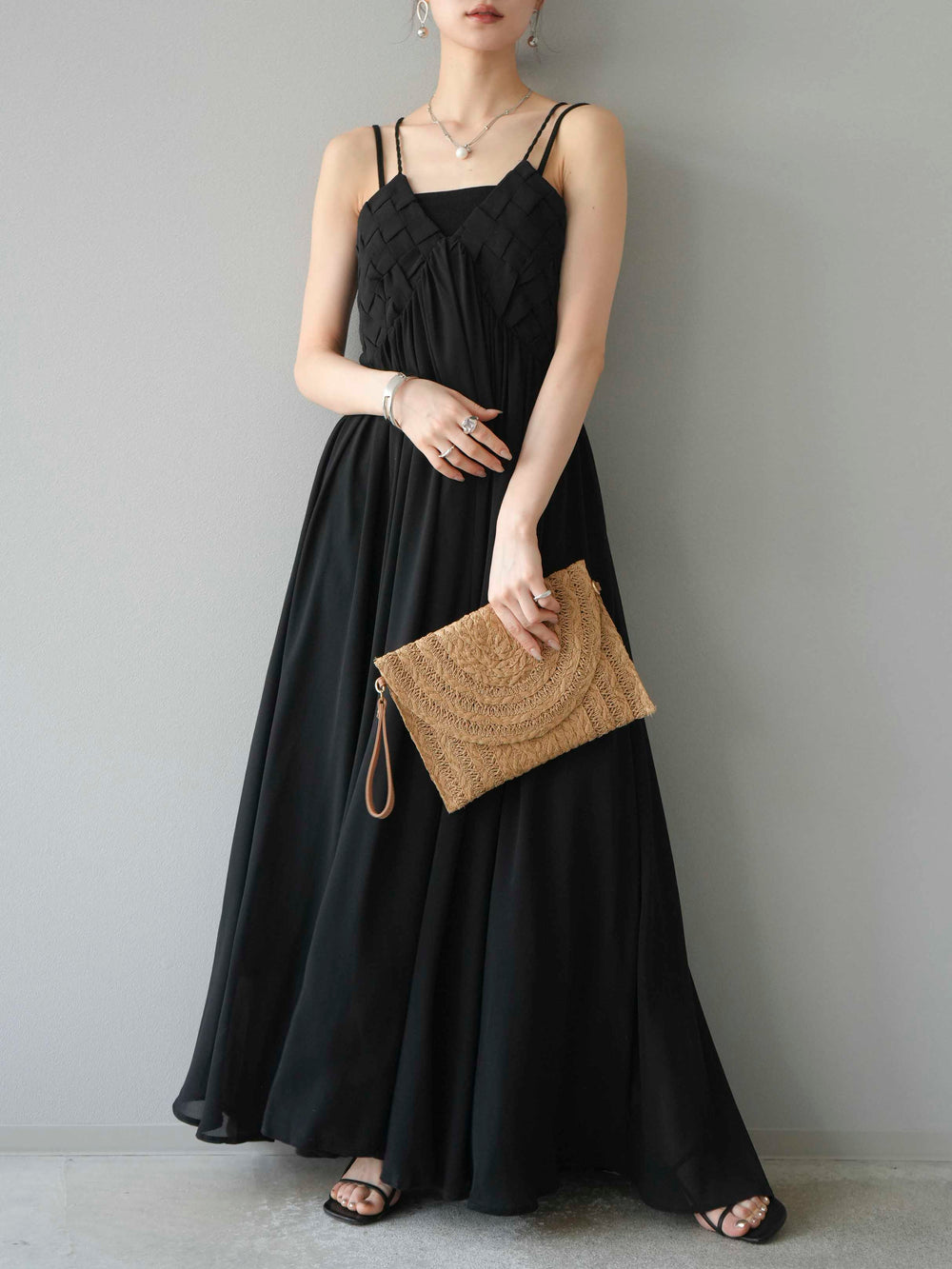[予約]編み込みデザインシフォンワンピース/ブラック